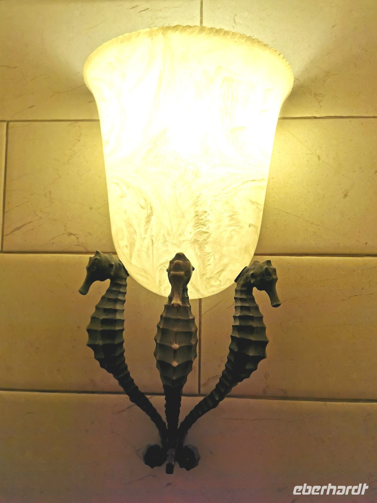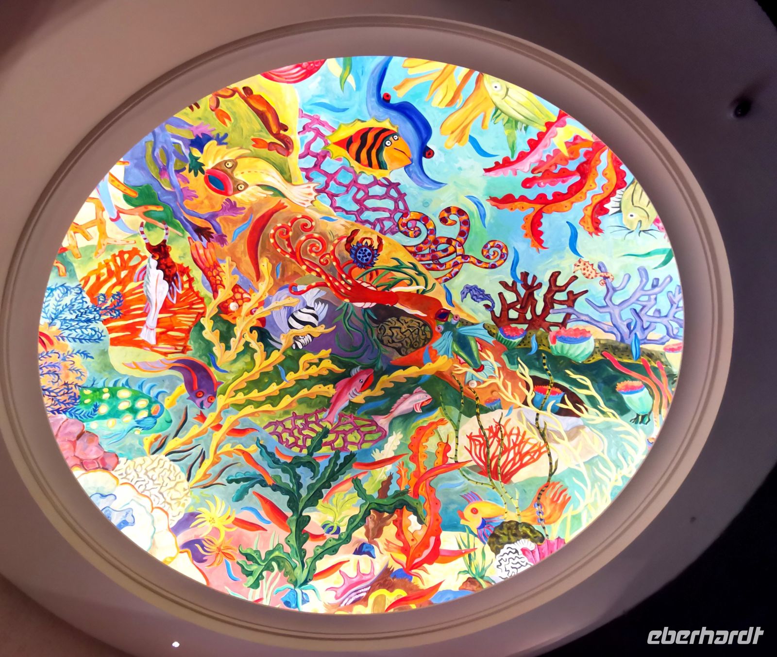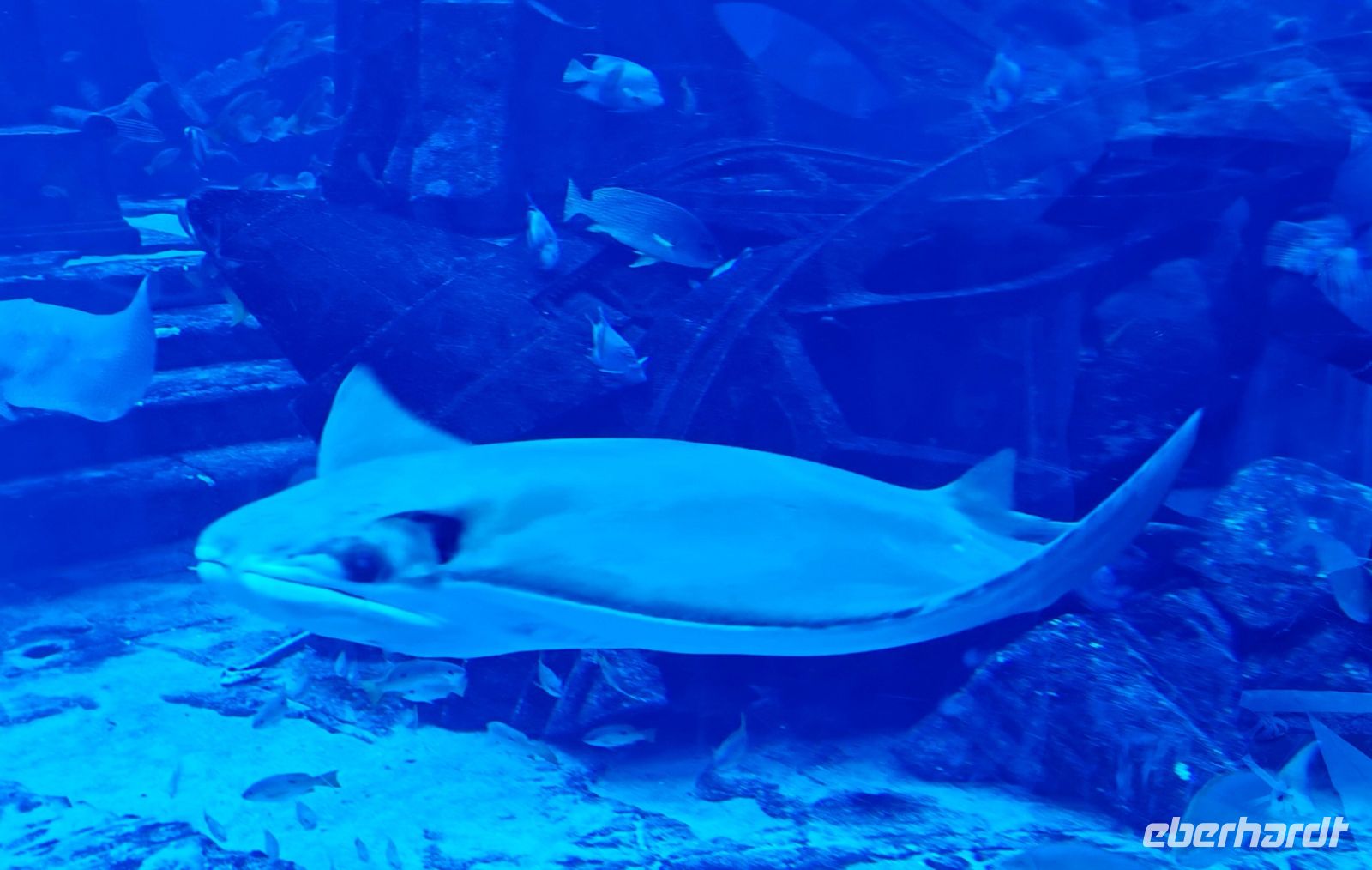 Am wunderschönen hoteleigenen Strand serviert man uns mexikanische Köstlichkeiten und wir schlemmen in einer wahren Traumkulisse, der Strand wurde mit puderzuckerfeinem weißen Sand aufgeschüttet und der Blick aufs Festland ist atemberaubend. Wir genießen unser Glück umso mehr, als wir erfahren, daß es in Deutschland mittlerweile winterlich kalt geworden ist und obendrein nebliges Novemberwetter herrscht. Am Strand entstehen etliche Schnappschüsse, die garantiert alle Daheimgebliebenen neidisch machen werden und eigentlich könnten wir noch bleiben. Aber wir wollen ja auch nochmal durch die faszinierenden Gänge des Hotels wandeln und die vielen kleinen Details entdecken. Vor dem Aquarium bleiben wir staunend an der Scheibe stehen, lassen Rochen und Haie an uns vorbeiziehen und blicken auf ein versunkenes Atlantis.