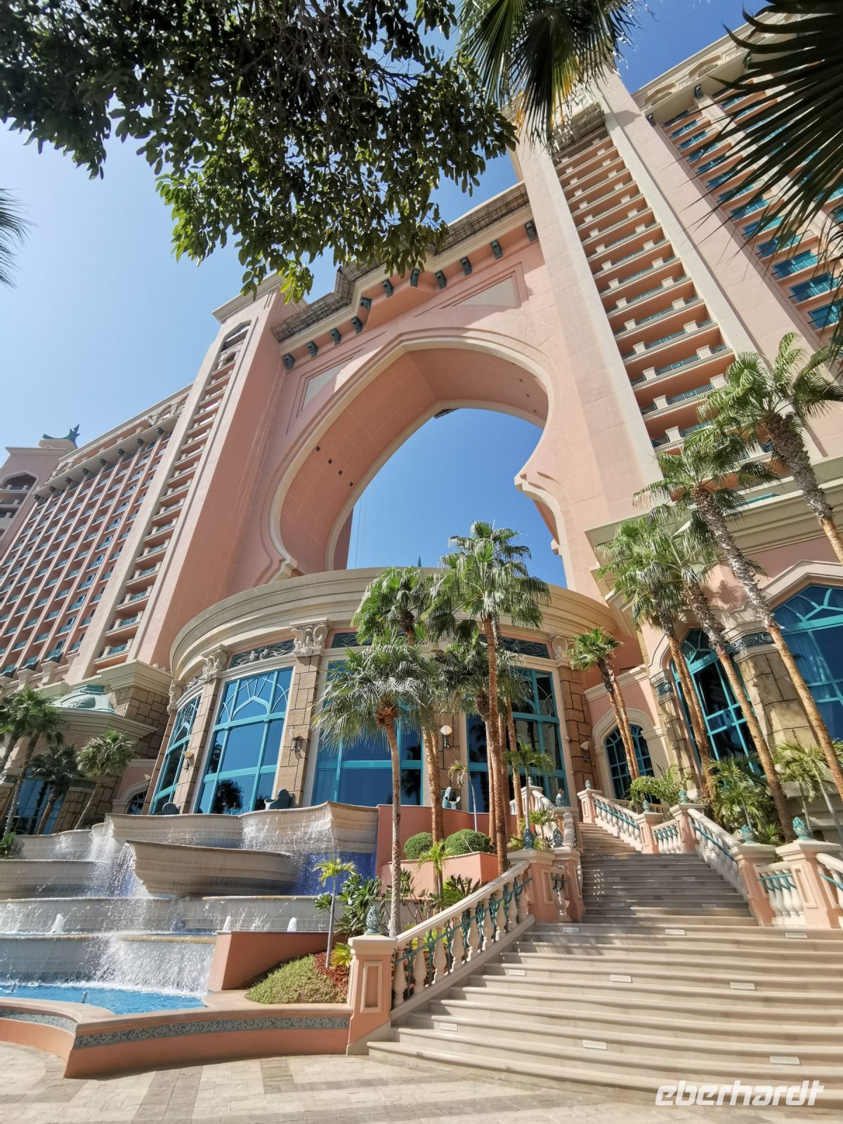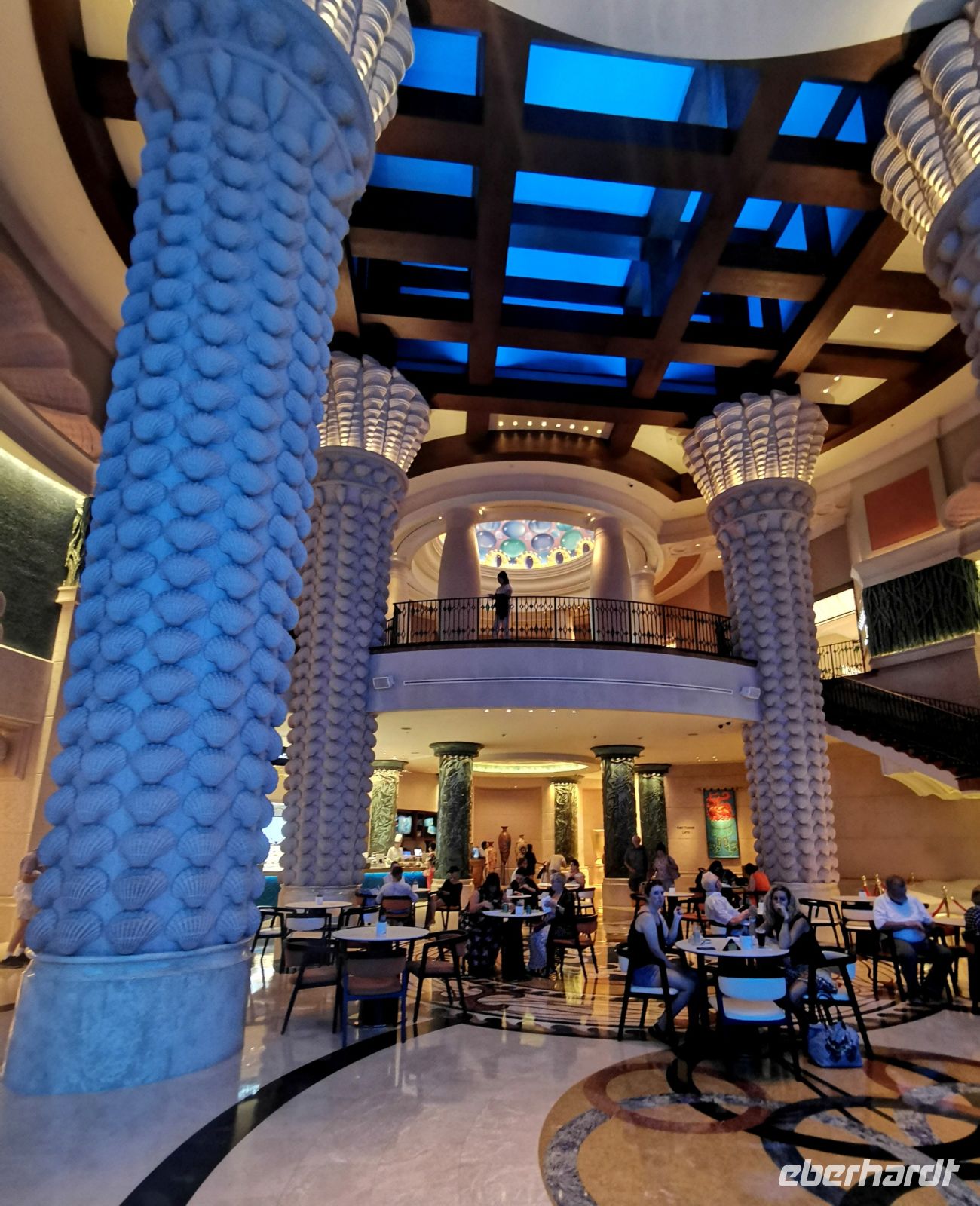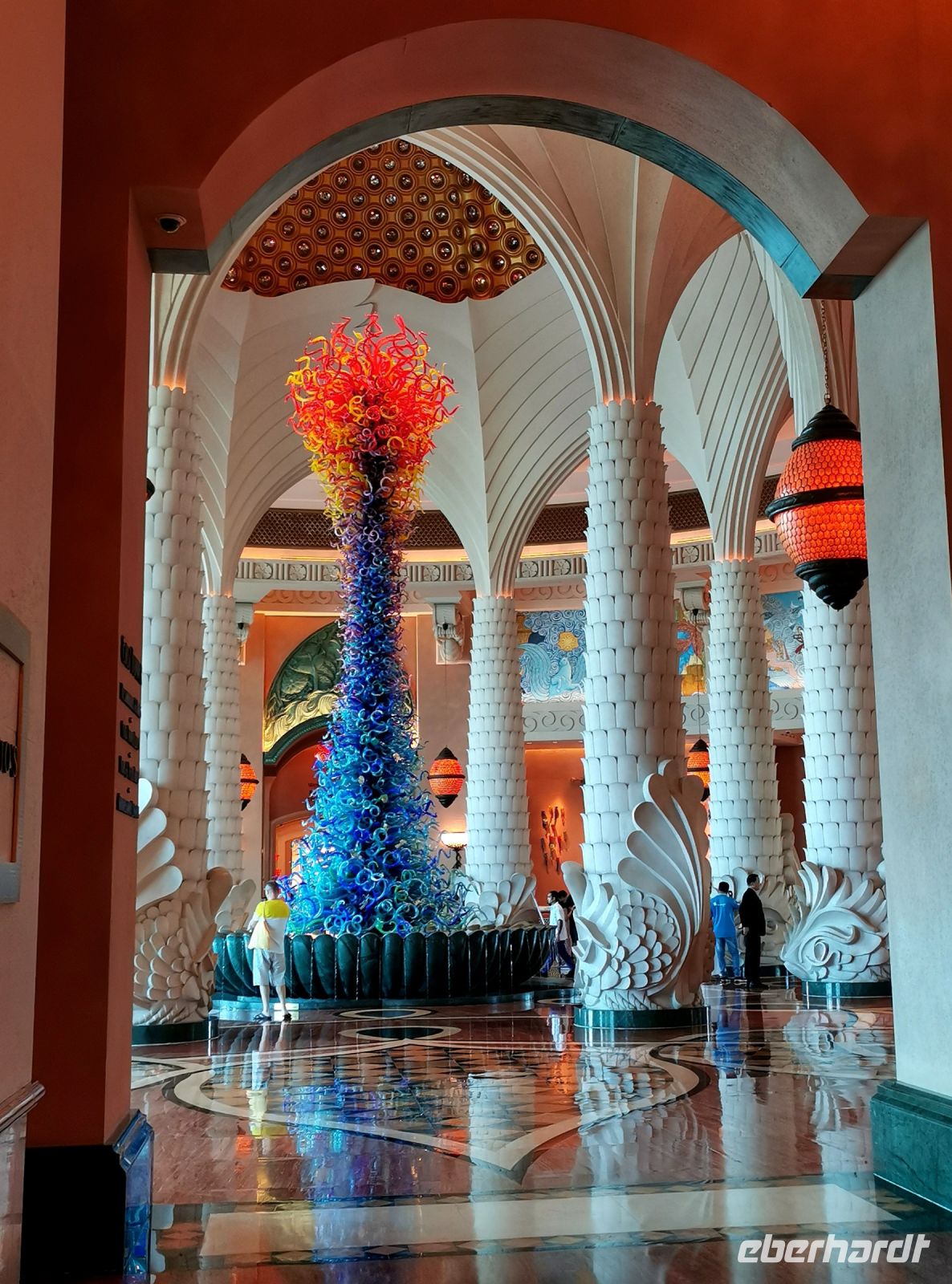 Zur Mittagszeit erwartet man uns bereits am Atlantishotel - einem Hotel der Luxusklasse. Es war das erste Hotel, welches überhaupt auf der Palme erbaut wurde, 2008 öffnete es seine Pforten und die Innenausstattung widmet sich dem Mythos der versunkenen Stadt Atlantis. Durch einen sechsspurigen Unterwassertunnel ist es gut vom Festland aus erreichbar, und wer bei der Fahrt zum Hotel etwas sehen möchte, der nimmt die Monorail, eine Art Metro auf einer Schiene, die über das Wasser zu schweben scheint. Im Hotel befinden sich etwa 1.500 Zimmer, 23 Restaurants, ein 2000 m² großer Ballsaal, eine Einkaufsstraße und ein Aquarium. 3500 Angestellte aus 82 Nationen arbeiten hier und insgesamt werden 102 Sprachen gesprochen. Zuallererst schauen wir uns natürlich die beeindruckende Außenkulisse an und genießen den Blick aufs türkisblaue Wasser. Danach schreiten wir andächtig durch die meterhohe Eingangstür, die mit Seepferdchen verziert ist und staunen über riesige Leuchter in Muschelform, kunstvoll gewundene Säulen, Brunnen die aus Jakobsmuscheln Wasser sprudeln und ein im Hotel liegendes Aquarium.