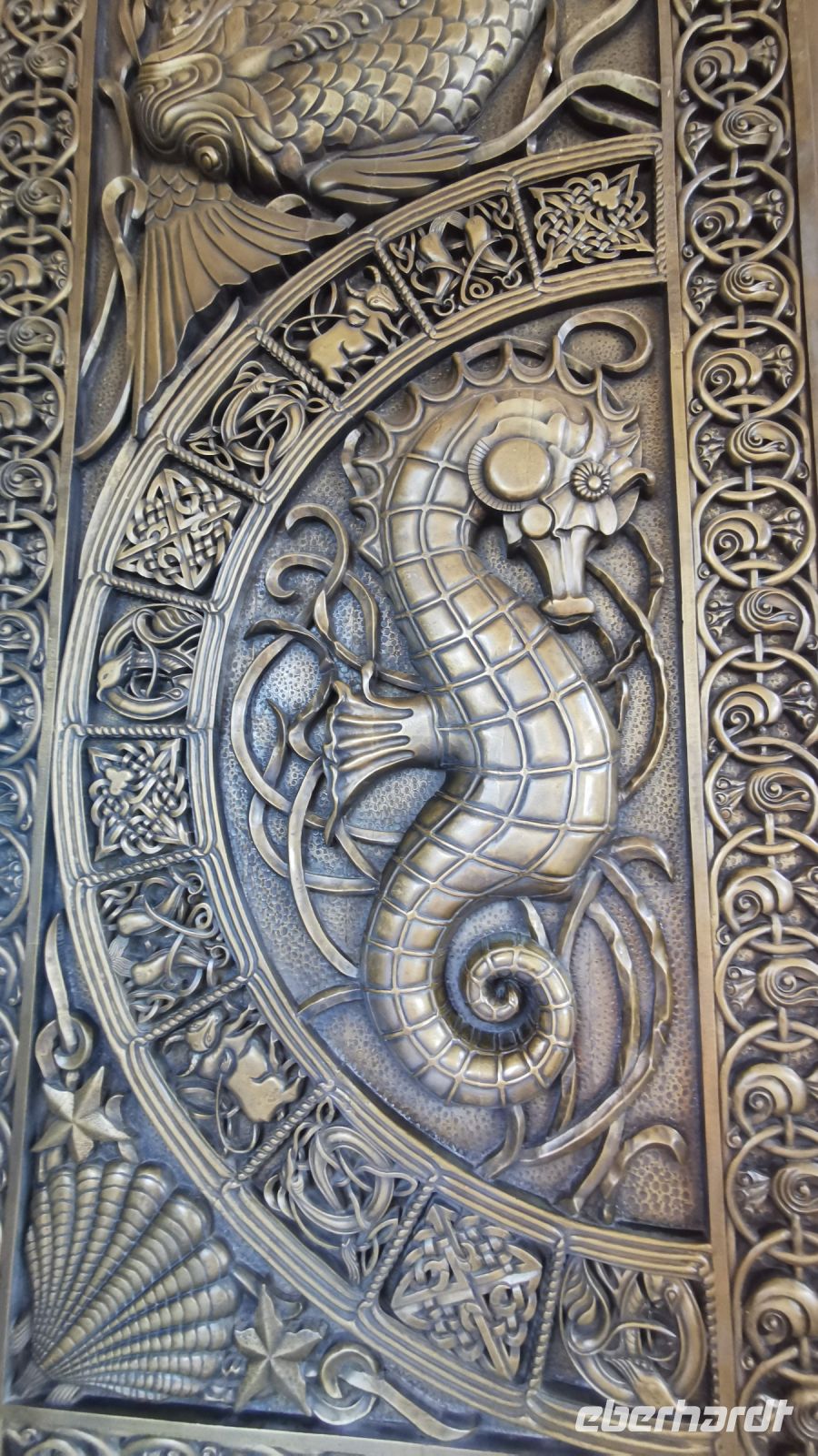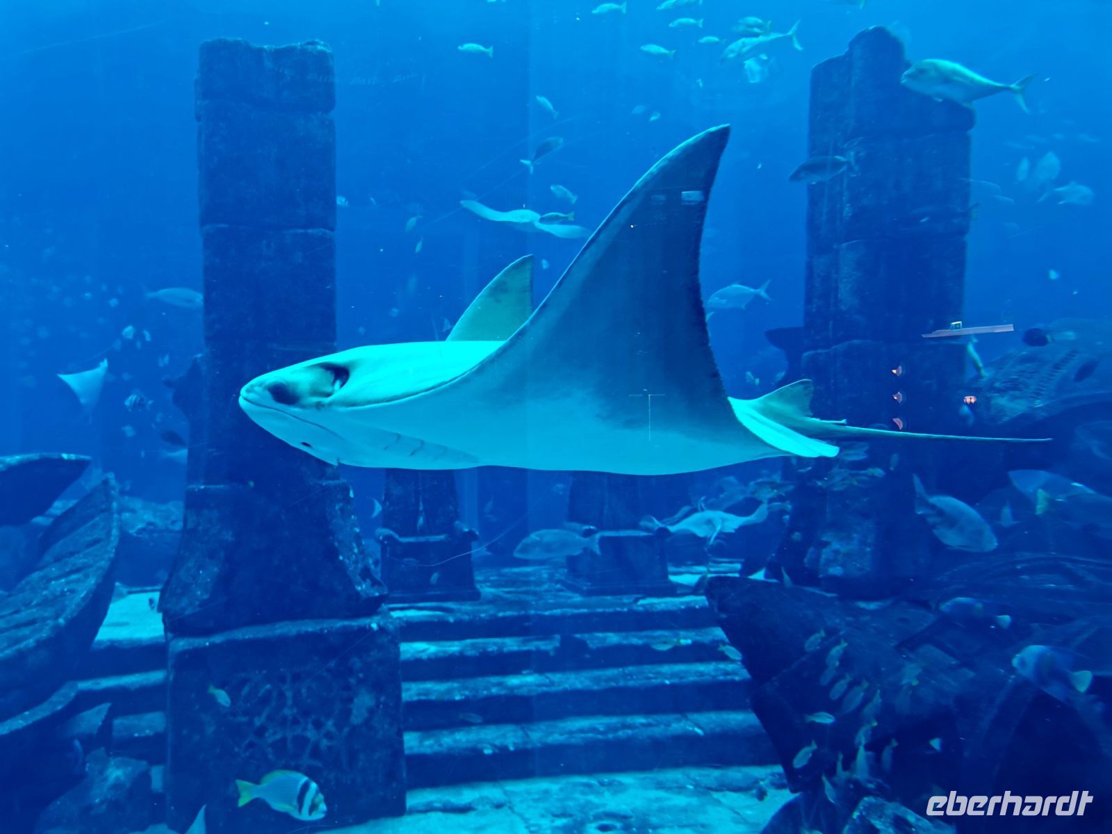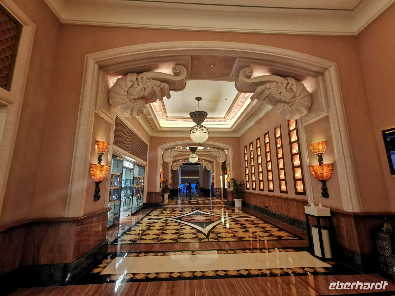 Zur Mittagszeit erwartet man uns bereits am Atlantishotel - einem Hotel der Luxusklasse. Es war das erste Hotel, welches überhaupt auf der Palme erbaut wurde, 2008 öffnete es seine Pforten und die Innenausstattung widmet sich dem Mythos der versunkenen Stadt Atlantis. Durch einen sechsspurigen Unterwassertunnel ist es gut vom Festland aus erreichbar, und wer bei der Fahrt zum Hotel etwas sehen möchte, der nimmt die Monorail, eine Art Metro auf einer Schiene, die über das Wasser zu schweben scheint. Im Hotel befinden sich etwa 1.500 Zimmer, 23 Restaurants, ein 2000 m² großer Ballsaal, eine Einkaufsstraße und ein Aquarium. 3500 Angestellte aus 82 Nationen arbeiten hier und insgesamt werden 102 Sprachen gesprochen. Zuallererst schauen wir uns natürlich die beeindruckende Außenkulisse an und genießen den Blick aufs türkisblaue Wasser. Danach schreiten wir andächtig durch die meterhohe Eingangstür, die mit Seepferdchen verziert ist und staunen über riesige Leuchter in Muschelform, kunstvoll gewundene Säulen, Brunnen die aus Jakobsmuscheln Wasser sprudeln und ein im Hotel liegendes Aquarium.