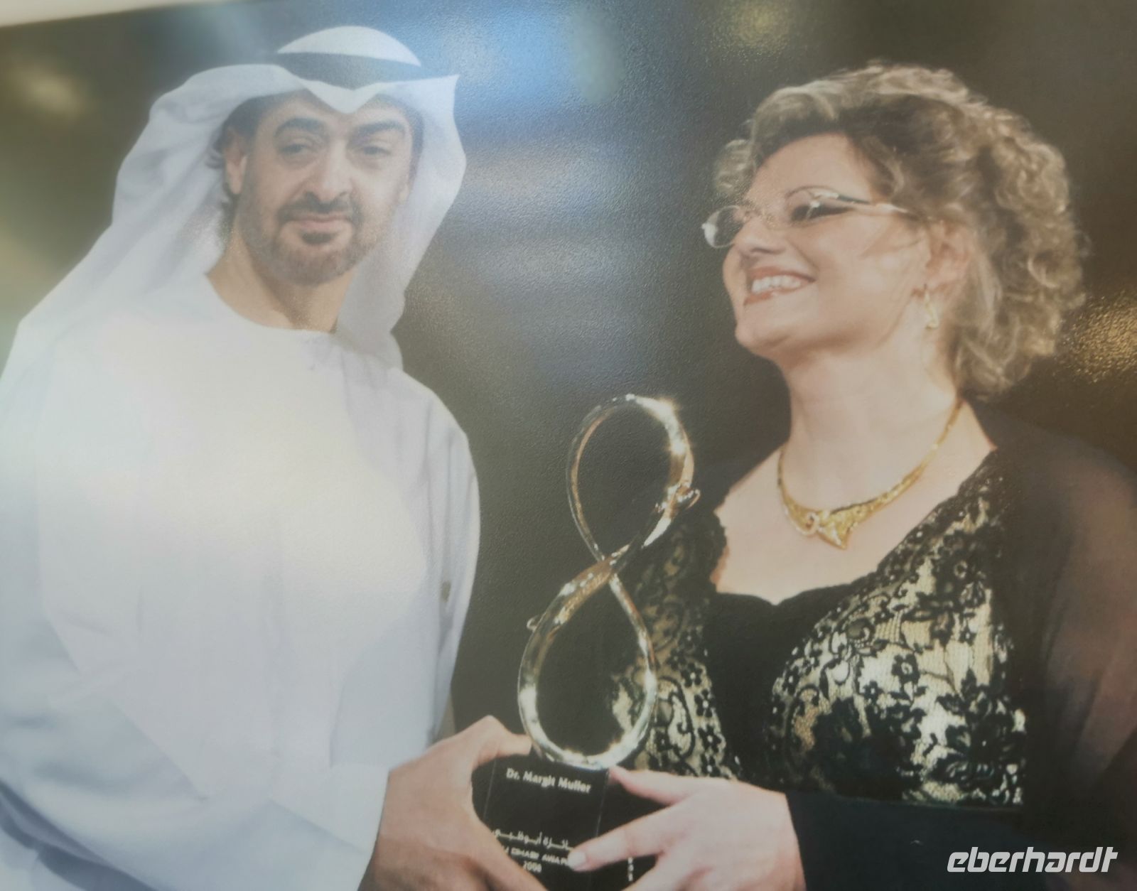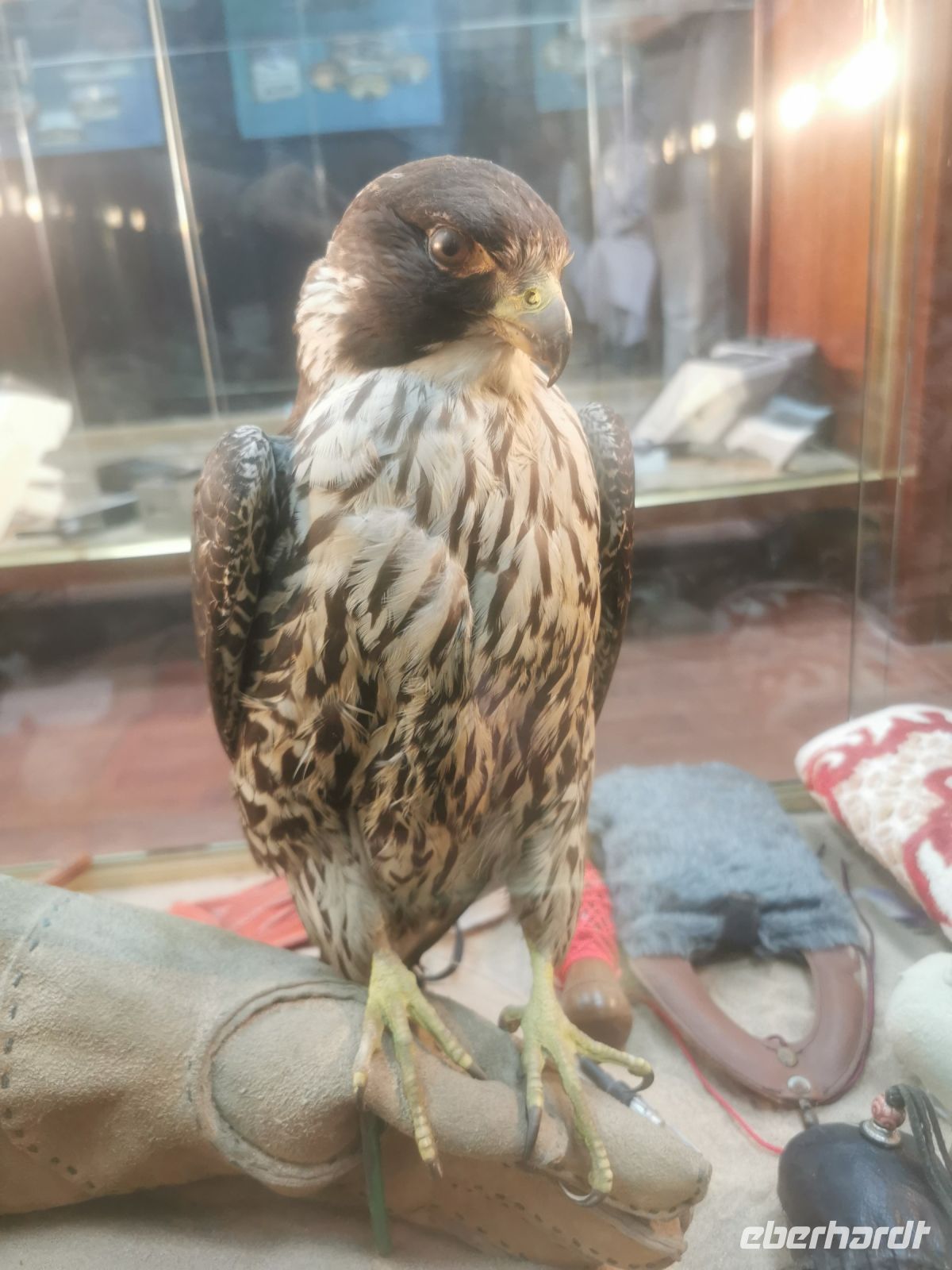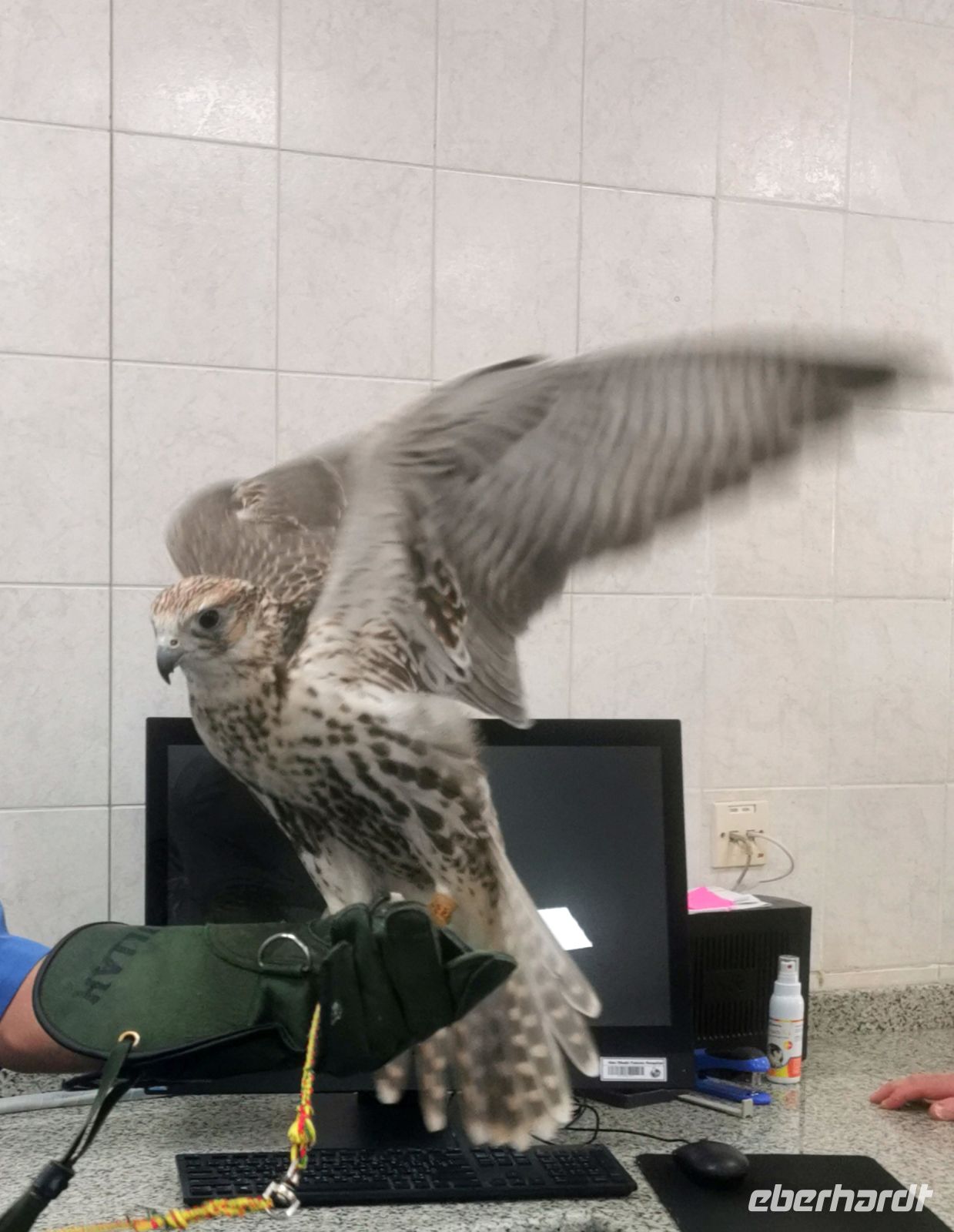 Zuerst besuchen wir die Falkenklinik. Dieses Krankenhaus für den Nationalvogel der VAE ist das einzige dieser Art weltweit und wurde bereits 1999 eröffnet. Die Leitung obliegt einer prominenten deutschen Veterininärmedizinierin: Frau Doktor Müller. Bei einer ausführlichen Führung erfahren wir viel über diese Tiere, dürfen bei der Pediküre eines Falken zuschauen und sogar selbst mal einen dieser edlen Vögel auf den Arm nehmen für ein Erinnerungsfoto. In den Emiraten, erfahren wir, erhalten Falken sogar einen Reisepaß und die Emirates zusammen mit Kuweit und Qatar Air sind die einzigen Fluggesellschaften der Welt, in der ein Besitzer solch eines Vogels mit ihm gemeinsam im Passagierraum sitzen und reisen kann. Wir amüsieren uns über diese Tatsache und rätseln, welchen Film der Falke im Entertainmentprogramm wohl wählen würde?