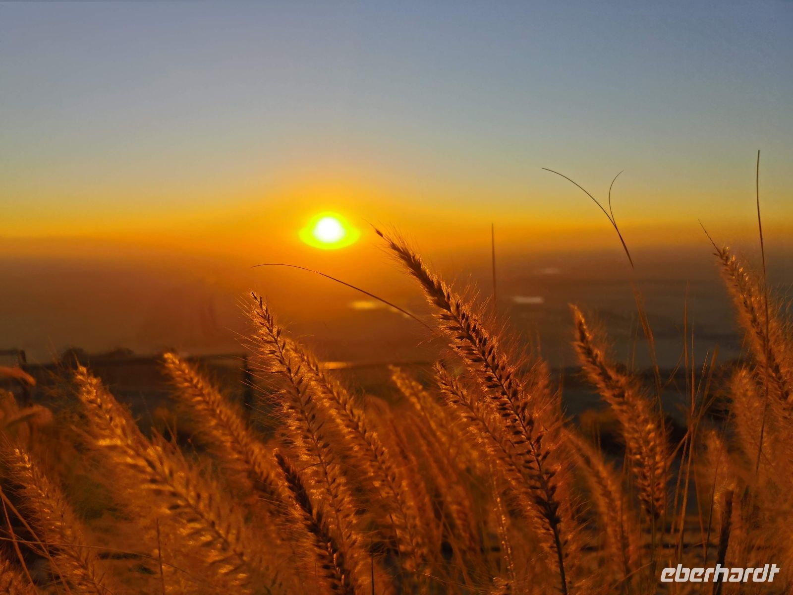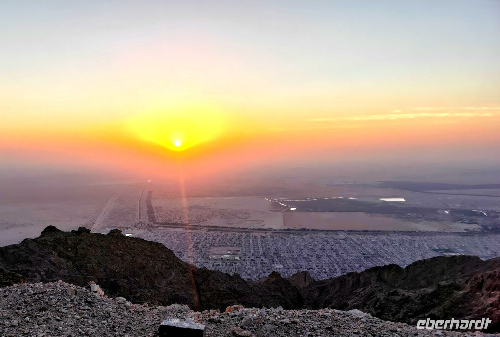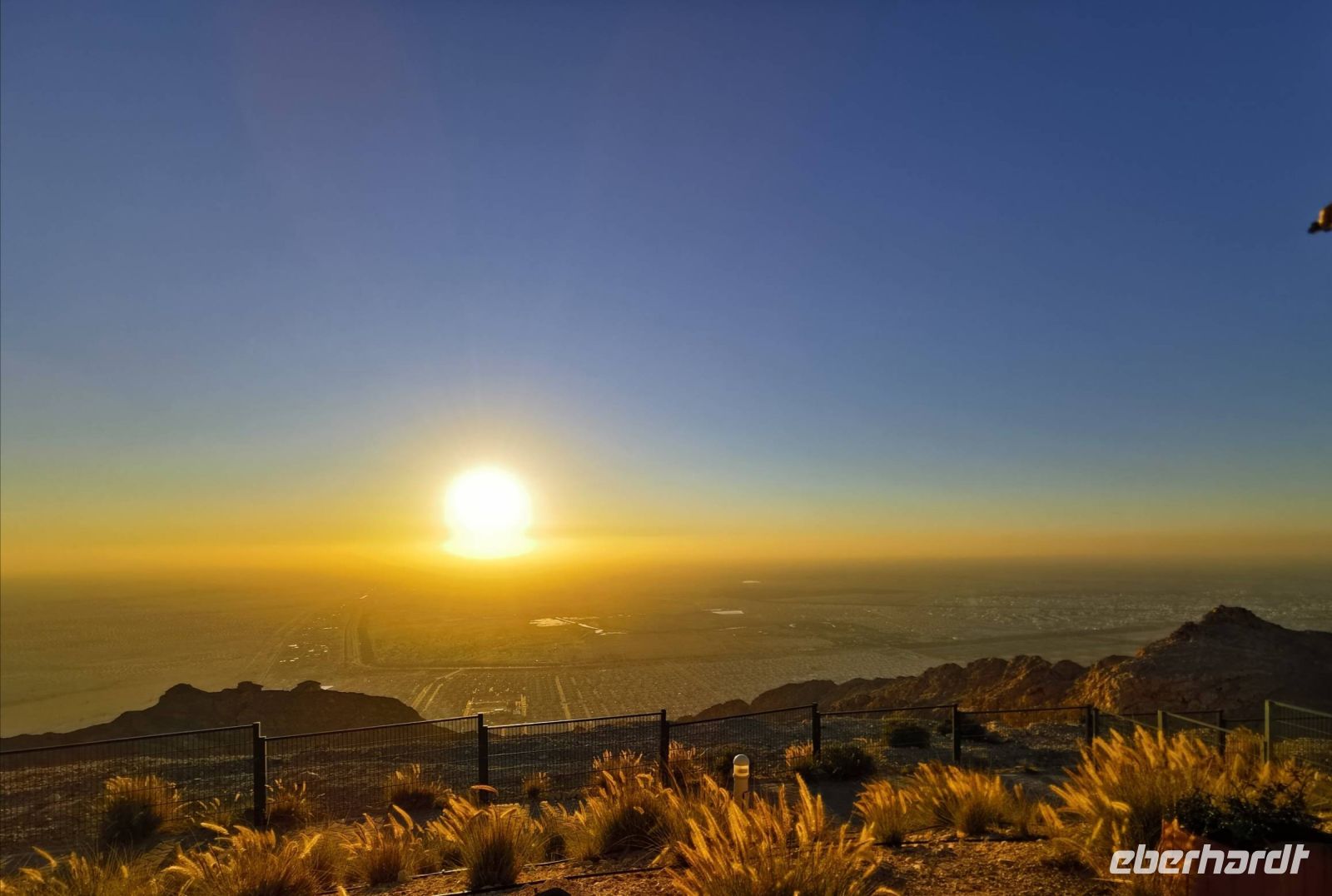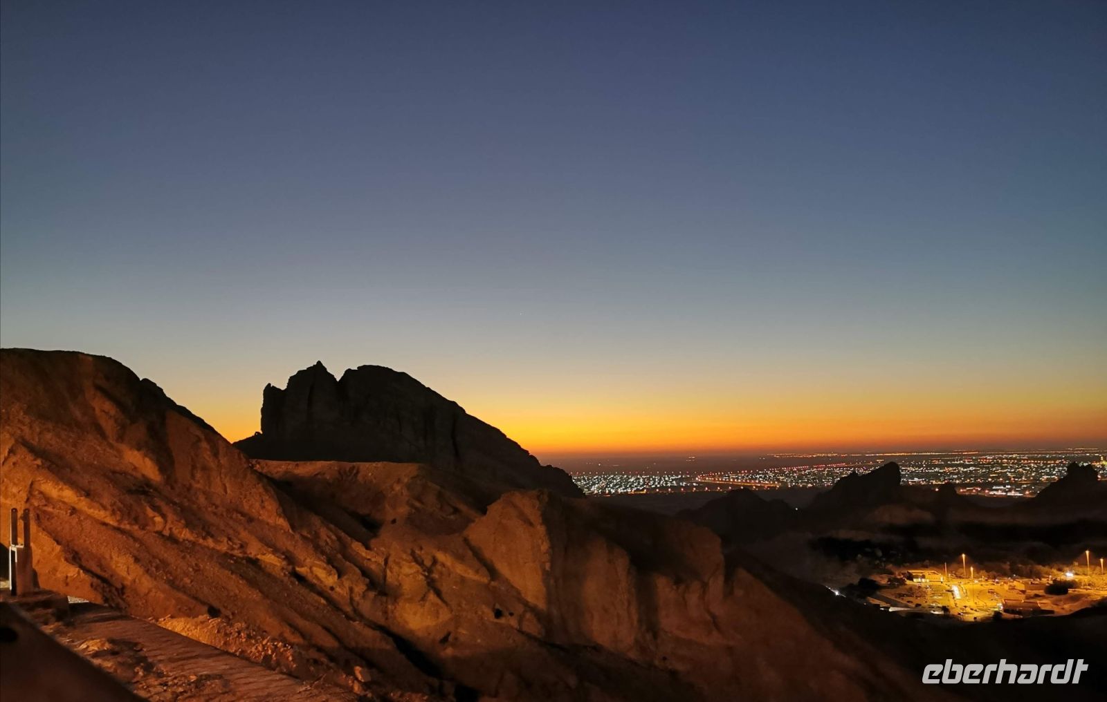 Am Nachmittag starten wir unsere Fahrt auf den nahe der omanischen Grenze gelegenen Jebel Hafeet. Dieser Berg erhebt sich 1.240 Meter mitten in der Wüste und von oben hat man einen fantastischen Ausblick auf ganz Al Ain. Im Hotel auf der Bergspitze ist das Abendessen für uns schon vorbereitet und zum letzten Mal genießen wir gemeinsam Hummus, Fatoush, Sis-Kebap, Lachs und leckeren Obstsalat. Gemeinsam machen wir unzählige Fotos vom traumhaften Sonnenuntergang und die erste Wehmut überfällt uns, bei dem Gedanken, daß unsere schöne Reise damit zu Ende geht.