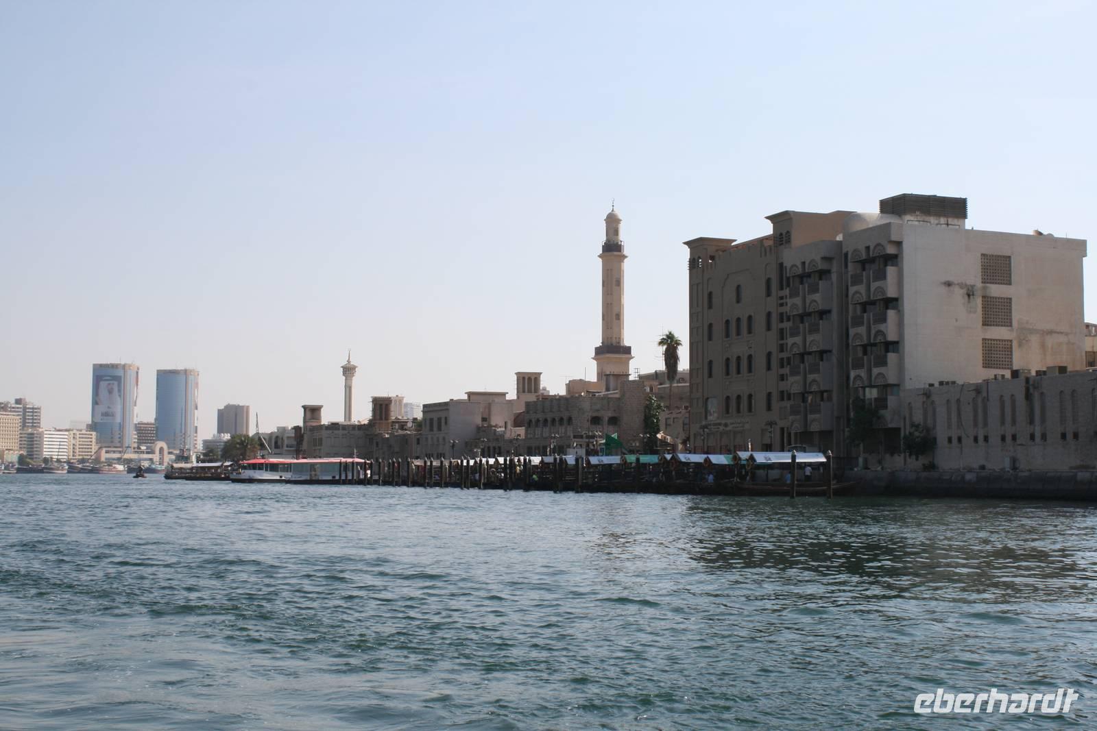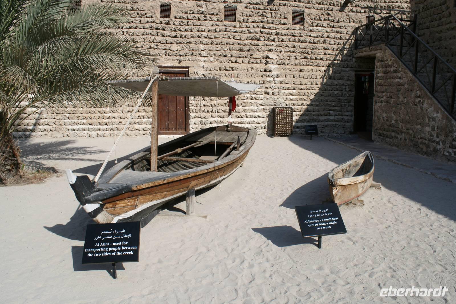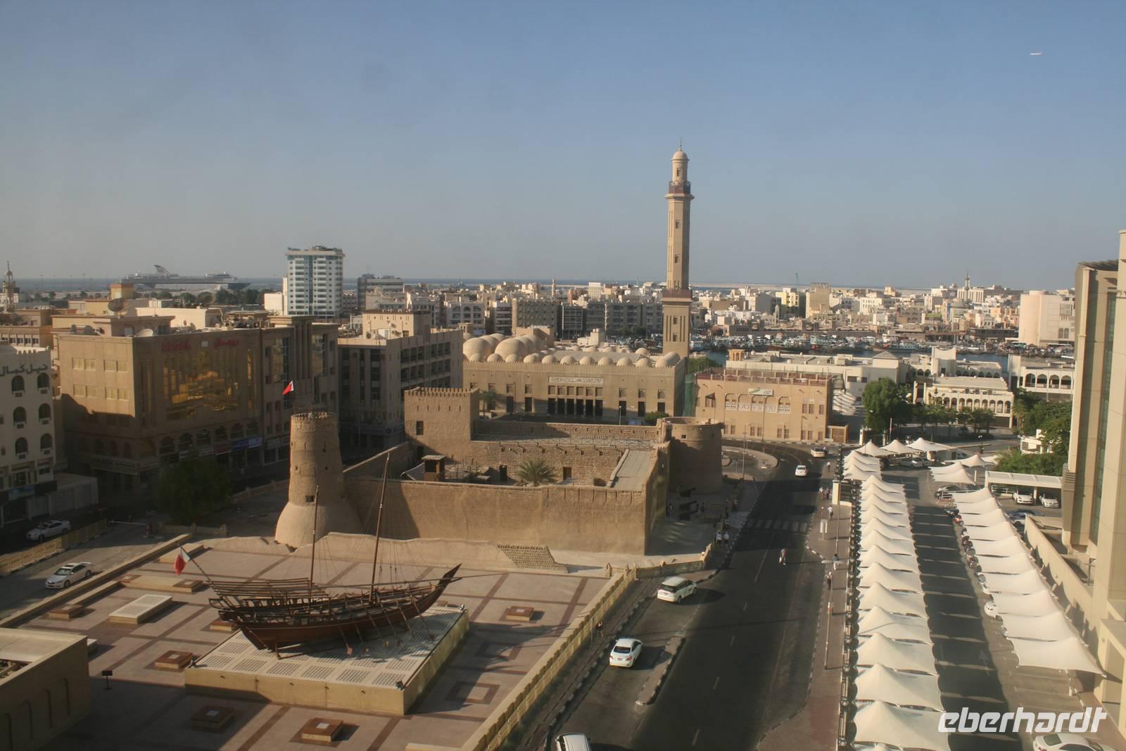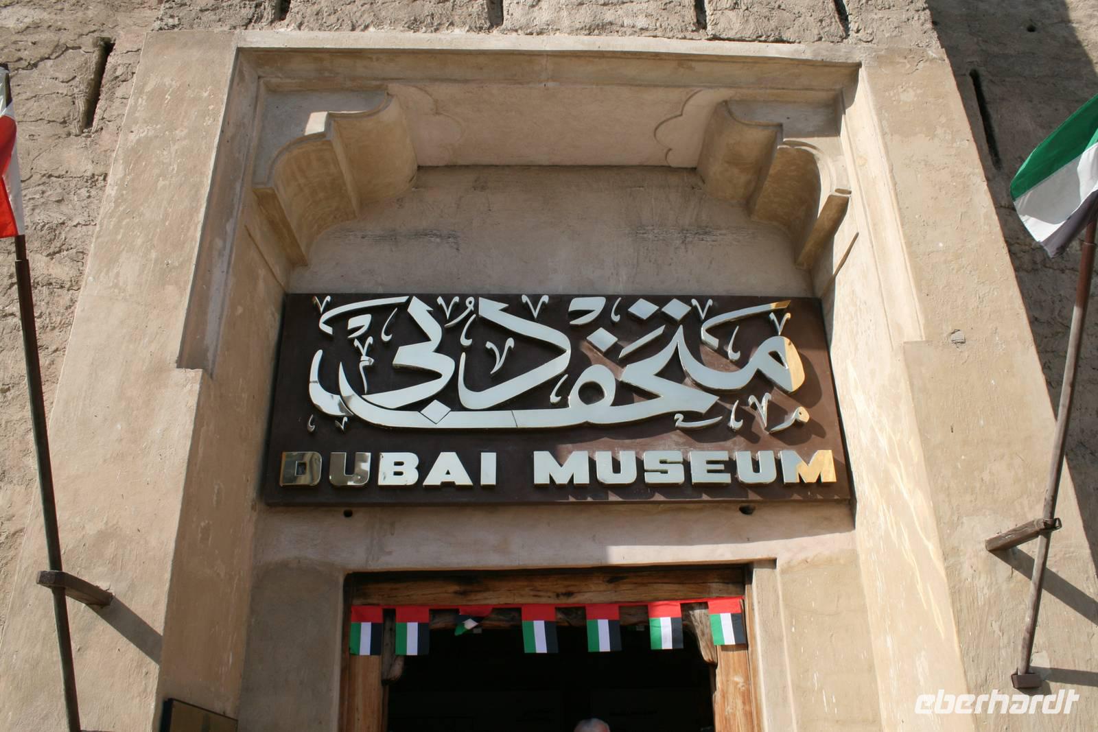 Den heutigen Tag starteten wir nach dem Frühstück im ambitionierten Dubai Museum gleich gegenüber von unserem Hotel. In dem 1787 erbauten Al-Fahidi Fort, welches bis in die 1960er Jahre nach der Sitz des Scheichs und somit der Regierung war, befindet sich heute ein ausgezeichnetes, heimatkundliches Museum. Eindrucksvolle Bilder bewiesen uns, dass Lehmfort noch bis in die zweite Hälfte des 19 Jahrhunderts allein am sandigen Ufer des Creeks stand und über das kleine Fischer- und Perlentaucherdorf Dubai wachte. Im Innenhof sind einige traditionelle Schiffe versammelt und in den umliegenden Räumen konnten wir uns über Waffen sowie arabische Musikinstrumente informieren. Der größte Teil des Museums liegt jedoch unter der Erde. Hier erfuhren wir sehr viel über die Geschichte der Emirate, über Handelsbeziehungen mit Persien und Ostafrika, über die Perlentaucherei, Falkenjagd, Kamelzucht und das Leben in der Wüste. Die realitätsnah gestalteten Alltagssituationen wie z.B. in Marktszenen, in der Schule, im Handwerk oder im Beduinenlager gewährten uns tiefe Einblicke in die Vergangenheit.
