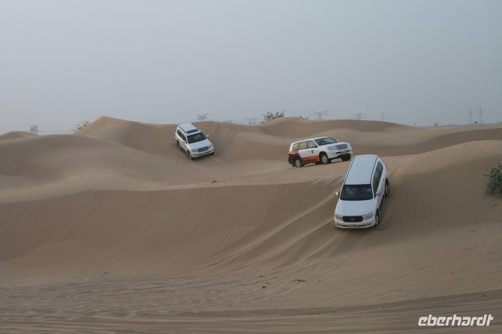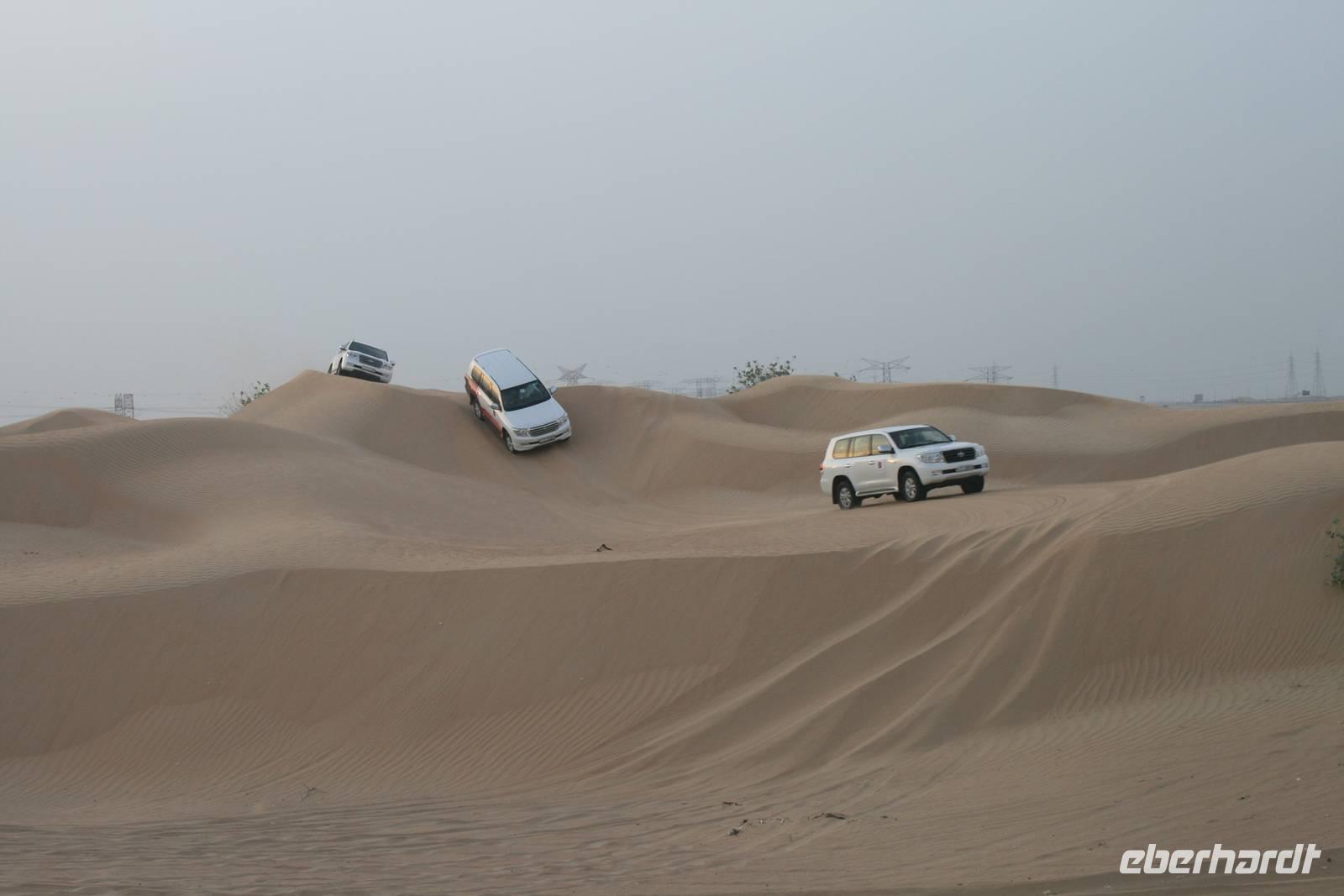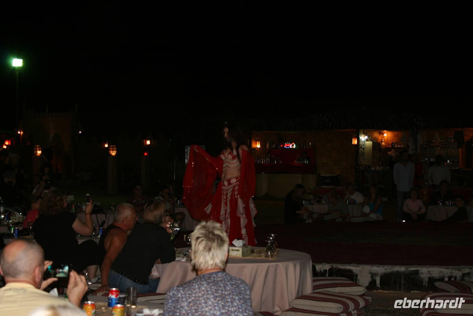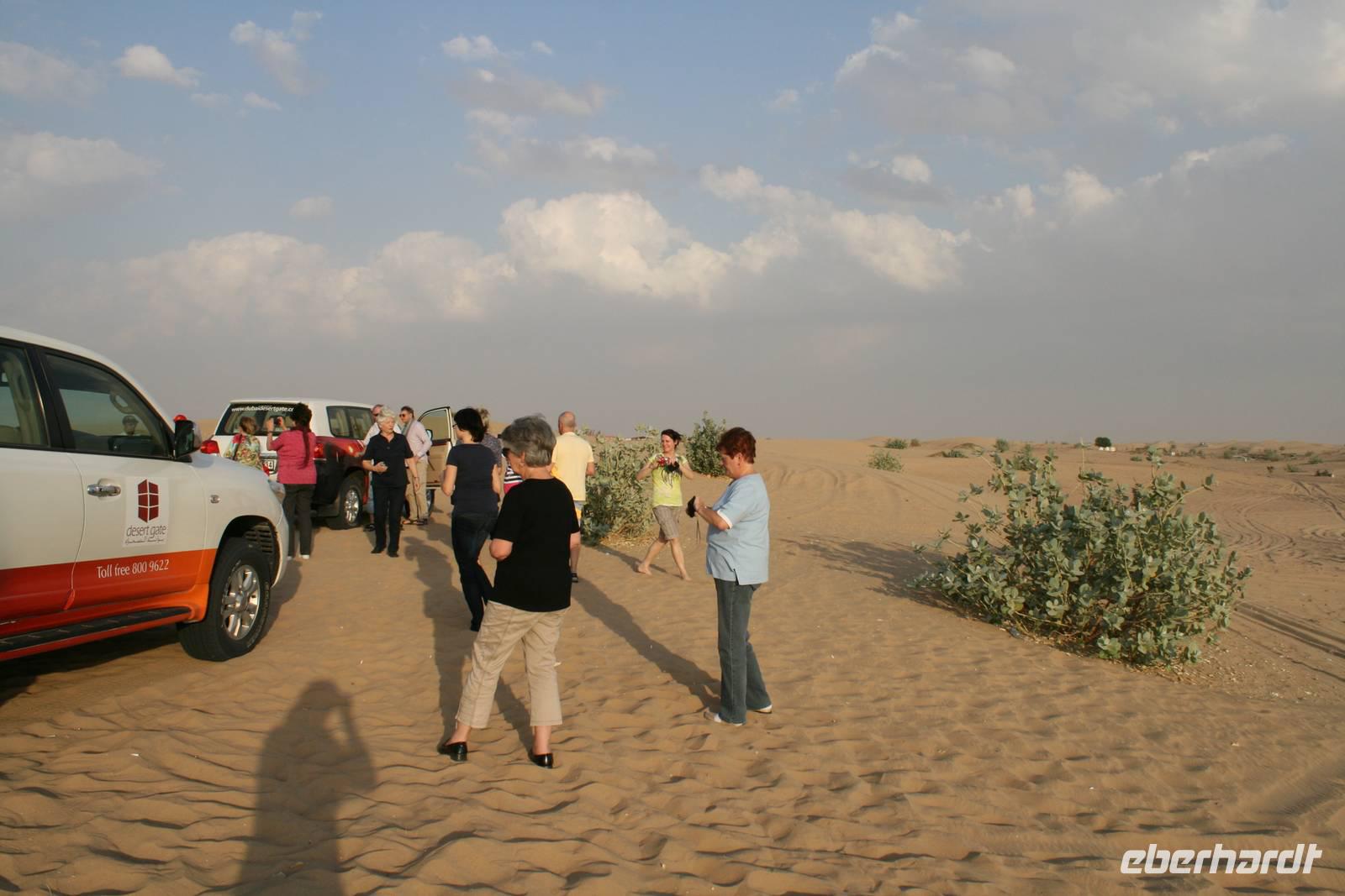 Eberhardt TRAVEL treibt seine Reisegäste nicht nur auf die Palme (Palm Jumeirah), sondern schickt sie auch noch in die Wüste Deswegen standen nach dem Mittagessen im Hotel schon unsere modernen Jeeps für die bevorstehende Wüstentour bereit. Die Fahrer hatten die Autos bestens unter Kontrolle und zeigten uns natürlich ihre Fahrkünste. So ließen wir keine Düne aus und hatten auf der Fahrt zum Wüstencamp jede Menge Spaß! Im Wüstencamp saßen wir gemütlich unter freiem Sternenhimmel, die Henna-Lady zauberte kleine Kunstwerke auf die Haut unserer Frauen und die Köche leisteten auch sehr gute Arbeit. Das Barbecue schmeckte in dieser Atmosphäre natürlich umso besser! Ein Darwish-Tänzer und eine Bauchtänzerin rundeten den Abend bei orientalischen Klängen wunderschön ab. Mit den Jeeps ging es dann zurück nach Dubai und ins Hotel.