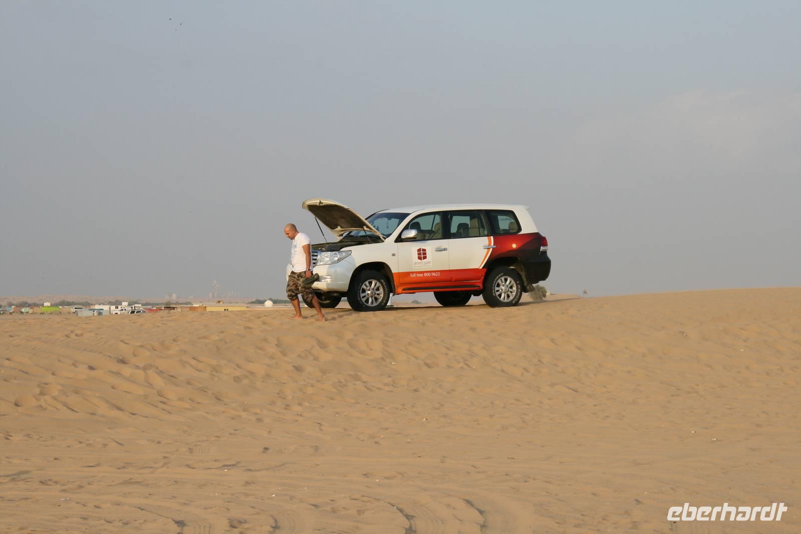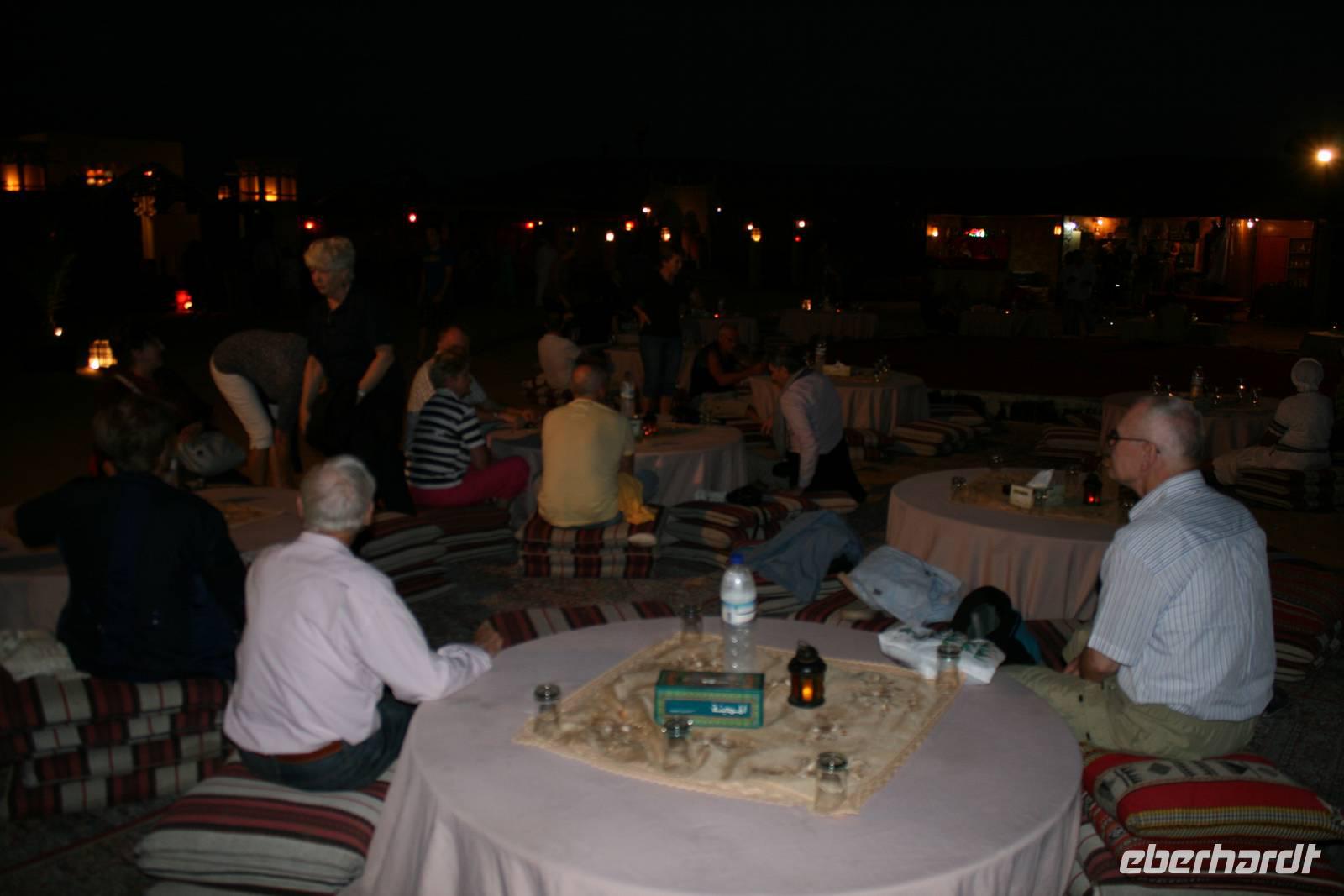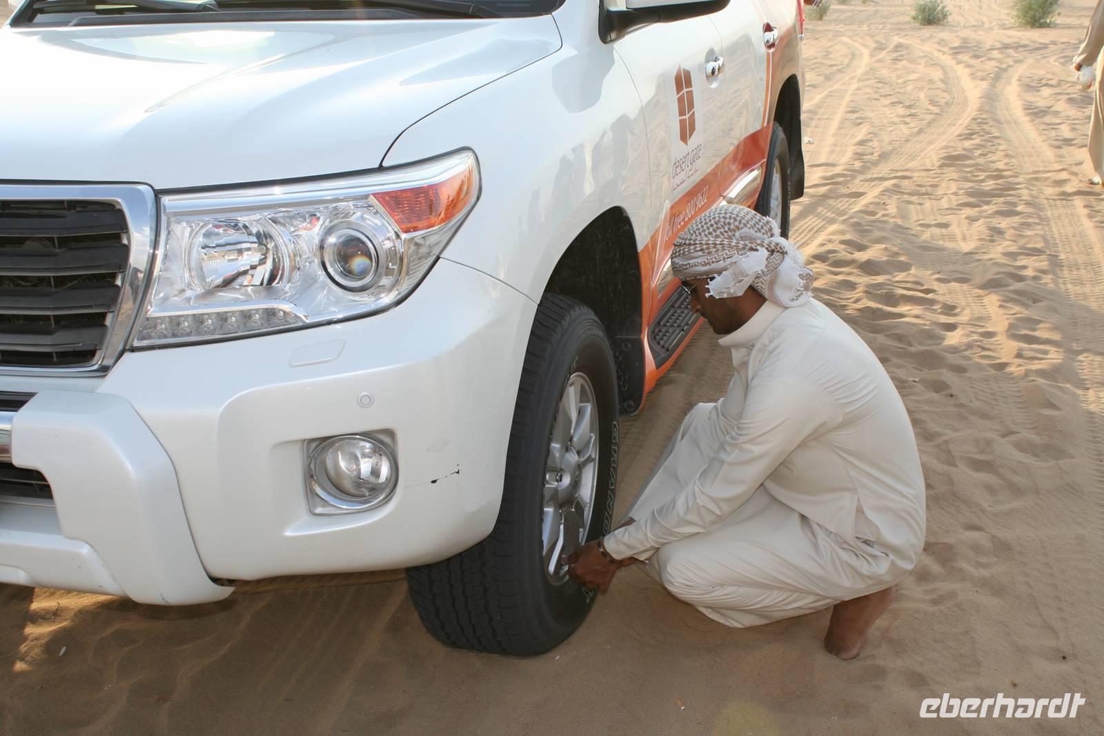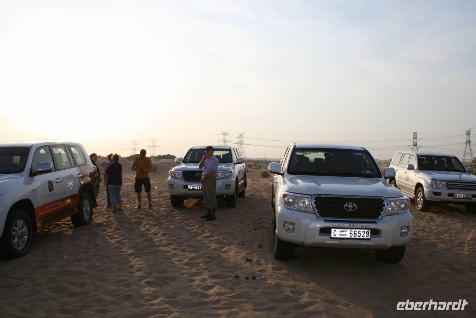 Eberhardt TRAVEL treibt seine Reisegäste nicht nur auf die Palme (Palm Jumeirah), sondern schickt sie auch noch in die Wüste Deswegen standen nach dem Mittagessen im Hotel schon unsere modernen Jeeps für die bevorstehende Wüstentour bereit. Die Fahrer hatten die Autos bestens unter Kontrolle und zeigten uns natürlich ihre Fahrkünste. So ließen wir keine Düne aus und hatten auf der Fahrt zum Wüstencamp jede Menge Spaß! Im Wüstencamp saßen wir gemütlich unter freiem Sternenhimmel, die Henna-Lady zauberte kleine Kunstwerke auf die Haut unserer Frauen und die Köche leisteten auch sehr gute Arbeit. Das Barbecue schmeckte in dieser Atmosphäre natürlich umso besser! Ein Darwish-Tänzer und eine Bauchtänzerin rundeten den Abend bei orientalischen Klängen wunderschön ab. Mit den Jeeps ging es dann zurück nach Dubai und ins Hotel.