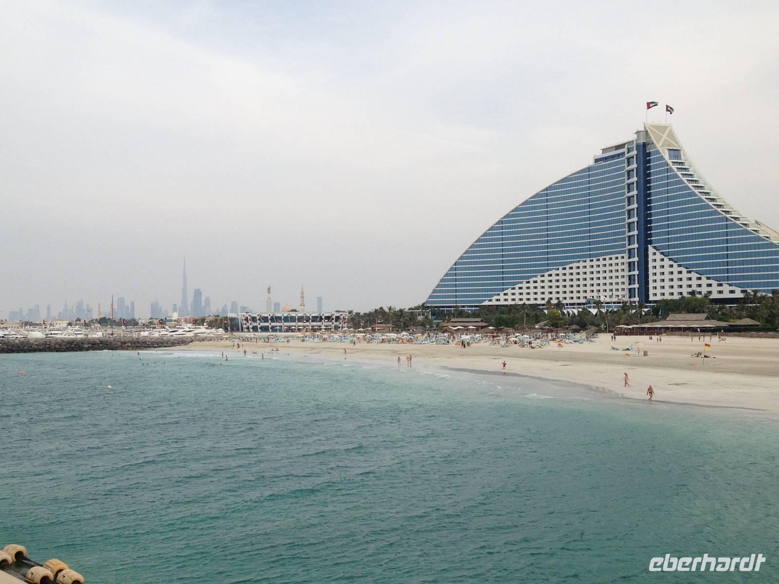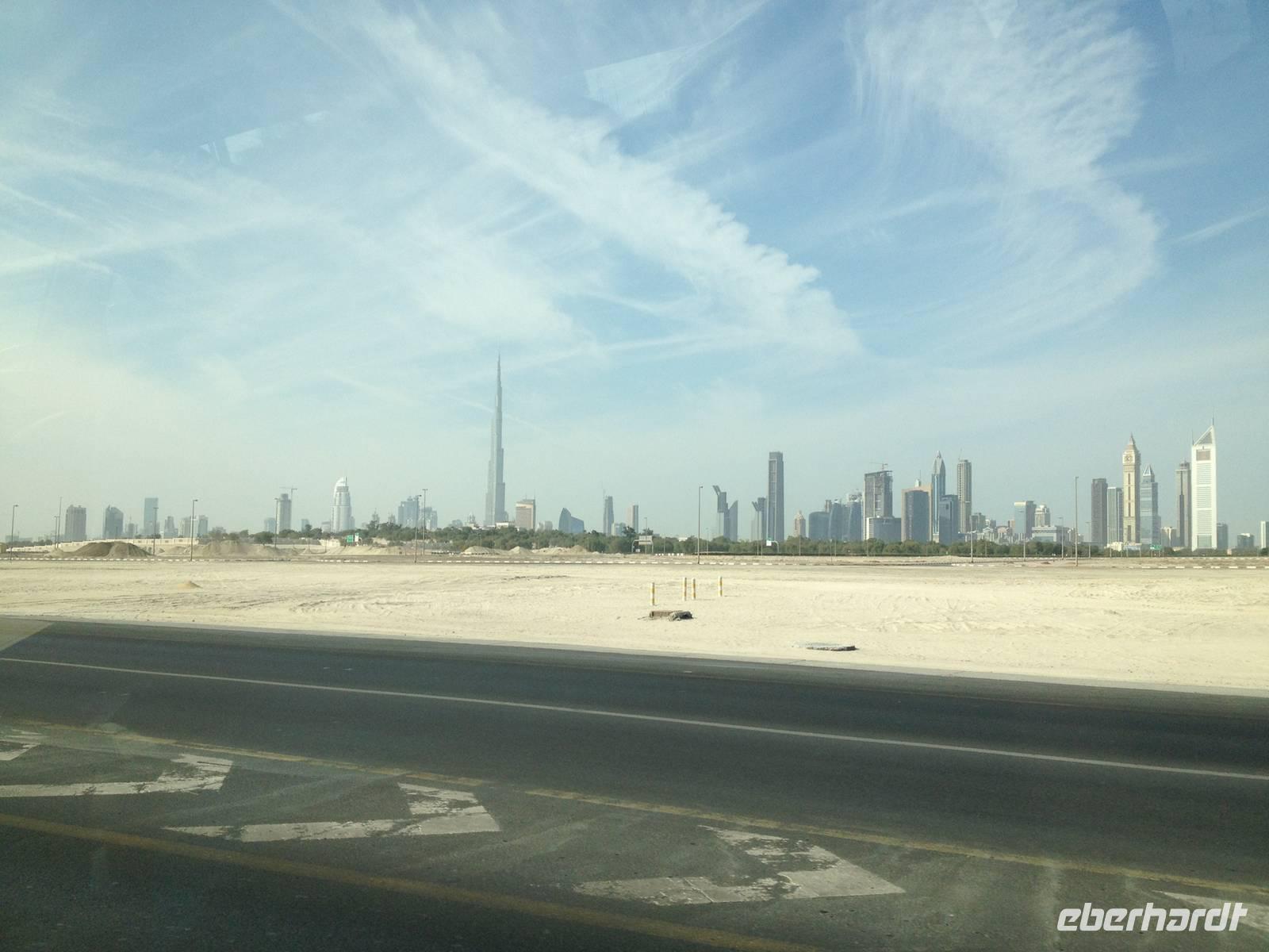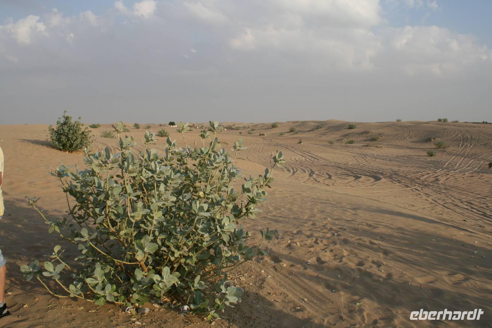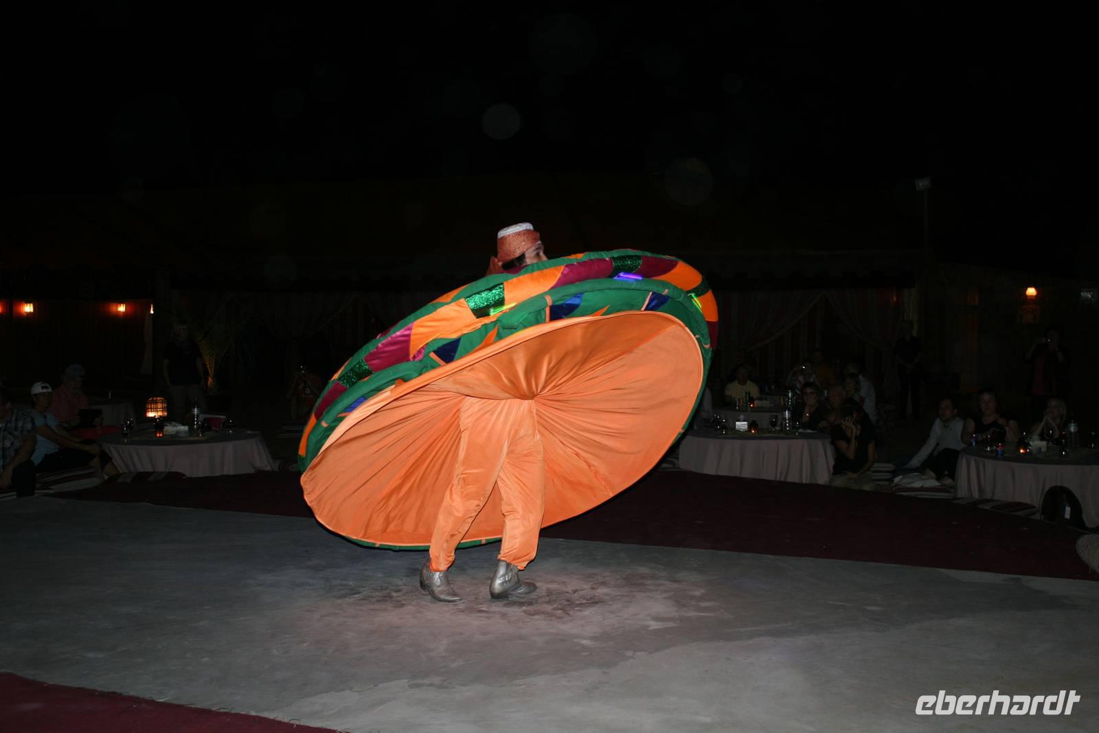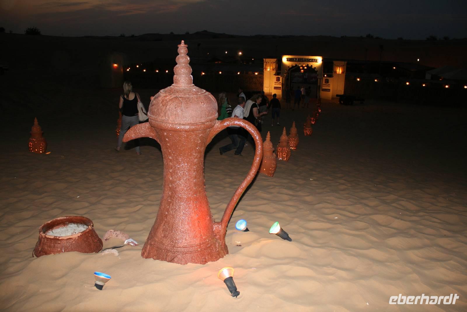 Eberhardt TRAVEL treibt seine Reisegäste nicht nur auf die Palme (Palm Jumeirah), sondern schickt sie auch noch in die Wüste Deswegen standen nach dem Mittagessen im Hotel schon unsere modernen Jeeps für die bevorstehende Wüstentour bereit. Die Fahrer hatten die Autos bestens unter Kontrolle und zeigten uns natürlich ihre Fahrkünste. So ließen wir keine Düne aus und hatten auf der Fahrt zum Wüstencamp jede Menge Spaß! Im Wüstencamp saßen wir gemütlich unter freiem Sternenhimmel, die Henna-Lady zauberte kleine Kunstwerke auf die Haut unserer Frauen und die Köche leisteten auch sehr gute Arbeit. Das Barbecue schmeckte in dieser Atmosphäre natürlich umso besser! Ein Darwish-Tänzer und eine Bauchtänzerin rundeten den Abend bei orientalischen Klängen wunderschön ab. Mit den Jeeps ging es dann zurück nach Dubai und ins Hotel.