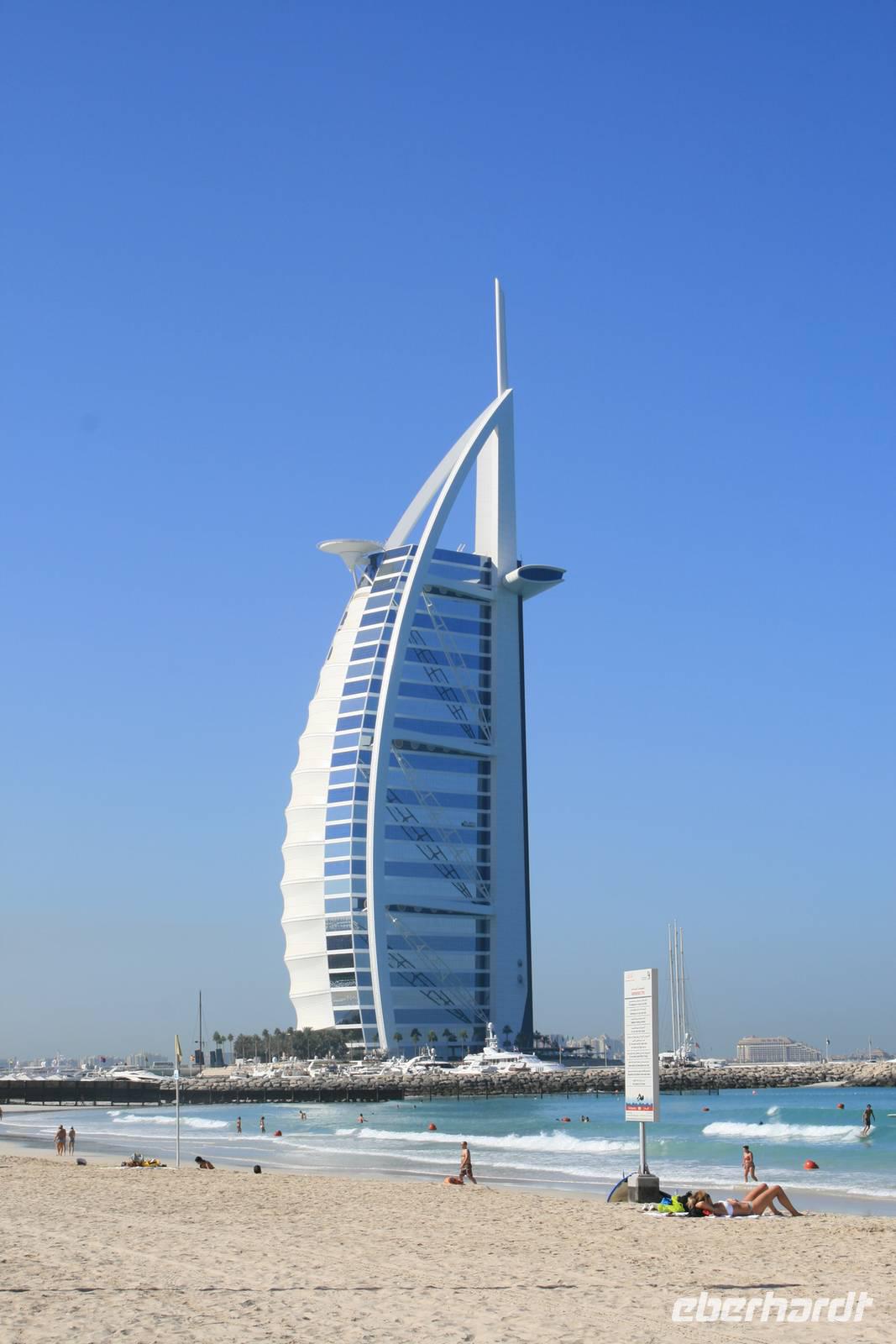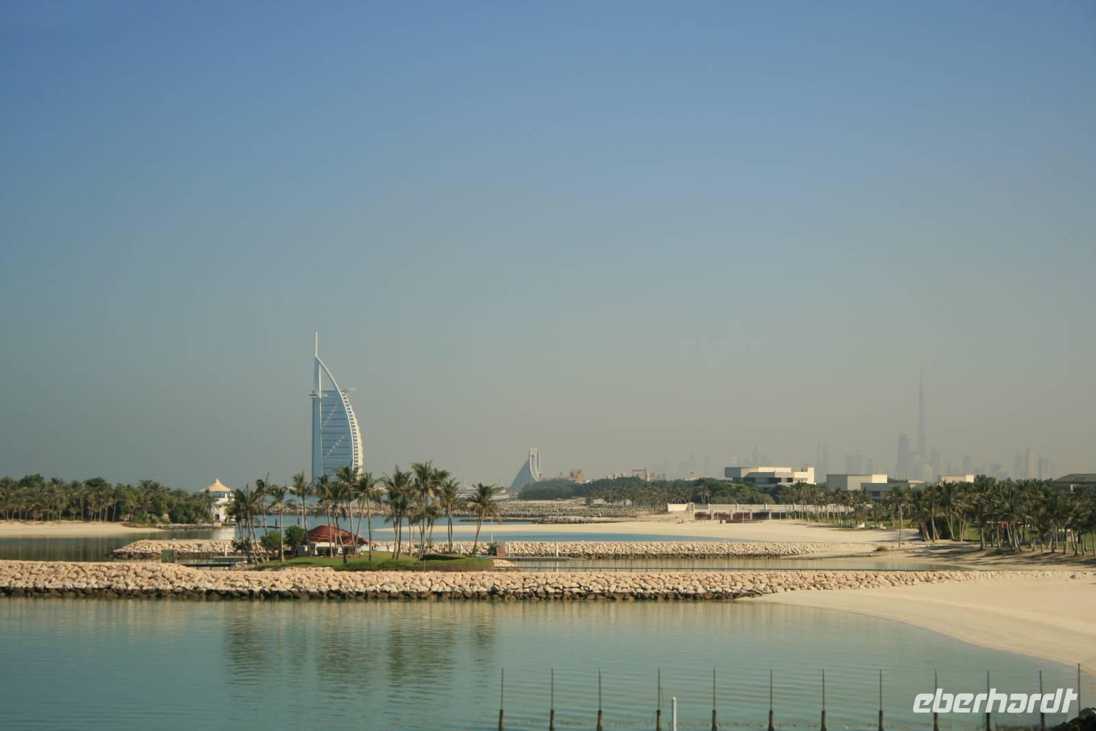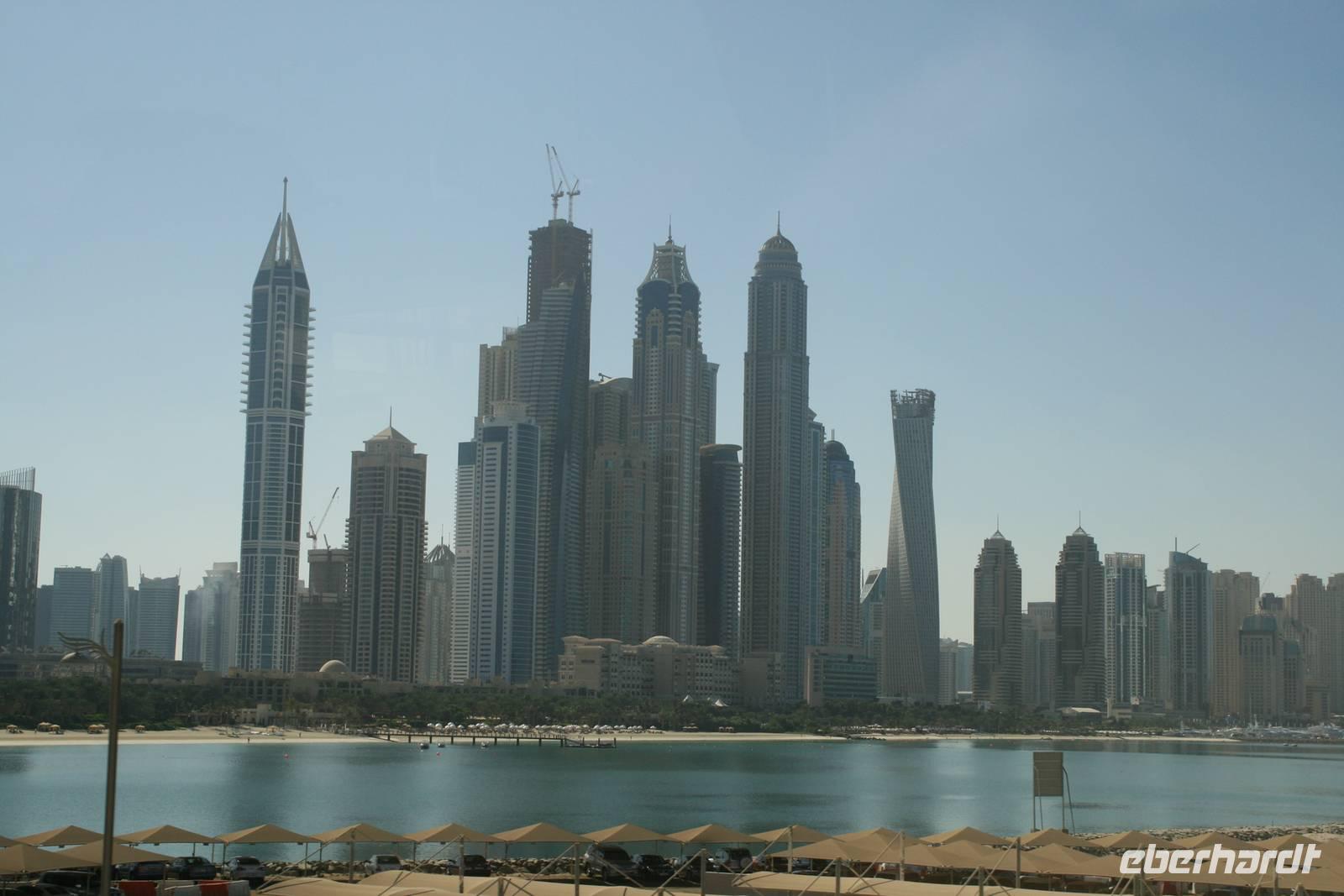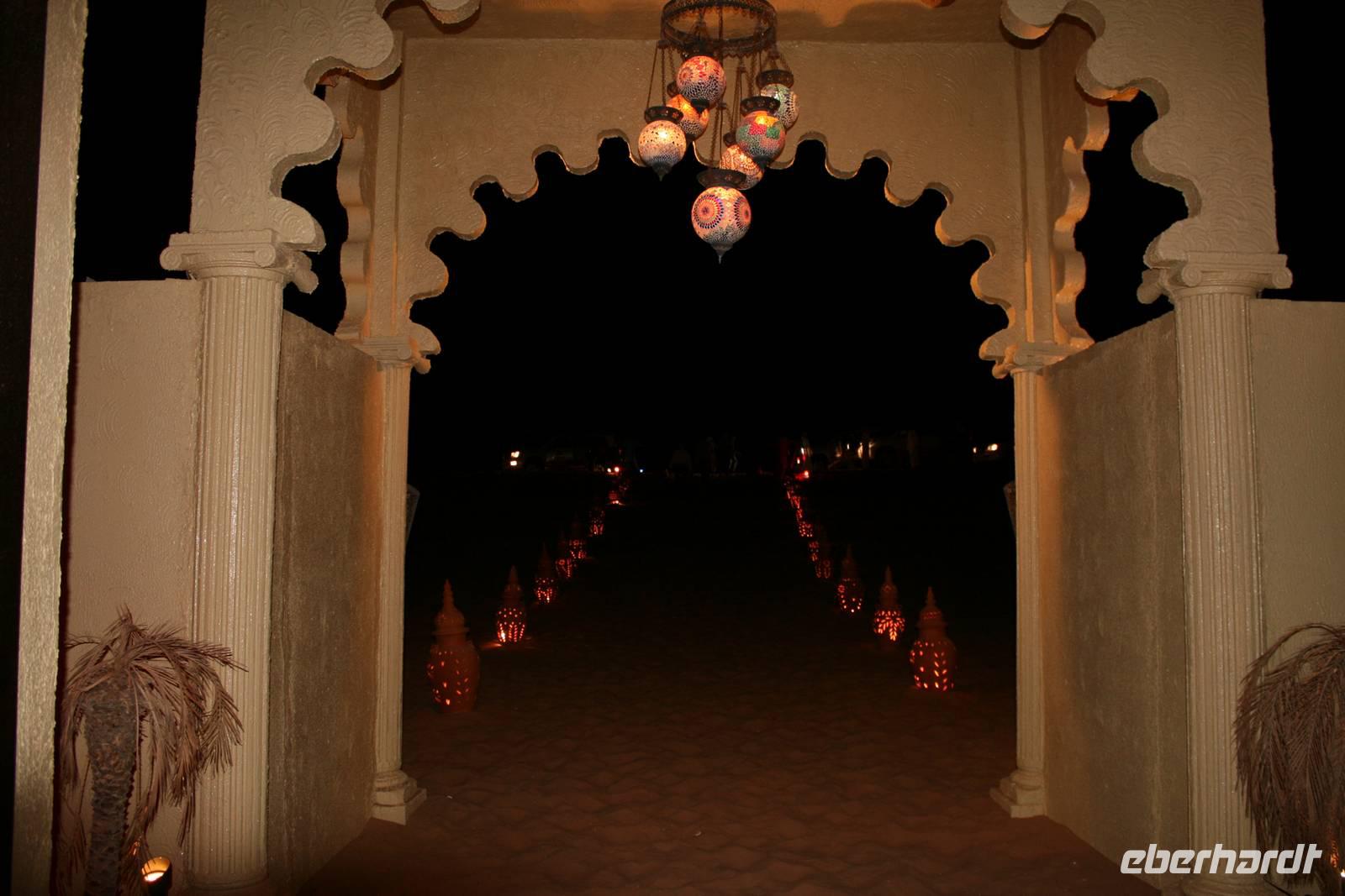 Eberhardt TRAVEL treibt seine Reisegäste nicht nur auf die Palme (Palm Jumeirah), sondern schickt sie auch noch in die Wüste Deswegen standen nach dem Mittagessen im Hotel schon unsere modernen Jeeps für die bevorstehende Wüstentour bereit. Die Fahrer hatten die Autos bestens unter Kontrolle und zeigten uns natürlich ihre Fahrkünste. So ließen wir keine Düne aus und hatten auf der Fahrt zum Wüstencamp jede Menge Spaß! Im Wüstencamp saßen wir gemütlich unter freiem Sternenhimmel, die Henna-Lady zauberte kleine Kunstwerke auf die Haut unserer Frauen und die Köche leisteten auch sehr gute Arbeit. Das Barbecue schmeckte in dieser Atmosphäre natürlich umso besser! Ein Darwish-Tänzer und eine Bauchtänzerin rundeten den Abend bei orientalischen Klängen wunderschön ab. Mit den Jeeps ging es dann zurück nach Dubai und ins Hotel.
