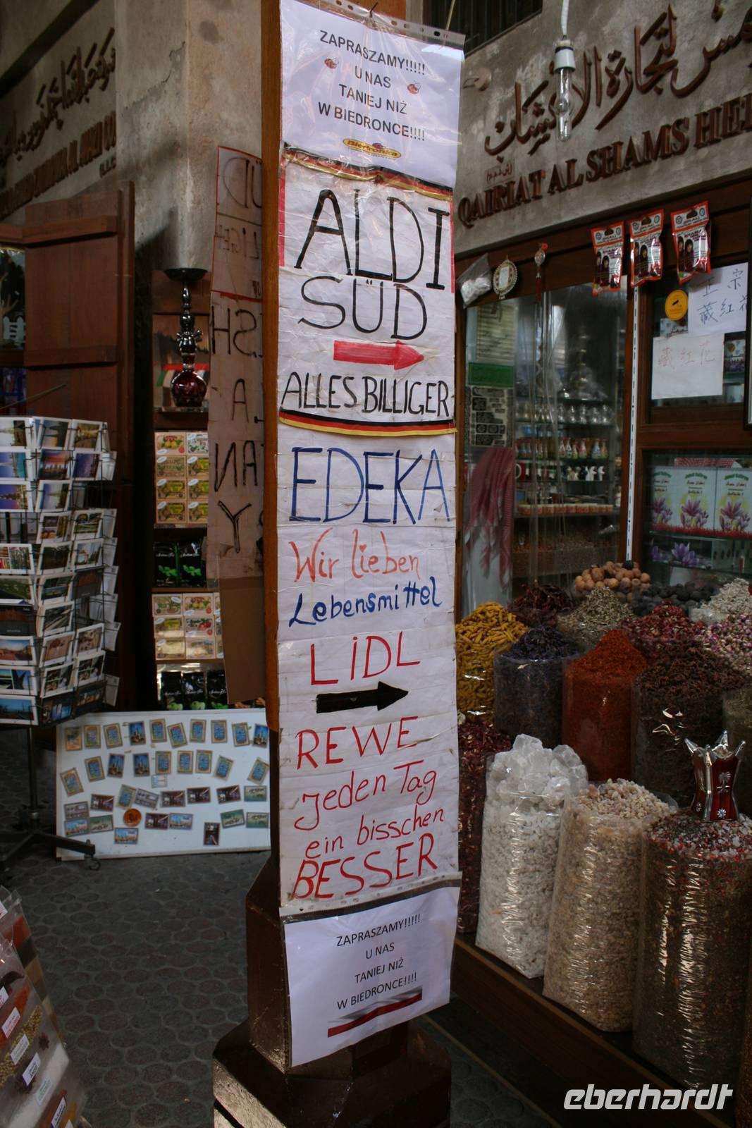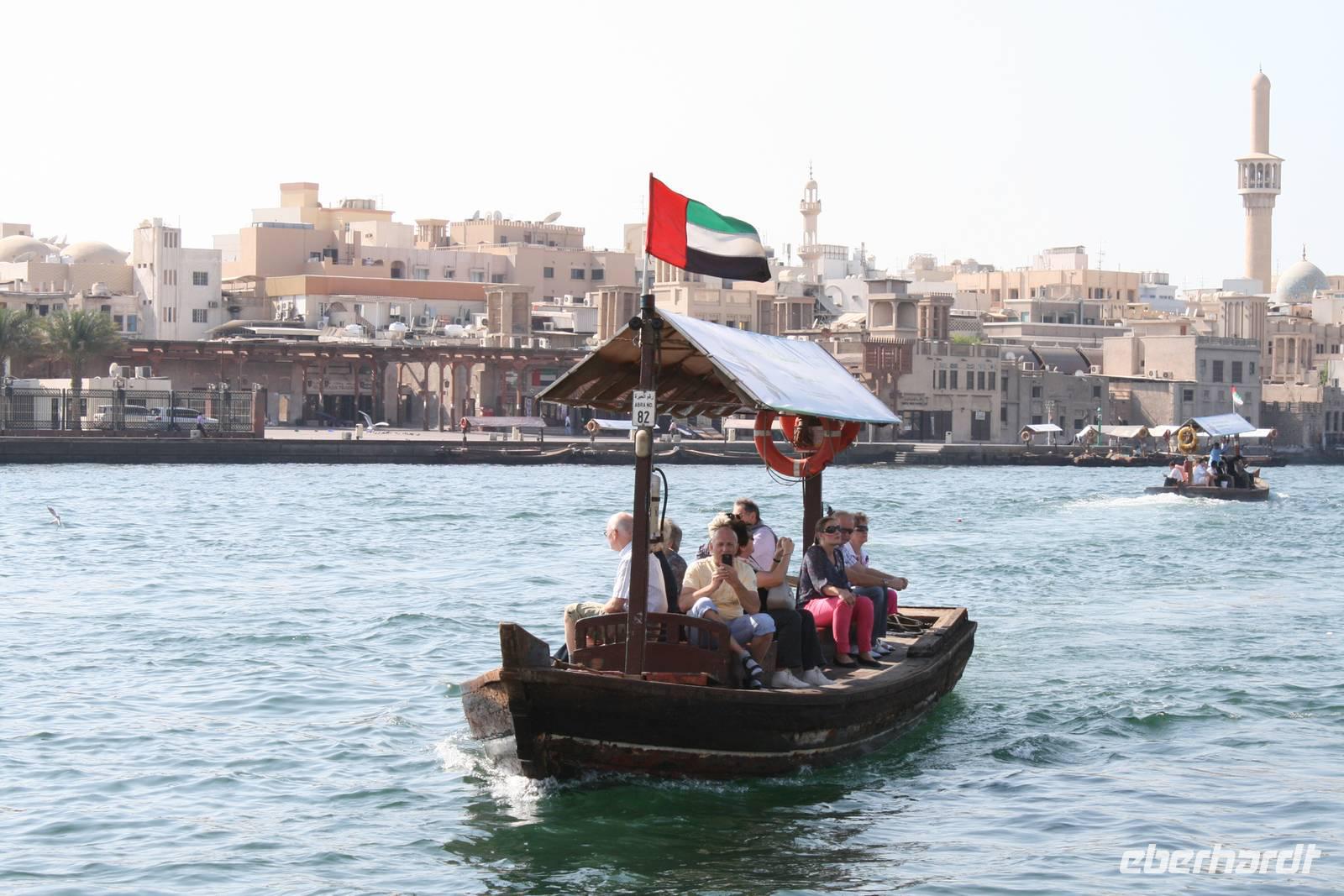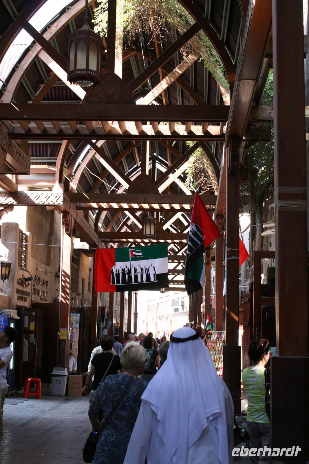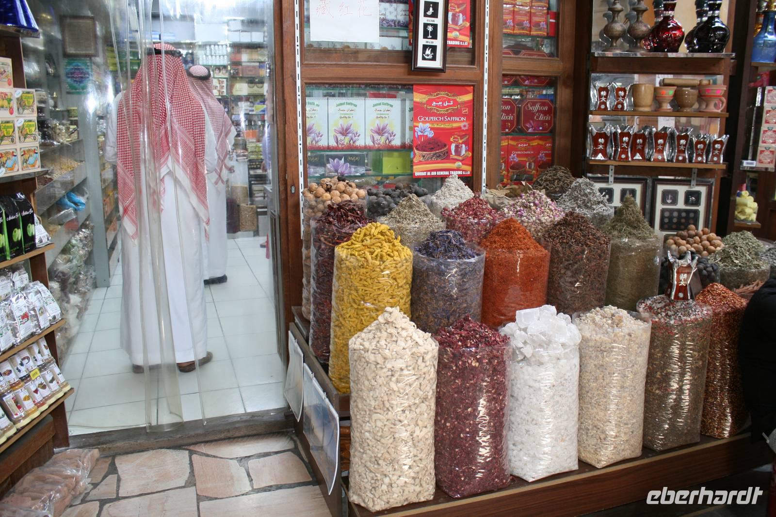 Dann schlenderten wir durch den schönen Dubai Old Souk, dessen schmale, segeltuch- und holzdachüberspannte Einkaufsgassen sich durch das Bastakiya-Viertel winden. Mit dem traditionellen Wassertaxi, der Abra, fuhren wir einmal über den Creek und sahen schon die zu spitzen Kegeln aufgetürmten, exotischen Gewürze des Gewürz-Souks. Darunter feinfädriger, fast oranger Safran, gemahlener Kardamom, getrocknete Limonen, feuerrote Chilischoten, Pfeffer, Paprika, Curry und Koriander. Ein Dufterlebnis pur!
