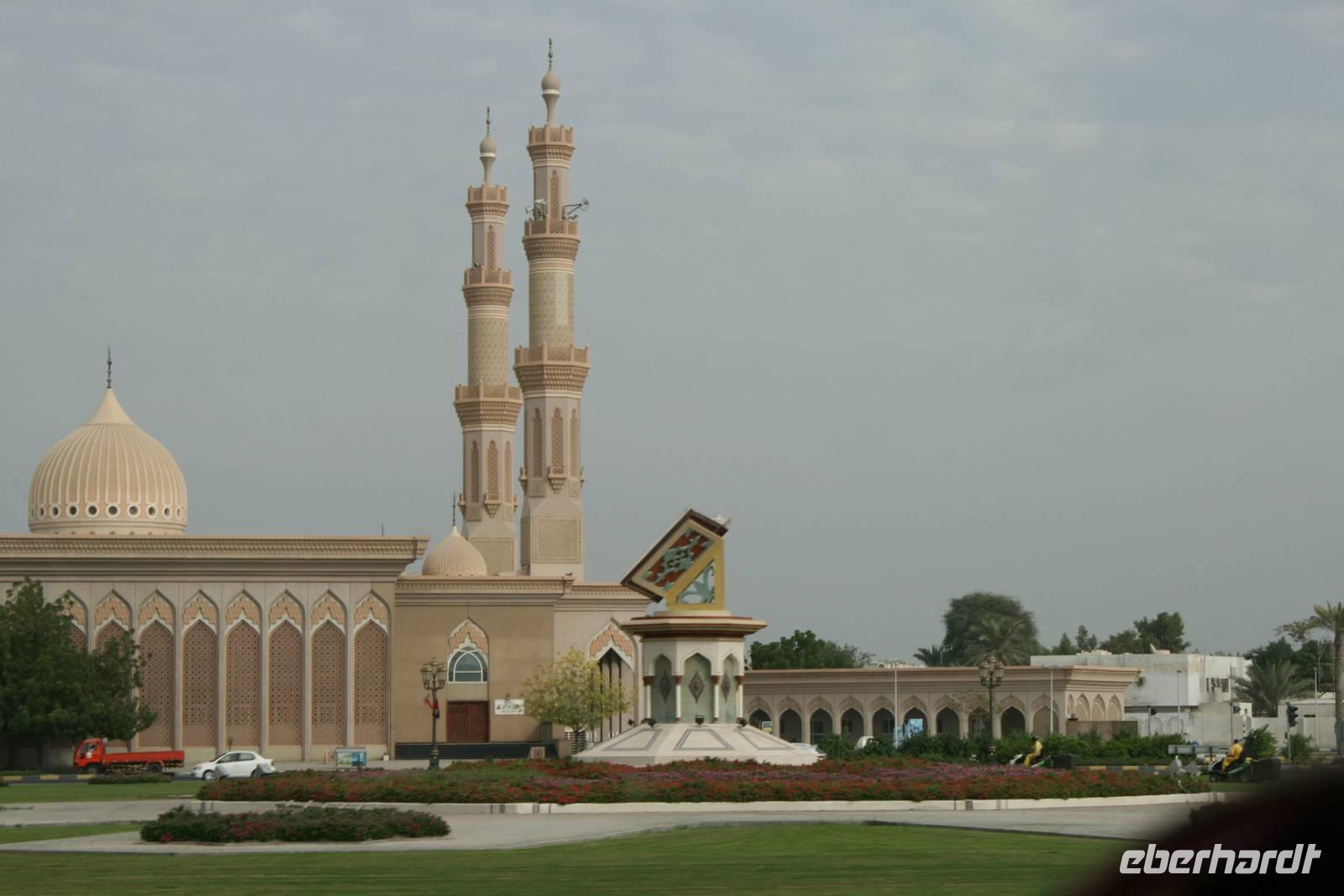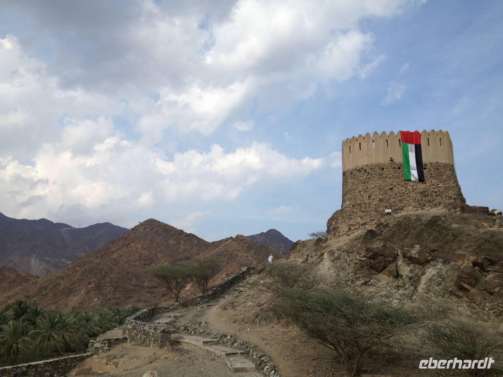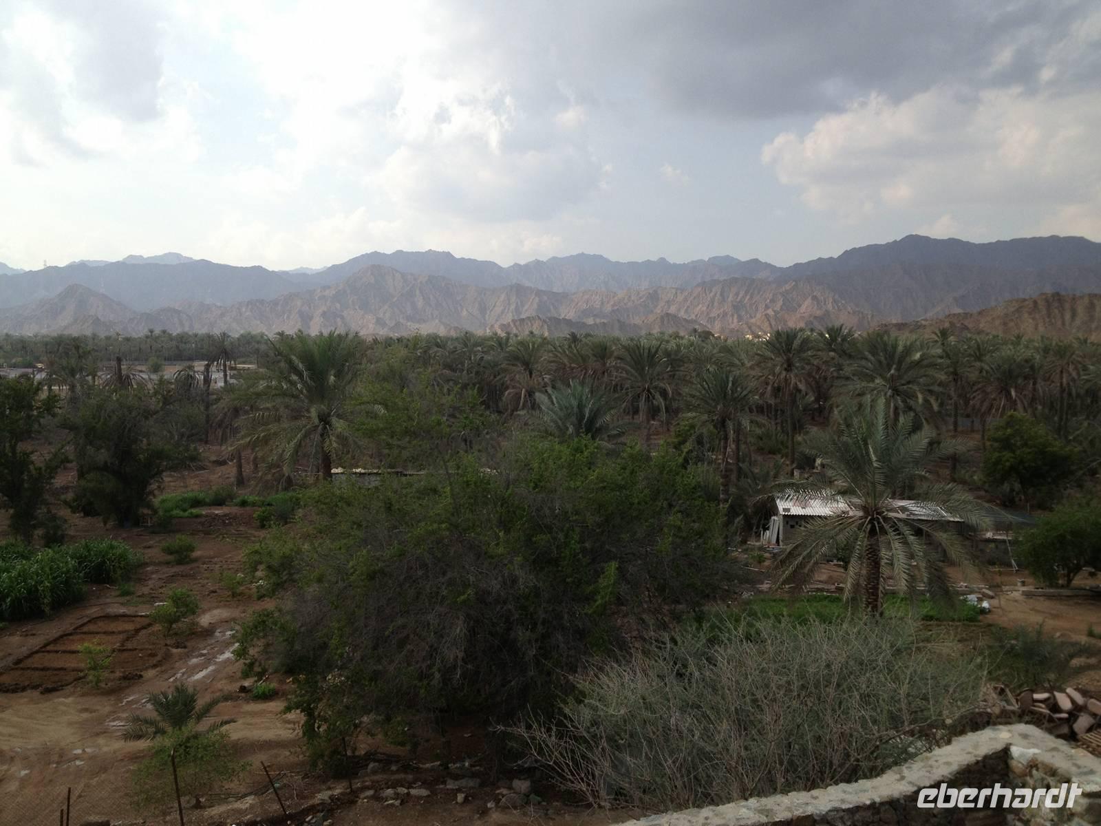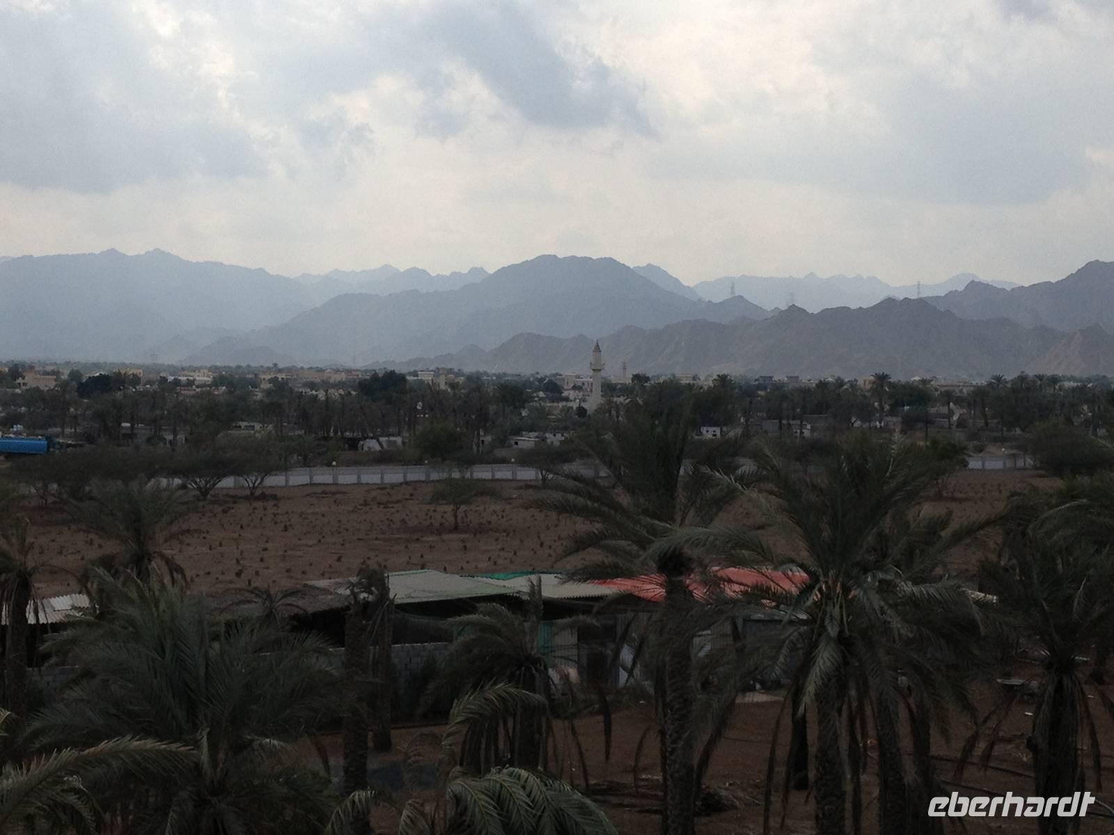 In einer kleinen Ortschaft halten wir am bunten Freitagsmarkt. Dass heute Donnerstag ist, störte dabei wenig. Der Freitagsmarkt hat nämlich so gut eingeschlagen, dass er schon seit langem täglich abgehalten wird. Hier kann man von Teppichen, über Pflanzen, Obst und Gemüse, Spielzeug und Küchengeräte alles kaufen. Durch die kleine Emiratshauptstadt Fujairah gelangten wir zum großen Hafen. Hier verlässt das geförderte Rohöl mit großen Schiffen die Emirate in alle Welt. Weiter nordwärts an der Küste des Golfs von Oman statteten wir der Bidiya Moschee einen Besuch ab. Sie ist vermutlich um 1500 errichtet wurden und somit die älteste Moschee der Vereinigten Arabischen Emirate. Auf dem Hügel nebenan erlaubten zwei historische Wachtürme eine schöne Aussicht: Landeinwärts schweifte der Blick über die grünen Wipfel der Palmengärten zu den braun-roten Hängen des Hajar-Gebirges, auf der gegenüberliegenden Seite dehnte sich jenseits des Uferstreifens das weite Blau des Meeres bis zum Horizont aus.