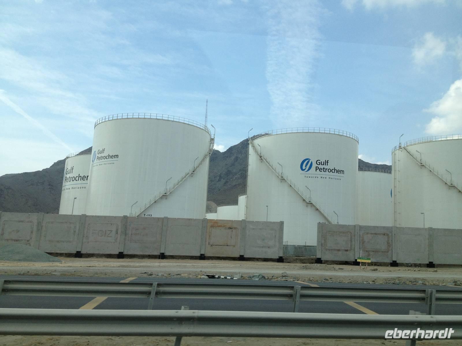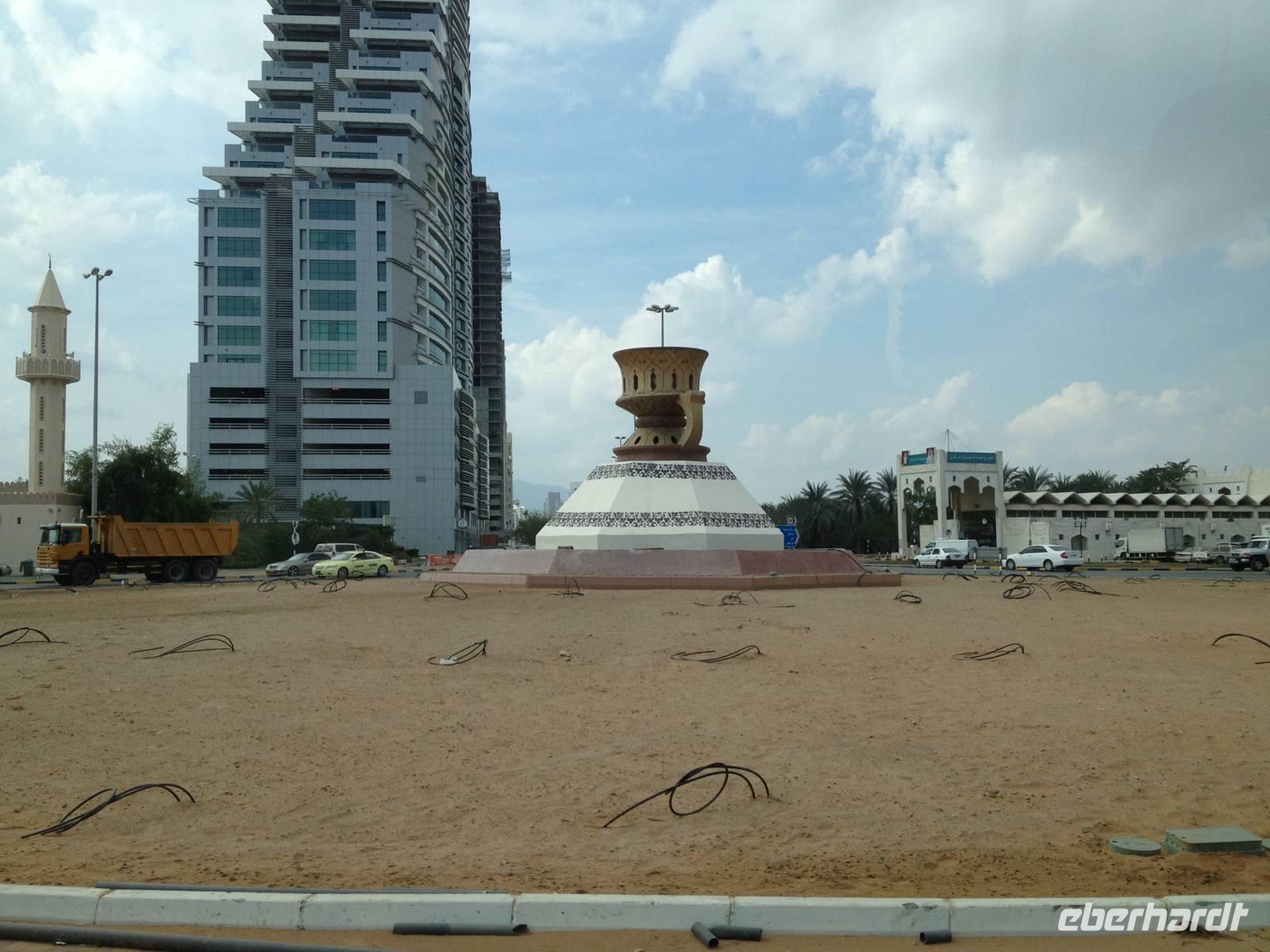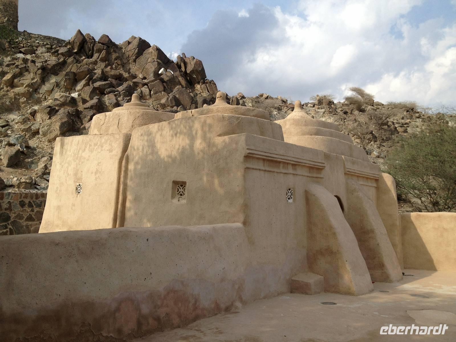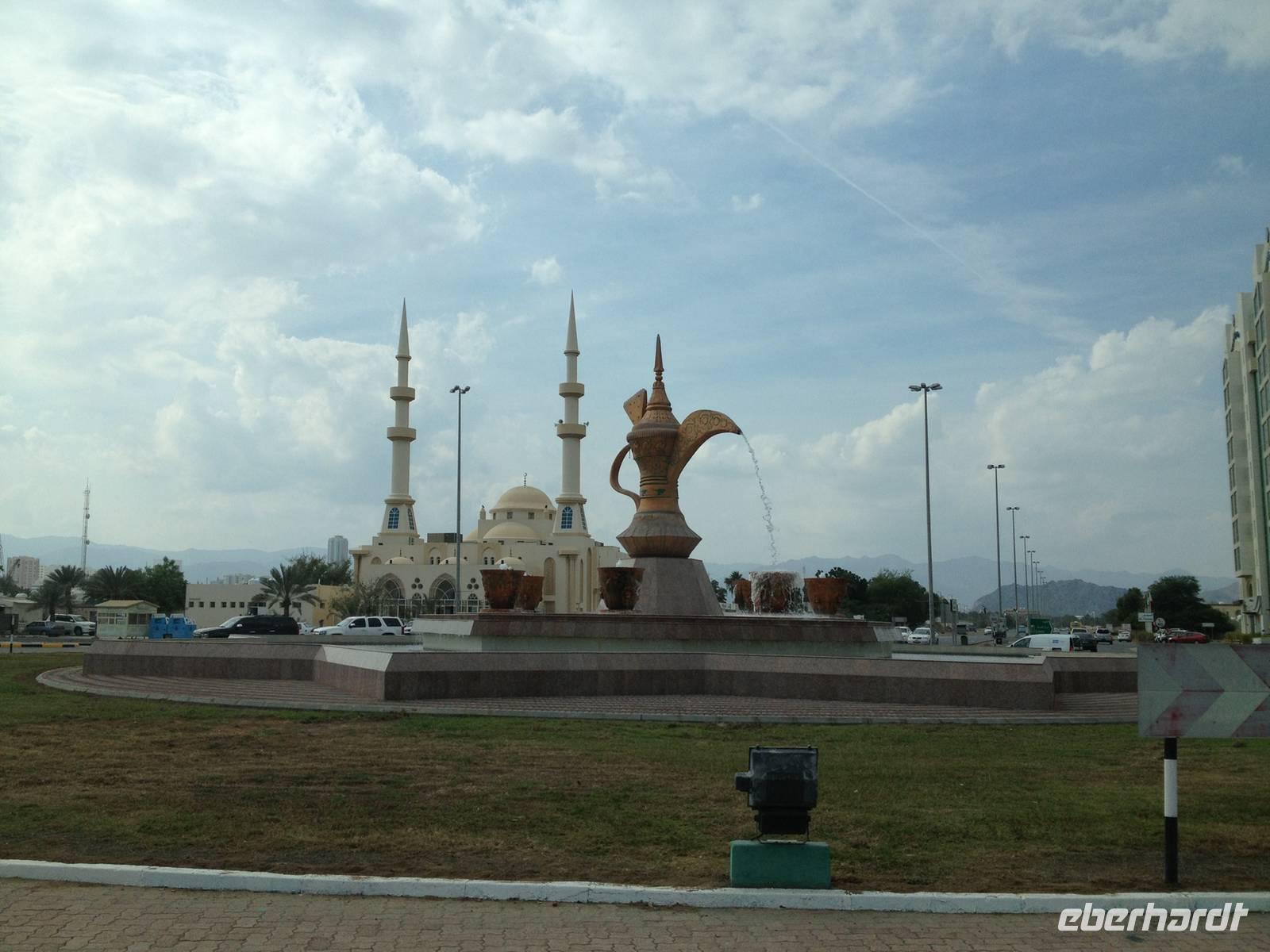 In einer kleinen Ortschaft halten wir am bunten Freitagsmarkt. Dass heute Donnerstag ist, störte dabei wenig. Der Freitagsmarkt hat nämlich so gut eingeschlagen, dass er schon seit langem täglich abgehalten wird. Hier kann man von Teppichen, über Pflanzen, Obst und Gemüse, Spielzeug und Küchengeräte alles kaufen. Durch die kleine Emiratshauptstadt Fujairah gelangten wir zum großen Hafen. Hier verlässt das geförderte Rohöl mit großen Schiffen die Emirate in alle Welt. Weiter nordwärts an der Küste des Golfs von Oman statteten wir der Bidiya Moschee einen Besuch ab. Sie ist vermutlich um 1500 errichtet wurden und somit die älteste Moschee der Vereinigten Arabischen Emirate. Auf dem Hügel nebenan erlaubten zwei historische Wachtürme eine schöne Aussicht: Landeinwärts schweifte der Blick über die grünen Wipfel der Palmengärten zu den braun-roten Hängen des Hajar-Gebirges, auf der gegenüberliegenden Seite dehnte sich jenseits des Uferstreifens das weite Blau des Meeres bis zum Horizont aus.