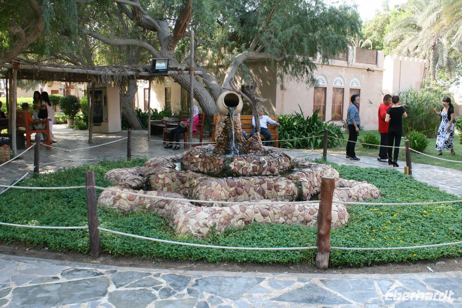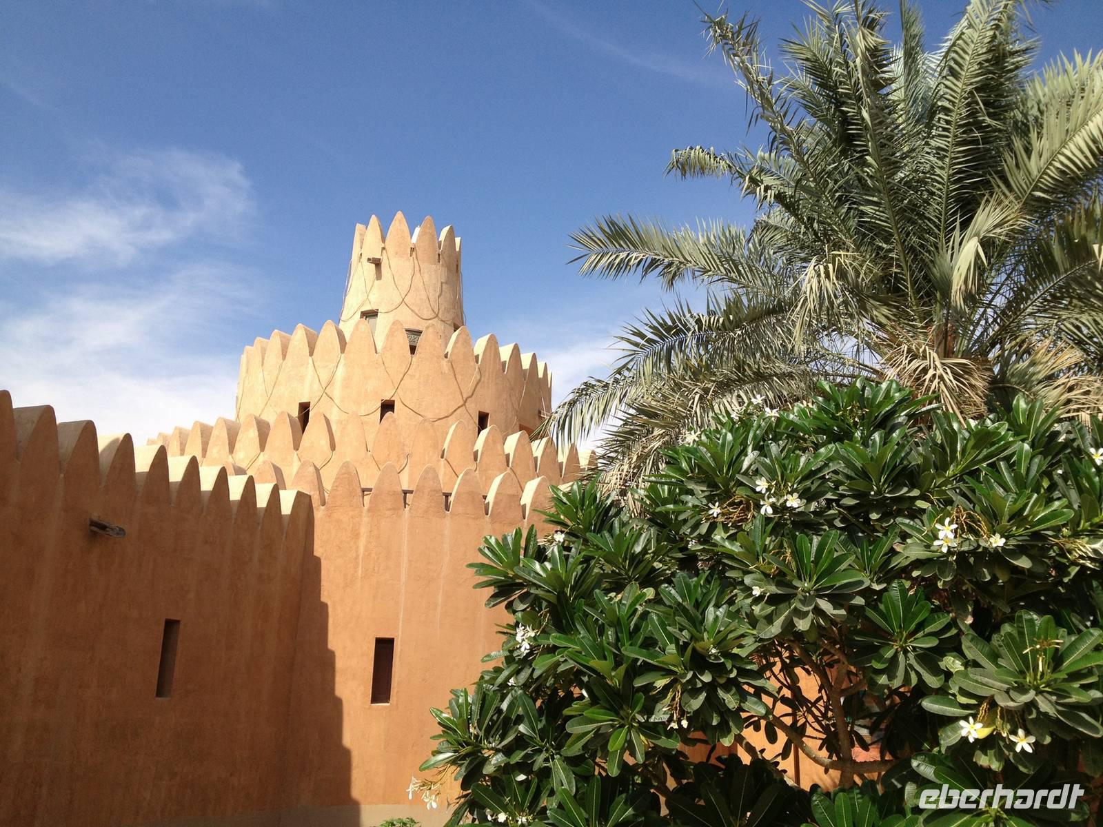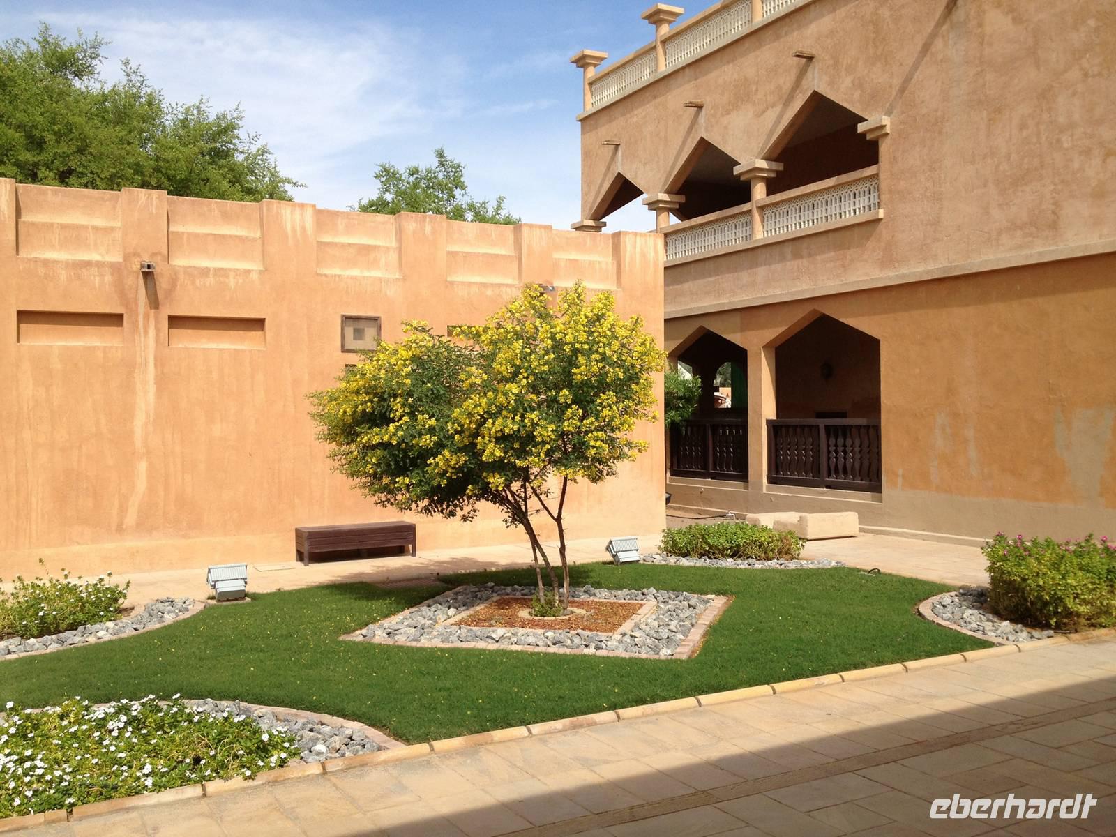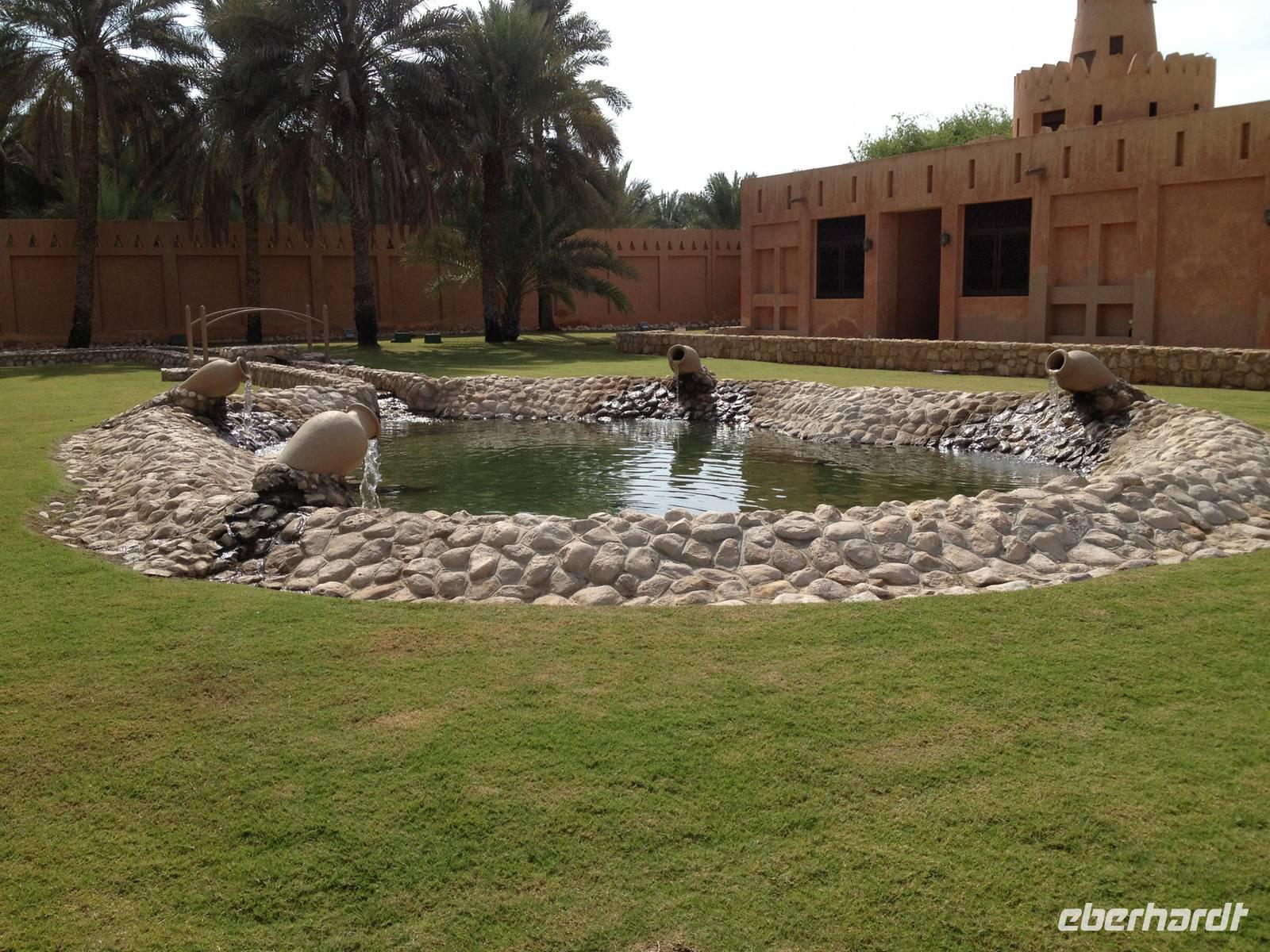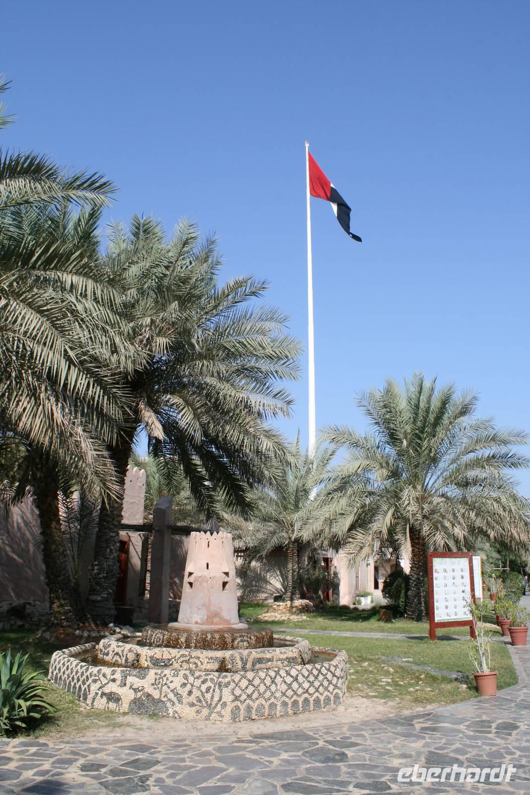 Ain bedeutet im Arabischen Quelle oder schlicht und einfach Wasser. Die Siedlung an der Grenze zum Sultanat Oman und am Westrand des Hajar-Gebirges verfügt über beträchtliche Grundwasserreserven und trägt ihren Beinamen Gartenstadt völlig zu Recht, denn zahlreiche Palmenhaine und Grünflächen bestimmen das Bild der lebendigen Universitätsstadt Al Ain. Al Ain ist die Geburtsstadt des Scheichs Zayed bin Sultan Al Nahyan. Im prächtigen Lehmbau des Al Ain Palastmuseums erfuhren wir durch Anja viel über das Leben der Herrscherfamilie und wir konnten in die ehemaligen Privatgemächer des Scheichs einen Blick werfen. Schlaf- und Wohnzimmer sowie die Gäste- und Empfangsräume (die Majlis) wurden sehr authentisch wieder hergerichtet. Auf dem Weg zum Nationalmuseum nahmen wir kurzerhand die Abkürzung durch die Palmenoase. Hier sahen wir das vom Scheich Zayed erneuerte, traditionelle Falaj-Bewässerungssystem, wodurch Al Ains Landwirtschaft nachhaltig erblühte. Wir konnten auch einem Einheimischen zusehen, wie schnell man eine Dattelpalme erklimmen kann. Anja versuchte es auch, kam aber leider nicht allzu weit