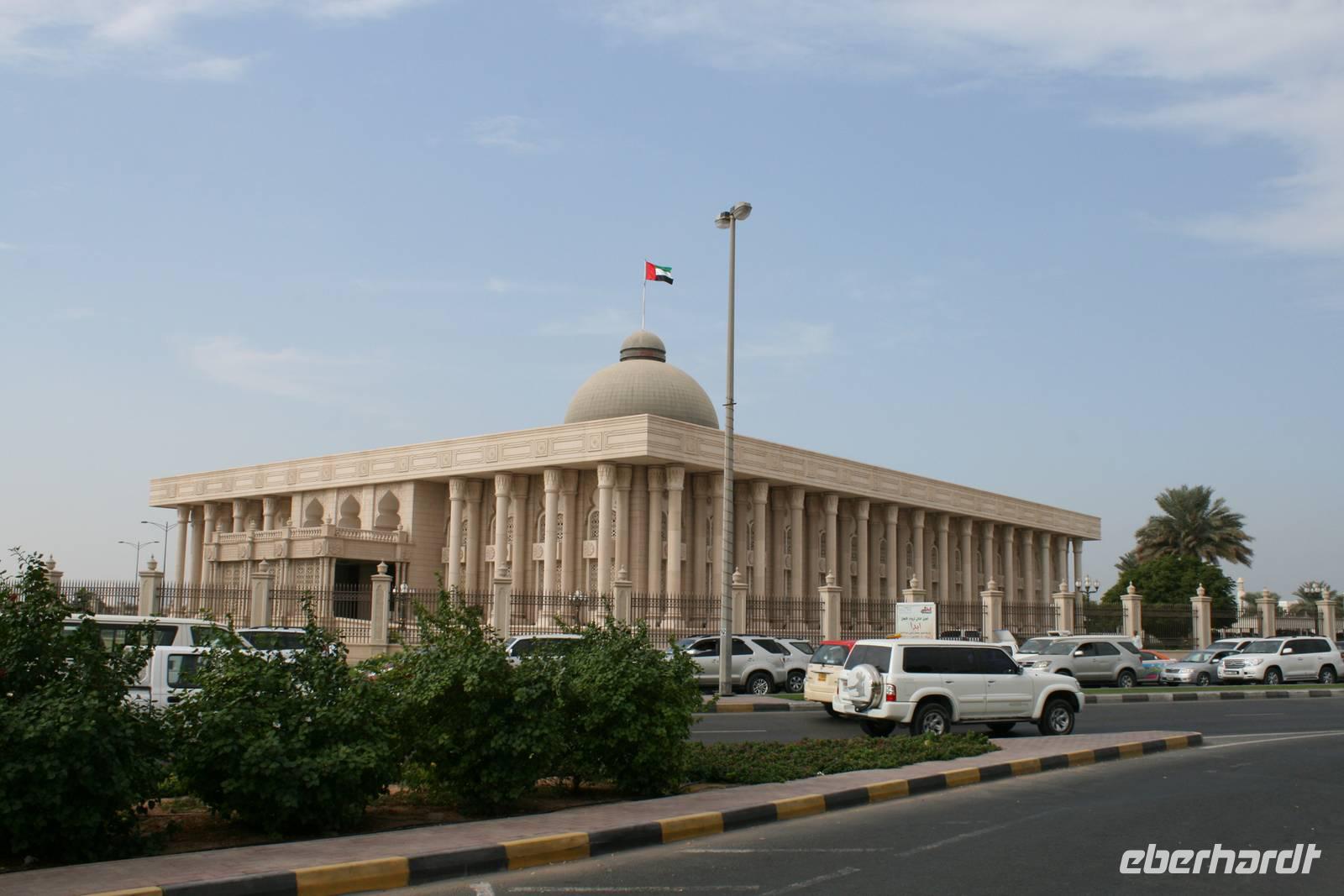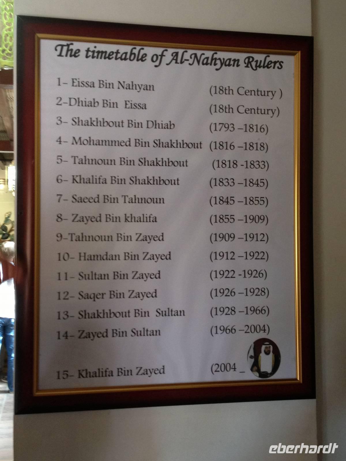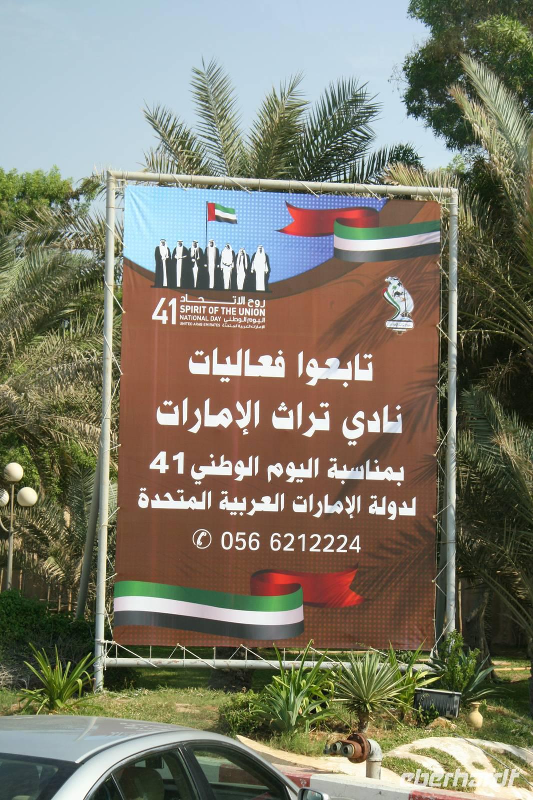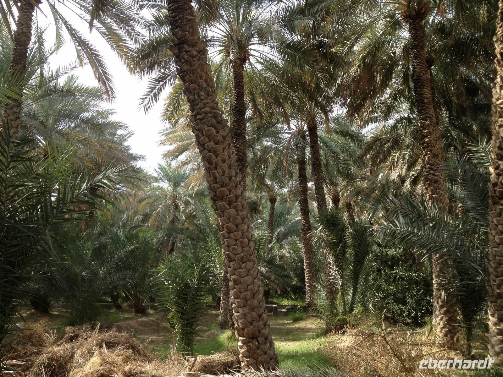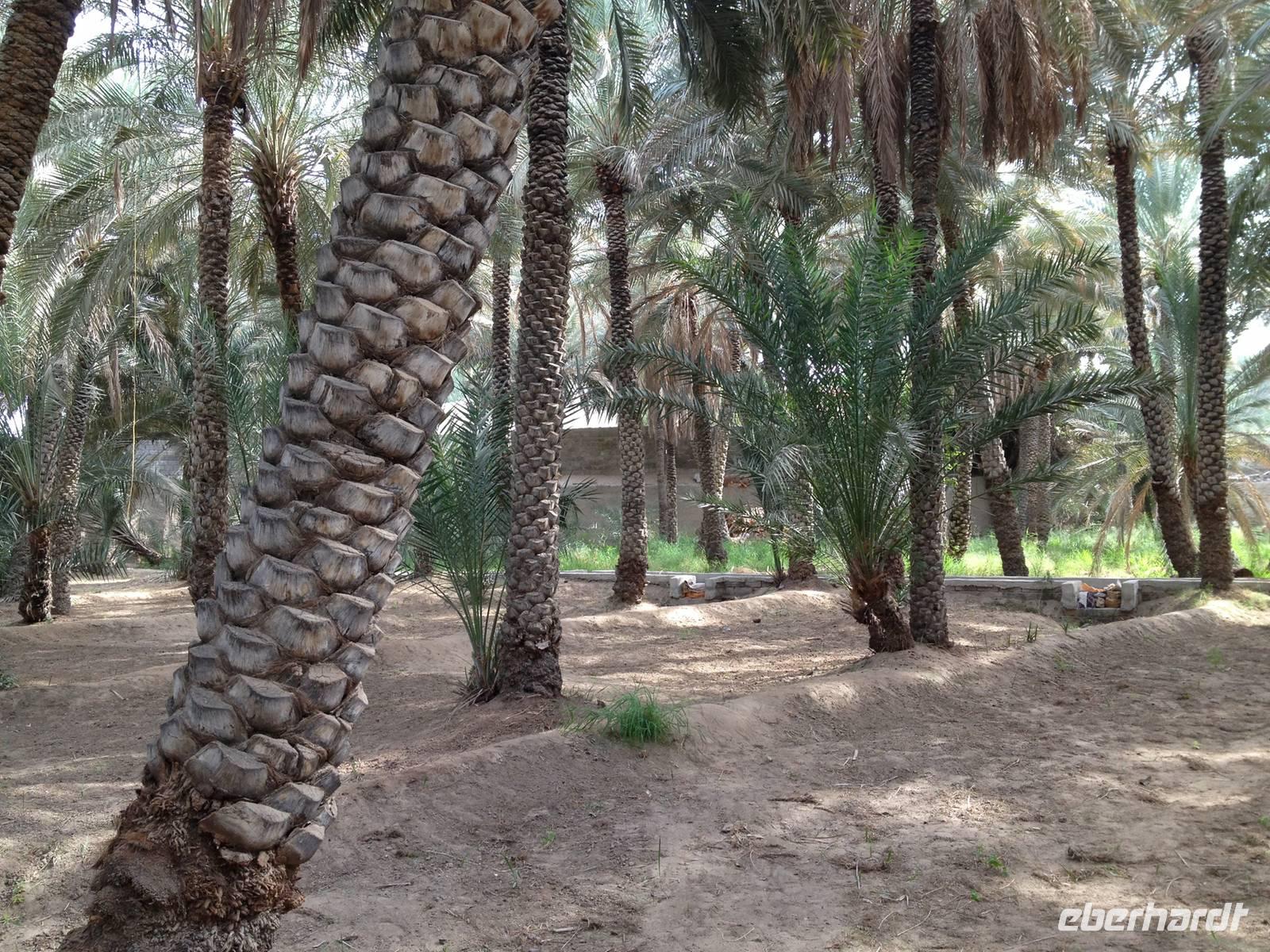 Ain bedeutet im Arabischen Quelle oder schlicht und einfach Wasser. Die Siedlung an der Grenze zum Sultanat Oman und am Westrand des Hajar-Gebirges verfügt über beträchtliche Grundwasserreserven und trägt ihren Beinamen Gartenstadt völlig zu Recht, denn zahlreiche Palmenhaine und Grünflächen bestimmen das Bild der lebendigen Universitätsstadt Al Ain. Al Ain ist die Geburtsstadt des Scheichs Zayed bin Sultan Al Nahyan. Im prächtigen Lehmbau des Al Ain Palastmuseums erfuhren wir durch Anja viel über das Leben der Herrscherfamilie und wir konnten in die ehemaligen Privatgemächer des Scheichs einen Blick werfen. Schlaf- und Wohnzimmer sowie die Gäste- und Empfangsräume (die Majlis) wurden sehr authentisch wieder hergerichtet. Auf dem Weg zum Nationalmuseum nahmen wir kurzerhand die Abkürzung durch die Palmenoase. Hier sahen wir das vom Scheich Zayed erneuerte, traditionelle Falaj-Bewässerungssystem, wodurch Al Ains Landwirtschaft nachhaltig erblühte. Wir konnten auch einem Einheimischen zusehen, wie schnell man eine Dattelpalme erklimmen kann. Anja versuchte es auch, kam aber leider nicht allzu weit