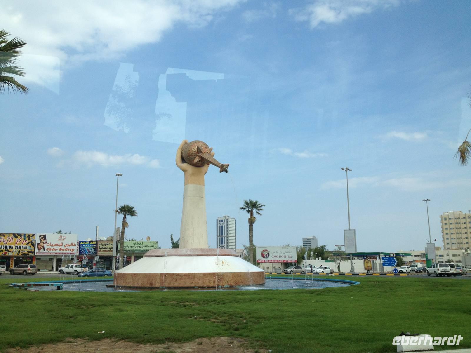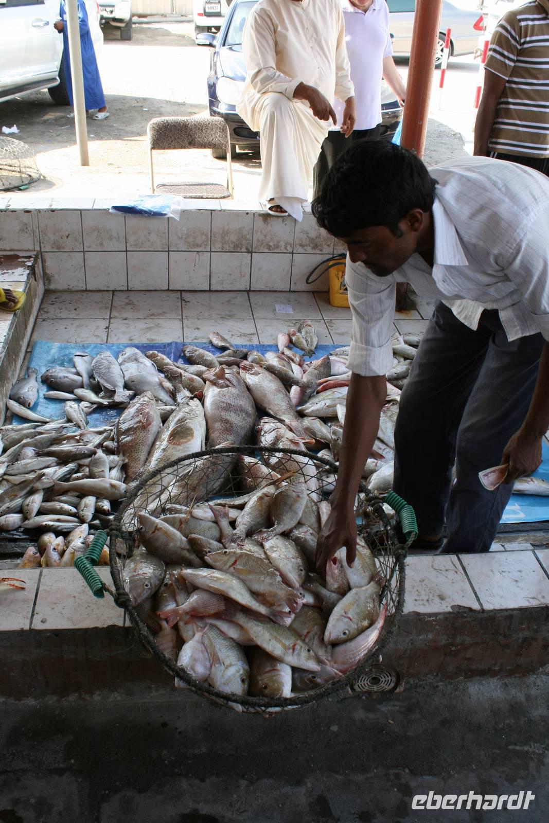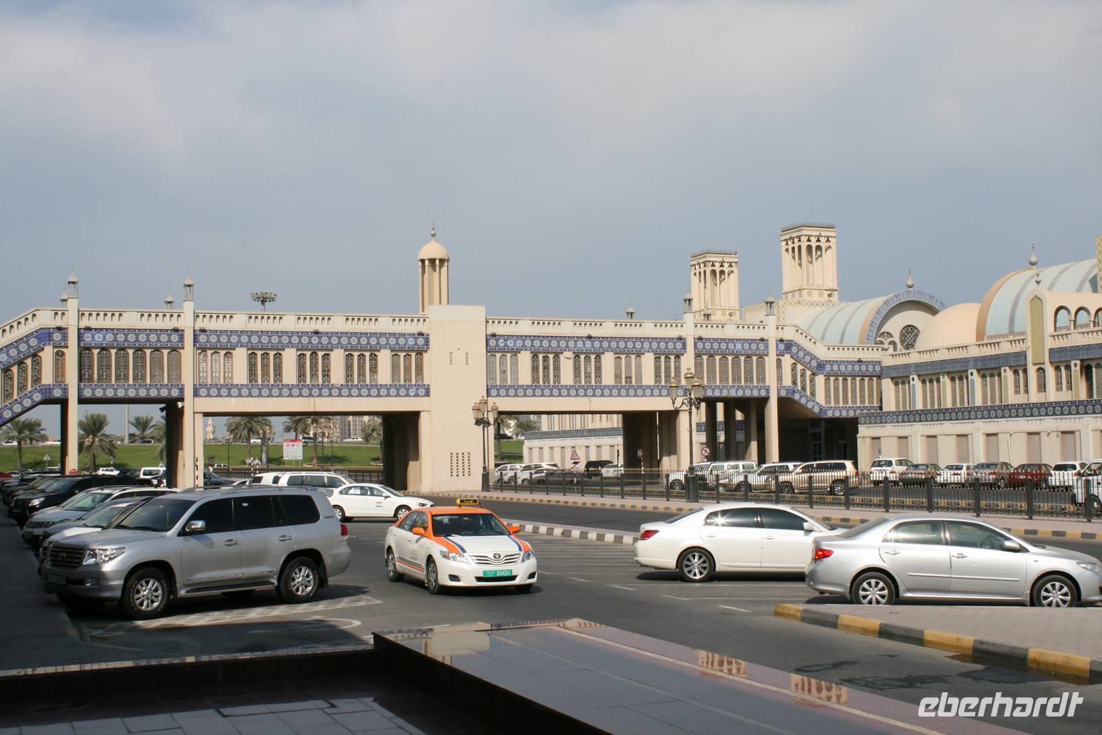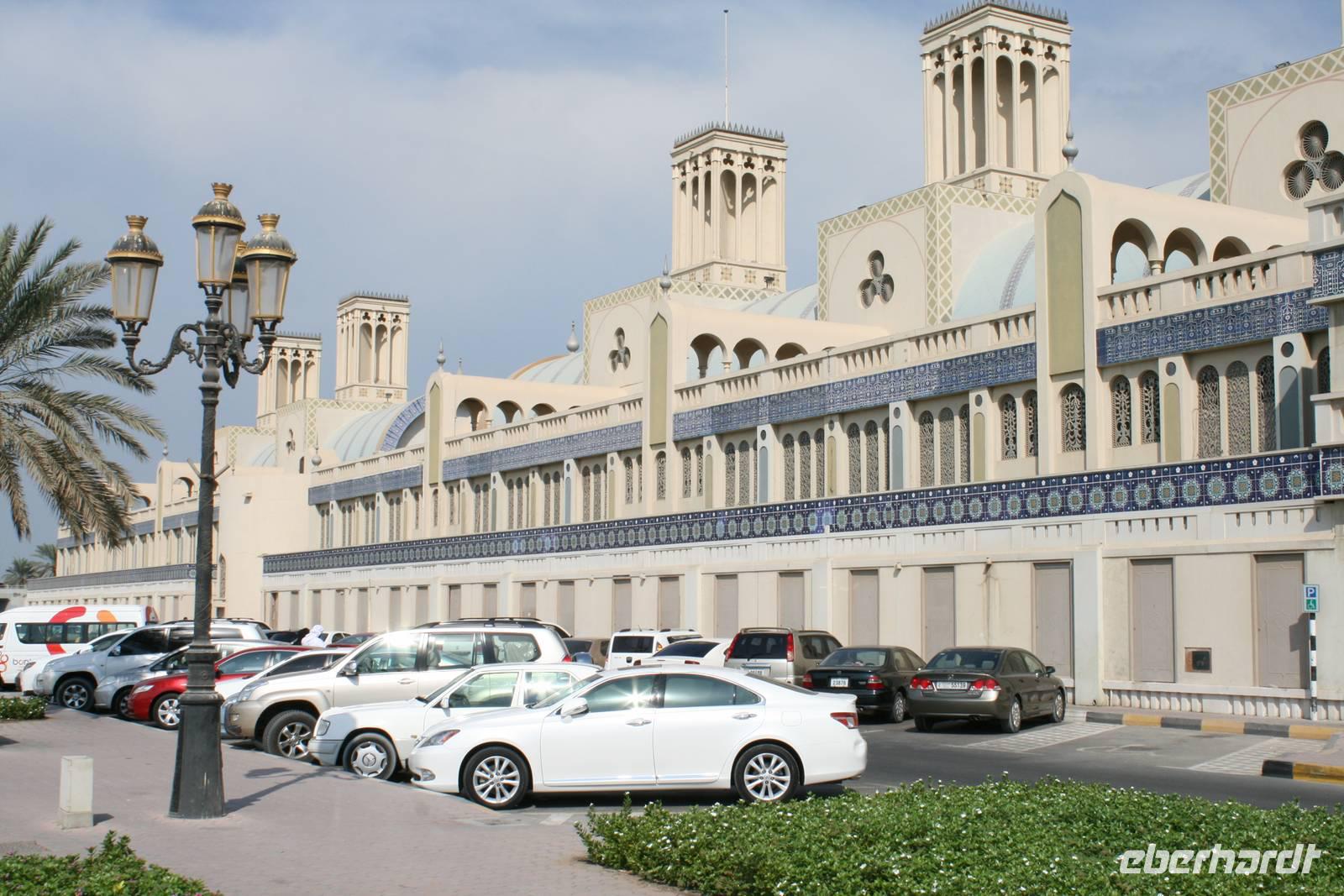 Nur wenige Kilometer von Dubai entfernt, und doch ganz anders: Mit starkem Akzent auf Kunst und Tradition geht das Emirat Sharjah seinen eigenen Weg. Auf den ersten Blick scheinen die beiden Brüder Dubai und Sharjah ziemlich gleich. Auf den ersten Blick jedenfalls. Schaut man dann genauer hin, entdeckt man schnell, dass die hübsch um eine Lagune gruppierten Hochhäuser in Sharjah deutlich weniger hoch in den Himmel ragen als in Dubai. Dass man hier statt sündhaft teurer Zuckerguss-Luftschlösser gern solide finanzierte Brötchen backt. Dass man lieber bodenständig kleckert als arrogant klotzt. Kurzum: Dass man mit beiden Beinen ziemlich sattelfest auf dem Wüstenboden steht. Dr. Scheich Sultan bin Mohammed Al Quasimi nämlich hat einen Plan für die Zukunft. Einen Masterplan. Sharjahs Herrscher inszeniert sein kleines Reich keineswegs als „Zukunftsstadt des Nahen Ostens" wie der Nachbar. Anstelle von Gigantomanie, Größenwahn und Kommerz setzt er bewusst auf eine ausgewogene Mischung aus Kultur und Moderne. Auf Kunst und Bildung. Auf Tradition und Bewahrung der arabischen Identität. Zunächst schauten wir uns den liebevoll gestalteten Koran-Kreisverkehr an. Anschließend besuchten wir den mit Sorgfalt hergerichteten alten Souk, den Souk Al-Masqoof mit seinen kleinen Lädchen, im Herzen der alten Stadt. Den nächsten Stopp legten wir am Central Souk ein. Dieses Shoppingparadies erstreckt sich auf ca. 80.000 m² und besitzt eine typisch islamische Architektur. Wegen der blauen Dachgewölbe und der blaugemusterten Verzierungen an den Außenfassaden wird er häufig auch als der Blaue Souk bezeichnet. Anschließend führte uns Anja zum Fischmarkt, auf dem wir den Fang des Tages begutachteten und so manch außergewöhnliche Fische sehen konnten.