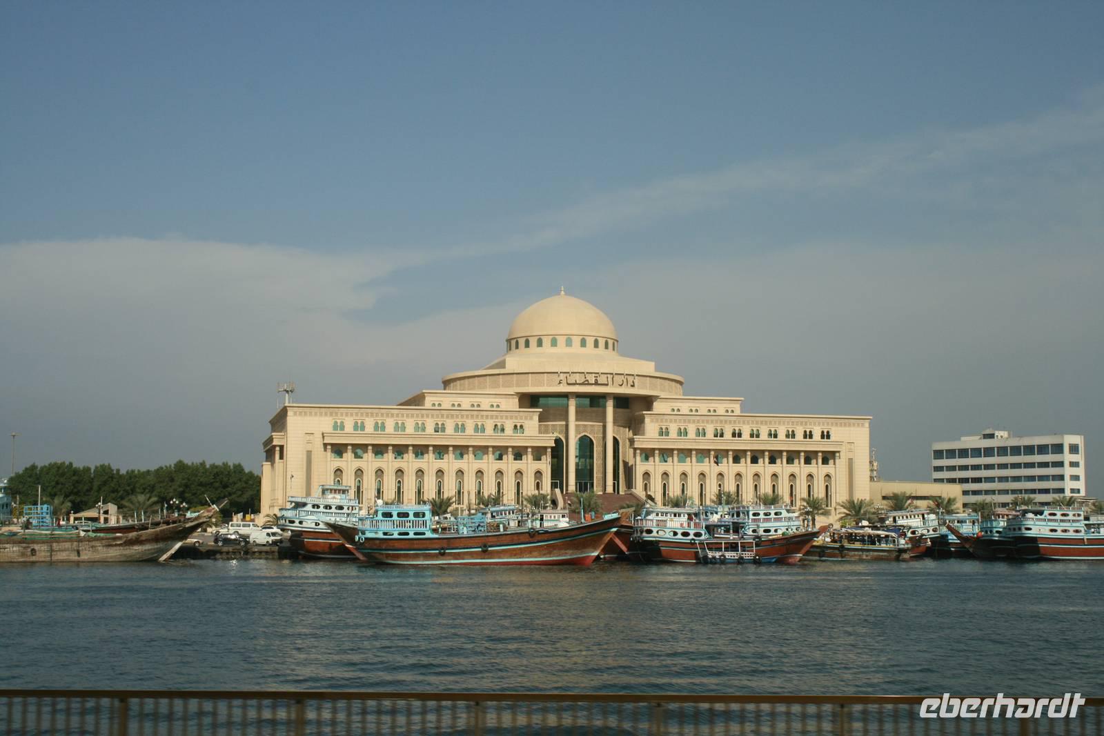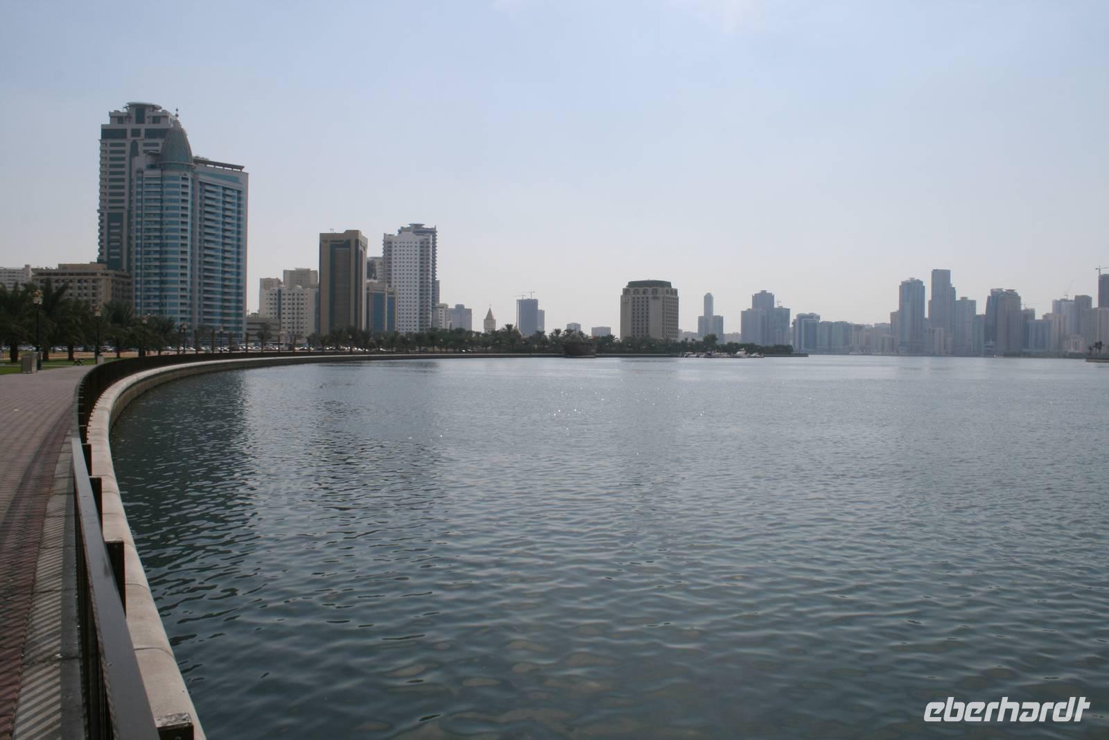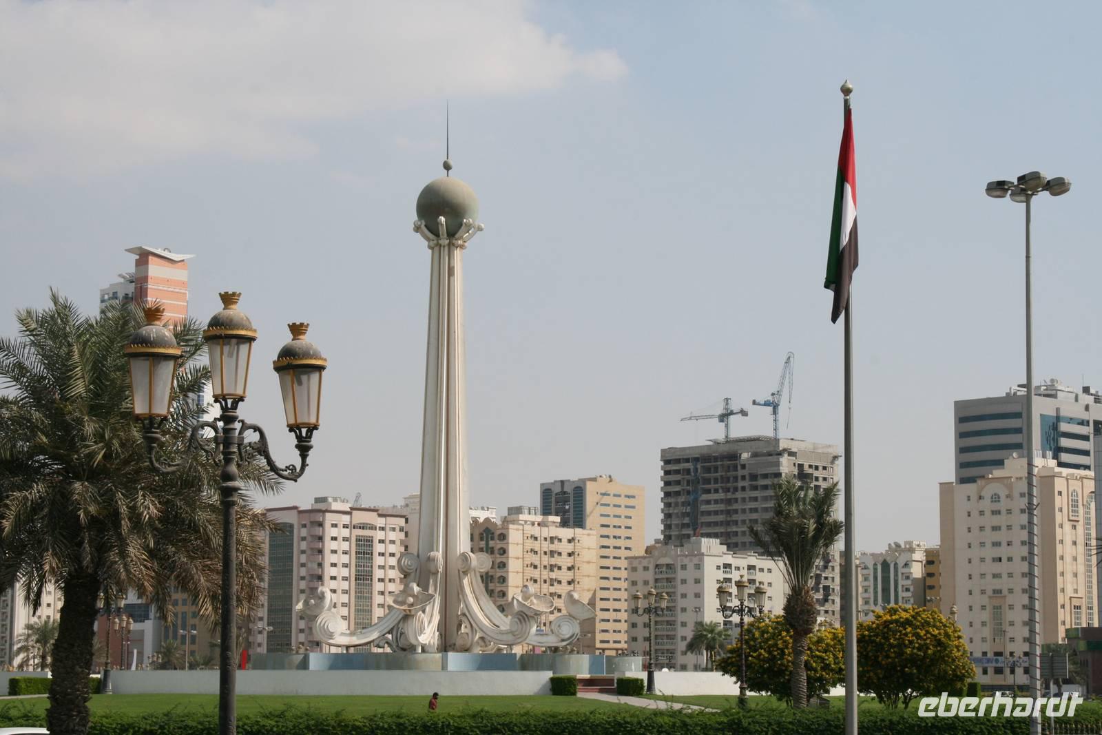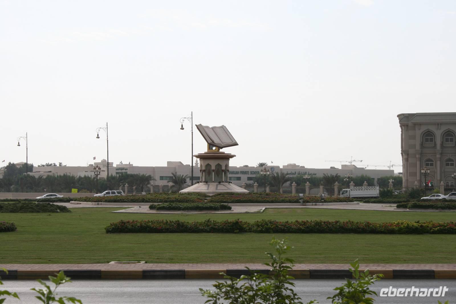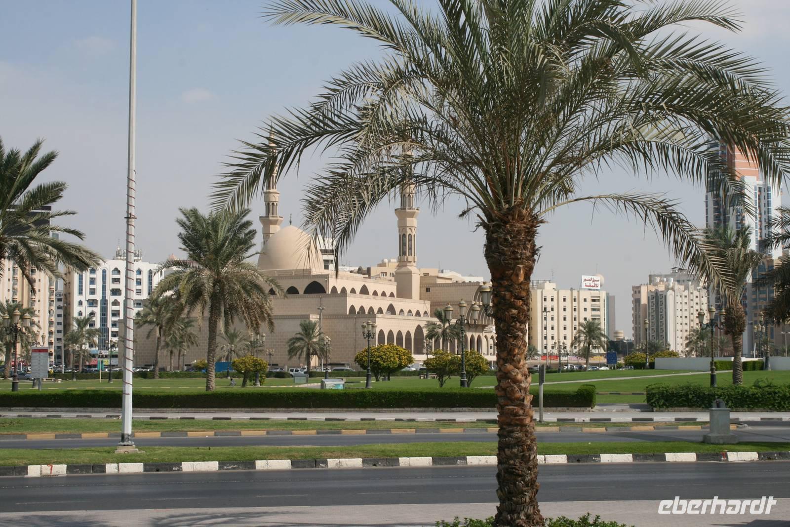 Nur wenige Kilometer von Dubai entfernt, und doch ganz anders: Mit starkem Akzent auf Kunst und Tradition geht das Emirat Sharjah seinen eigenen Weg. Auf den ersten Blick scheinen die beiden Brüder Dubai und Sharjah ziemlich gleich. Auf den ersten Blick jedenfalls. Schaut man dann genauer hin, entdeckt man schnell, dass die hübsch um eine Lagune gruppierten Hochhäuser in Sharjah deutlich weniger hoch in den Himmel ragen als in Dubai. Dass man hier statt sündhaft teurer Zuckerguss-Luftschlösser gern solide finanzierte Brötchen backt. Dass man lieber bodenständig kleckert als arrogant klotzt. Kurzum: Dass man mit beiden Beinen ziemlich sattelfest auf dem Wüstenboden steht. Dr. Scheich Sultan bin Mohammed Al Quasimi nämlich hat einen Plan für die Zukunft. Einen Masterplan. Sharjahs Herrscher inszeniert sein kleines Reich keineswegs als „Zukunftsstadt des Nahen Ostens" wie der Nachbar. Anstelle von Gigantomanie, Größenwahn und Kommerz setzt er bewusst auf eine ausgewogene Mischung aus Kultur und Moderne. Auf Kunst und Bildung. Auf Tradition und Bewahrung der arabischen Identität. Zunächst schauten wir uns den liebevoll gestalteten Koran-Kreisverkehr an. Anschließend besuchten wir den mit Sorgfalt hergerichteten alten Souk, den Souk Al-Masqoof mit seinen kleinen Lädchen, im Herzen der alten Stadt. Den nächsten Stopp legten wir am Central Souk ein. Dieses Shoppingparadies erstreckt sich auf ca. 80.000 m² und besitzt eine typisch islamische Architektur. Wegen der blauen Dachgewölbe und der blaugemusterten Verzierungen an den Außenfassaden wird er häufig auch als der Blaue Souk bezeichnet. Anschließend führte uns Anja zum Fischmarkt, auf dem wir den Fang des Tages begutachteten und so manch außergewöhnliche Fische sehen konnten.