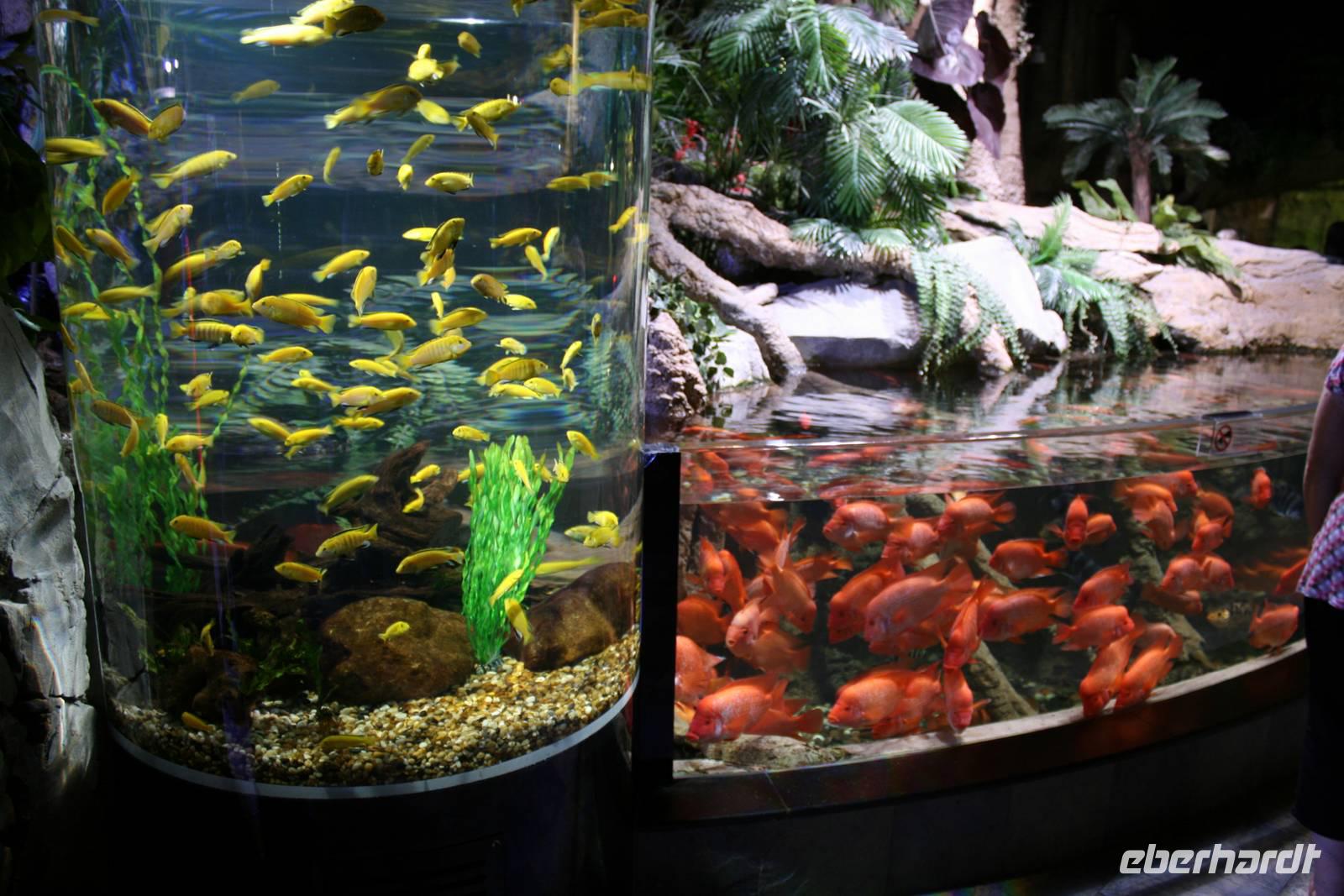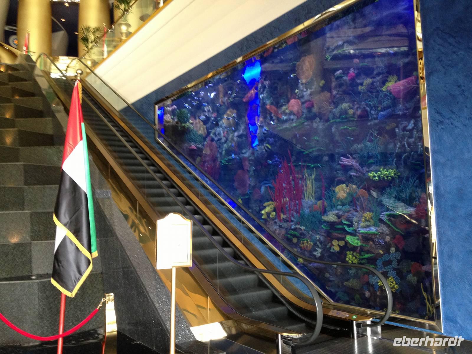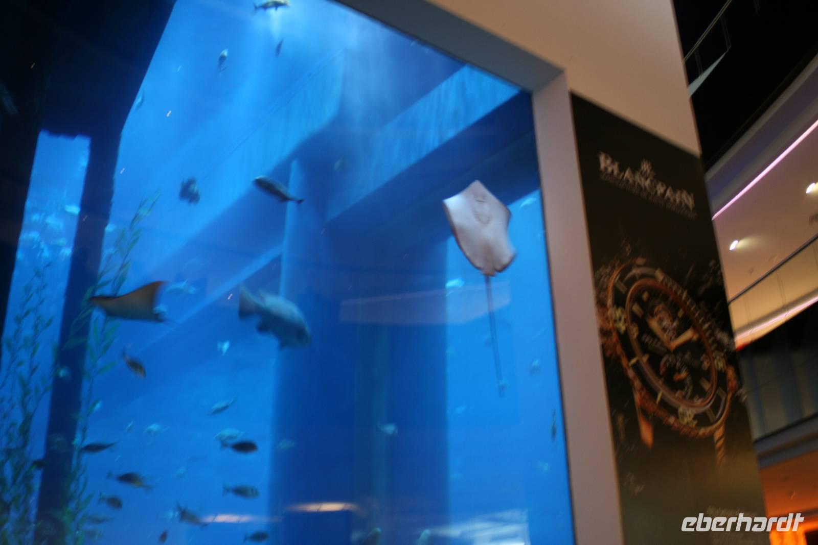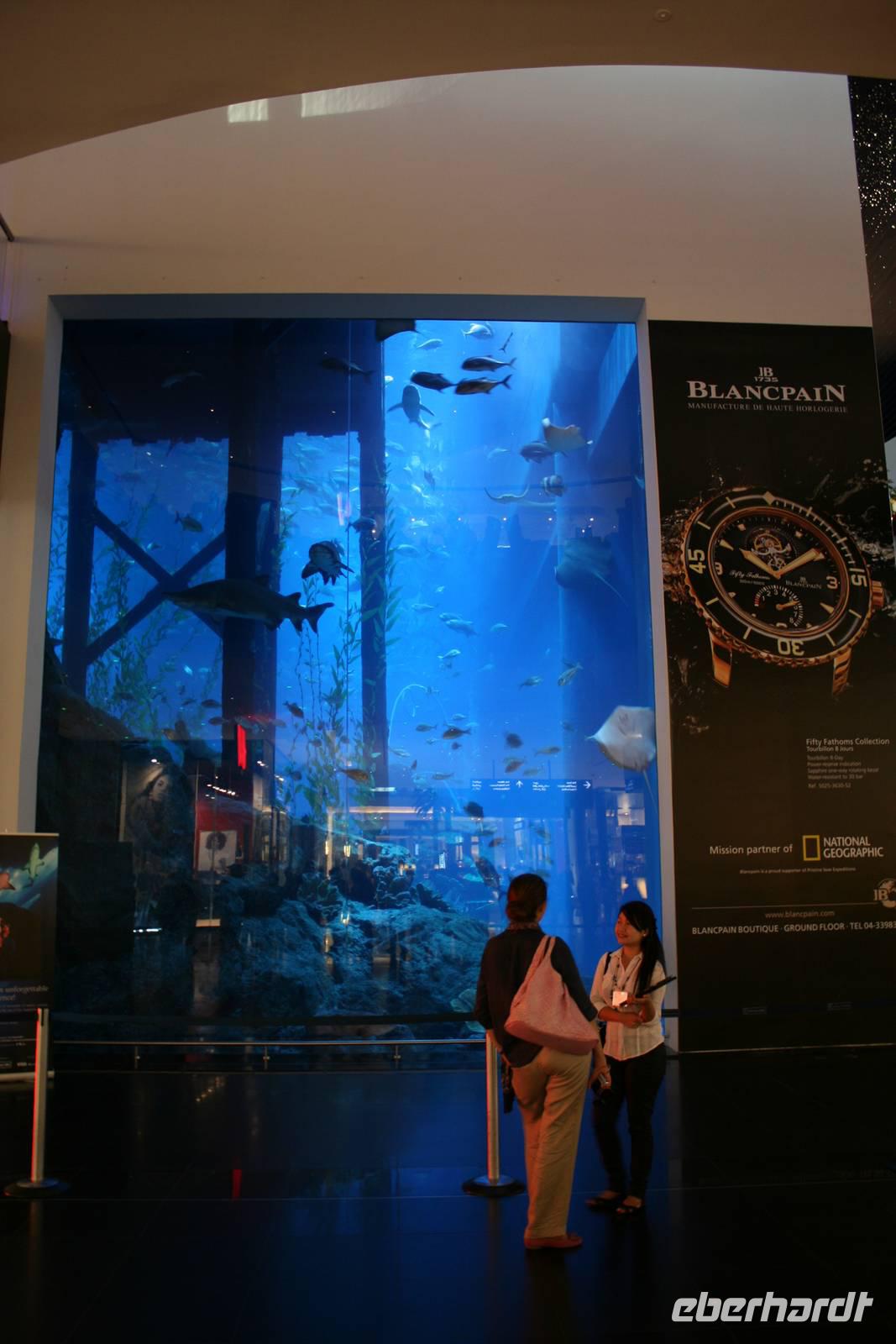 Gegen Mittag erreichten wir dann die Dubai-Mall im Herzen von Dubai. Diese gigantische Einkaufsmeile trägt einen Weltrekord mit 1200 Geschäften! Nun standen wir auch endlich vor einem weiteren Weltrekord der Emirate - dem Burj Khalifa! Wahnsinn! Wir schauten uns die Wasserspiele an und gönnten uns dann ein wenig Freizeit zum Erkunden der riesigen Einkaufsmeile. Es ist typisch Dubai: Die größte "Shopping Mall" der Welt und eines der weltgrößten begehbaren Aquarien der Welt, das sich über drei Etagen erstreckt und durch den "gläsernen" Tunnel einen unglaublich realistischen Einblick in die Welt der Meeresbewohner bietet. Ständig entdeckte man etwas Neues, zu viele exotische Fischarten schauten neugierig durch die Scheiben und zahlreiche Rochen präsentierten sich in ihrer außergewöhnlichen Schönheit. Für viele waren jedoch Haie die absolute Sensation: Die 30 Sandtiger-Haie, die bis zu 2,20 Meter groß werden können.