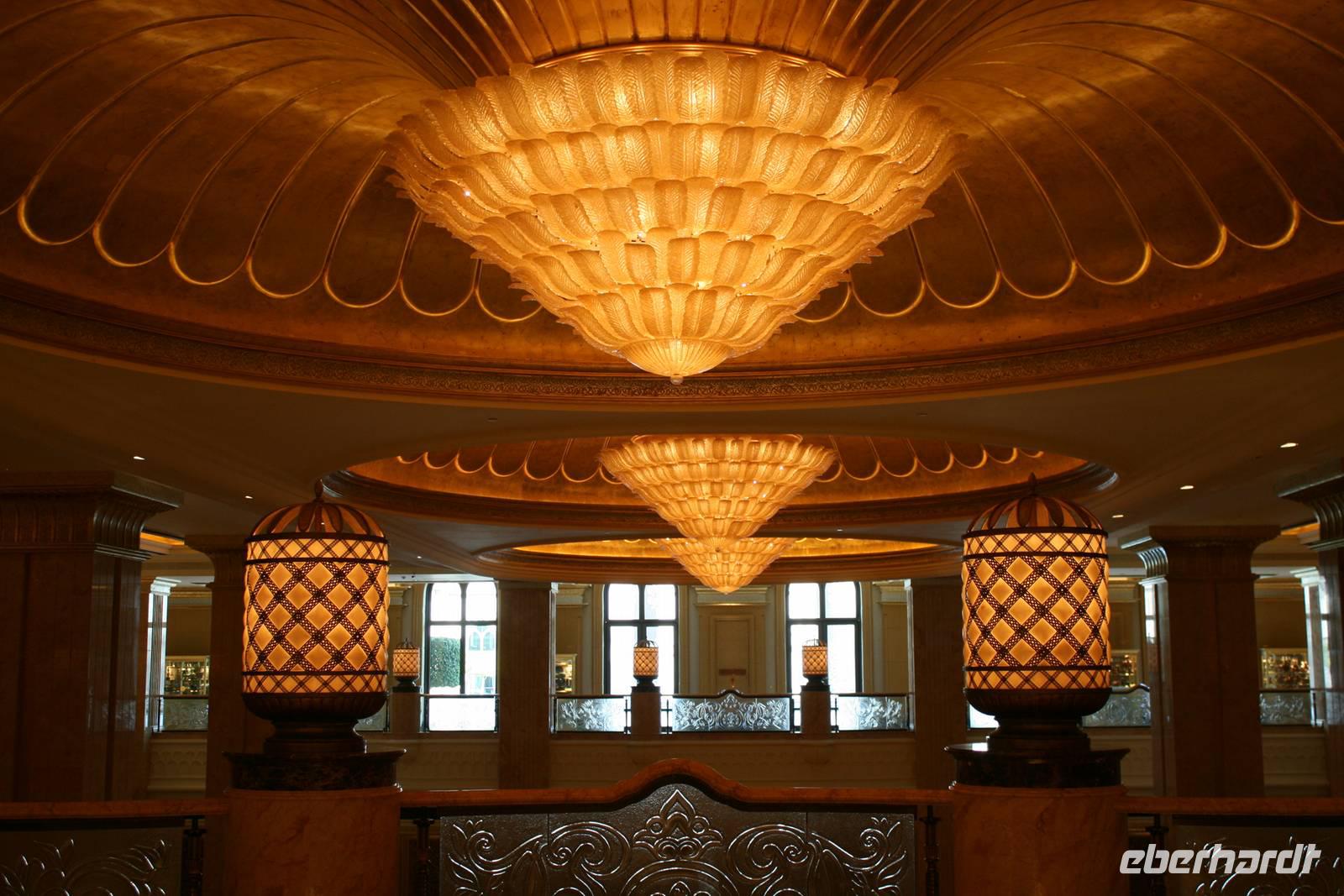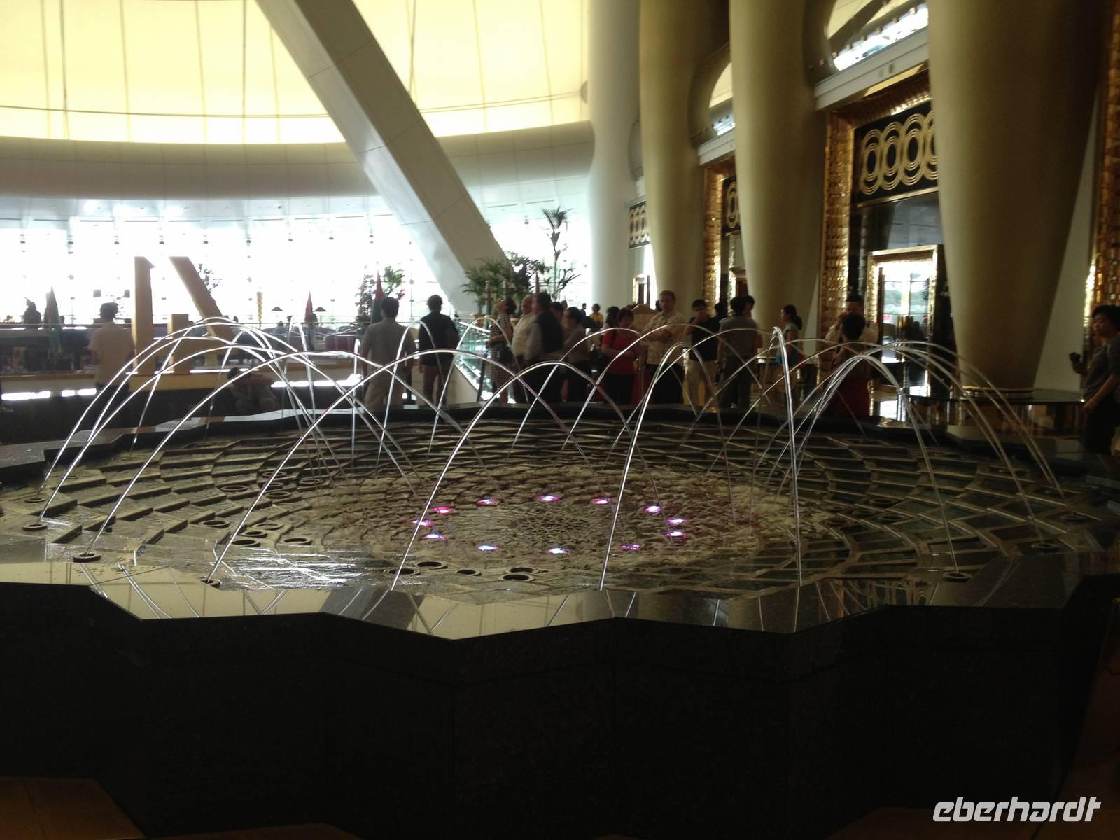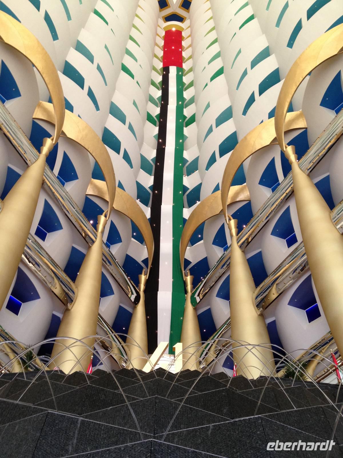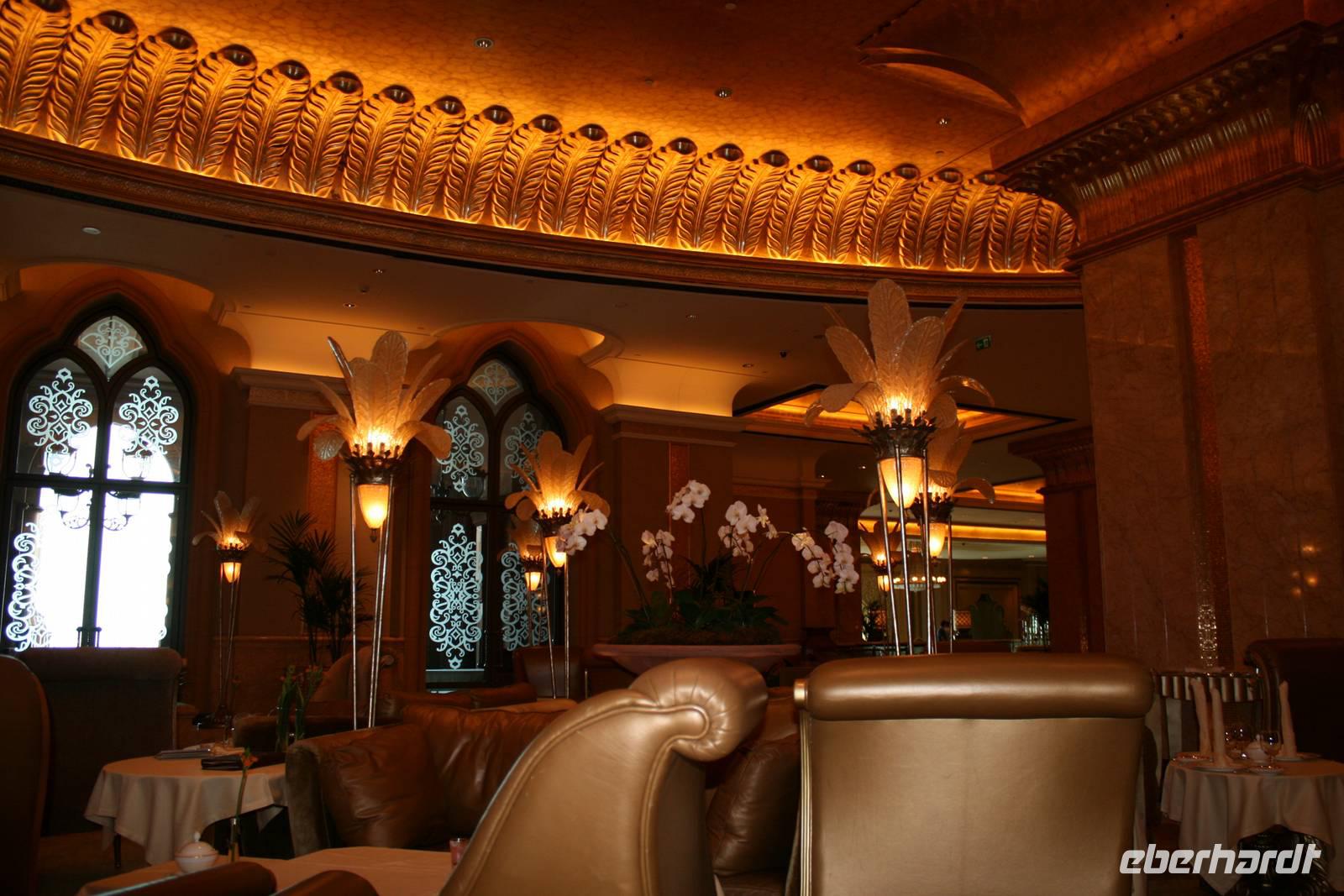 Nun folgte das eigentliche Highlight. Unser Mittagessen im Burj al Arab Hotel. Das höchste und wohl luxuriöseste Hotel der Welt ragt hoch aus dem Meer. Hier werden nicht nur architektonisch, sondern auch in Sachen Service und Ambiente völlig neue Maßstäbe gesetzt. Im Restaurant Al Iwan Restaurant im Herzen des größten Atriums des Welt, umrahmt von goldenen Säulen entdeckten wir die edelste arabische Küche und genossen die Gaumenfreuden des Chefkoch. Hummer, Austern und Sushi waren nur einige davon. Und stets mit dem Blick auf den Jumeirah Beach. Ein wahrer Höhepunkt! Anschließend blieb noch Zeit, um das Hotel zu erkunden, mit den Panoramaaufzügen zu fahren oder einfach nur um die Atmosphäre zu genießen.