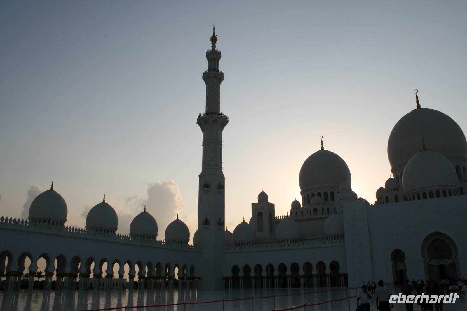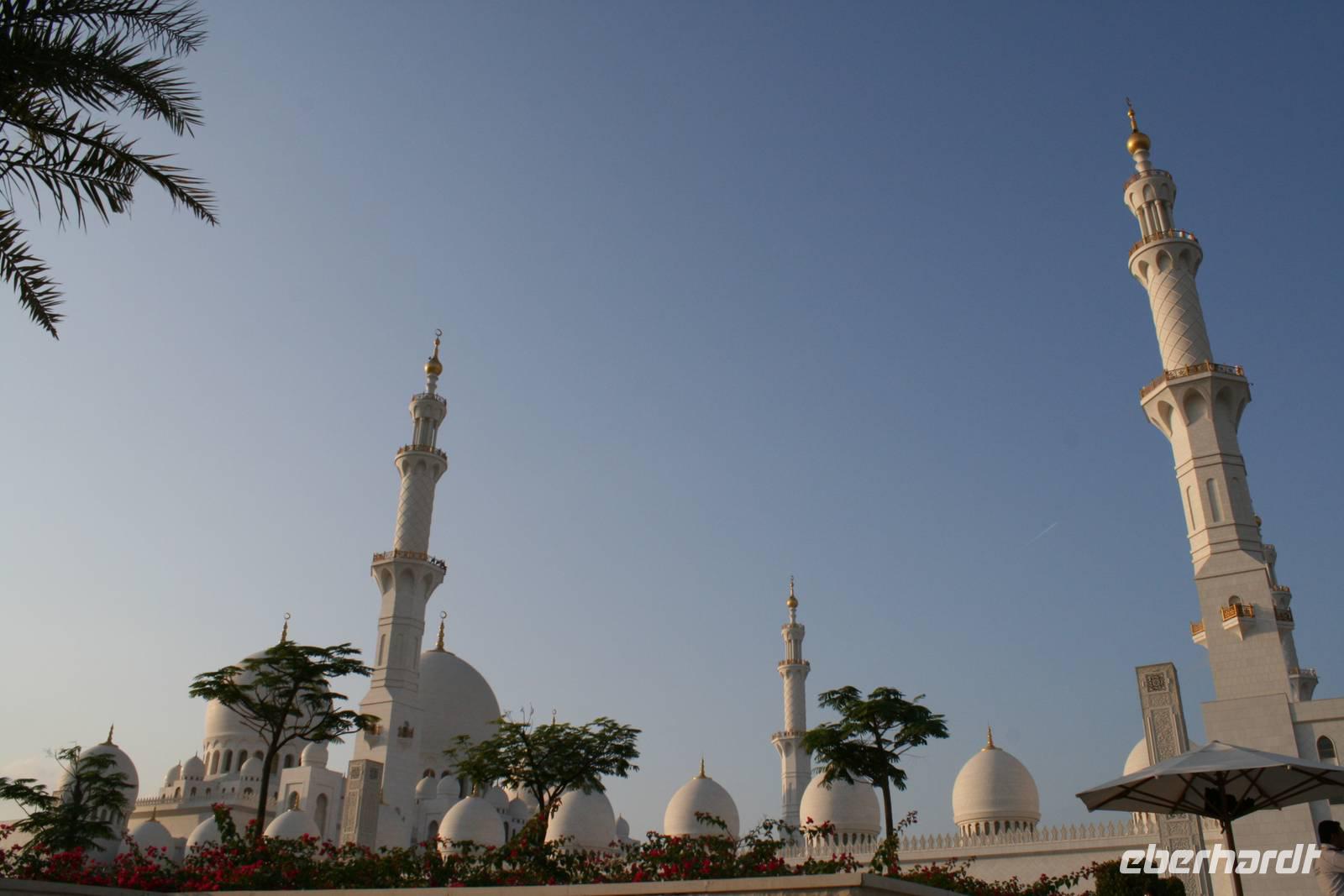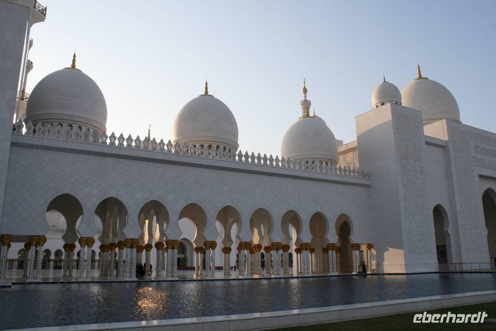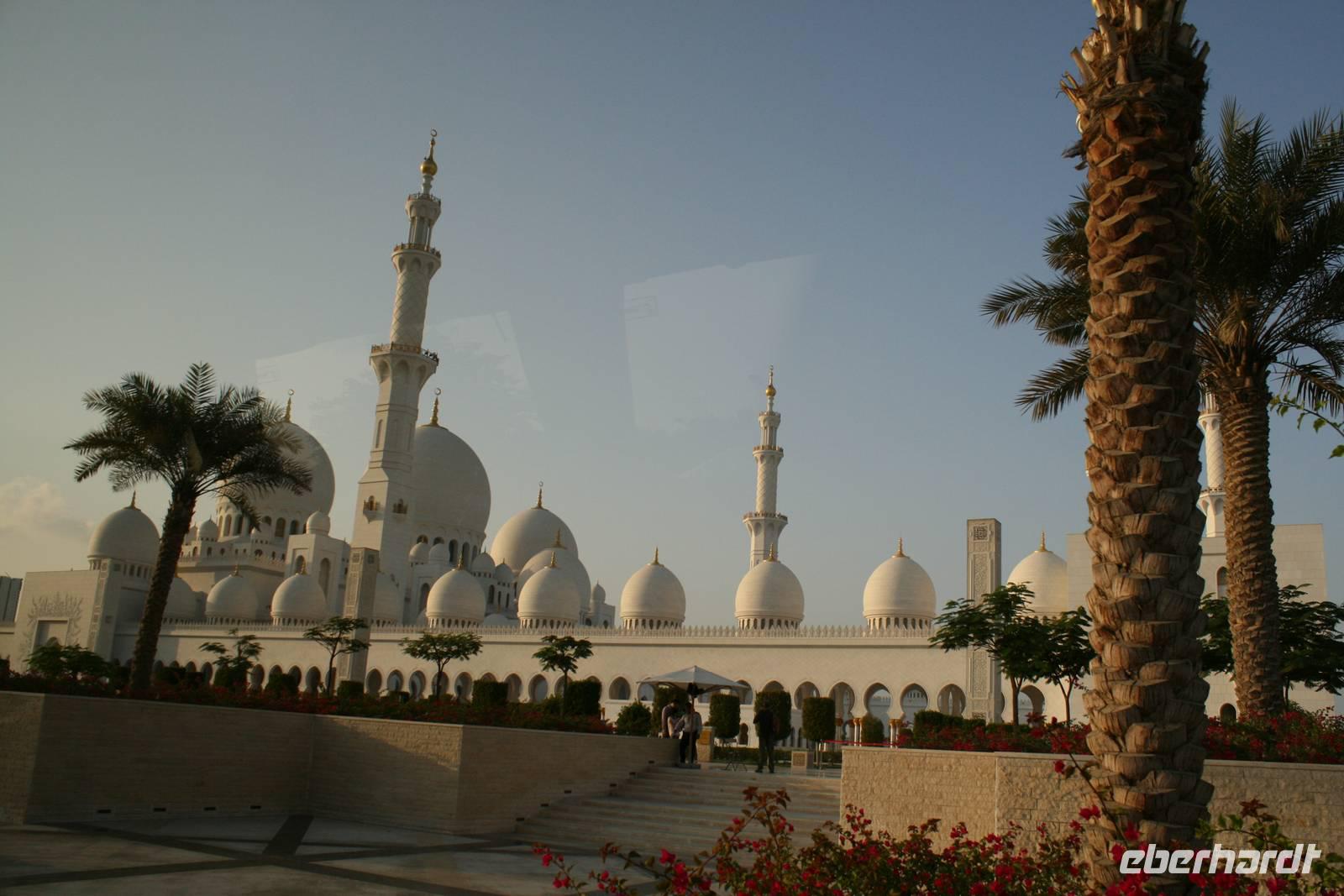 Am späten Nachmittag wartete ein weiterer Höhepunkt dieser Reise auf uns. Die Sheikh Zayed Moschee. Dieses architektonische Kunstwerk ist eine der größten Moscheen der Welt und bietet Platz für 40.000 Gläubige. Sie verfügt über 80 Kuppeln, nahezu 1.000 Säulen, 24 Karat vergoldete Kronleuchter und den weltgrößten handgeknüpften Teppich. Die zentrale Gebetshalle wird von einem der größten Kronleuchter der Welt dominiert - mit einem Durchmesser von 10 Metern und einer Höhe von 15 Metern wiegt er über neun Tonnen. Ausgestattet mit einer Abaya betraten wir den Gebetsraum und mussten erst einmal inne halten. Großartig! Mit diesem Schmankerl beendeten wir diesen Tag und fuhren zurück zum Hotel nach Dubai.
