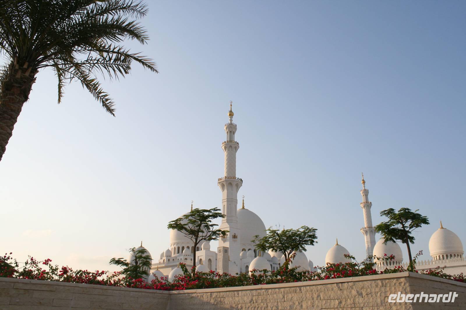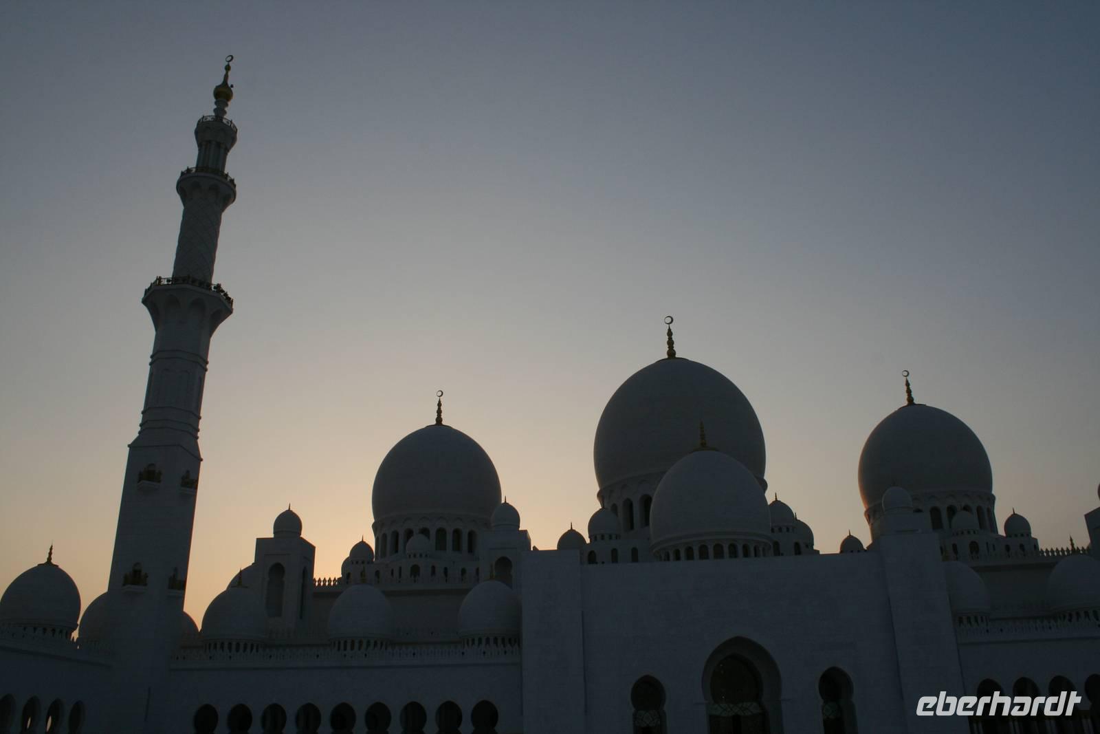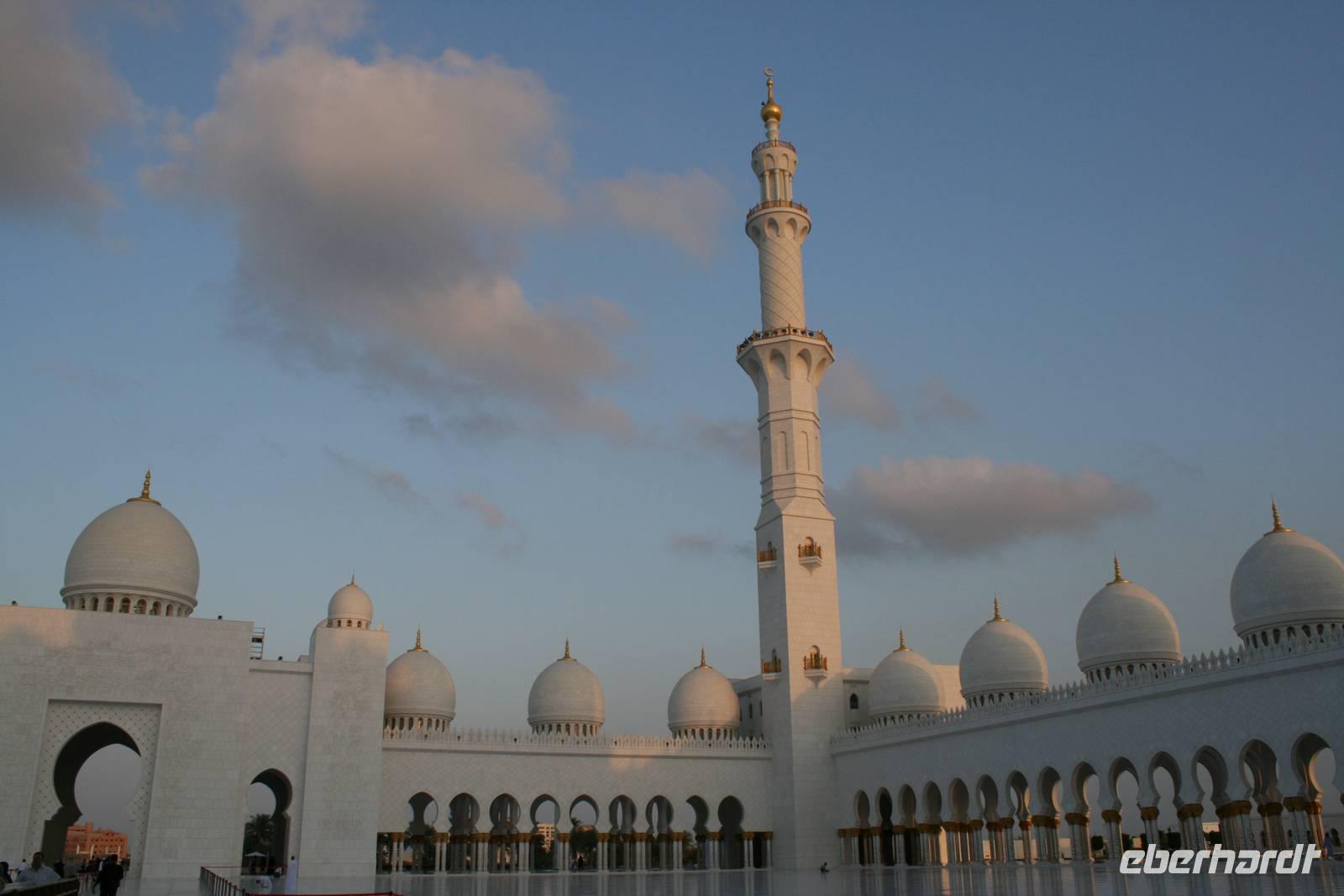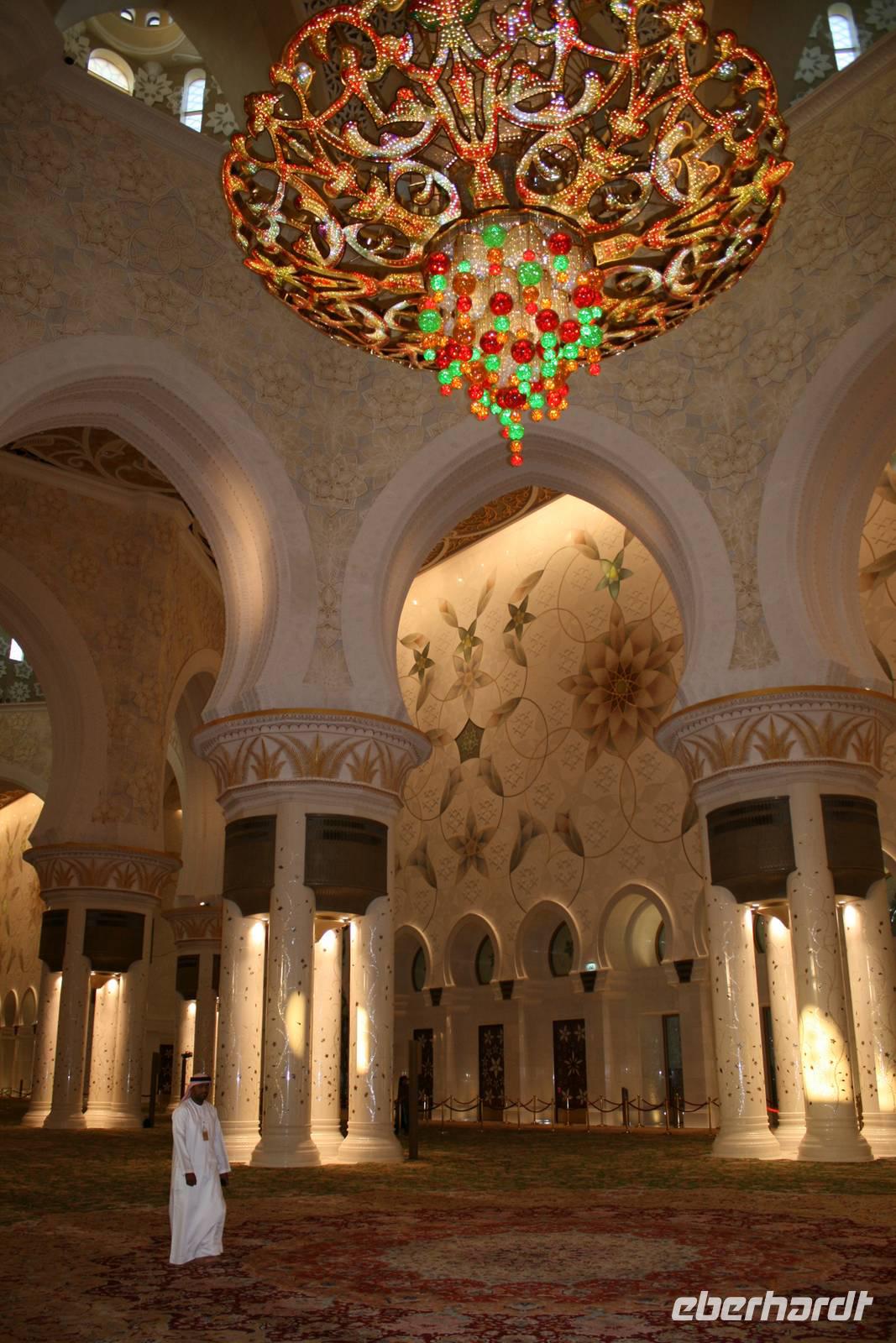 Am späten Nachmittag wartete ein weiterer Höhepunkt dieser Reise auf uns. Die Sheikh Zayed Moschee. Dieses architektonische Kunstwerk ist eine der größten Moscheen der Welt und bietet Platz für 40.000 Gläubige. Sie verfügt über 80 Kuppeln, nahezu 1.000 Säulen, 24 Karat vergoldete Kronleuchter und den weltgrößten handgeknüpften Teppich. Die zentrale Gebetshalle wird von einem der größten Kronleuchter der Welt dominiert - mit einem Durchmesser von 10 Metern und einer Höhe von 15 Metern wiegt er über neun Tonnen. Ausgestattet mit einer Abaya betraten wir den Gebetsraum und mussten erst einmal inne halten. Großartig! Mit diesem Schmankerl beendeten wir diesen Tag und fuhren zurück zum Hotel nach Dubai.