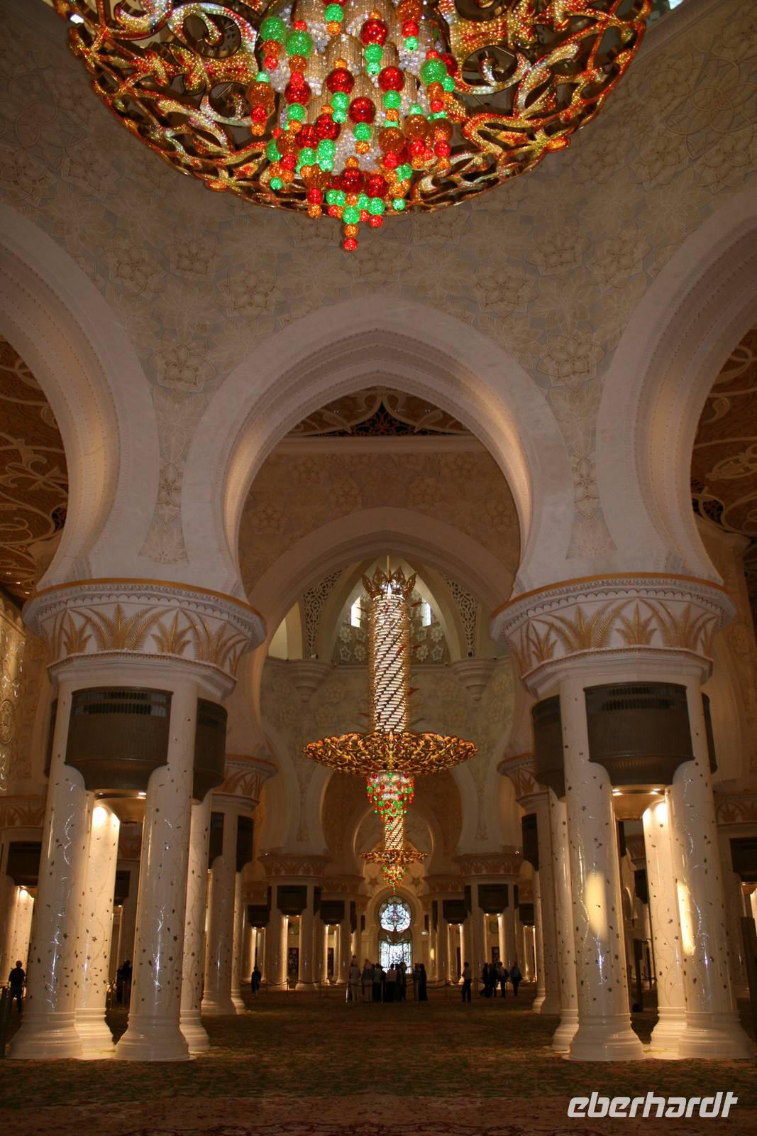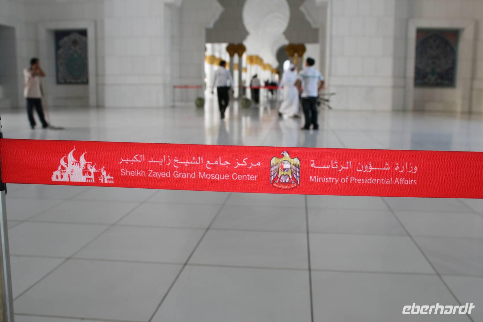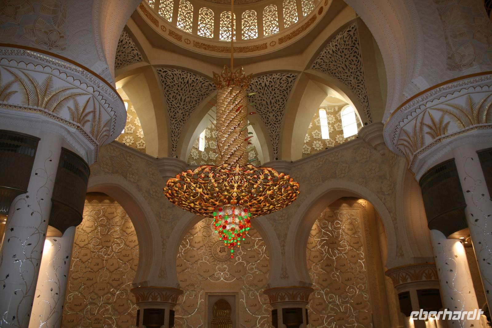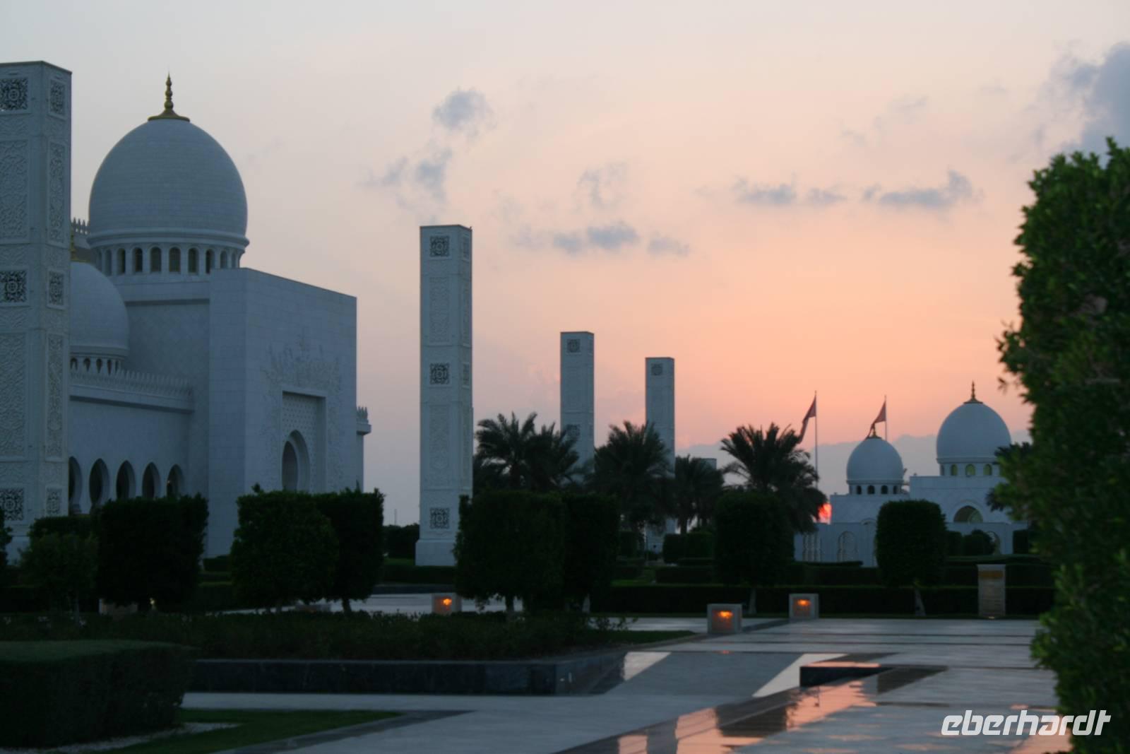 Am späten Nachmittag wartete ein weiterer Höhepunkt dieser Reise auf uns. Die Sheikh Zayed Moschee. Dieses architektonische Kunstwerk ist eine der größten Moscheen der Welt und bietet Platz für 40.000 Gläubige. Sie verfügt über 80 Kuppeln, nahezu 1.000 Säulen, 24 Karat vergoldete Kronleuchter und den weltgrößten handgeknüpften Teppich. Die zentrale Gebetshalle wird von einem der größten Kronleuchter der Welt dominiert - mit einem Durchmesser von 10 Metern und einer Höhe von 15 Metern wiegt er über neun Tonnen. Ausgestattet mit einer Abaya betraten wir den Gebetsraum und mussten erst einmal inne halten. Großartig! Mit diesem Schmankerl beendeten wir diesen Tag und fuhren zurück zum Hotel nach Dubai.