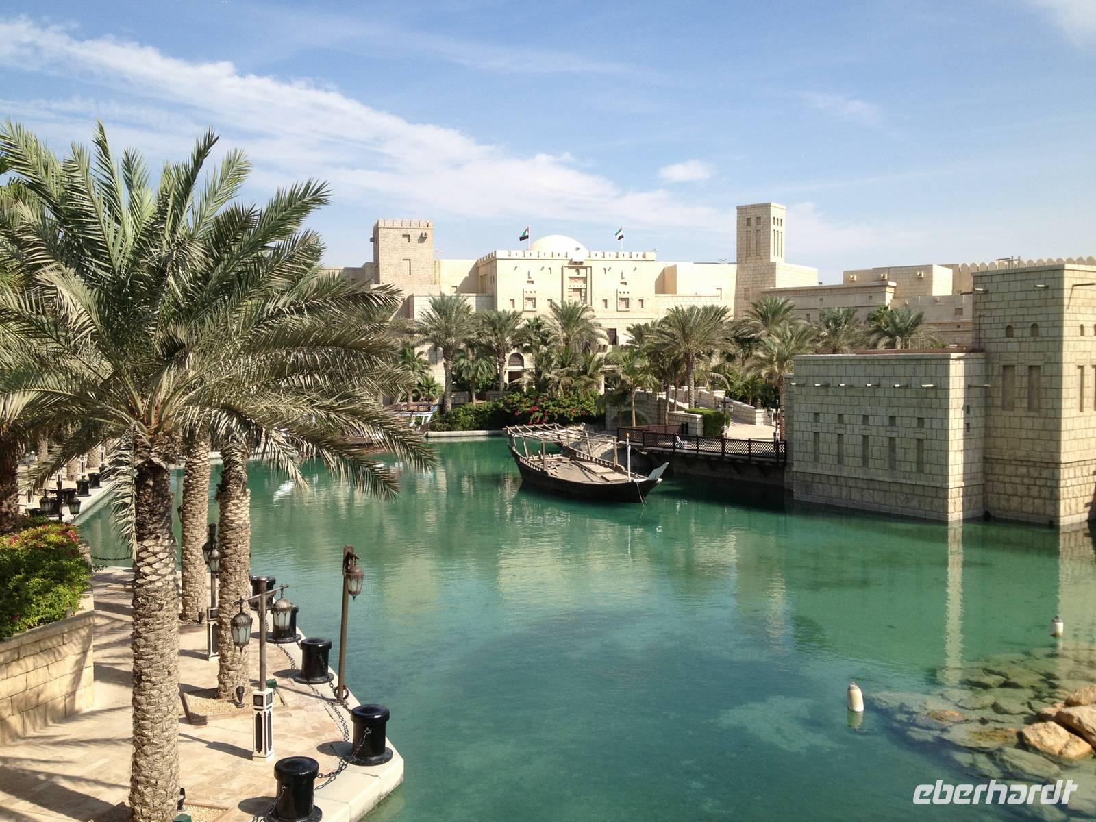 Besonders herausgeputzt und voller Vorfreude auf das, was uns erwarten wird, wurden wir von Nischad in den Stadtteil Jumeirah chauffiert. Zunächst besuchten wir den Madinat-Souk Jumeirah - ein Stück Venedig in Dubai. Dieser originalgetreu errichtete, exquisite Souk im arabischen Stil verzauberte uns regelrecht. Von den kleinen Wasserwegen, die an die Kanäle in Venedig erinnern, hatten wir einen tollen Blick auf das Burj al Arab.