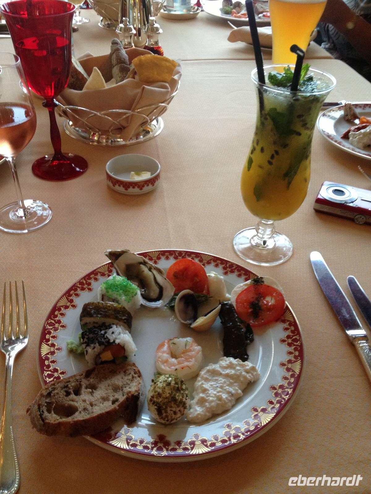 Auf der Fahrt in Richtung Abu Dhabi City erblickten wir schon den märchenhaft anmutenden, kuppel- und turmreiche Komplex des Emirates Palace Hotels. Unser nächstes Ziel! Aus der Ferne wirkte es mit seinen 800m Länge und den 114 Kuppeln wie eine Mischung aus Hagia Sophia und Taj Mahal, gleichermaßen großartig wie entrückt. Das von der Regierung finanzierte Gebäude der Luxusklasse sollte ursprünglich als Palastanlage für den Scheich Zayed bin Sultan Al Nahyan errichtet werden. Er war seit der Unabhängigkeit im Jahre 1971 der erste Präsident der Emirate, starb jedoch 2004. Nun ist das Emirates Palace ein Hotel der Luxusklasse! Und hier waren wir zur Teestunde eingeladen. Auf der pompösen Treppe zum Haupteingang machten wir zunächst ein Gruppenfoto und betraten anschließend die goldenen Hallen dieses gigantischen Hotels. Anja zeigte uns eine kleine Ausstellung mit den Zukunftsprojekten der Herrscherfamilie, bevor wir einen exklusiven Snack genießen konnten.