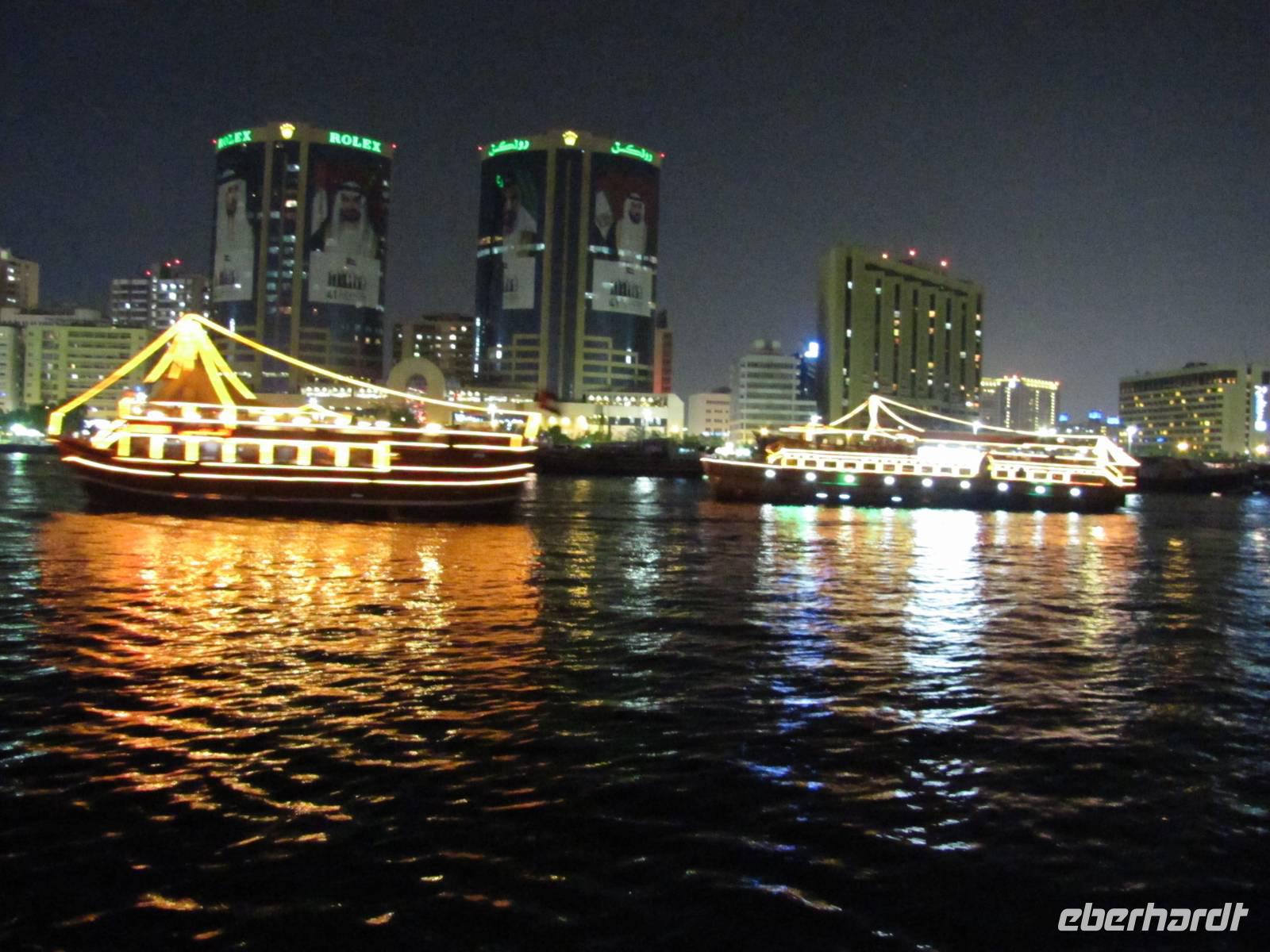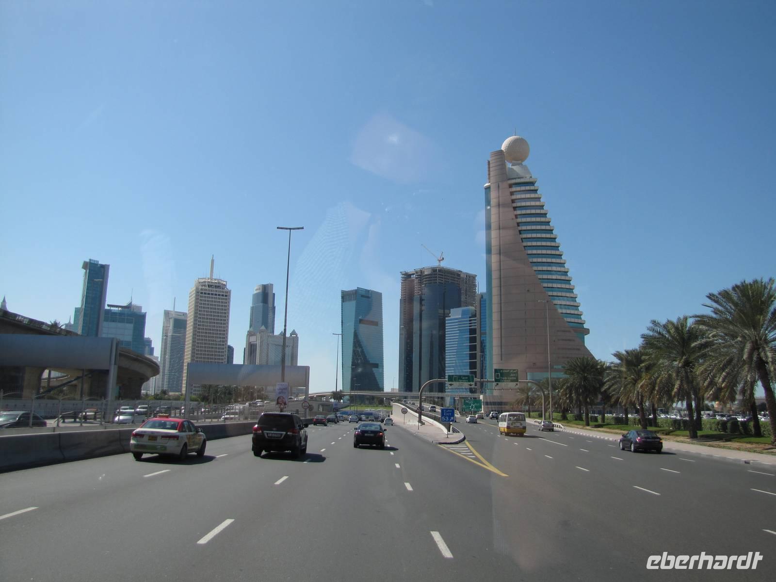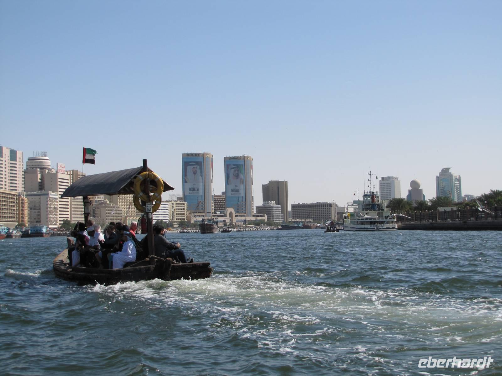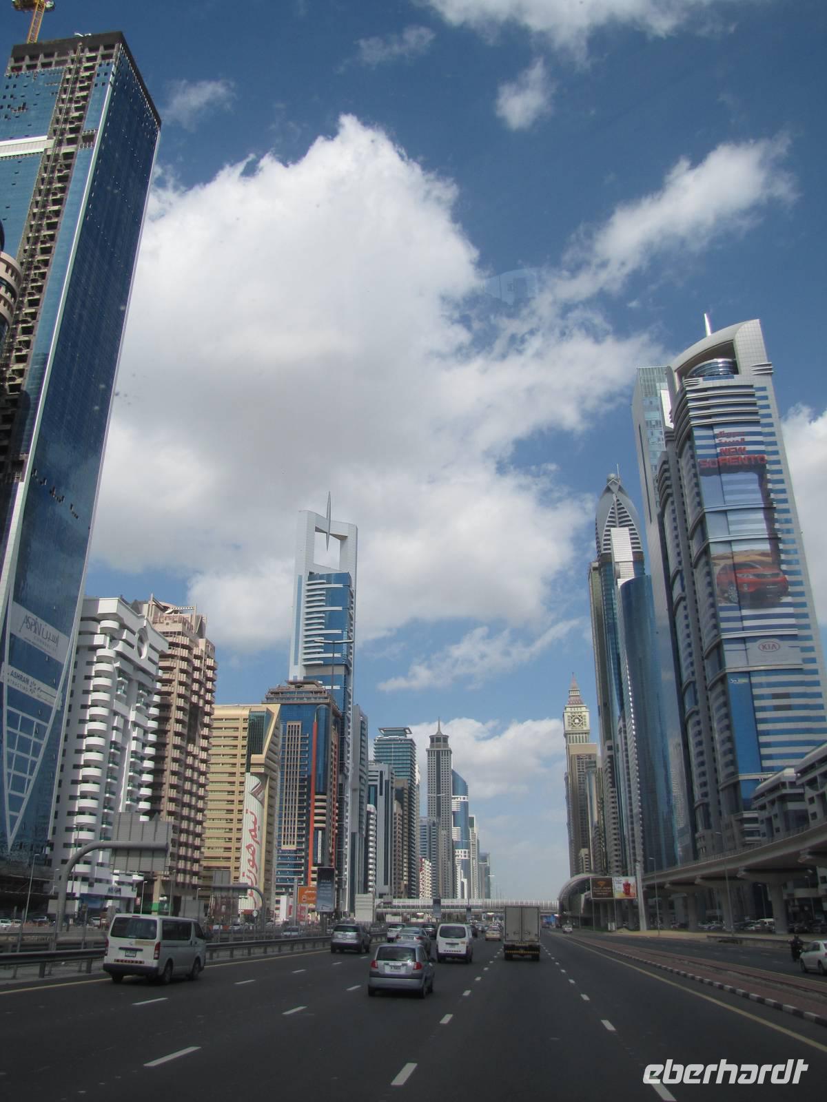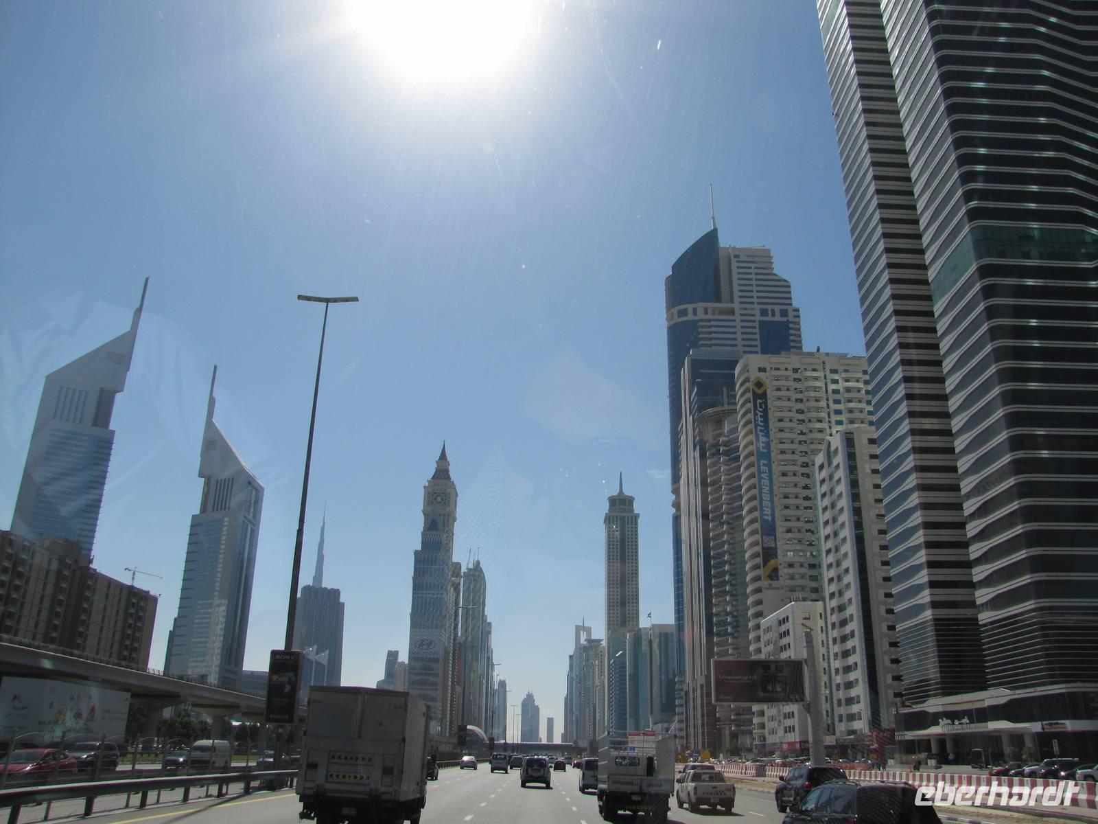 Nach ca. 40min. Aufenthalt in der Mall fuhren wir entlang der „Shaihk zayed road", der Hauptverkehrsader von Dubai zurück zum Hotel. 7 Spuren reiten sich auf beiden Seiten aneinander. Links und rechts der Straße die rangten sich wieder gigantische Wolkenkratzer in die Höhe. 1980 befand sich dort eine kleine Sandstraße mit kleinen Gebäuden, heute stehen dort die schönsten und höchsten Wolkenkratzer der Welt. Diese überaus erstaunliche Entwicklung haben die Emiratis nicht nur der Entdeckung von Öl in den 60er Jahren zu verdanken, sondern auch dem Scheich Zayed bin Sultan Al Nahyan. Er hat Dubai ins Rampenlicht der Welt gebracht und dafür gesorgt das Dubai ein modernes Märchen aus 1000 und einer Nacht geworden ist. Im Hotel angekommen bezogen wir erstmal unsere Zimmer und verarbeiteten erstmal diese tollen Eindrücke. Abends speißten wir in den Twin Towers am Dubai Creek.