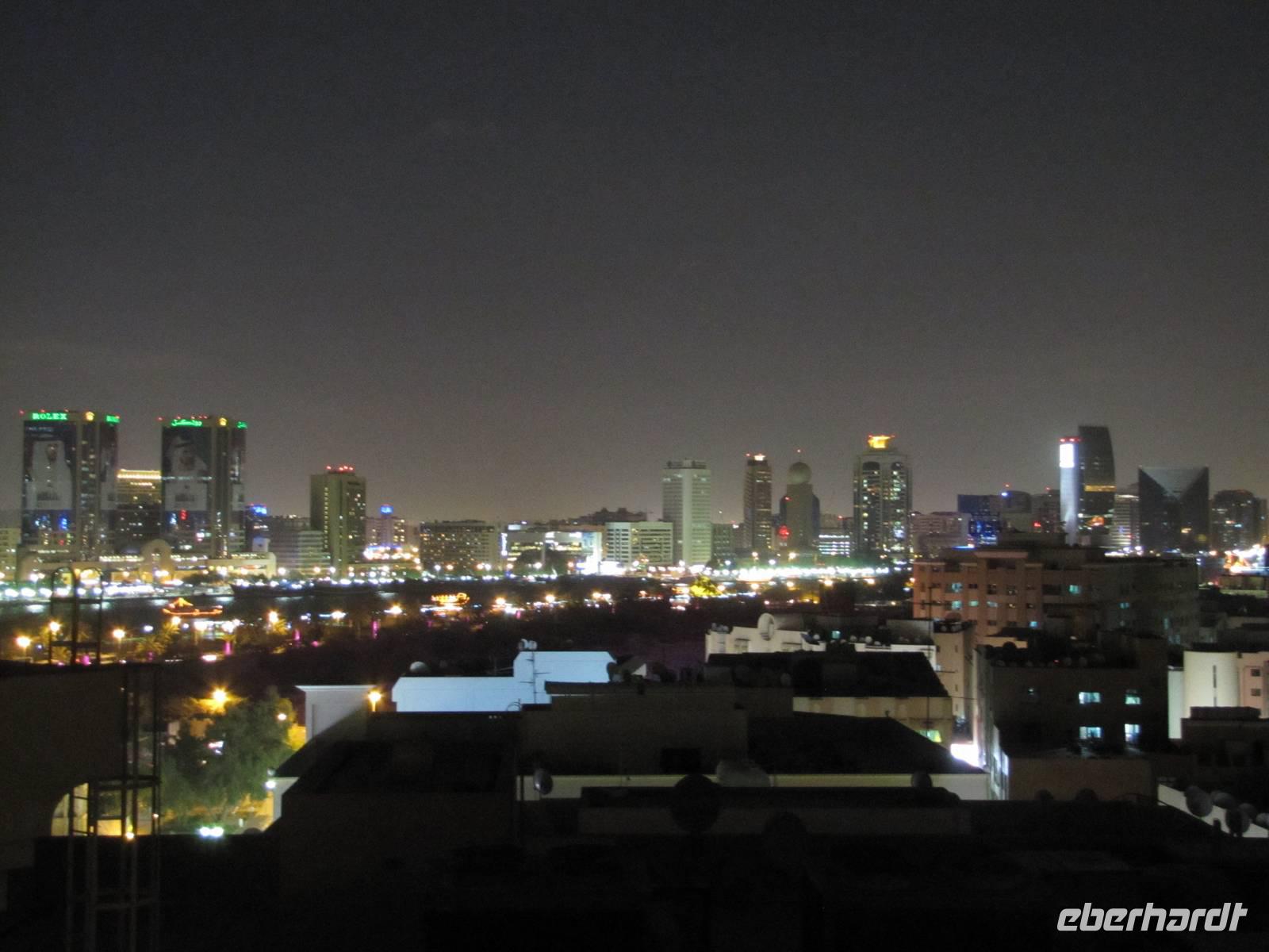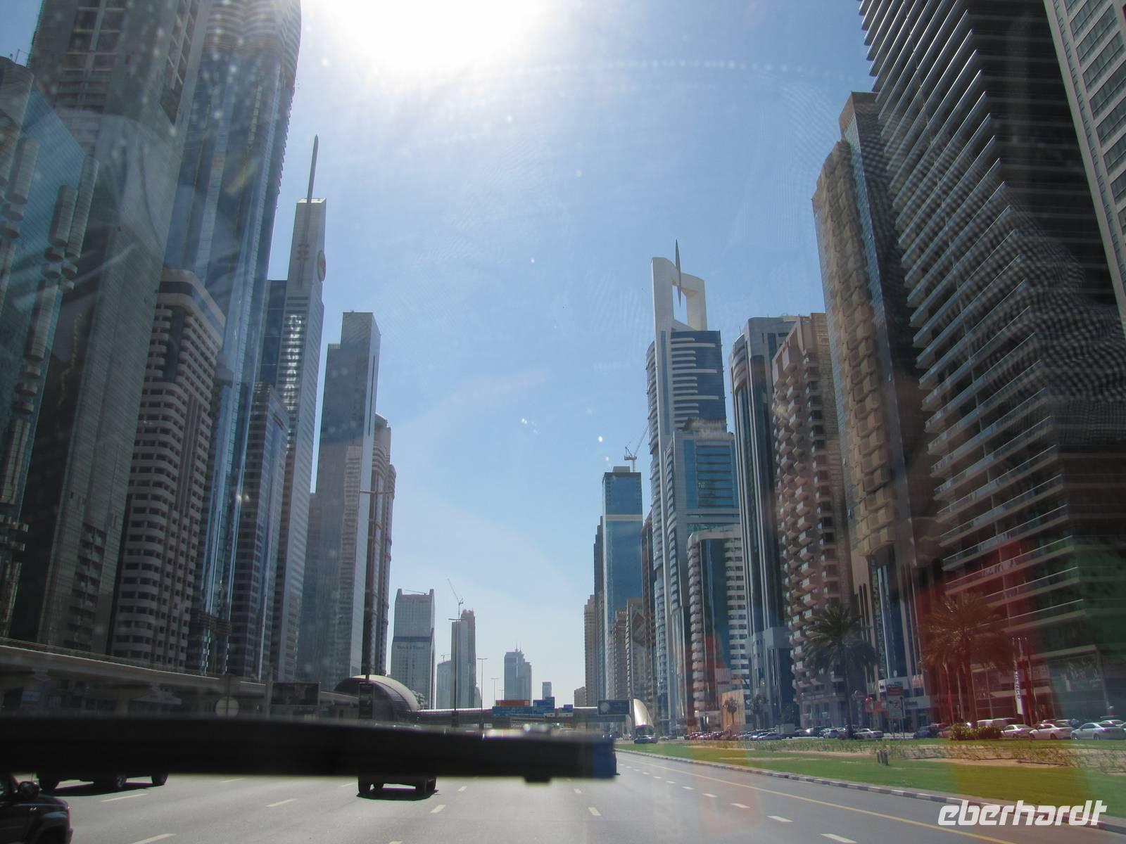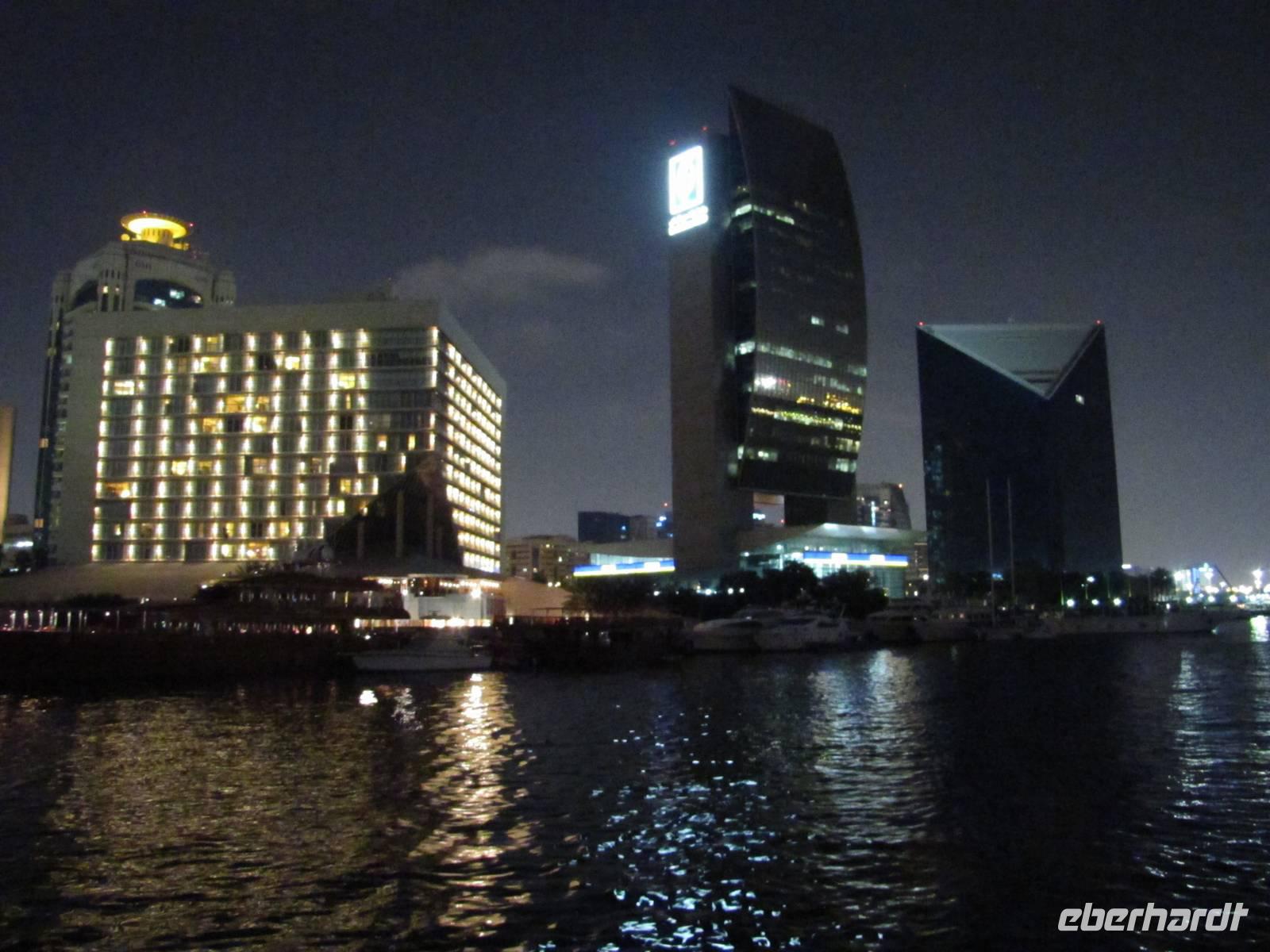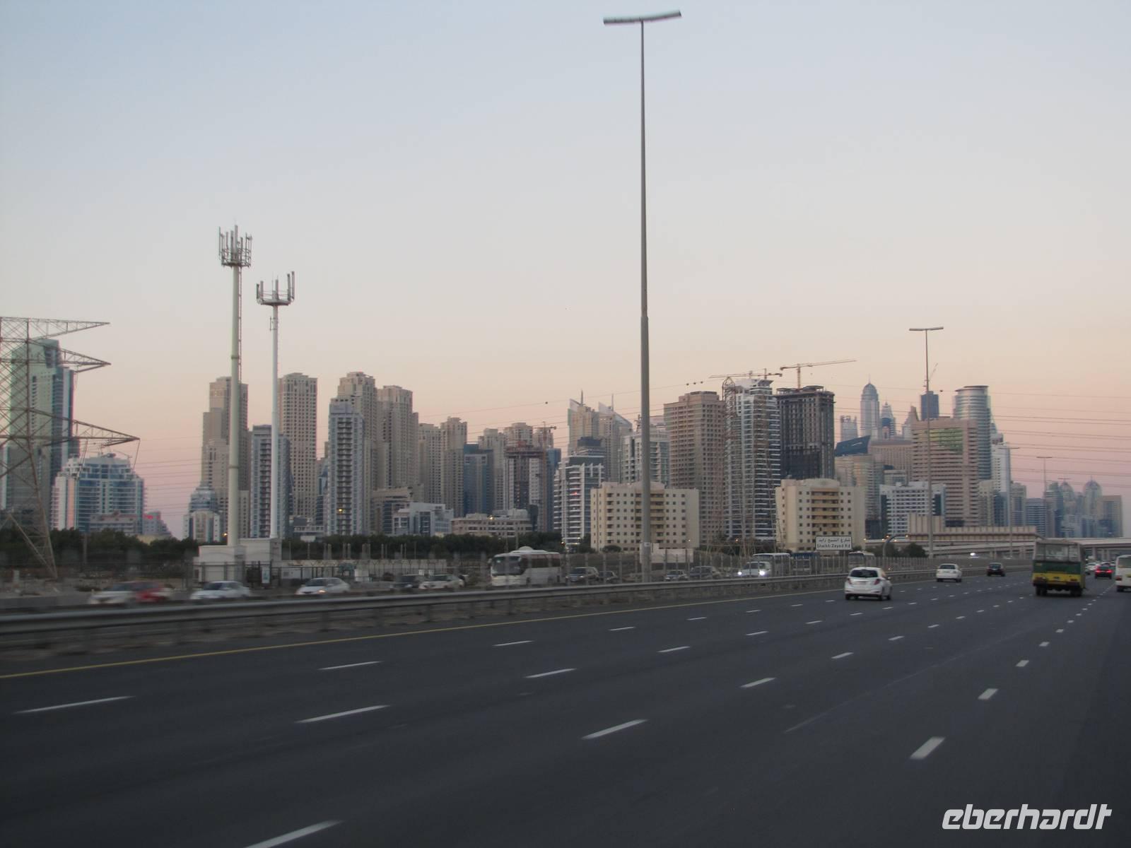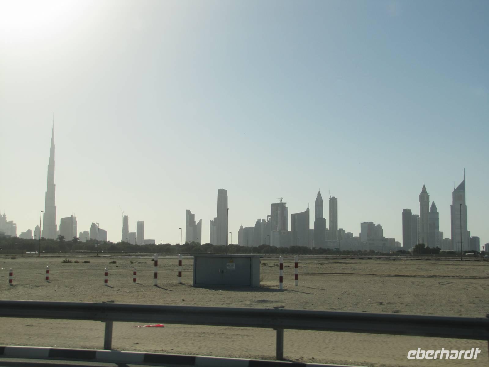 Nach ca. 40min. Aufenthalt in der Mall fuhren wir entlang der „Shaihk zayed road", der Hauptverkehrsader von Dubai zurück zum Hotel. 7 Spuren reiten sich auf beiden Seiten aneinander. Links und rechts der Straße die rangten sich wieder gigantische Wolkenkratzer in die Höhe. 1980 befand sich dort eine kleine Sandstraße mit kleinen Gebäuden, heute stehen dort die schönsten und höchsten Wolkenkratzer der Welt. Diese überaus erstaunliche Entwicklung haben die Emiratis nicht nur der Entdeckung von Öl in den 60er Jahren zu verdanken, sondern auch dem Scheich Zayed bin Sultan Al Nahyan. Er hat Dubai ins Rampenlicht der Welt gebracht und dafür gesorgt das Dubai ein modernes Märchen aus 1000 und einer Nacht geworden ist. Im Hotel angekommen bezogen wir erstmal unsere Zimmer und verarbeiteten erstmal diese tollen Eindrücke. Abends speißten wir in den Twin Towers am Dubai Creek.