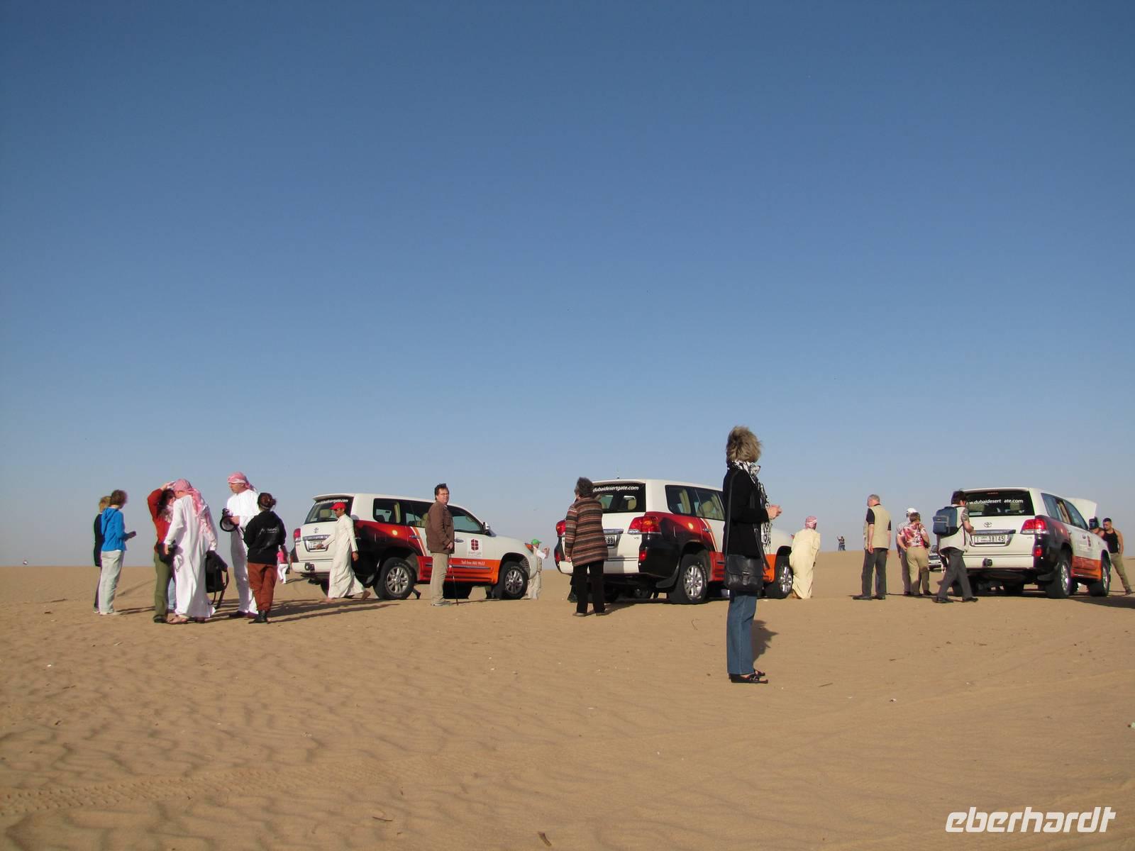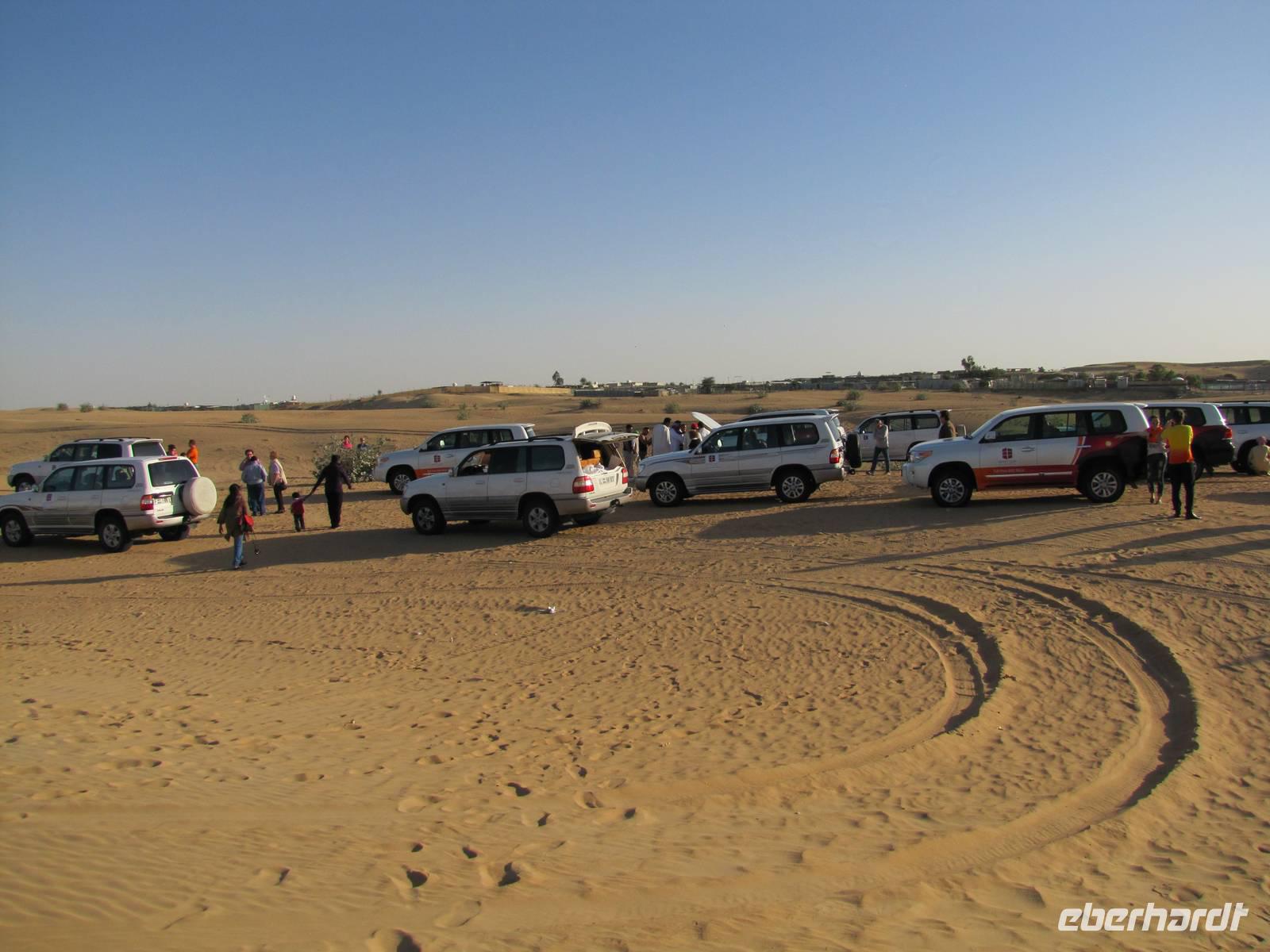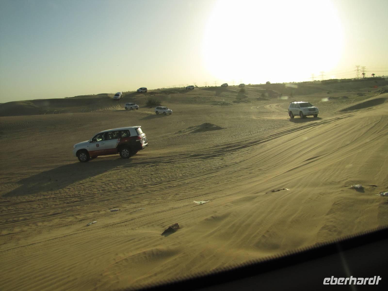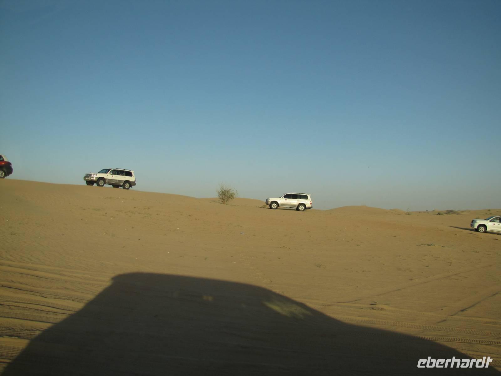 Gut ausgeschlafen ging es heute nach dem Frühstück mit unserer Reiseleiterin Anja zu Fuß zum Gegenüberliegenden Dubai Museum. Dort lernten wir einiges über die alten Traditionen und die schnelle Entwicklung Dubais nach der Ölentdeckung. Anschließend spazierten wir zum Dubai Creek, von wo aus wir mit dem Wassertaxi auf die andere Seite des Ufers übersetzten. Dort angekommen besichtigten wir den traditionellen Souk und den Gold Souk, wo einige von uns die traditionelle Kleidung der Emiratis anprobierten. Die so genannte Kaftan konnte man an jeder Ecke günstig erwerben. Leider nicht käuflich aber schön anzusehen war der größte Goldring der Welt, der sich in einem Schaufenster auf dem Gold Souk befand. Weiter ging es mit dem Bus zurück zum Hotel, wo jeder von uns sich nochmal für 2 Stunden ausruhen konnte. Denn am späten Nachmittag gegen 16.00 Uhr ging es in die Wüste von Dubai. Wir verkleideten uns in unserer neu erworbener traditionellen Tracht und bestaunten uns erst einmal Gegenseitig in der Hotellobby. Als wir uns dann noch die Hände Symbolisch schüttelten war das Foto perfekt, als wären die neuen Ölverträge abgeschlossen. J Gut gelaunt fuhren wir mit den Jeeps ca. 40 min. zu den ersten Sanddünen. Dubais Sandkasten ist ein Ausläufer der Rub al Khali Wüste, die größte Sandwüste der Welt. An der ersten Sanddüne angekommen hielten wir für einen ersten Fotostopp und die Fahrer ließen die Luft aus den Reifen, für bessere Haftung im Sand. Plötzlich hörten wir aus einem Jeep heraus Katzengeräusche. Wir wunderten uns sehr und dachten jemand hat einen Katzenklingelton auf dem Handy. Bei genauerem Hinhören aber bemerkten wir das sich eine Katze im Motorraum eines Jeeps versteckte. Die Jeepfahrer versuchten aufwändig die kleine Katze heraus zu bekommen. Da es im „Winter" in Dubai sehr kalt werden kann hatte ein Fahrer seine Winterhandschuhe bei eisigen 20 Grad mit dabei. Somit konnte er ohne gekratzt zu werden nach der Katze greifen und sie retten. Alle waren erleichtert und der Fahrer brachte sie zu einer kleinen Siedlung am Rand der Dünen. Nach dieser kleinen Aufregung gingen alle in ihre Jeeps zurück und wir fuhren weiter zum Wüstencamp. Unterwegs sahen wir viele Kamele die im roten Abendlicht der Sonne durch die Dünen liefen. Im Wüstencamp angekommen konnten wir uns auf eine kleine Kamelkarawane setzen und den Sitzkomfort eines Kamelrückens testen. Sehr angenehm! Im Camp gab es leckeres traditionelles Essen mit arabischer Bauchtanzshow untermalt. Als alle gut gesättigt waren probierten einige von uns nach dem Essen die traditionelle Kleidung der Araber an oder rauchten genüsslich eine Wasserpfeife. Es war wie in einem Märchen aus 1000 und einer Nacht, es fehlte nur noch Aladin mit seiner Wunderlampe. Gegen 21 Uhr fuhren wir mit den Jeeps und zusammen mit unserer lieben Reiseleiterin Anja zurück nach Dubai. Mit tollen Eindrücken aus der Wüste kehrten wir zum Hotel zurück und freuten uns schon wieder auf den nächsten Tag.Dienstag