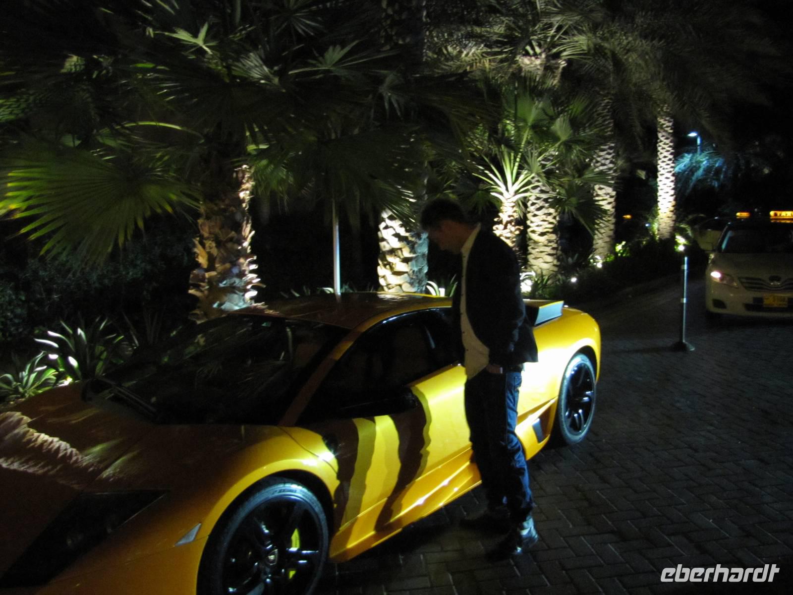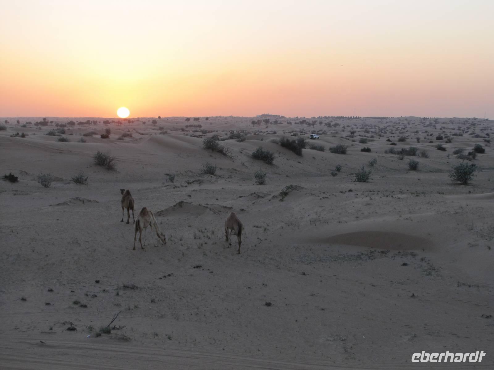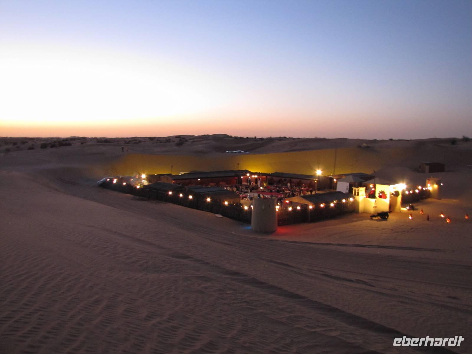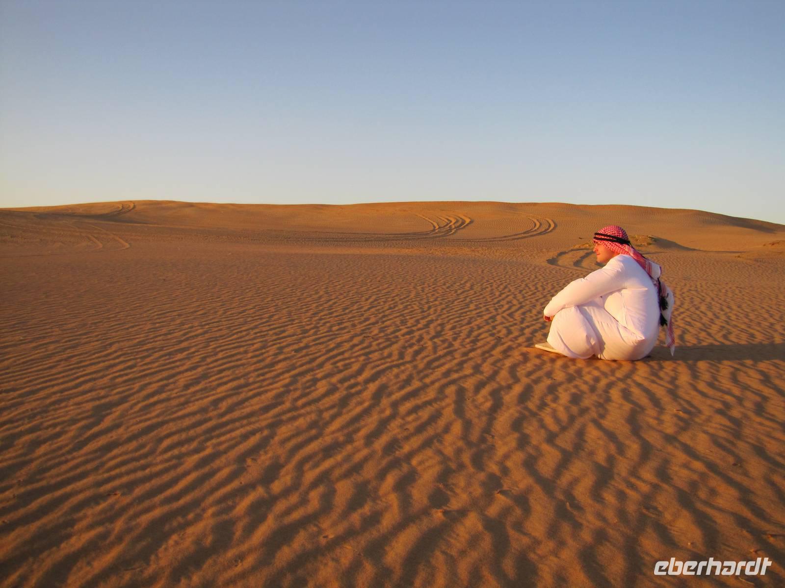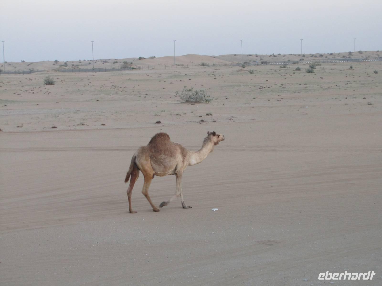 Gut ausgeschlafen ging es heute nach dem Frühstück mit unserer Reiseleiterin Anja zu Fuß zum Gegenüberliegenden Dubai Museum. Dort lernten wir einiges über die alten Traditionen und die schnelle Entwicklung Dubais nach der Ölentdeckung. Anschließend spazierten wir zum Dubai Creek, von wo aus wir mit dem Wassertaxi auf die andere Seite des Ufers übersetzten. Dort angekommen besichtigten wir den traditionellen Souk und den Gold Souk, wo einige von uns die traditionelle Kleidung der Emiratis anprobierten. Die so genannte Kaftan konnte man an jeder Ecke günstig erwerben. Leider nicht käuflich aber schön anzusehen war der größte Goldring der Welt, der sich in einem Schaufenster auf dem Gold Souk befand. Weiter ging es mit dem Bus zurück zum Hotel, wo jeder von uns sich nochmal für 2 Stunden ausruhen konnte. Denn am späten Nachmittag gegen 16.00 Uhr ging es in die Wüste von Dubai. Wir verkleideten uns in unserer neu erworbener traditionellen Tracht und bestaunten uns erst einmal Gegenseitig in der Hotellobby. Als wir uns dann noch die Hände Symbolisch schüttelten war das Foto perfekt, als wären die neuen Ölverträge abgeschlossen. J Gut gelaunt fuhren wir mit den Jeeps ca. 40 min. zu den ersten Sanddünen. Dubais Sandkasten ist ein Ausläufer der Rub al Khali Wüste, die größte Sandwüste der Welt. An der ersten Sanddüne angekommen hielten wir für einen ersten Fotostopp und die Fahrer ließen die Luft aus den Reifen, für bessere Haftung im Sand. Plötzlich hörten wir aus einem Jeep heraus Katzengeräusche. Wir wunderten uns sehr und dachten jemand hat einen Katzenklingelton auf dem Handy. Bei genauerem Hinhören aber bemerkten wir das sich eine Katze im Motorraum eines Jeeps versteckte. Die Jeepfahrer versuchten aufwändig die kleine Katze heraus zu bekommen. Da es im „Winter" in Dubai sehr kalt werden kann hatte ein Fahrer seine Winterhandschuhe bei eisigen 20 Grad mit dabei. Somit konnte er ohne gekratzt zu werden nach der Katze greifen und sie retten. Alle waren erleichtert und der Fahrer brachte sie zu einer kleinen Siedlung am Rand der Dünen. Nach dieser kleinen Aufregung gingen alle in ihre Jeeps zurück und wir fuhren weiter zum Wüstencamp. Unterwegs sahen wir viele Kamele die im roten Abendlicht der Sonne durch die Dünen liefen. Im Wüstencamp angekommen konnten wir uns auf eine kleine Kamelkarawane setzen und den Sitzkomfort eines Kamelrückens testen. Sehr angenehm! Im Camp gab es leckeres traditionelles Essen mit arabischer Bauchtanzshow untermalt. Als alle gut gesättigt waren probierten einige von uns nach dem Essen die traditionelle Kleidung der Araber an oder rauchten genüsslich eine Wasserpfeife. Es war wie in einem Märchen aus 1000 und einer Nacht, es fehlte nur noch Aladin mit seiner Wunderlampe. Gegen 21 Uhr fuhren wir mit den Jeeps und zusammen mit unserer lieben Reiseleiterin Anja zurück nach Dubai. Mit tollen Eindrücken aus der Wüste kehrten wir zum Hotel zurück und freuten uns schon wieder auf den nächsten Tag.Dienstag