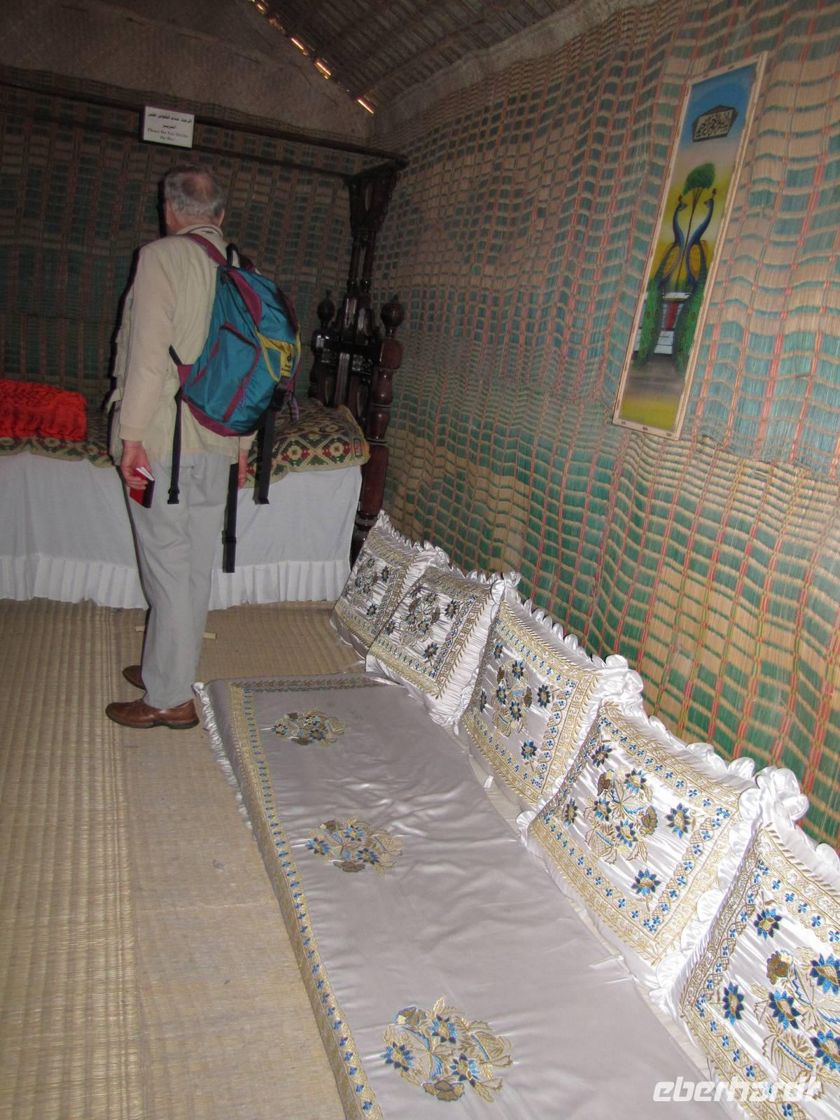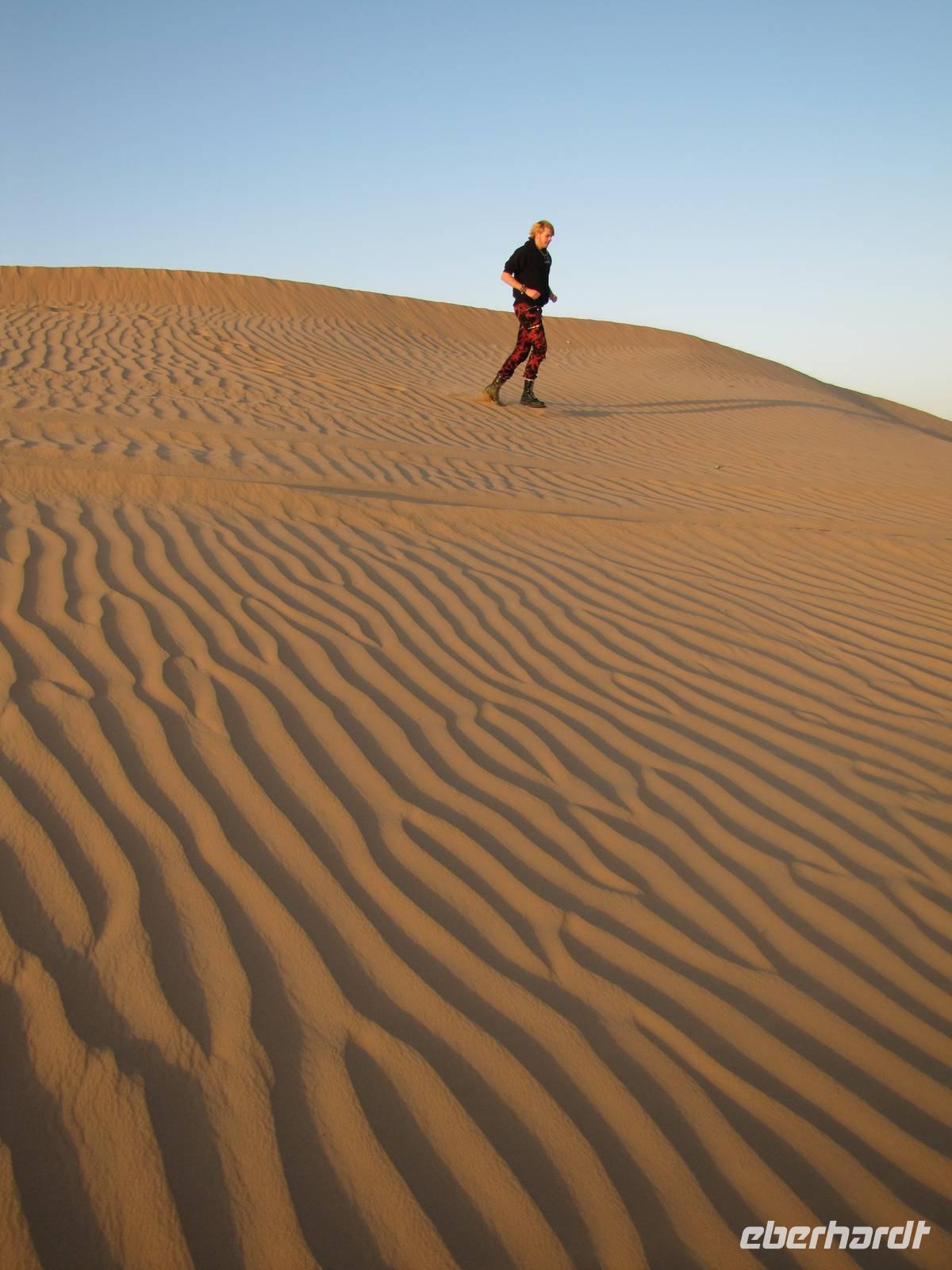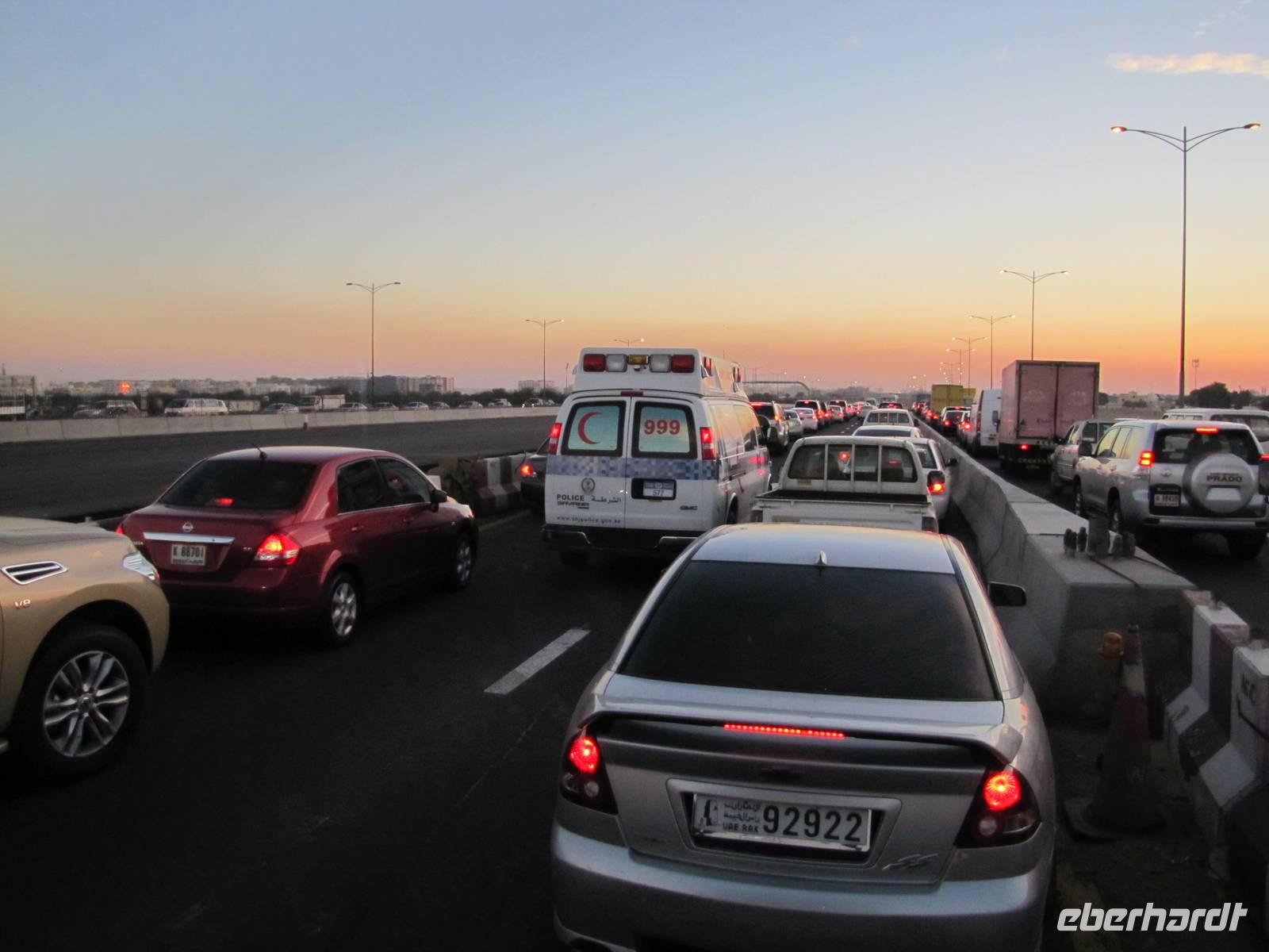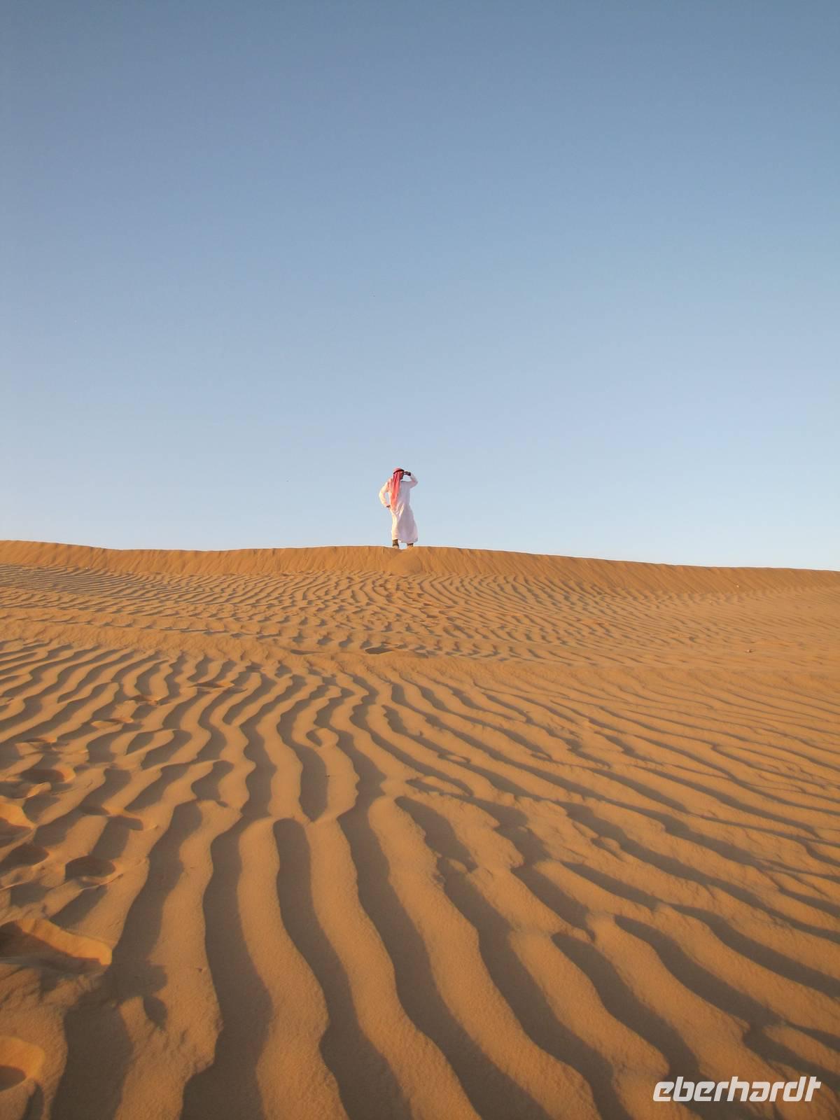 Gut ausgeschlafen ging es heute nach dem Frühstück mit unserer Reiseleiterin Anja zu Fuß zum Gegenüberliegenden Dubai Museum. Dort lernten wir einiges über die alten Traditionen und die schnelle Entwicklung Dubais nach der Ölentdeckung. Anschließend spazierten wir zum Dubai Creek, von wo aus wir mit dem Wassertaxi auf die andere Seite des Ufers übersetzten. Dort angekommen besichtigten wir den traditionellen Souk und den Gold Souk, wo einige von uns die traditionelle Kleidung der Emiratis anprobierten. Die so genannte Kaftan konnte man an jeder Ecke günstig erwerben. Leider nicht käuflich aber schön anzusehen war der größte Goldring der Welt, der sich in einem Schaufenster auf dem Gold Souk befand. Weiter ging es mit dem Bus zurück zum Hotel, wo jeder von uns sich nochmal für 2 Stunden ausruhen konnte. Denn am späten Nachmittag gegen 16.00 Uhr ging es in die Wüste von Dubai. Wir verkleideten uns in unserer neu erworbener traditionellen Tracht und bestaunten uns erst einmal Gegenseitig in der Hotellobby. Als wir uns dann noch die Hände Symbolisch schüttelten war das Foto perfekt, als wären die neuen Ölverträge abgeschlossen. J Gut gelaunt fuhren wir mit den Jeeps ca. 40 min. zu den ersten Sanddünen. Dubais Sandkasten ist ein Ausläufer der Rub al Khali Wüste, die größte Sandwüste der Welt. An der ersten Sanddüne angekommen hielten wir für einen ersten Fotostopp und die Fahrer ließen die Luft aus den Reifen, für bessere Haftung im Sand. Plötzlich hörten wir aus einem Jeep heraus Katzengeräusche. Wir wunderten uns sehr und dachten jemand hat einen Katzenklingelton auf dem Handy. Bei genauerem Hinhören aber bemerkten wir das sich eine Katze im Motorraum eines Jeeps versteckte. Die Jeepfahrer versuchten aufwändig die kleine Katze heraus zu bekommen. Da es im „Winter" in Dubai sehr kalt werden kann hatte ein Fahrer seine Winterhandschuhe bei eisigen 20 Grad mit dabei. Somit konnte er ohne gekratzt zu werden nach der Katze greifen und sie retten. Alle waren erleichtert und der Fahrer brachte sie zu einer kleinen Siedlung am Rand der Dünen. Nach dieser kleinen Aufregung gingen alle in ihre Jeeps zurück und wir fuhren weiter zum Wüstencamp. Unterwegs sahen wir viele Kamele die im roten Abendlicht der Sonne durch die Dünen liefen. Im Wüstencamp angekommen konnten wir uns auf eine kleine Kamelkarawane setzen und den Sitzkomfort eines Kamelrückens testen. Sehr angenehm! Im Camp gab es leckeres traditionelles Essen mit arabischer Bauchtanzshow untermalt. Als alle gut gesättigt waren probierten einige von uns nach dem Essen die traditionelle Kleidung der Araber an oder rauchten genüsslich eine Wasserpfeife. Es war wie in einem Märchen aus 1000 und einer Nacht, es fehlte nur noch Aladin mit seiner Wunderlampe. Gegen 21 Uhr fuhren wir mit den Jeeps und zusammen mit unserer lieben Reiseleiterin Anja zurück nach Dubai. Mit tollen Eindrücken aus der Wüste kehrten wir zum Hotel zurück und freuten uns schon wieder auf den nächsten Tag.Dienstag