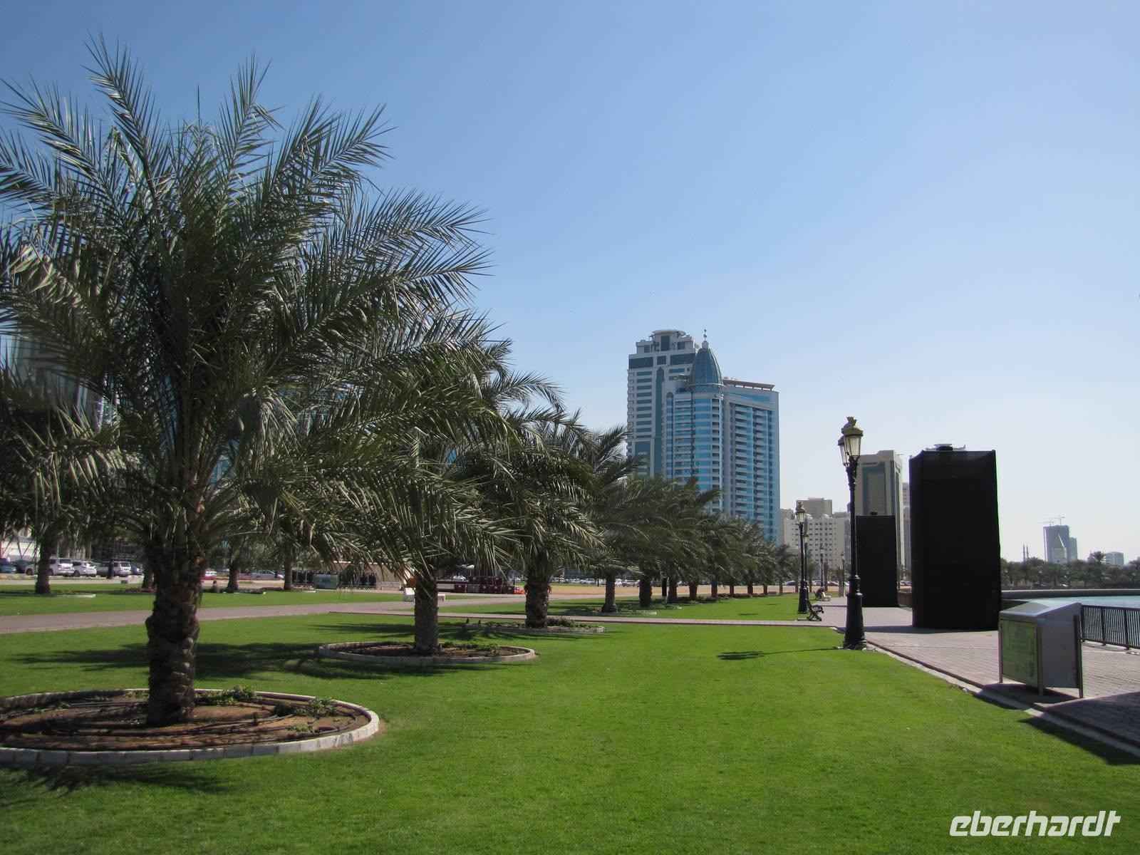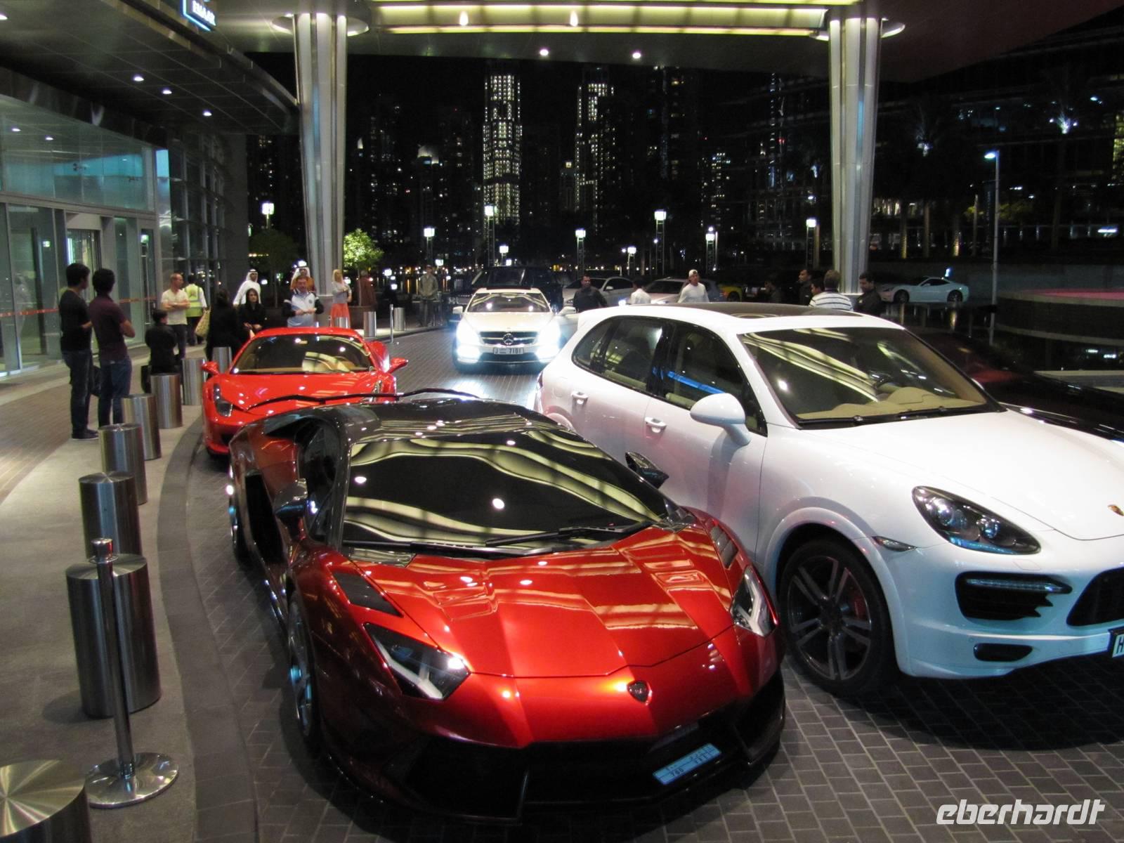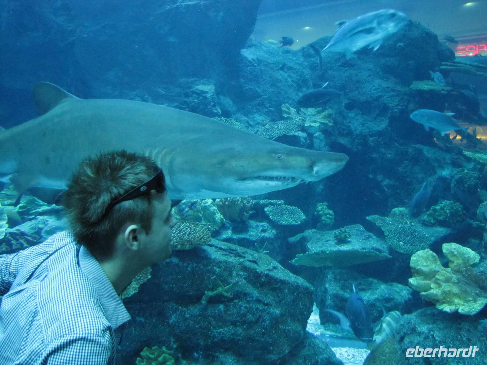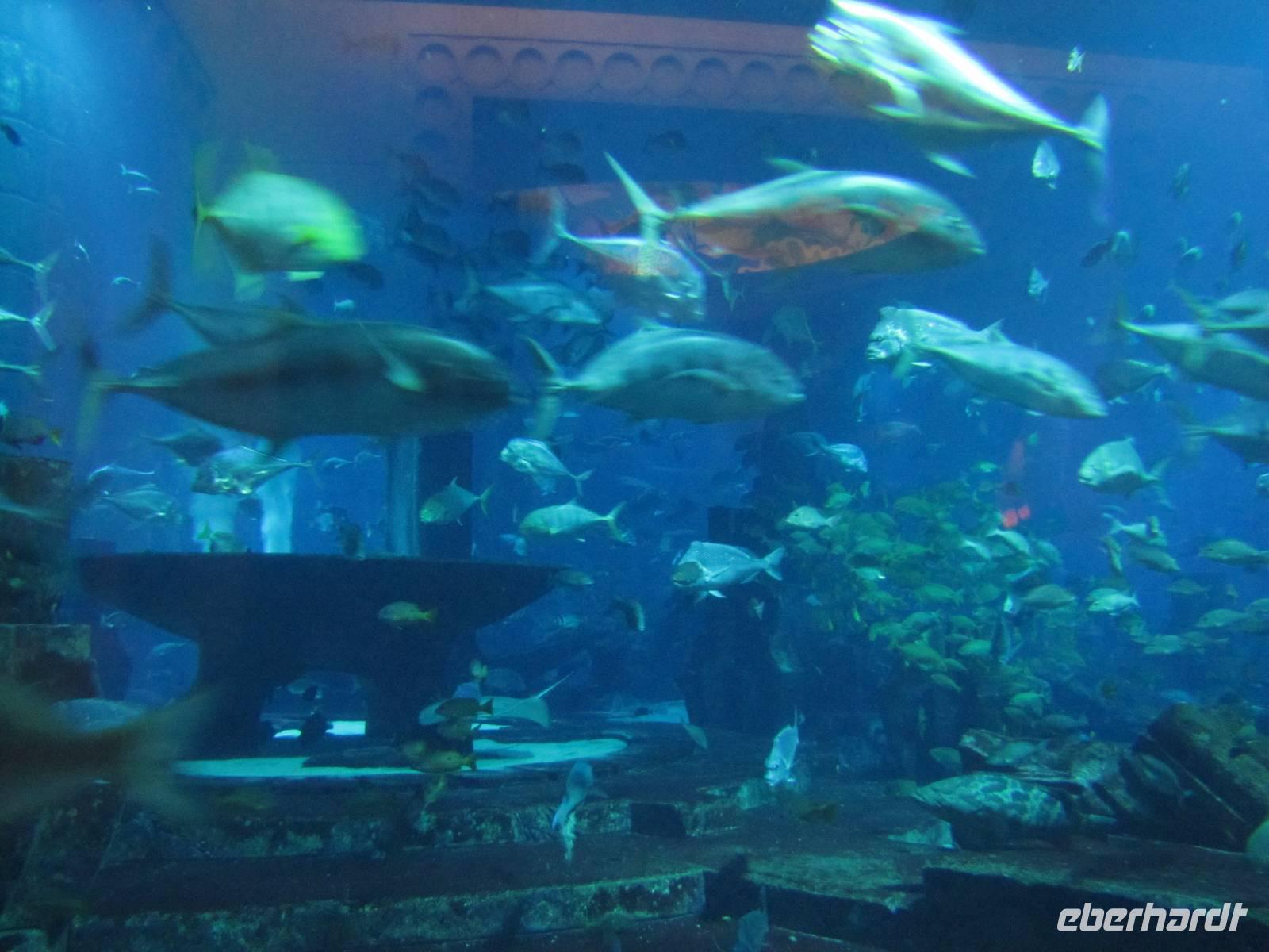 Heute ging es gegen 9.30 nach dem Frühstück zusammen mit Anja in das strengste der 7 Emiraten, nach Sharjah. Die gleichnamige Stadt grenzt fast direkt an Dubai an orientiert sich streng an die Scharia von z.B. Saudi Arabien. Von weiten sahen wir schon die hohen Hochhäuser der Stadt. Ähnlich wie in Dubai entstanden hier in den letzten 10 Jahren gigantische Wolkenkratzer. Jedoch werden diese vorwiegend als Wohnraum genutzt. Das Interessante an den Häusern ist, das fast jedes Gebäude einen Helikopter Landeplatz besitzt. Im Falle eines Brandes gerettet zu werden oder als Landeplatz um schnell zur Arbeit zu gelangen dienen die Dächer der Stadt. In Deutschland gibt es die Mitfahrgelegenheit und in Sharjah die „Mitfluggelegenheit" wo mehrere Geschäftleute frühs zusammen auf Arbeit fliegen nach Dubai. Wir fuhren ein wenig durch die Stadt und besuchten zuerst den Korankreisverkehr, wo rings herum eine Moschee, ein Gericht und ein Verwaltungsgebäude der Stadt standen. Weiter ging es zum Fischmarkt von Sharjah. Dort konnten wir den frischen Fang des Tages betrachten und auch mal einen kleinen Hai in die Hand nehmen. Unser größter der Reisegruppe, auch Konstantin genannt hielt stolz einen Hai vor die Kamera. Anschließend fuhren wir zu einer Mall und legten eine kurze Pause ein. Mit einem tollen Blick auf die Skyline verabschiedeten wir uns von Sharjah und es ging wieder nach Dubai. Unser nächstes Ziel hieß: Burj Khalifa, das höchste Haus der Welt. Dort angekommen blickten alle erstaunt in den blauen Himmel zur Spitze des Gebäudes. Es war ein gigantischer Anblick! Der Stadtteil heißt Downtown Dubai und am Fuße des Burj Khalifa befindet sich ein künstlicher See mit türkiesblauem Wasser. Nachdem wir tolle Fotos schossen, legten wir in der Dubai Mall, der größten Mall der Welt eine Mittagspause ein. Von Mc Donnals bis Nordsee gab es alles. Nach dem Essen besichtigten wir das Dubai Aquarium und den Dubai Zoo. Anschließend bestaunten wir noch den Dubai Ice Creek, die Schlittschuhbahn von Dubai. Dies befindet sich alles in der größten Mall der Welt, neben dem höchsten Haus der Welt. Anja erzählte uns immer wieder stolz, das Dubai die Stadt der Weltrekorde sei! Gegen 16.20Uhr ging es zum höchsten Aussichtspunkt der Welt mit dem schnellsten Fahrstuhl der Welt. (Und ich fuhr mit der liebsten Reisegruppe der Welt J). Das Gebäude hat eine Gesamthöhe von 828 Metern und wurde nach Scheich Khalifa benannt, um dich Dankbar für eine Geld Spritze aus Abu Dhabi zu zeigen. Bei ausgezeichneter Sicht blickten wir über die imposante Skyline bis hin zur Palmeninsel. Kurz vor 18.00 Uhr trafen wir uns wieder unten am ausgemachten Treffpunkt und bestaunten die tollen Wasserspiele am Fuße des Gebäudes. Immer ab 18.00 Uhr sind aller halben Stunde bis 23.00Uhr Wasserspiele mit Musikuntermalung. Wir konnten nicht genug bekommen und schauten uns 18.30Uhr nochmal eine Show an. Gegen 19.00Uhr fuhren wir zurück zum Hotel und freuten uns auf unser Abendbrot. Abends unternahm ich mit einigen Gästen noch einen kleinen Ausflug mit der Metro noch einmal zum Burj Khalifa, wir bestaunten noch einmal die tollen Wasserspiele und gingen danach in die Skybar „Neos" im Adress Hotel. Im 64. Stockwerk angekommen blickten wir über die tolle Skyline bei einem leckeren Drink. Gegen 24Uhr sind wir mit Taxis wieder zurück zum Hotel gefahren, eine Strecke kostete ca. 10,00€ (sehr günstig).