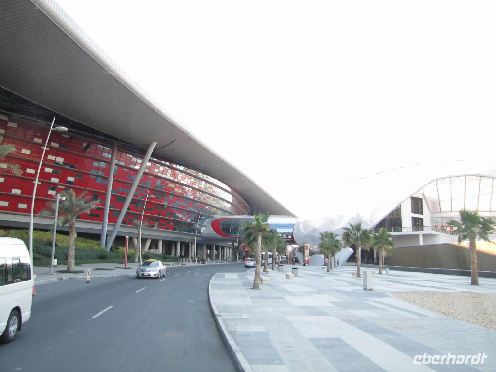 Am späten Nachmittag trafen sich die Eberhardt- Reisegruppe in Dresden am Flughafen voller Erwartung und Vorfreude auf eine tolle bevorstehende Reise. Nachdem wir unser Gepäck abgegeben hatten und es alle durch die Sicherheitskontrolle geschafft haben, aßen wir im Restaurant „Vanilla" noch ein leckeres frisch belegtes Brötchen an unserem extra eingedeckten Tisch. So ging die Reise gesättigt und ganz entspannt los. Wir flogen von Dresden nach München wo wir noch einmal einen kurzen Aufenthalt hatten. Am Flughafen in München trafen wir uns mit unseren Leipziger Gästen am Abflugsgate nach Dubai. Nun waren wir endlich komplett und flogen abends mit einem A340 ca. 6 Stunden in die Weltmetropole Dubai!