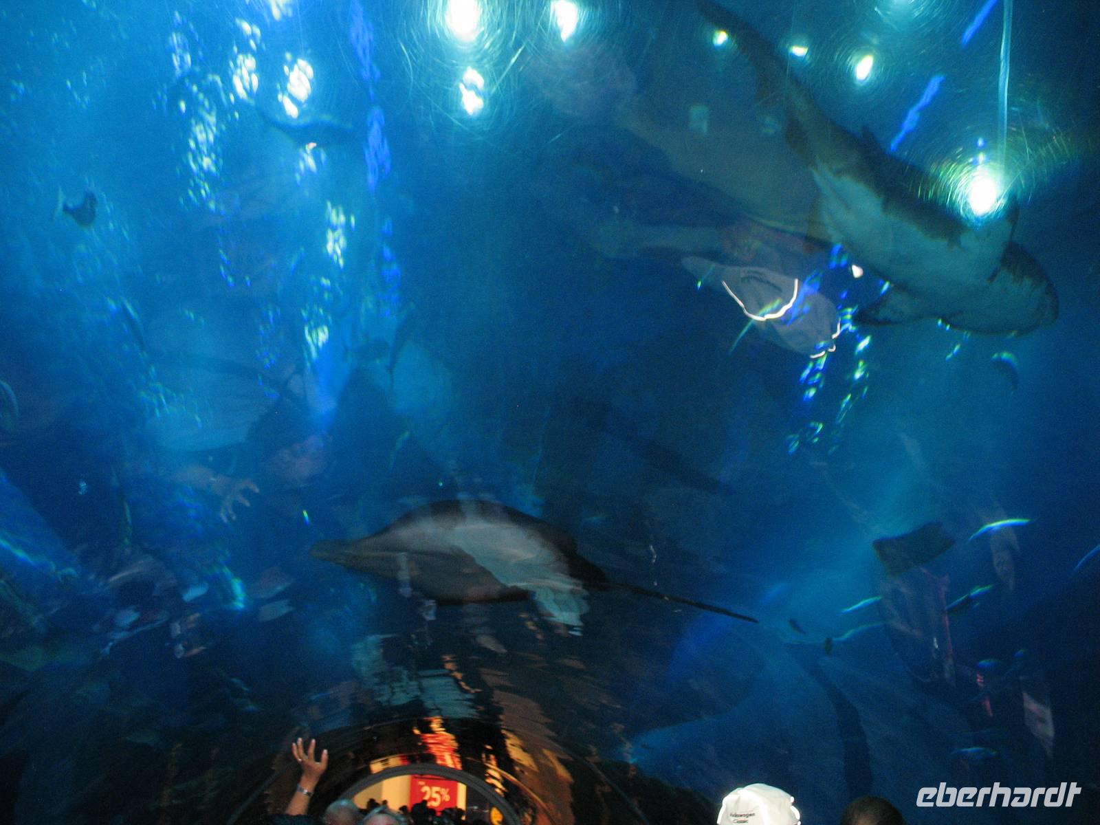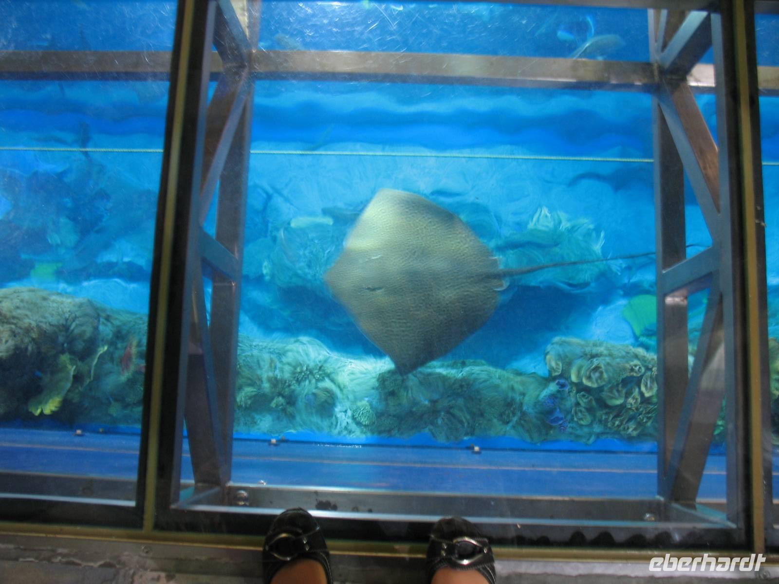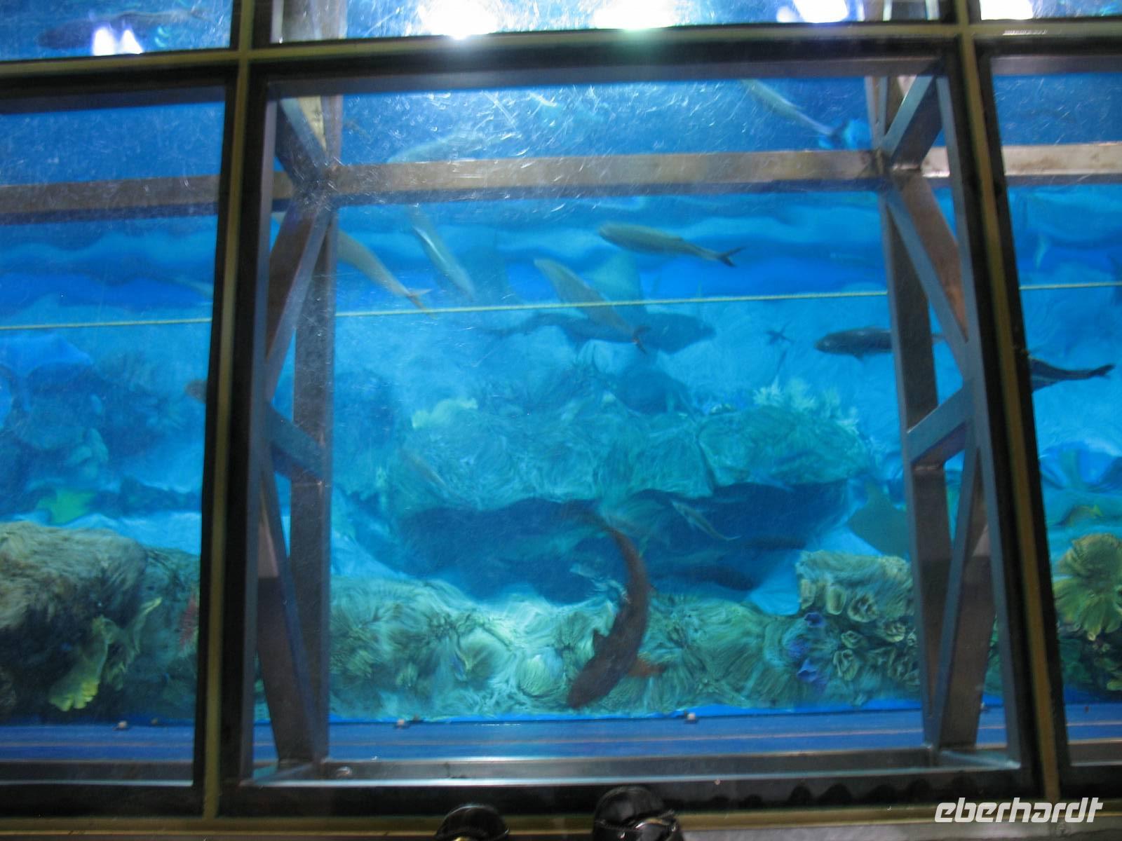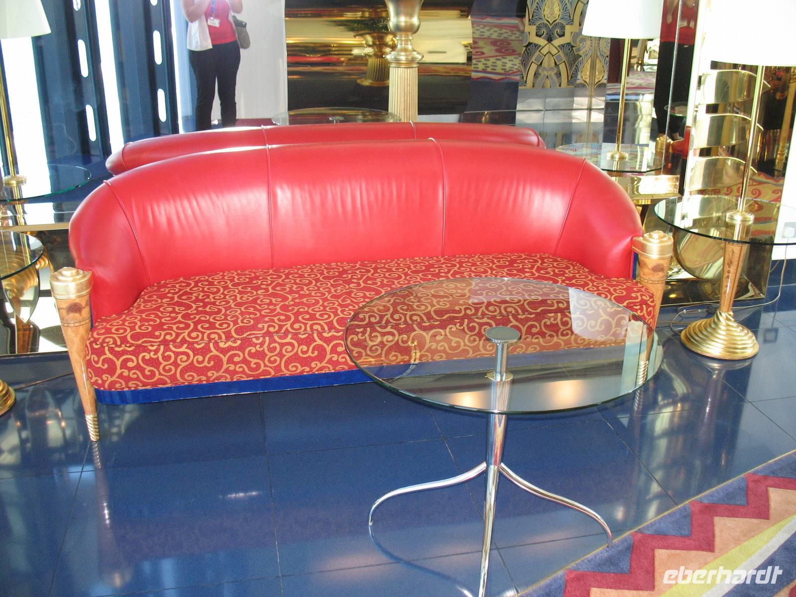 Unser heutiger Tag beginnt wieder mit strahlendem Sonnenschein :-) Während wir gestern bereits das Alte Dubai zu Fuß erkundet haben, folgt am zweiten Tag bei einer Stadtrundfahrt das Moderne Dubai. Zuerst legen wir einen kurzen Foto-Stopp an der Jumeirah Mosque ein. Interessant ist dabei, dass jede Moschee mindestens ein Minarett besitzt. Anja erzählt uns, dass 1975 noch keine Hochhäuser in Dubai zu finden waren. In gleichen Jahr wurde beschlossen, ein World Trade Center für den Welthandel zu bauen. Der Bau hat vier Jahre gedauert und das Gebäude ist 184 Meter hoch. Zudem ist es auf dem 100-Dirham-Schein abgebildet, da es das erste Hochhaus in Dubai war. Weiter erfahren wir, dass Dubai früher ein eigenständiges Land mit eigener rot-weißer Flagge war. Im Jahre 1971 wurde es Mitglied der Vereinigten Arabischen Emirate (VAE). Daraufhin änderte sich auch die Flagge. Sie besteht nun aus den Farben grün, weiß, schwarz und rot. Dann fahren wir zur The Palm Jumeirah. Unterwegs sehen wir öfters ein Bild mit drei Personen. Dies sind die Herrscher in Dubai, nämlich von rechts nach links der Kronprinz Scheich Hamdan, dann in der Mitte der momentane Herrscher in Dubai (seit 2006) und Vizepräsident der VAE Scheich Mohammad und ganz links der Präsident des ganzen Landes und Herrscher in Abu Dhabi Scheich Khalifa. Die Einheimischen sind sehr stolz auf ihre Herrscher, daher sind überall Bilder von ihnen zu sehen. Die Herrscher-Familie in Dubai ist die Maktoum-Familie. Der Name vom Scheich fasst sich so zusammen, dass Scheich in der Übersetzung "der Weiße" bedeutet. Im Gegensatz zu vielen Königshäusern, wo meistens das älteste Kind der Thronfolger oder die Thronfolgerin ist, wird in Dubai in der Familie entschieden, wer der klügste Sohn ist und dieser wird zum Nachfolger ernannt. In Dubai gibt es zwei Jahreszeiten oder auch zwei Saisons genannt. Die heiße Saison ist im Zeitraum von Mitte April oder Anfang Mai bis Oktober mit Temperaturen über 50 Grad und bis zu 99 Prozent Luftfeuchtigkeit. Wir schwitzen bereits nur vom Hören dieser Gradzahlen und können uns gar nicht vorstellen, wie die Menschen bei solche extremen Temperaturen leben können. Die beste Reisezeit mit relativ angenehmen Temperaturen ist von Oktober bis Mitte/ Ende April, wobei in den "kühlsten" Monaten Dezember und Januar tagsüber sogar Temperaturen um die 18 Grad sein können und wo es in der Nacht vereinzelt auch bis auf 10 Grad abkühlen kann. Außerdem ist Dubai eine Halbinsel, das Wasser verdampft aufgrund der hohen Temperaturen, aus dem aufsteigenden Dampft kann sich aber kaum eine Wolke bilden, da sie sofort wieder verdunstet und zu hoher Luftfeuchtigkeit führt. In den kühleren Monaten ist das anders, da können sich durchaus Wolken bilden und es kann regnen, was aber relativ selten vorkommt. Weiter fahren wir am Dubai Zoo vorbei. Dieser Zoo wurde 1996 errichtet und das Besondere daran ist, dass alle Tiere eine eigene Klimaanlage besitzen. Wir können dies bei solchen Temperaturen auch vollkommen nachvollziehen :-) Auf der Rückseite des Zoos befindet sich die deutsche Botschaft. Wir fahren an der im italienischen Baustil errichteten Mercato Shopping Mall vorbei. In Dubai gibt es mittlerweile mehr als 60 Shoppingmalls. Weiter erzählt uns Anja, dass die Privatsphäre in der arabischen Kultur sehr hoch geschätzt wird, so dass keine fremden Menschen einfach so ins Haus kommen. Die Kästen zum Ablesen von Strom und Wasser befinden sich demnach nicht im Haus, sondern diese grauen Kästen stehen draußen an der Hausmauer. Außerdem dürfen Besucher nicht einfach das Grundstück oder gar das Haus betreten. Vor der Villa gibt es links für die Männer und rechts für die Damen ein kleines Haus so wie ein Zelt. Männer und Frauen sitzen, wie es in der arabischen Kultur Tradition ist, getrennt voneinander in verschiedenen Zelten. Zum weiteren Schutz der Privatsphäre werden Mauern um die Häuser errichtet, da vor allem die Frauen zuhause ja auch nicht verschleiert sind. Wir sehen auch eine Hausmauer mit Lichterketten, was bedeutet, dass hinter diesen Mauern eine Tochter verheiratet wird. Die Lichterketten werden für eine Woche um das Haus und die Mauer gelegt. Weiter passieren wir das Four Seasons Resort Dubai am Jumeirah Beach, den Dubai Ladies Club und der Jumeirah Beach Park. Übersetzt heißt Jumeirah "die Glut", da der Sandstrand sehr heiß ist und es sich beim Laufen darüber wie eine Glut anfühlt. Der Strandabschnitt wurde ausschließlich zum Perlentauchen und zur Fischerei im 18. Jahrhundert genutzt, so dass ein traditionelles Souvenir aus Dubai eine Perle ist. Während der Fahrt erzählt uns Anja weiter, dass es in den Emiraten sehr teuer ist, mit dem Fahrzeug geblitzt zu werden, auch wenn es fast überall 20 km/h Karenz gibt. In Abu Dhabi haben sie sogar seit zwei Jahren "Blitzer-Happy-Hour", nimm zwei für einen Preis :-) Dagegen ist der Benzinpreis aufgrund des in den 80Jahren gefundenen Öls sehr günstig, momentan 32 Cent pro Liter. Solche Preise hätten wir natürlich auch gern in Deutschland! Das Öl soll in Dubai noch für die nächsten fünf Jahre vorrätig sein. Jedoch gehört es schon lange nicht mehr zum Hauptwirtschaftszweig, das ist heutzutage vor allem der Tourismus. Scheich Mohammad hat das Potential im Bereich Tourismus gesehen und begonnen hat er in Dubai mit dem Bau des Wahrzeichens, das Burj Al Arab Hotel. Dieses Hotel wurde von einem Architekten-Team aus Großbritannien mit dem Ziel verwirklicht, ein Hotel zu bauen, welches mit der Vergangenheit oder dem Land in Verbindung steht. Große Bedeutung hatte das Meer und die Schifffahrt im Wüstenstaat, so dass letztendlich das Burj Al Arab ein Segelboot darstellt, welches 1999 rund 300 Meter vom Festland entfernt auf einer eigenen Insel im Meer errichtet wurde. Somit hat dieses Hotel auch den Auftakt für den zunehmenden Tourismus in Dubai gebildet. Dann haben wir auch endlich einen ersten Blick auf das 7-Sterne-Hotel Burj Al Arab. An