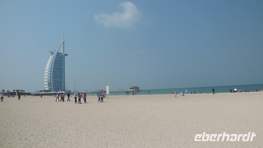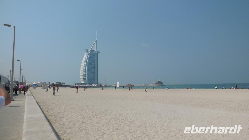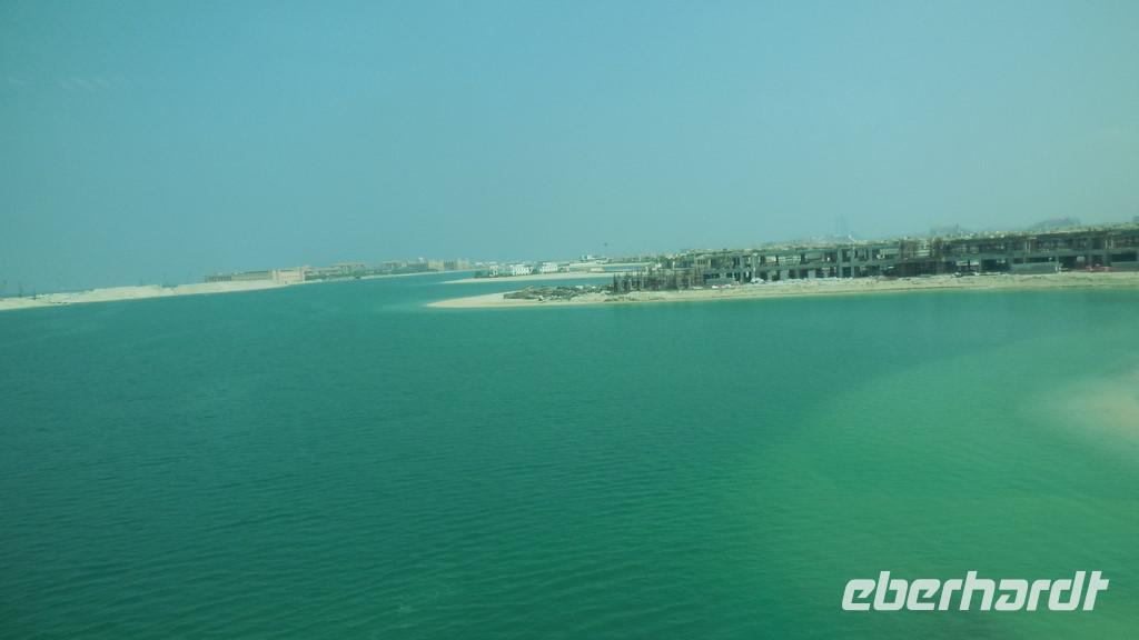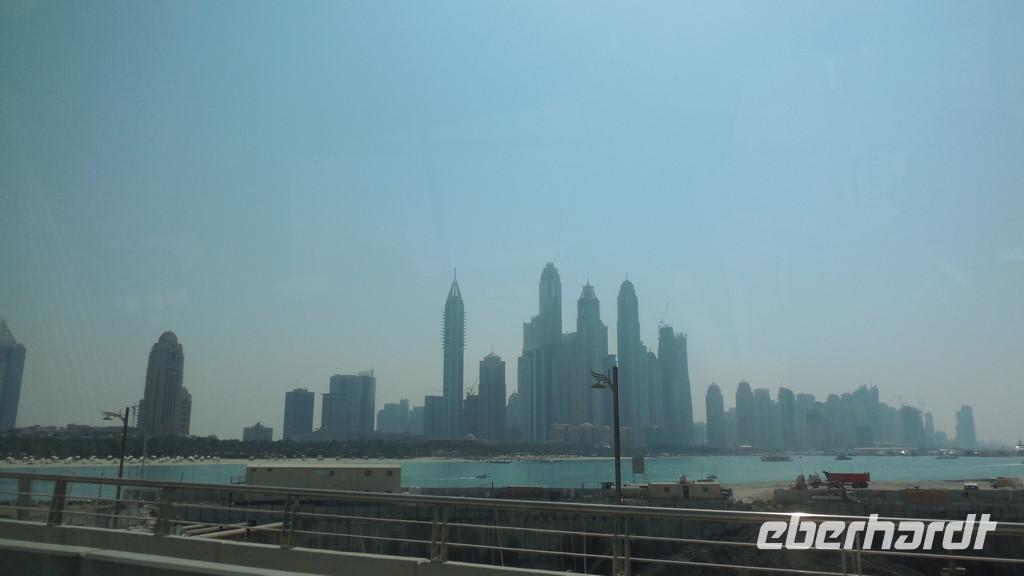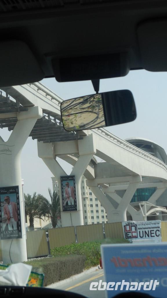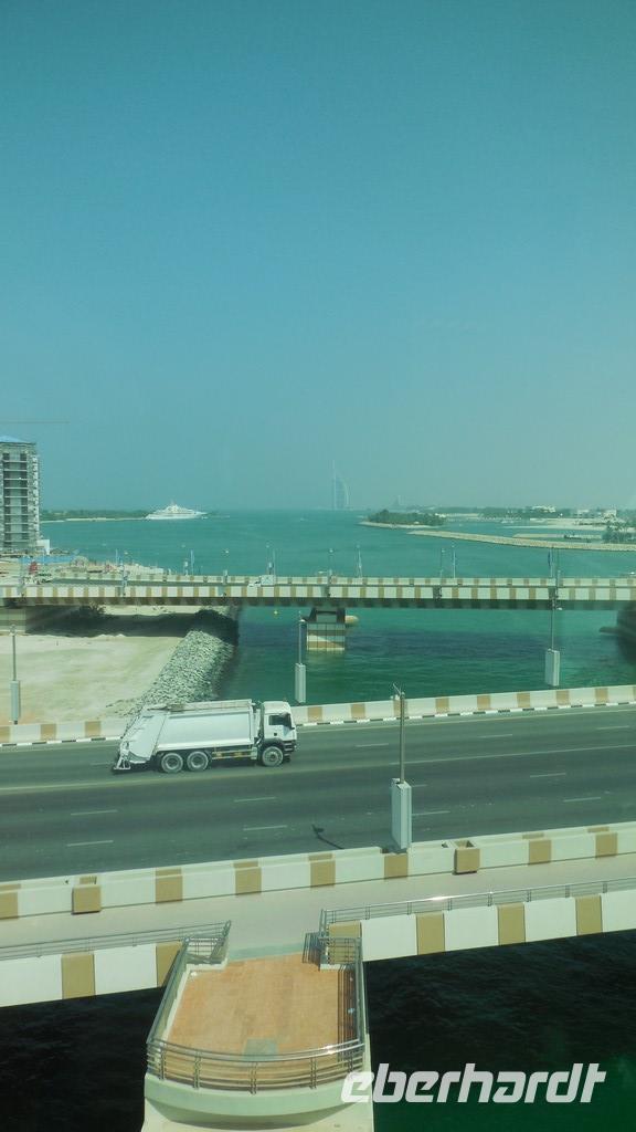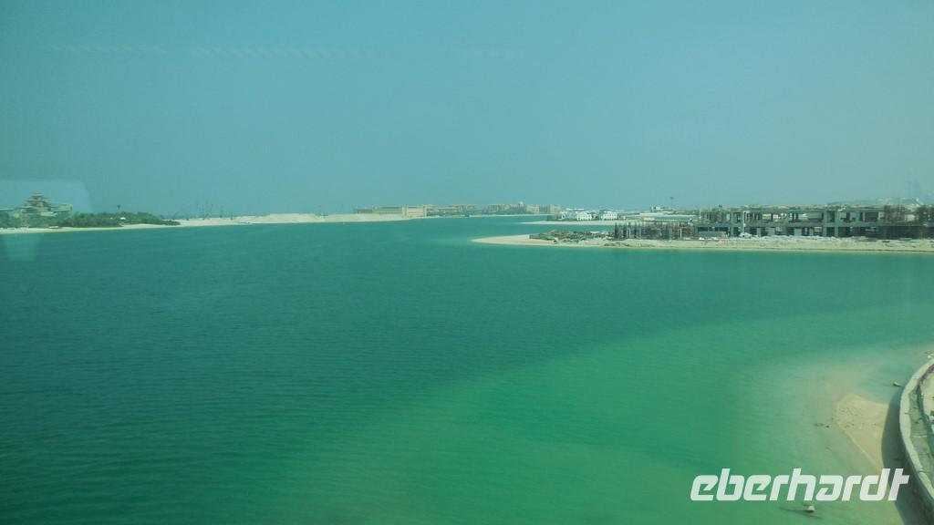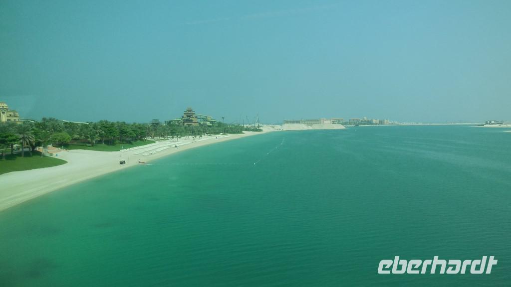 Um 10.00 Uhr stand unser Bus vorm Hotel und Anja begrüßte uns munter, um uns „ihre" Stadt zu zeigen. Heute stand das moderne Dubai auf dem Programm. Als erstes zeigte Sie uns die Jumeirah Moschee. Dann konnten wir bereits einen Blick auf das Burj al Arab Hotel werfen. Wir liefen über den Strand und testeten das warme herrliche Wasser. Als nächstes kam der erste Höhepunkt des Tages. Mit der Monorail fuhren wir auf die Palme. Eine 5,4 km lange Bahnstrecke führt vom Stamm bis zur Palmenspitze, von der man einen ersten Einblick erhält.