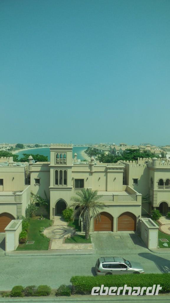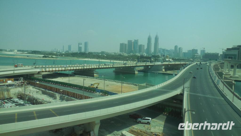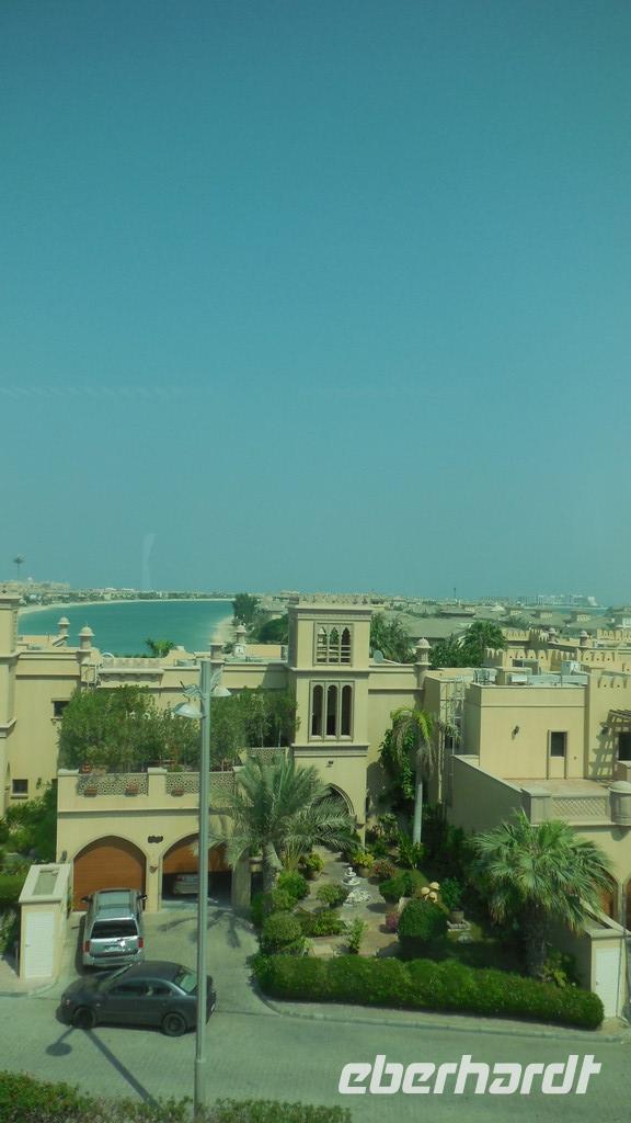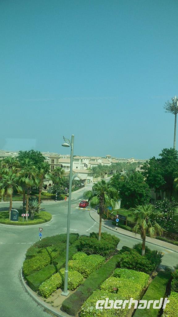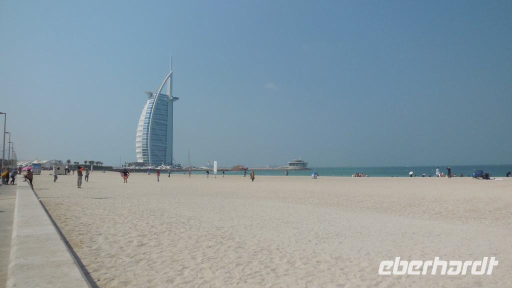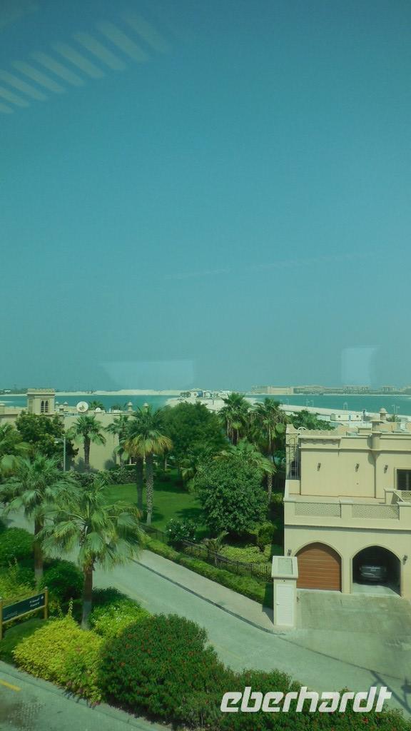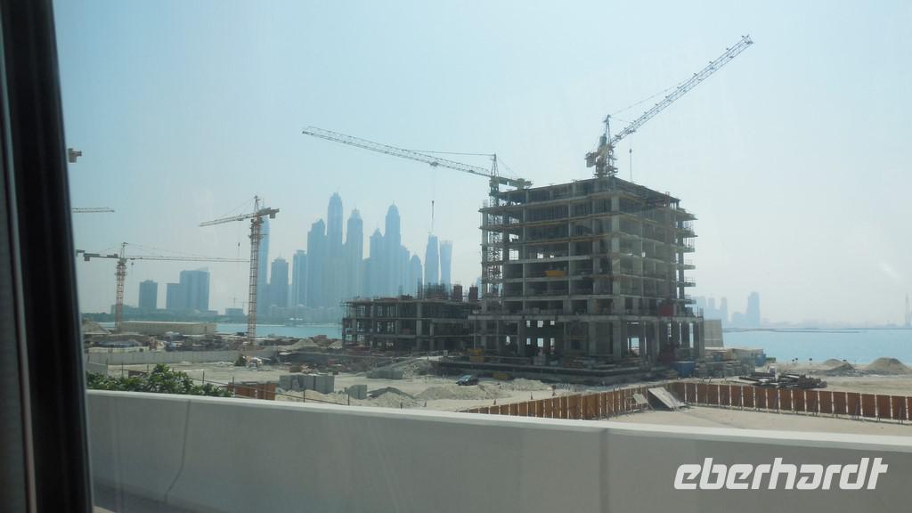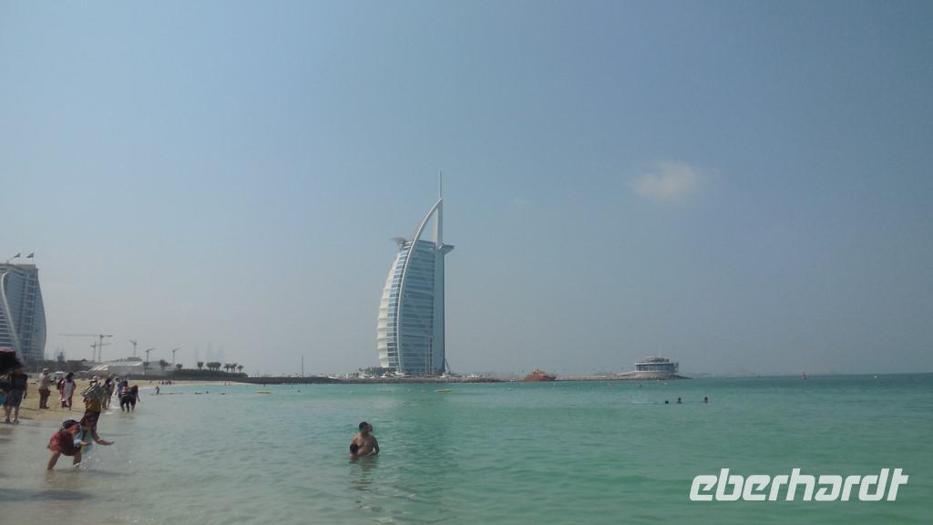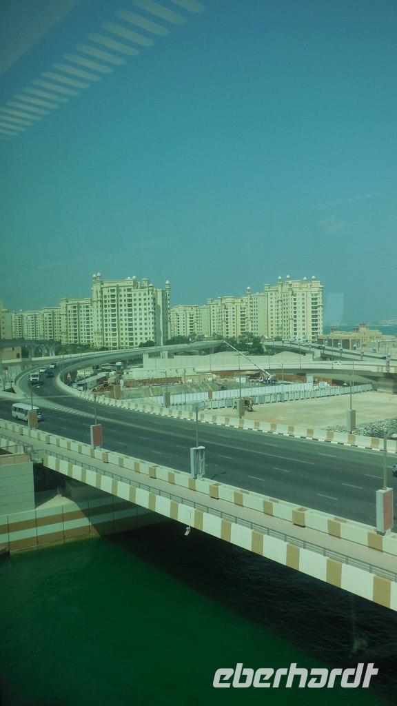 Um 10.00 Uhr stand unser Bus vorm Hotel und Anja begrüßte uns munter, um uns „ihre" Stadt zu zeigen. Heute stand das moderne Dubai auf dem Programm. Als erstes zeigte Sie uns die Jumeirah Moschee. Dann konnten wir bereits einen Blick auf das Burj al Arab Hotel werfen. Wir liefen über den Strand und testeten das warme herrliche Wasser. Als nächstes kam der erste Höhepunkt des Tages. Mit der Monorail fuhren wir auf die Palme. Eine 5,4 km lange Bahnstrecke führt vom Stamm bis zur Palmenspitze, von der man einen ersten Einblick erhält.