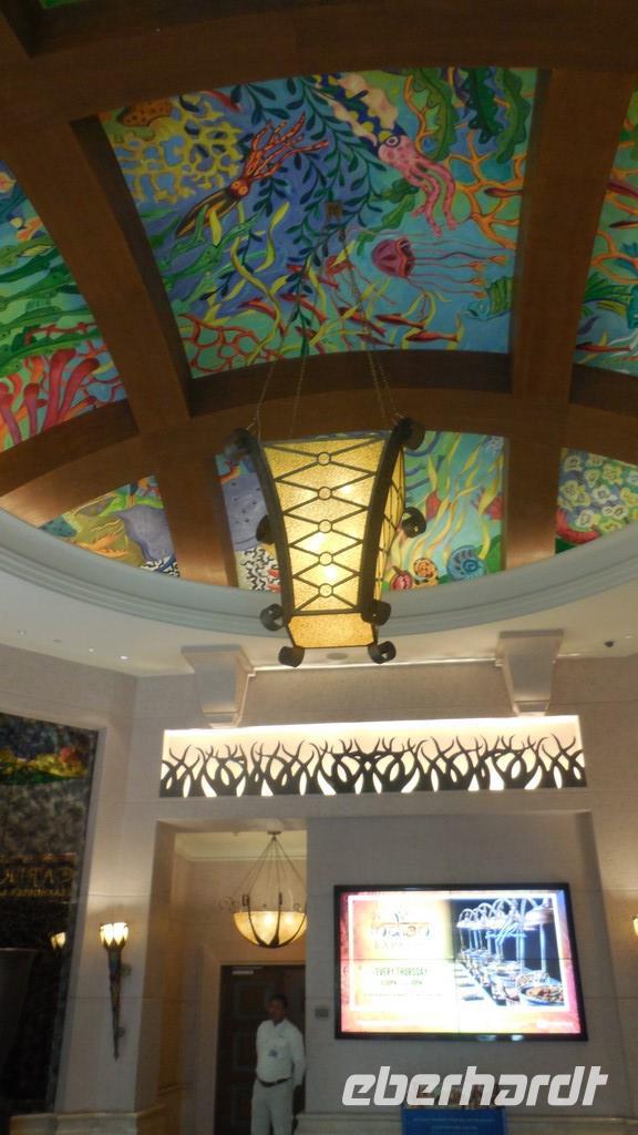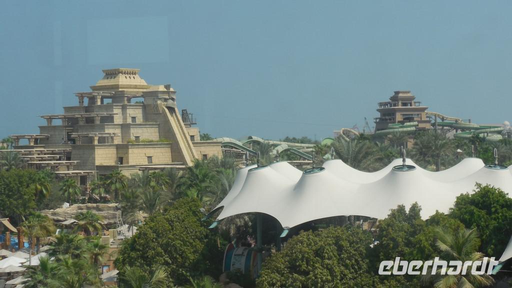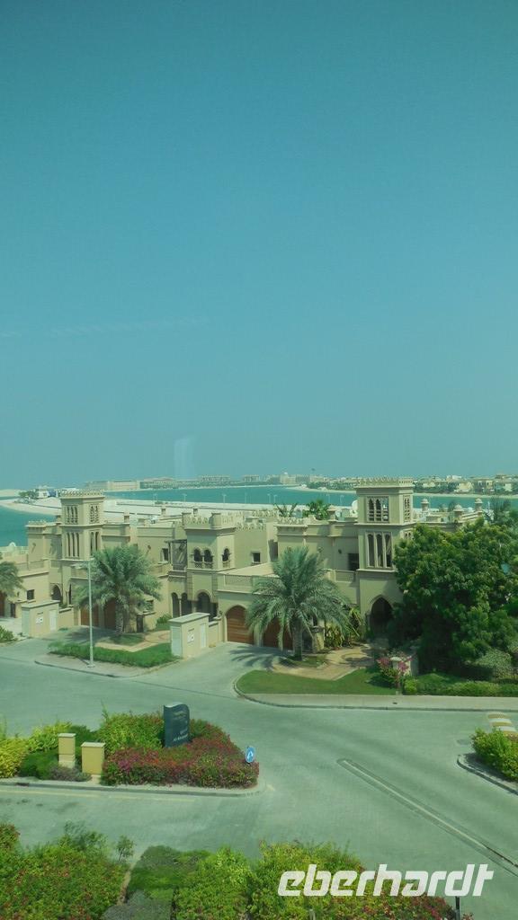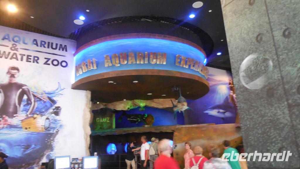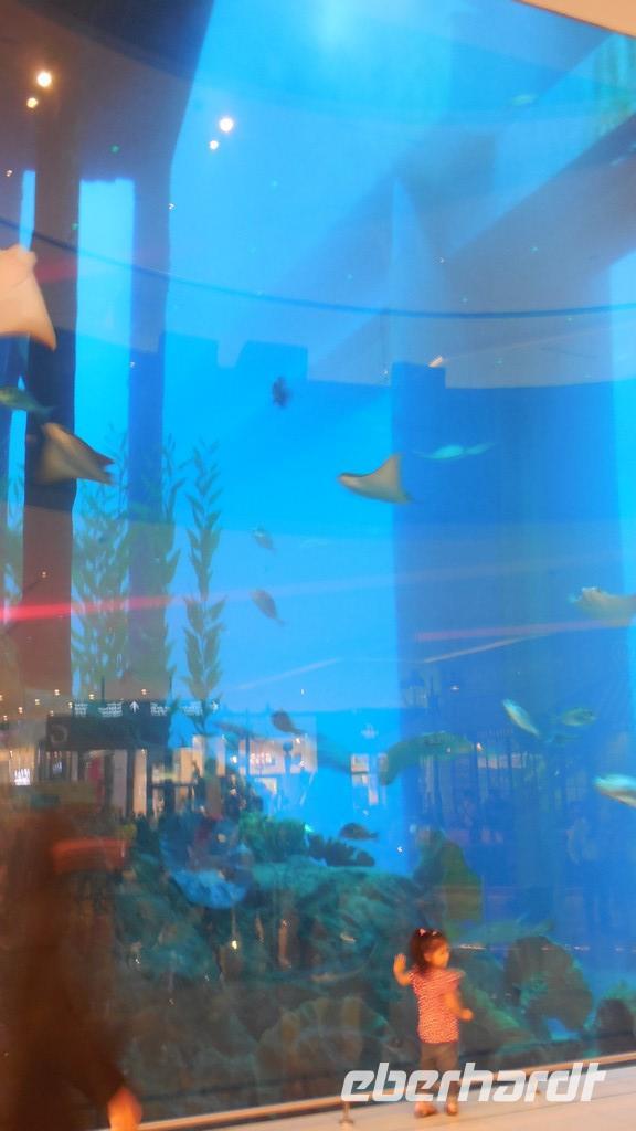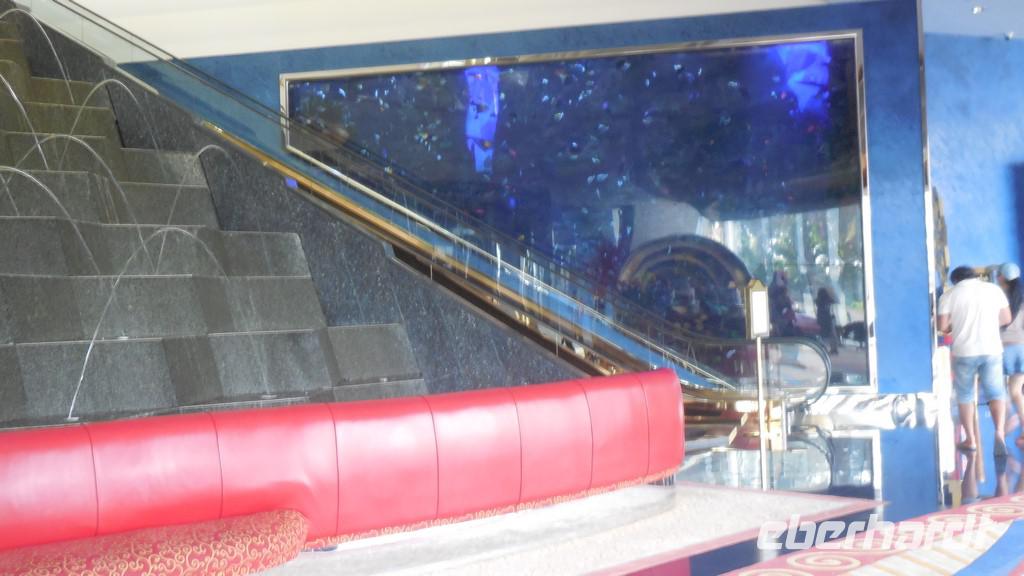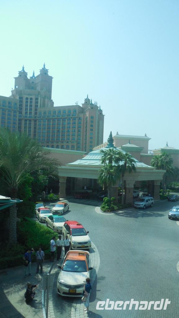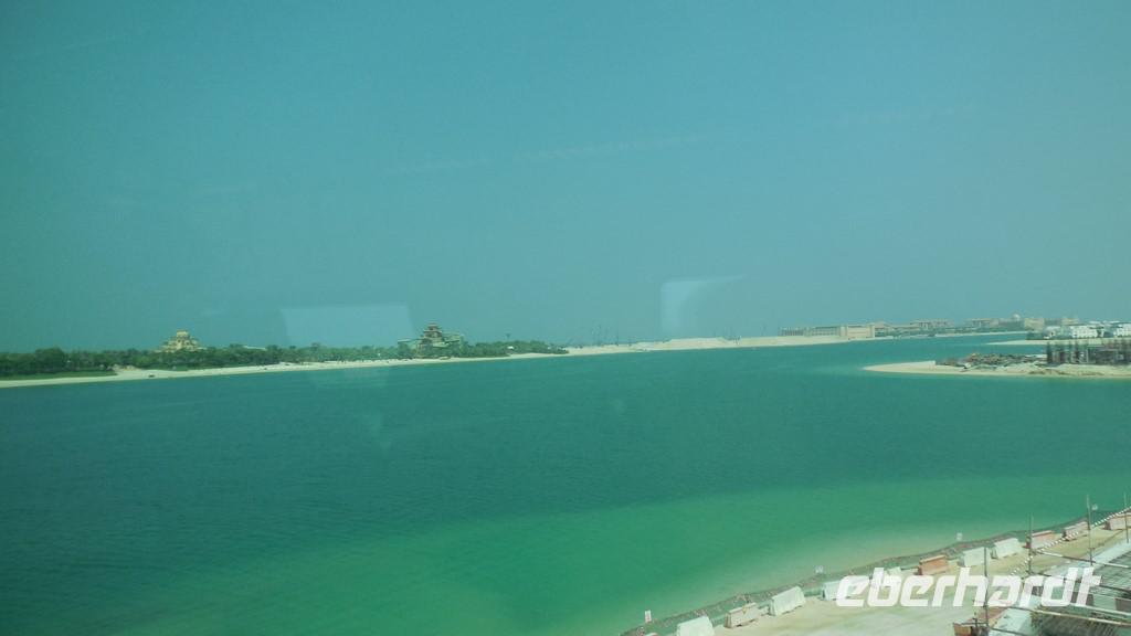 Die Palme ist eine künstlich aufgeschüttete Insel. Von oben kann man die Palme gut erkennen. Sie hat 16 Wedel, die alle dicht bebaut sind. Anja erzählt, dass schon bei Planung alle Immobilien schnell vergriffen waren. Inzwischen wurden aber bereits viele Projekte wieder gestoppt. Es stehen auch viele Wohnungen leer. Trotzdem wird noch gebaut. Wir bestaunten den riesigen Wasserpark der am „Atlantis" ist. Wir hatten Glück und konnten einen Blick ins Hotel werfen. Auch hier gab es ein großes Aquarium und ganz viele schicke Geschäfte. Es ist richtig schön und edel.