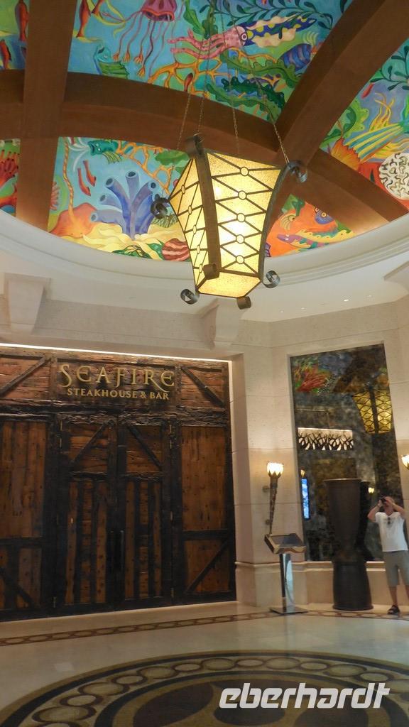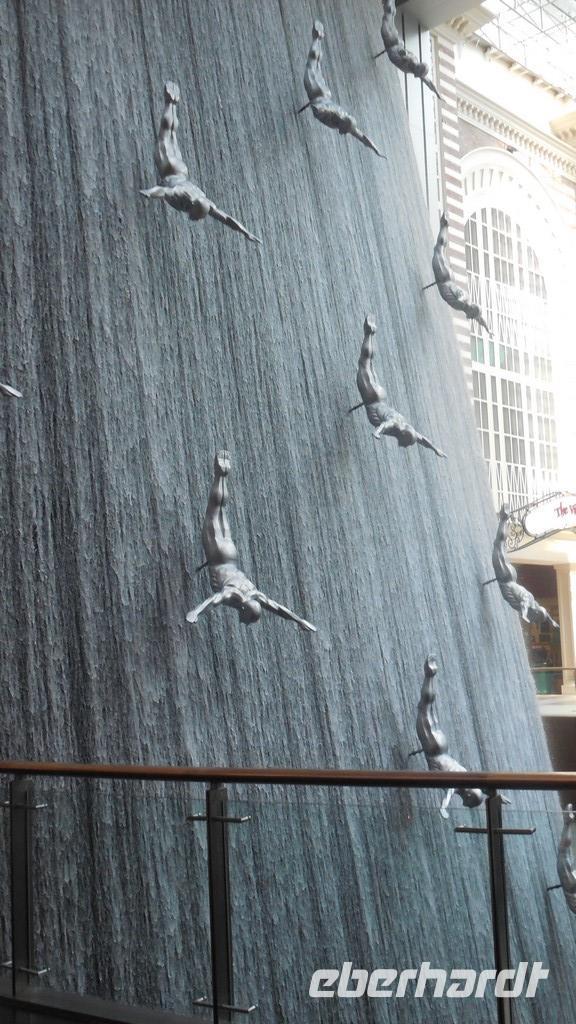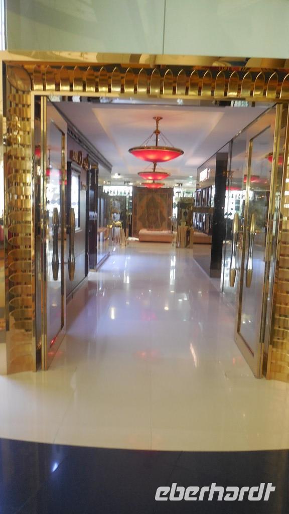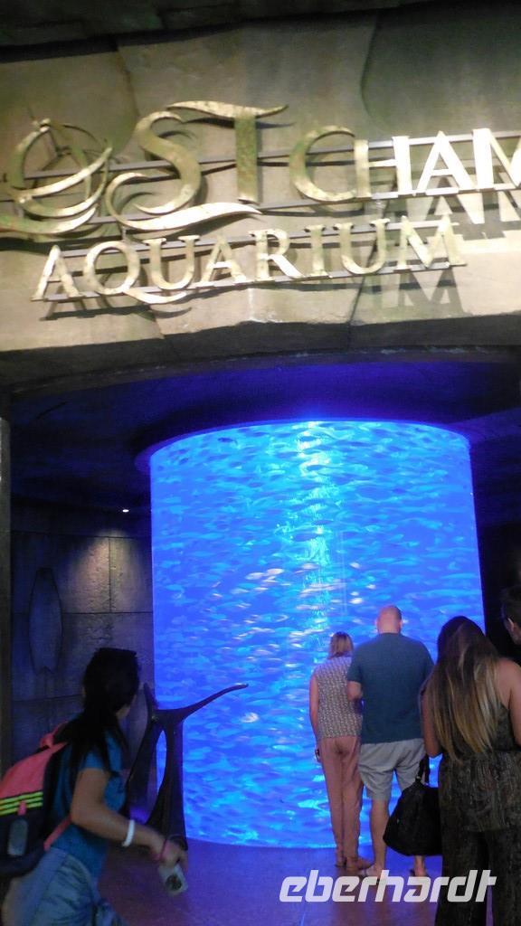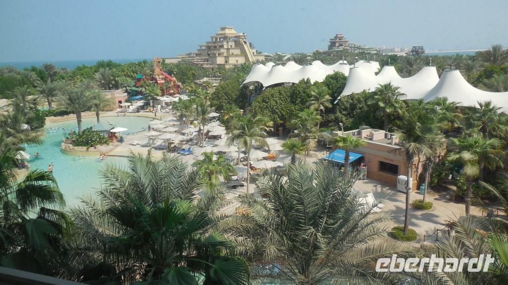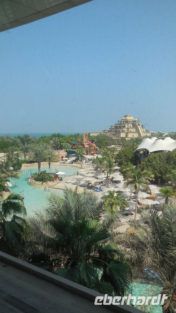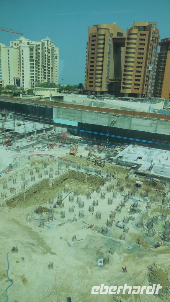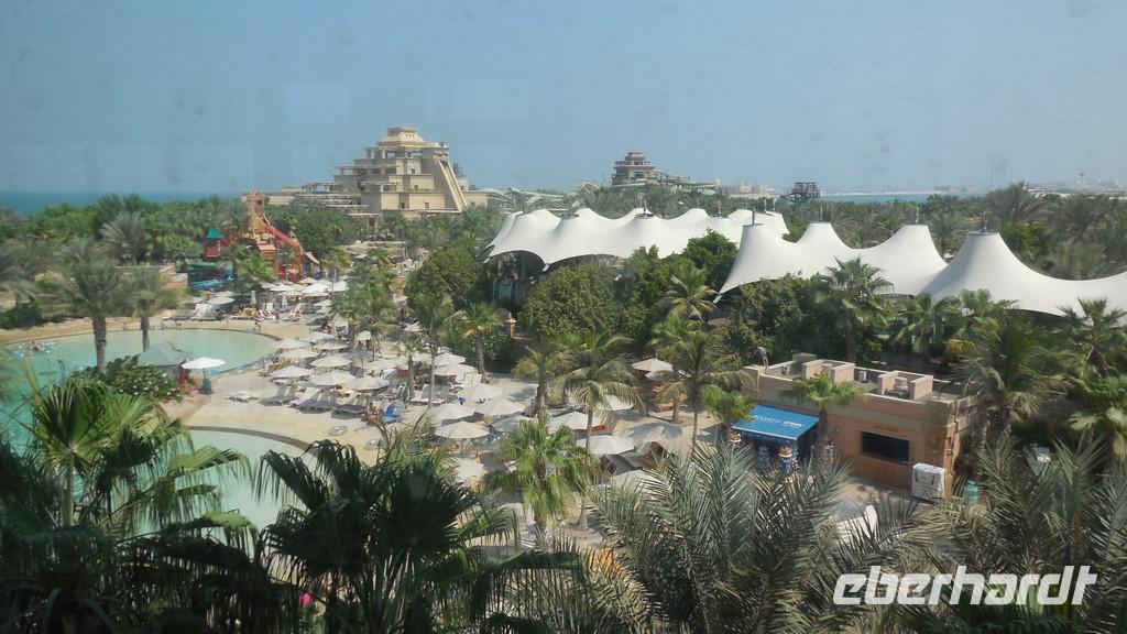 Die Palme ist eine künstlich aufgeschüttete Insel. Von oben kann man die Palme gut erkennen. Sie hat 16 Wedel, die alle dicht bebaut sind. Anja erzählt, dass schon bei Planung alle Immobilien schnell vergriffen waren. Inzwischen wurden aber bereits viele Projekte wieder gestoppt. Es stehen auch viele Wohnungen leer. Trotzdem wird noch gebaut. Wir bestaunten den riesigen Wasserpark der am „Atlantis" ist. Wir hatten Glück und konnten einen Blick ins Hotel werfen. Auch hier gab es ein großes Aquarium und ganz viele schicke Geschäfte. Es ist richtig schön und edel.