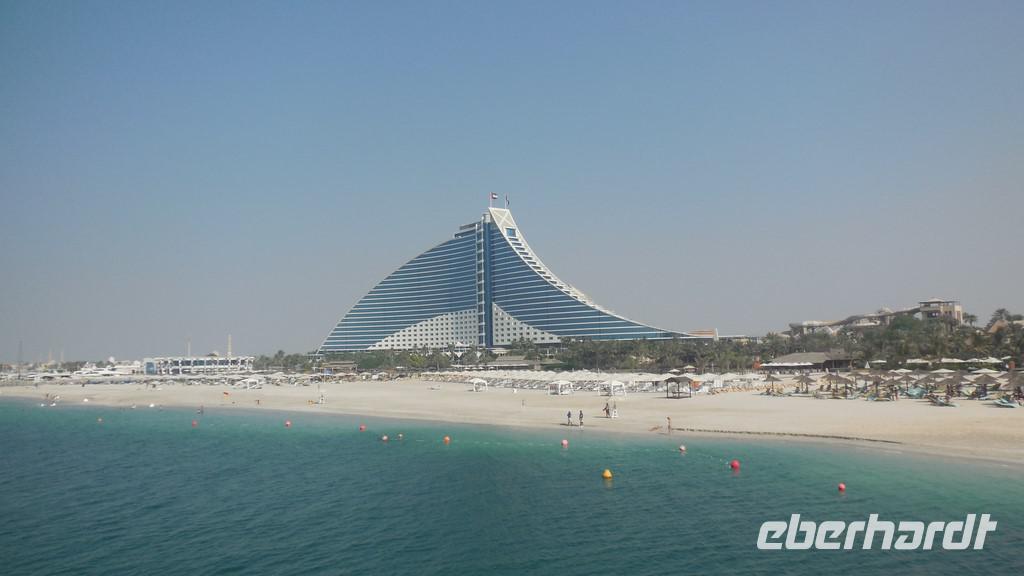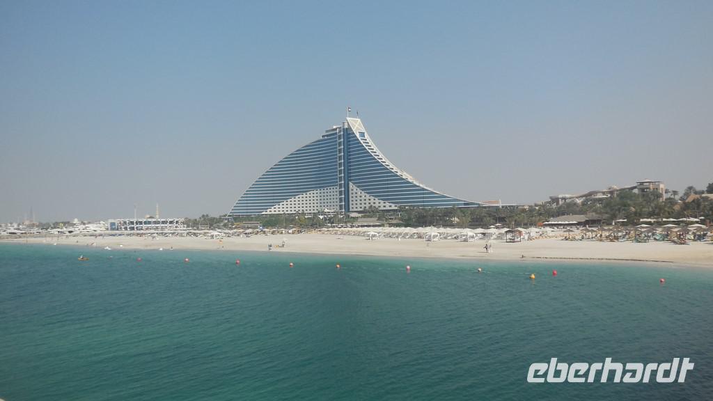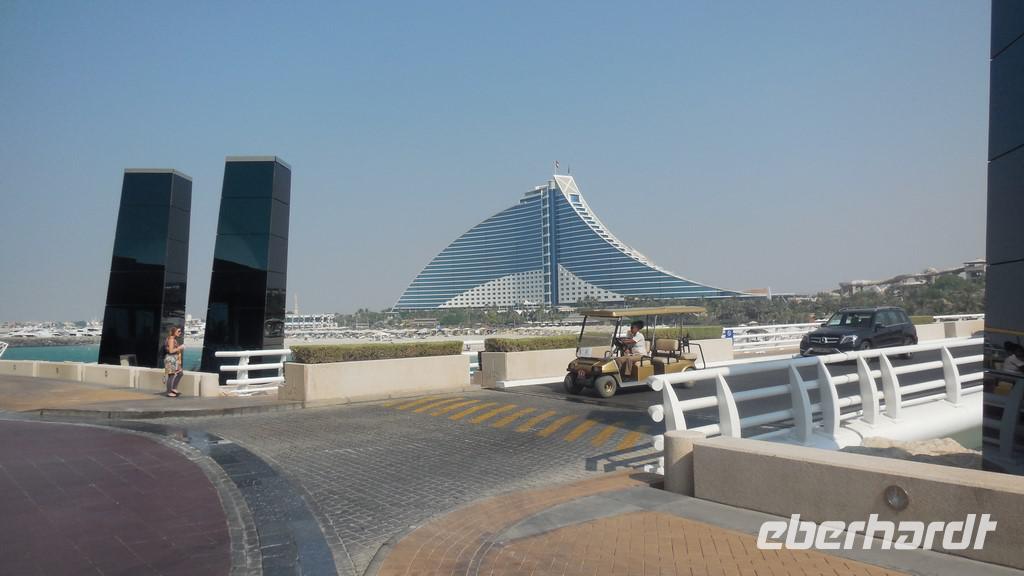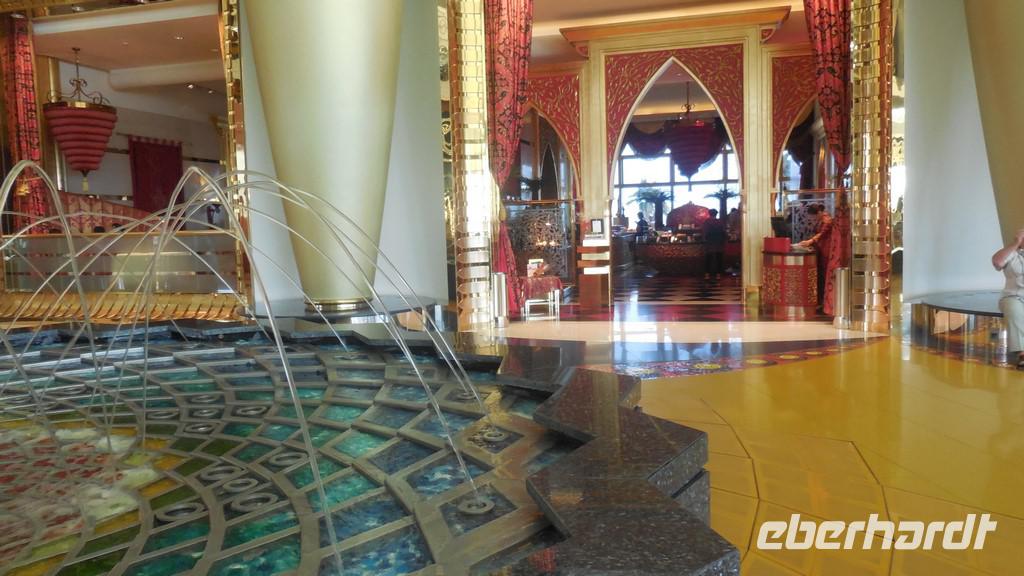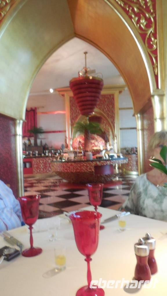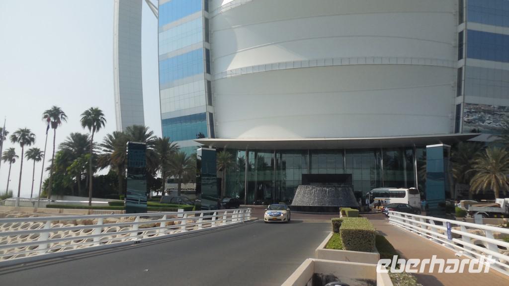 Von dort starteten alle, die ein Essen im Hotel gebucht hatten. Nach Anmeldung und Kontrolle ging es zum modernsten und spektakulärsten 7 Sterne Hotel. Auf einer eigenen kleinen Insel gebaut und wie ein Segelschiff aussehend ist es auch ein Wahrzeichen geworden. Dieses exklusive Luxushotel, wurde 2000 eröffnet und hat seitdem viele berühmte Gäste begrüßt. Neugierig sahen wir uns um. Dann ging es ins Restaurant zum Essen. Viele bekannte und unbekannte Leckereien entdeckten wir. Vor allen die Süßspeisen in der Mitte angerichtet ließen keinen Wunsch offen. Wir bummelten noch etwas durchs Hotel. Mehrfach hörten wir Hubschrauber landen und starten.