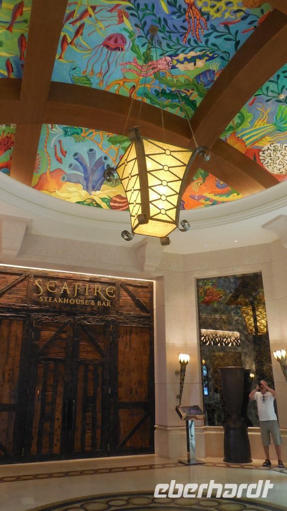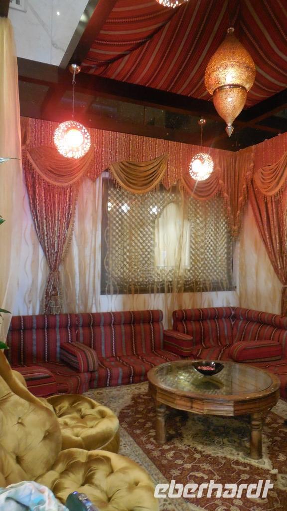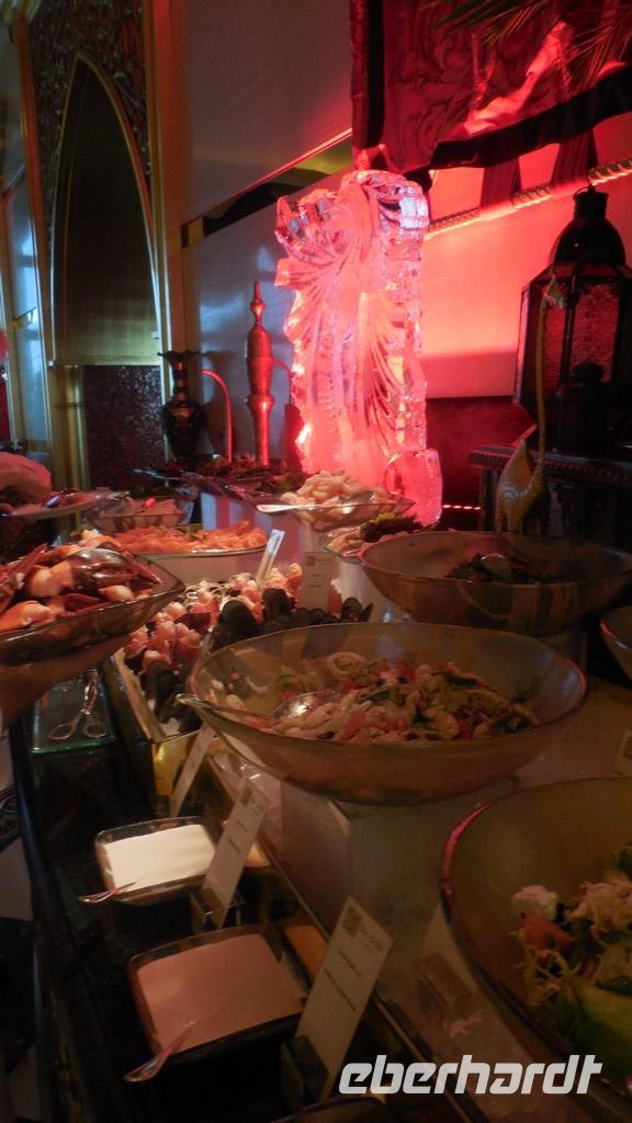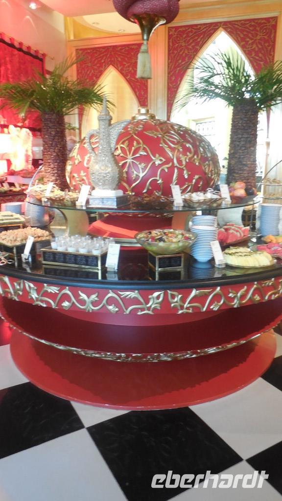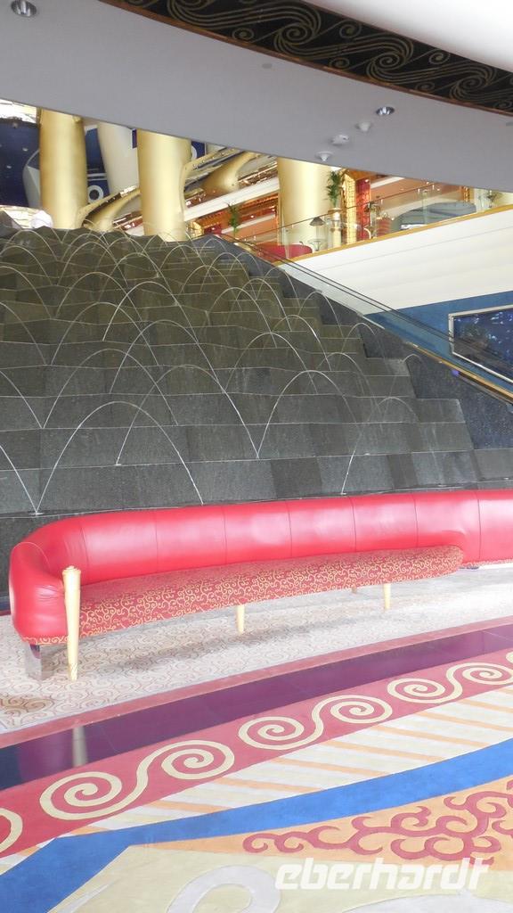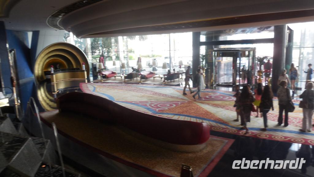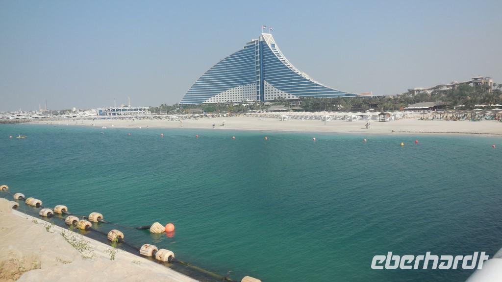 Von dort starteten alle, die ein Essen im Hotel gebucht hatten. Nach Anmeldung und Kontrolle ging es zum modernsten und spektakulärsten 7 Sterne Hotel. Auf einer eigenen kleinen Insel gebaut und wie ein Segelschiff aussehend ist es auch ein Wahrzeichen geworden. Dieses exklusive Luxushotel, wurde 2000 eröffnet und hat seitdem viele berühmte Gäste begrüßt. Neugierig sahen wir uns um. Dann ging es ins Restaurant zum Essen. Viele bekannte und unbekannte Leckereien entdeckten wir. Vor allen die Süßspeisen in der Mitte angerichtet ließen keinen Wunsch offen. Wir bummelten noch etwas durchs Hotel. Mehrfach hörten wir Hubschrauber landen und starten.