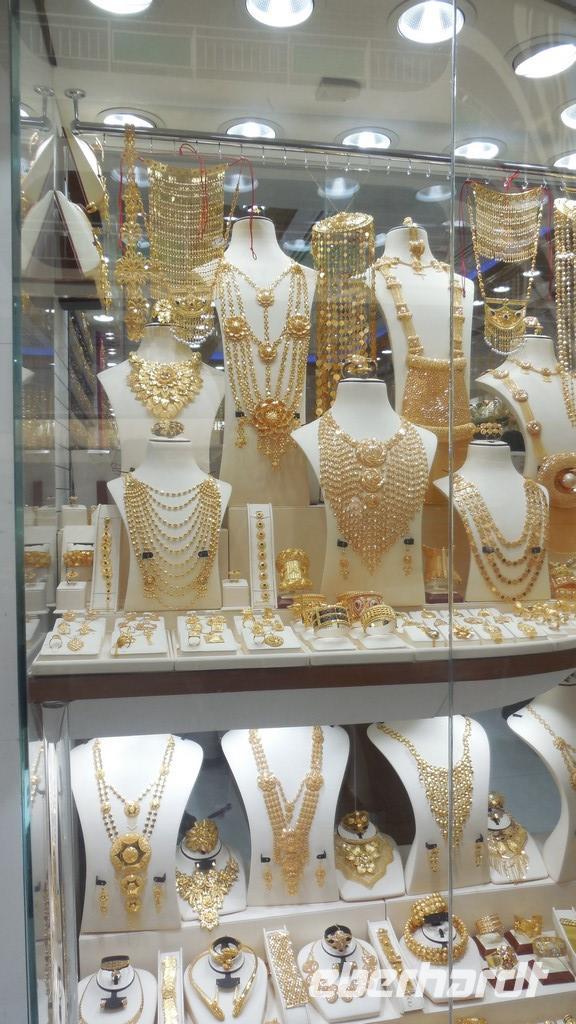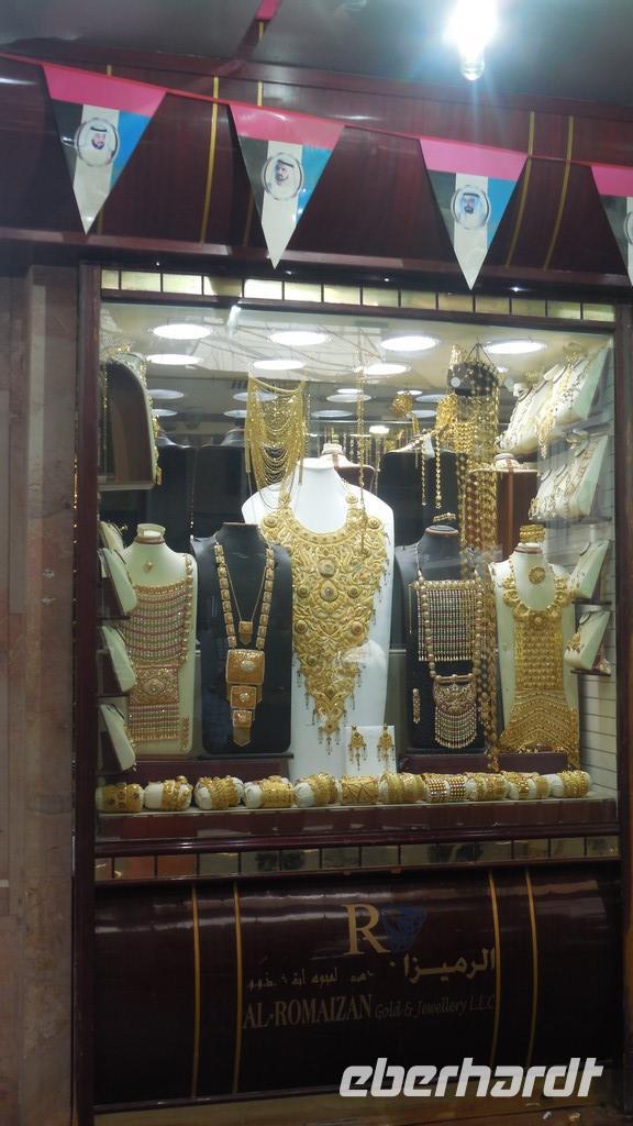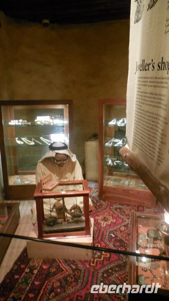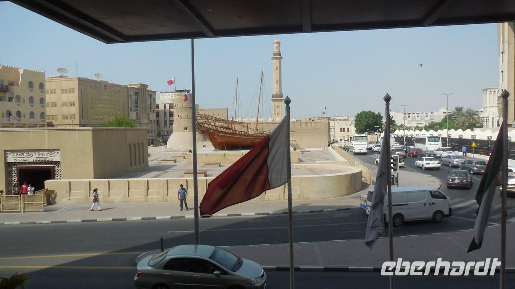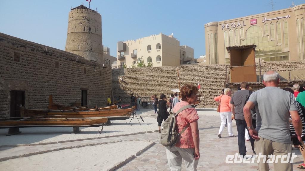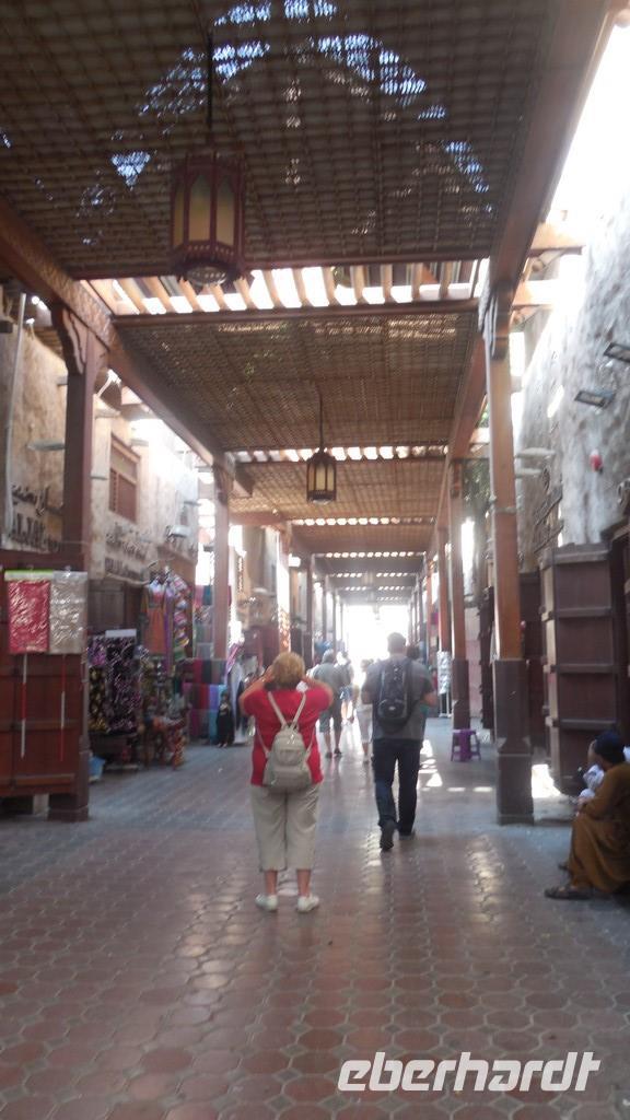 Um 8 trafen uns zum Frühstück. Halb 10 begann unser Tag mit Anja. Die uns am Hotel abholte. Als erstes zeigte Sie uns das Dubai Museum, dass nur auf der anderen Straßenseite war. Alle waren begeistert, wie anschaulich alles dort dargestellt wird. Man kann sich sehr gut vorstellen, wie die Menschen früher gelebt haben. In einem Film konnte man sehr gut die Entstehung Dubais erleben. Anschließend gingen wir gemeinsam zum Creek. Die Sonne strahlte vom stahlblauen Himmel und fast 40 Grad ließen viele fast schmelzen. Wir fuhren mit dem Wassertaxi, einem "Abra" über den Fluss und genossen den super Blick auf die tolle Kulisse. Auf der anderen Seite erwartete uns das bunte Treiben der arabischen Märkte. Als erstes kam der Gewürz Souk. Die engen Gassen sind voller Gewürze und Früchte. Es roch sehr betörend. Dann schlenderten wir weiter zum Gold Souk. Hier glitzerte es überall. Er gilt als größter Goldmarkt. Die unzähligen Geschäfte mit den vielen Schmuckstücken sind unglaublich. Natürlich ist dort auch der größte und teuerste Goldring der Welt! Der Vermerk ist auch im Guiness Buch der Rekorde.