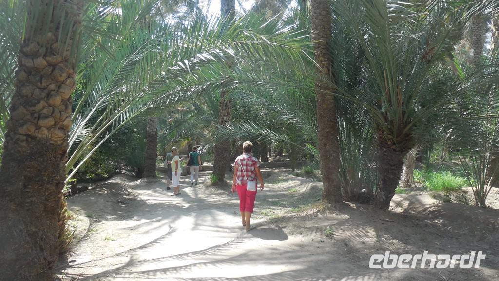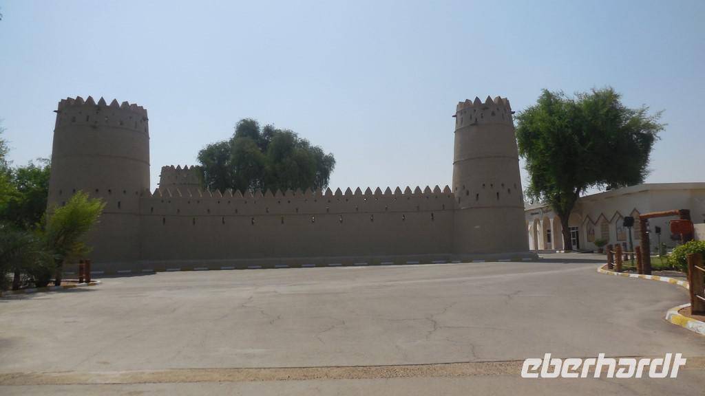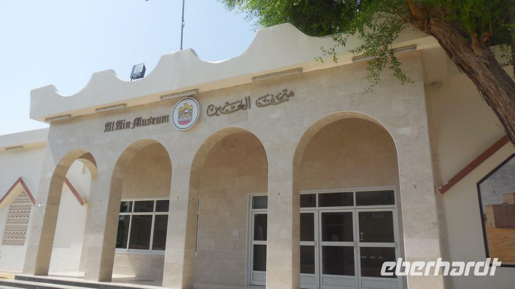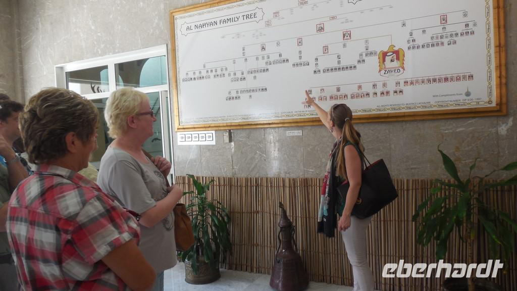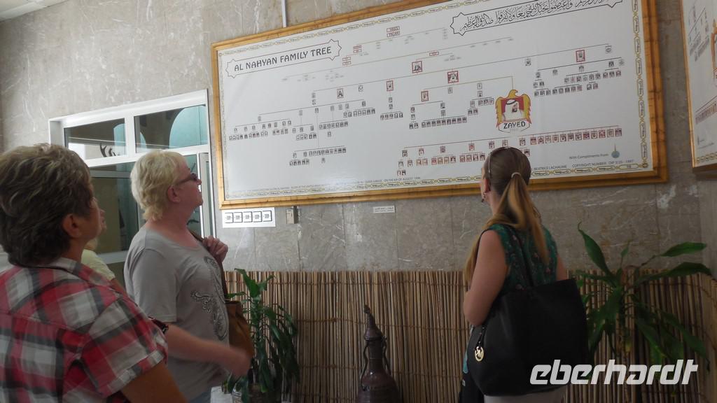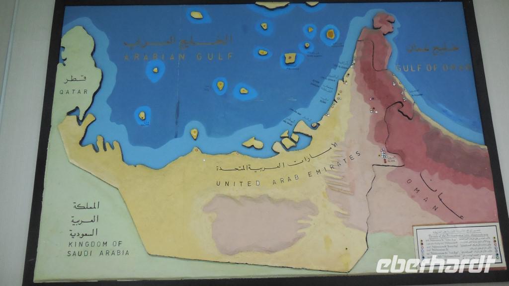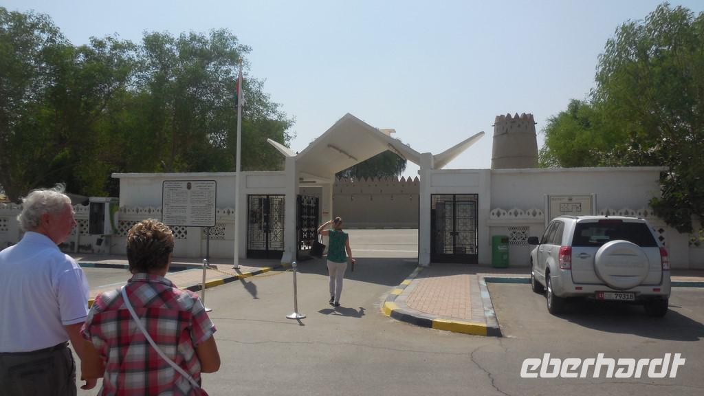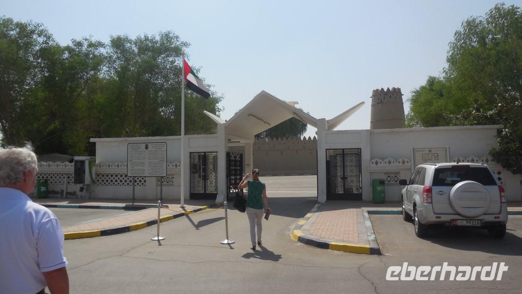 Dann geht's wieder nach Abu Dhabi. Wir fahren wieder an der Grenze zum Oman entlang, auch an einem Grenzübergang. Al Ain ist eigentlich auch eine geteilte Stadt. Ein Teil liegt im Oman der andere hier. Wir besuchen dass Al-Ain Museum, das ebenfalls sehr gut aufgebaut ist. Man lernt viel über die Geschichte. Gleich neben dem Museum ist eine Oase. Wir laufen durch den Palmenpark. Ein Dattelmann zeigt uns, wie man die köstlichen Datteln erntet. Schnell wie ein Äffchen ist er auf der Palme. Das sieht gefährlich aus.
