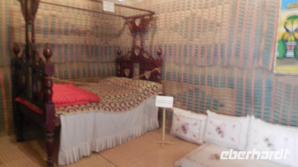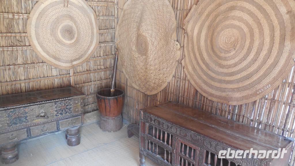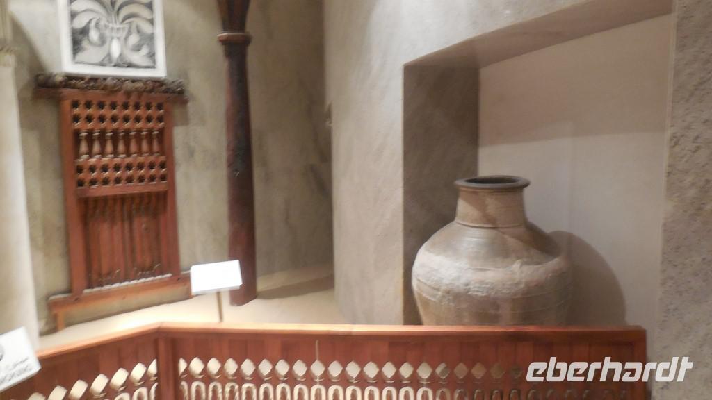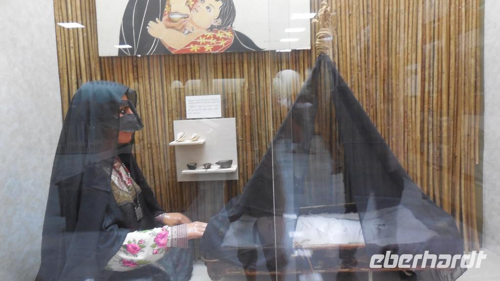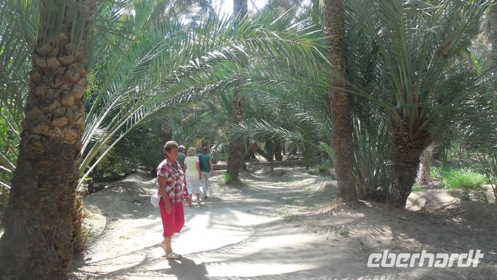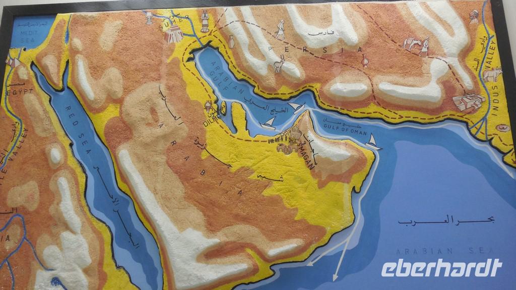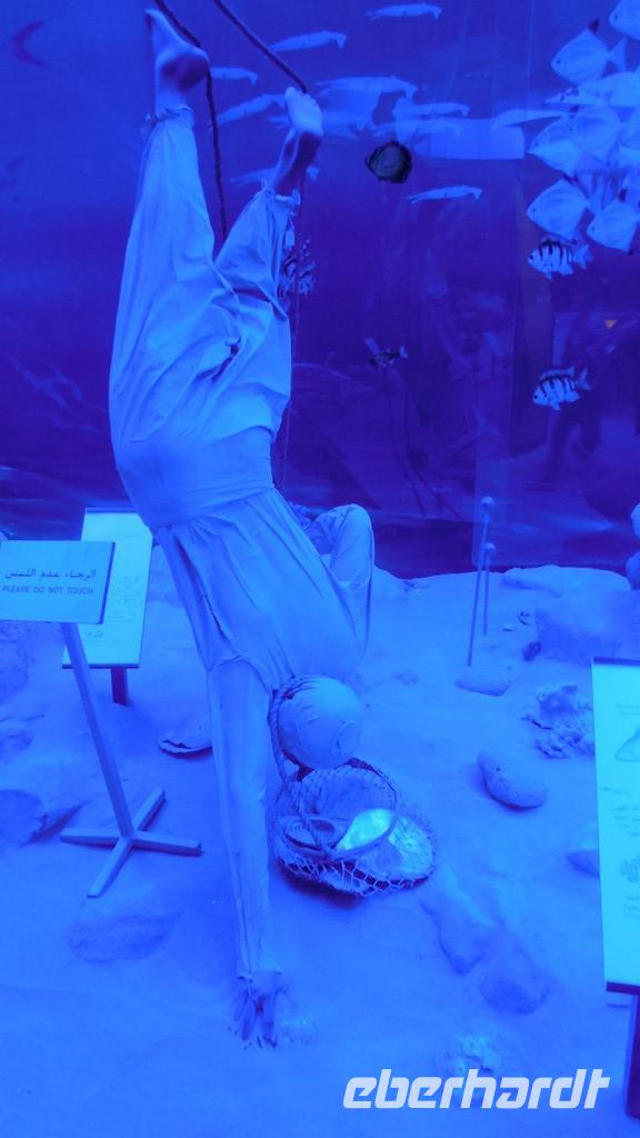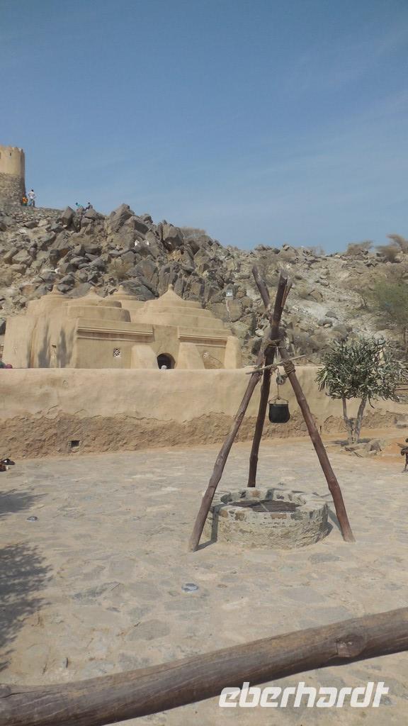 Dann geht's wieder nach Abu Dhabi. Wir fahren wieder an der Grenze zum Oman entlang, auch an einem Grenzübergang. Al Ain ist eigentlich auch eine geteilte Stadt. Ein Teil liegt im Oman der andere hier. Wir besuchen dass Al-Ain Museum, das ebenfalls sehr gut aufgebaut ist. Man lernt viel über die Geschichte. Gleich neben dem Museum ist eine Oase. Wir laufen durch den Palmenpark. Ein Dattelmann zeigt uns, wie man die köstlichen Datteln erntet. Schnell wie ein Äffchen ist er auf der Palme. Das sieht gefährlich aus.