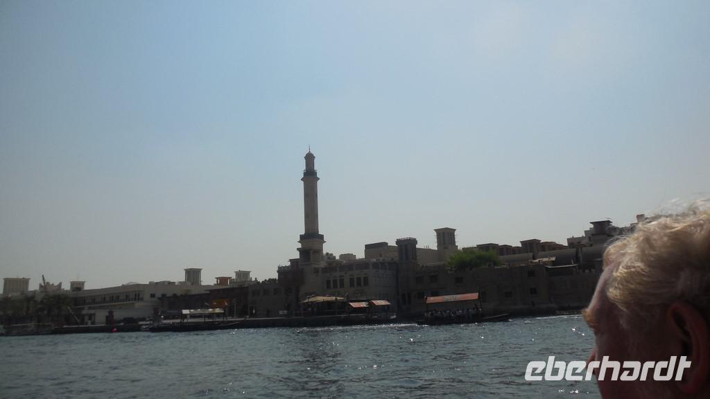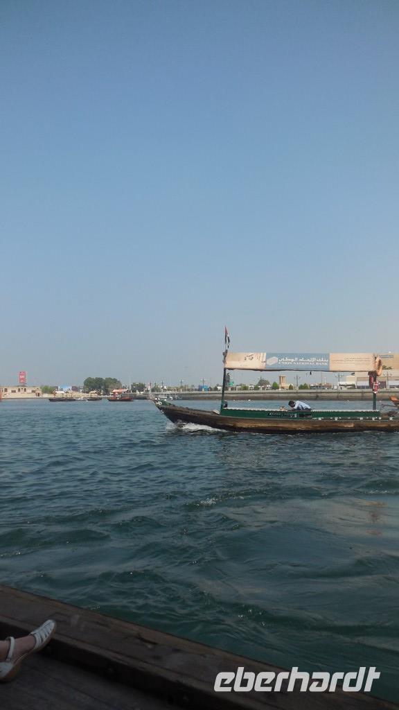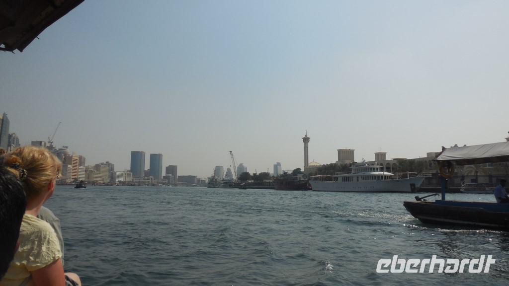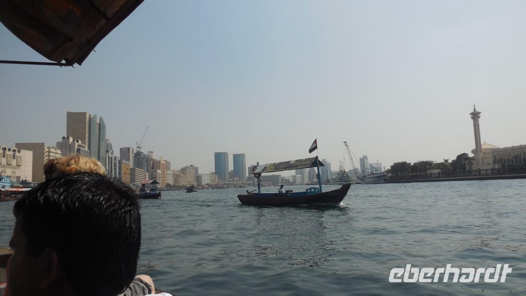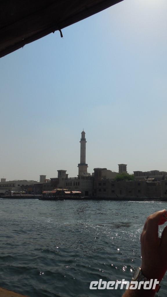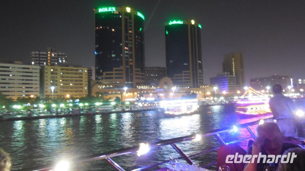 19.30 Uhr holte uns ein Bus ab und es ging an den Fluss. Wir bestiegen ein wunderschönes beleuchtetes Dhau. Über 2 Stunden fuhren wir mit dem Schiff auf dem Creek entlang. Wir hatten einen tollen Blick auf die Skyline, unser Hotel und sahen viele beleuchtete Schiffe. Dabei genossen wir ein gutes Abendessen. Ein Derwisch tanzte dazu. Später ging es mit dem Bus zurück zum Hotel, es waren noch 34 Grad und sehr angenehm.