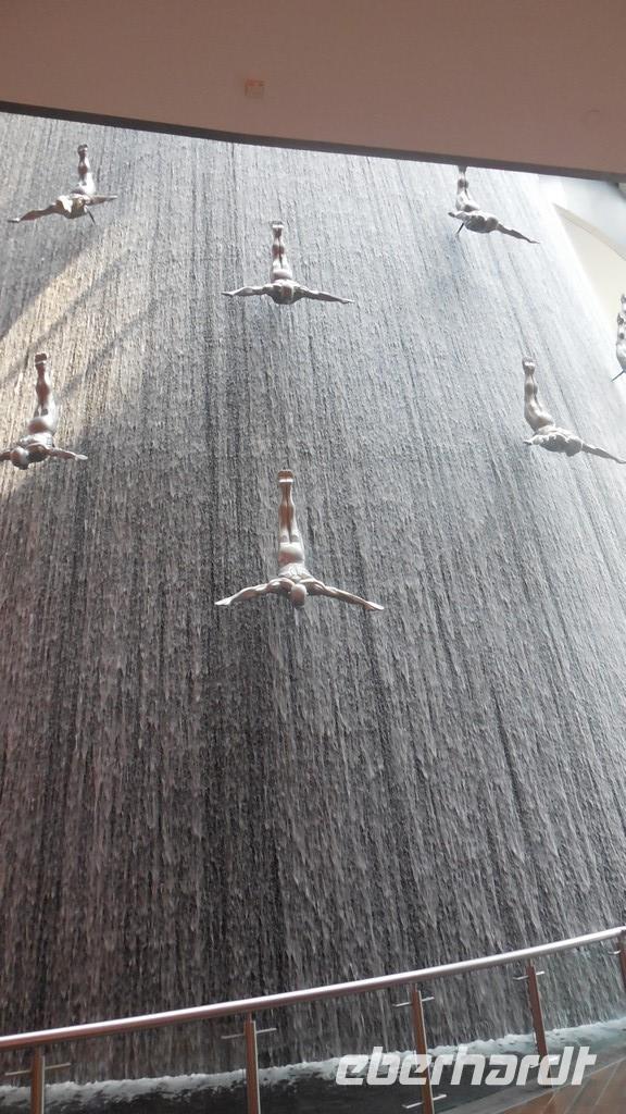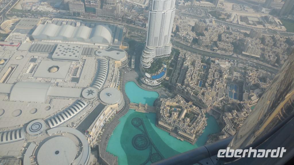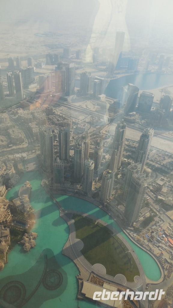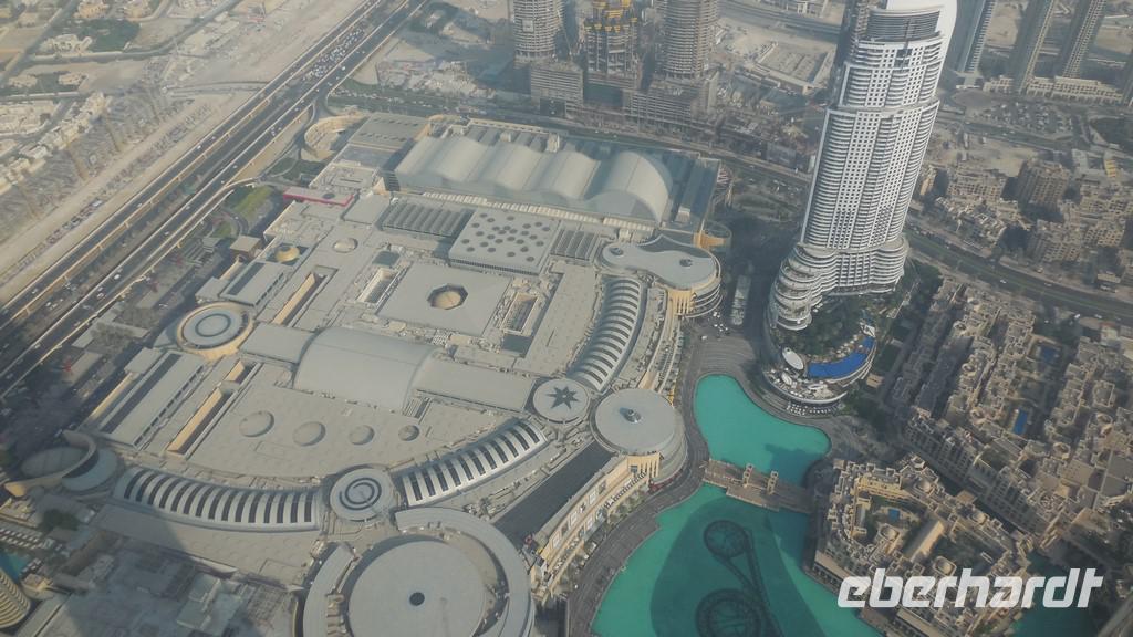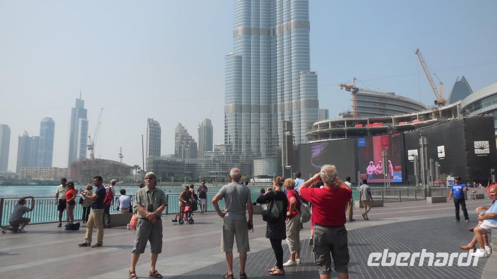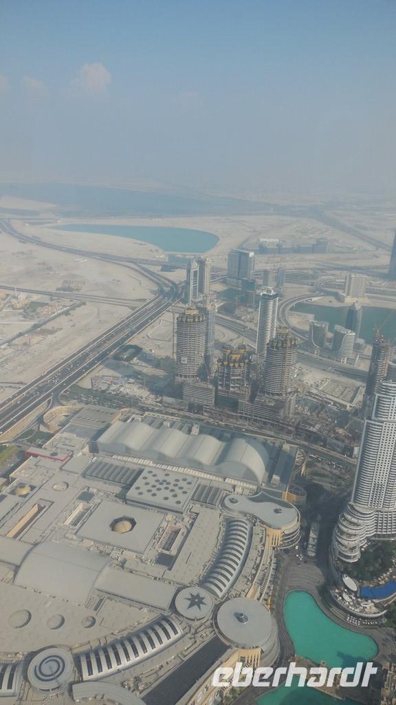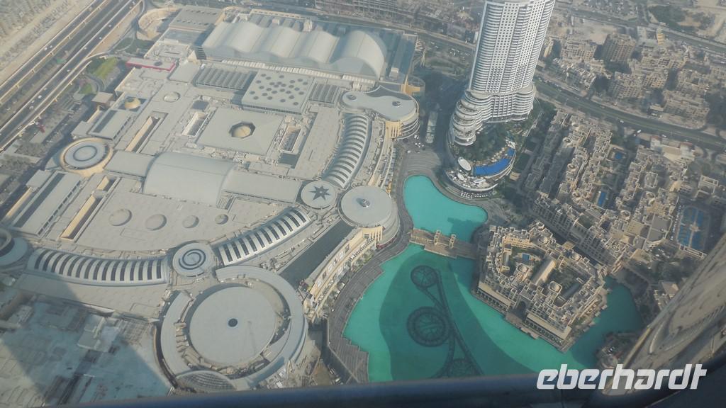 Der Bus wartete bereits auf uns und brachte uns zum nächsten Highlight der Dubai Mall. Das rießige Einkaufszentrum, mit mehr als 1200 Geschäften, hatte natürlich noch mehr zu bieten. Wir hatten Glück und konnten als erstes die Wasserspiele genießen. Auch eine Eislaufbahn gab es. Dann gab es ein kleines Mittagessen. Für 15.00 Uhr hatten wir die Tickets für den Burj Khalifa. Er zählt als höchstes Gebäude der Welt, mit seinen 828 m. Er ist auch das Wahrzeichen Dubais. Durch den Sicherheitsbereich gelangte man zum Lift. Der sauste mit 10 m pro Sekunde in die Höhe. Wir waren also in einer Minute in der 124 Etage, oder auf 442 m Höhe. Wir genossen den super tollen Blick auf die Stadt. Die große Plattform ist verglast und so kann man alles sehen. Vor allen von dem offenen Bereich wirkte alles noch besser. Eine Stunde blieben wir oben. Dann ging es mit dem schnellen Lift wieder nach unten.