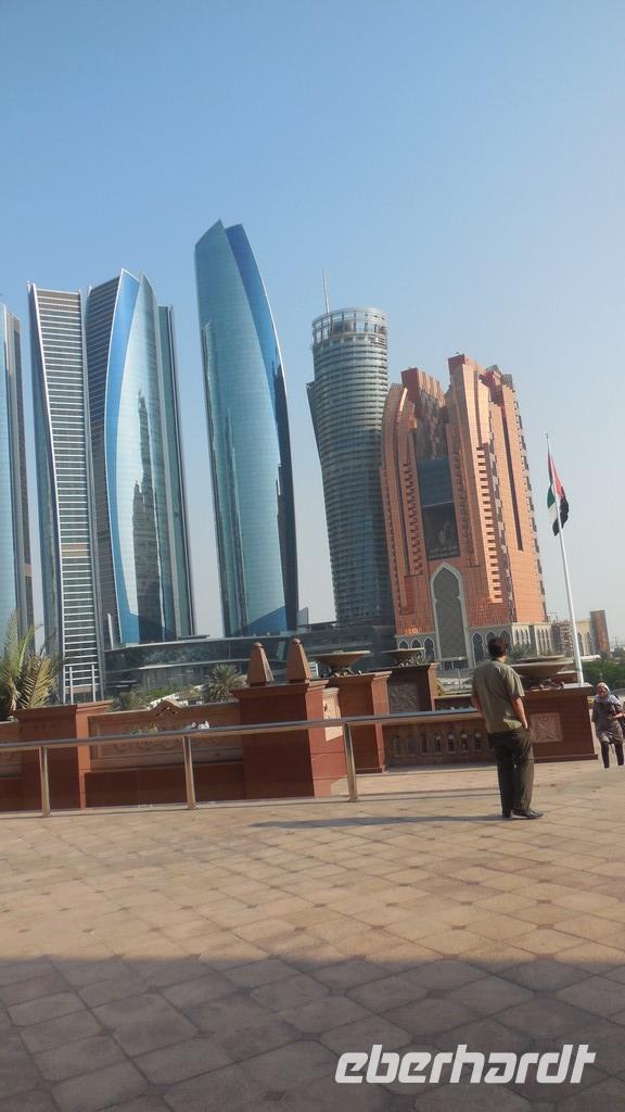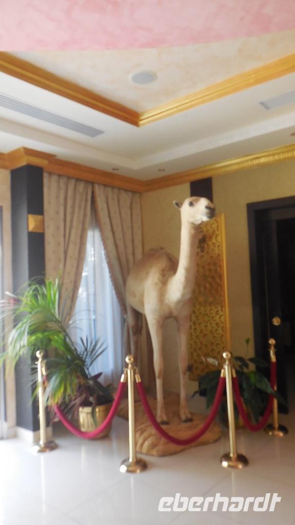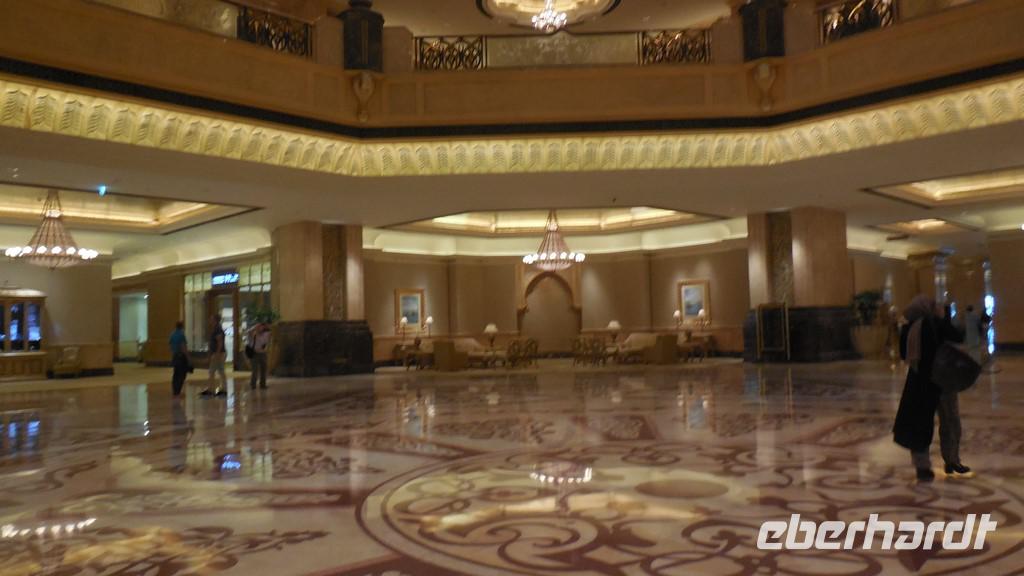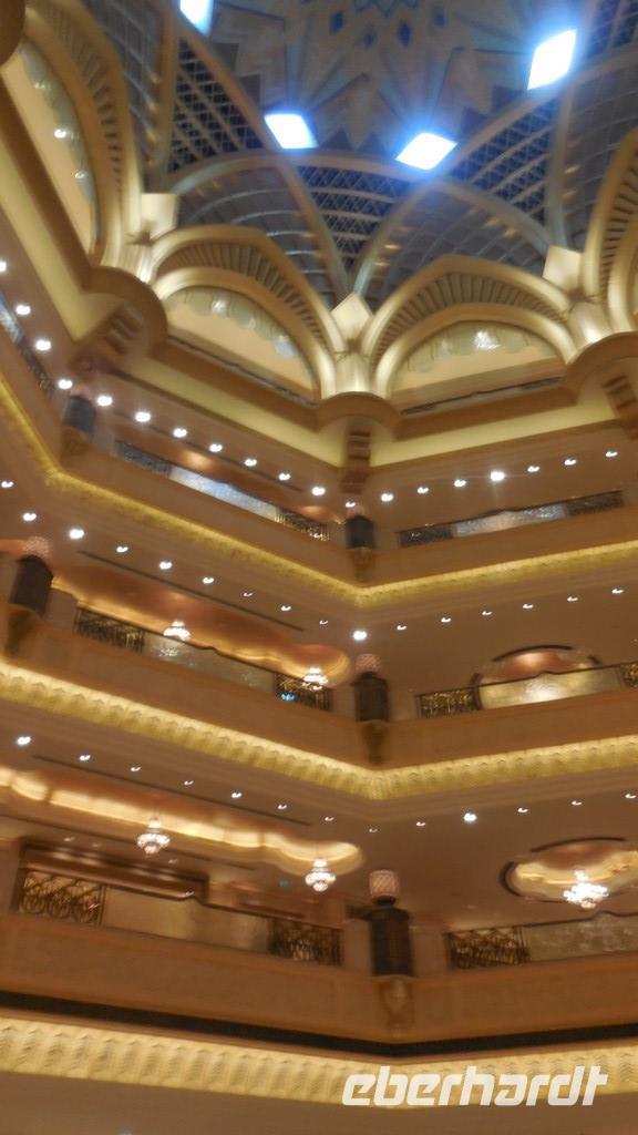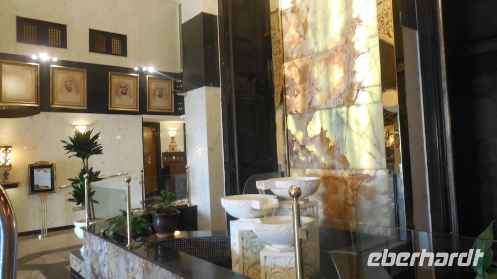 Wir besuchen kurz das Heritage Village, von der man einen tollen Blick auf die Skyline von der Stadt hat. Dann geht's zur Teetime. Im märchenhaften Luxushotel Emirates Palace, das alle sprachlos macht. Überall Gold und die „Größe" sind beeindruckend! Vom Ostflügel bis Westflügel ist es 1 km weit....
