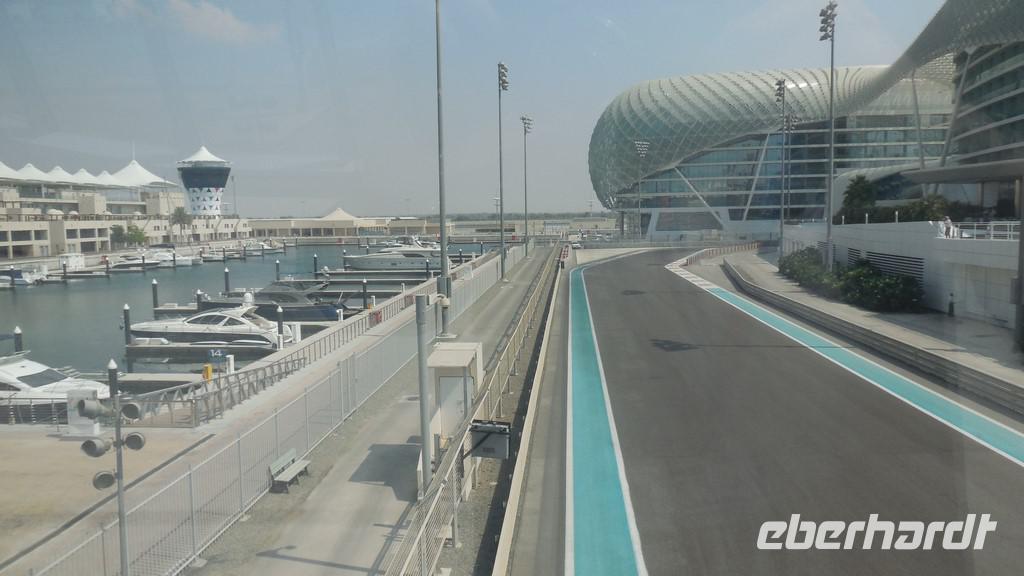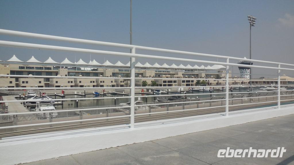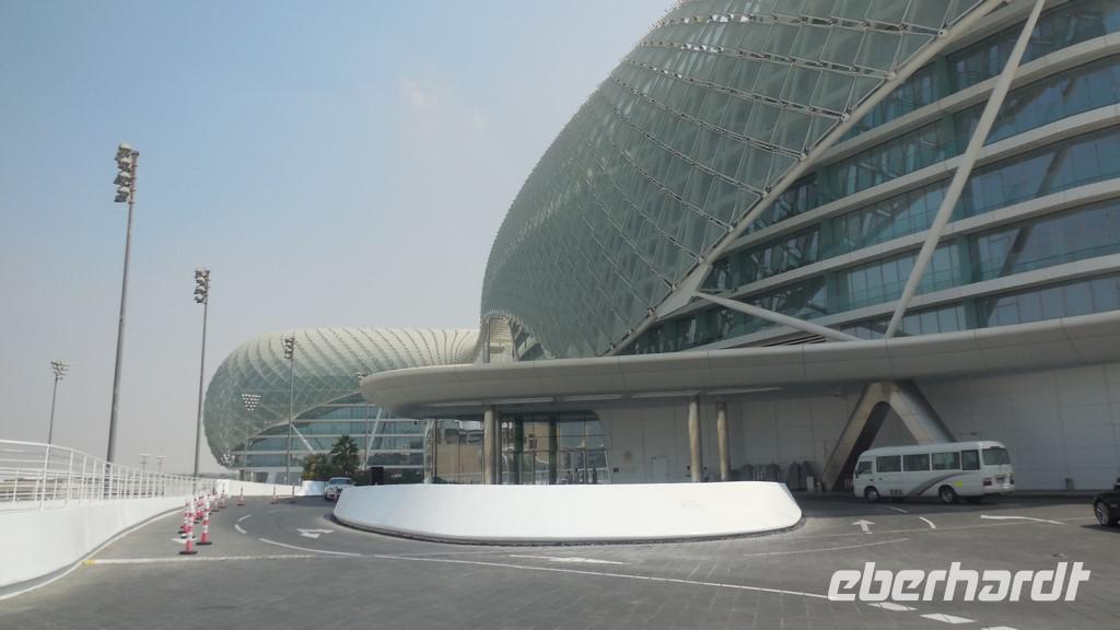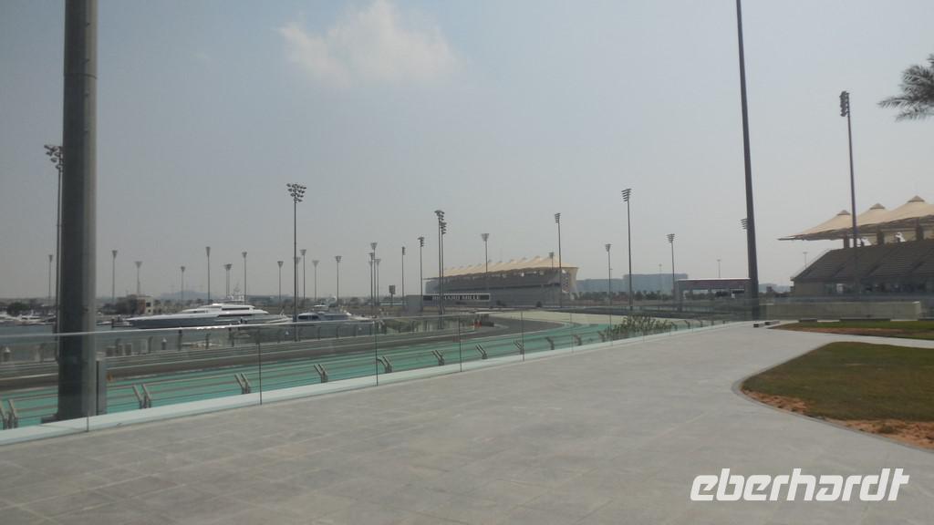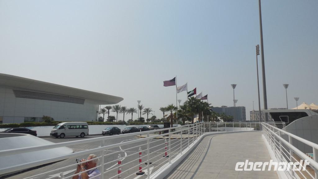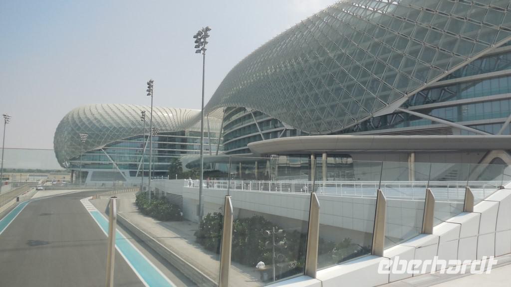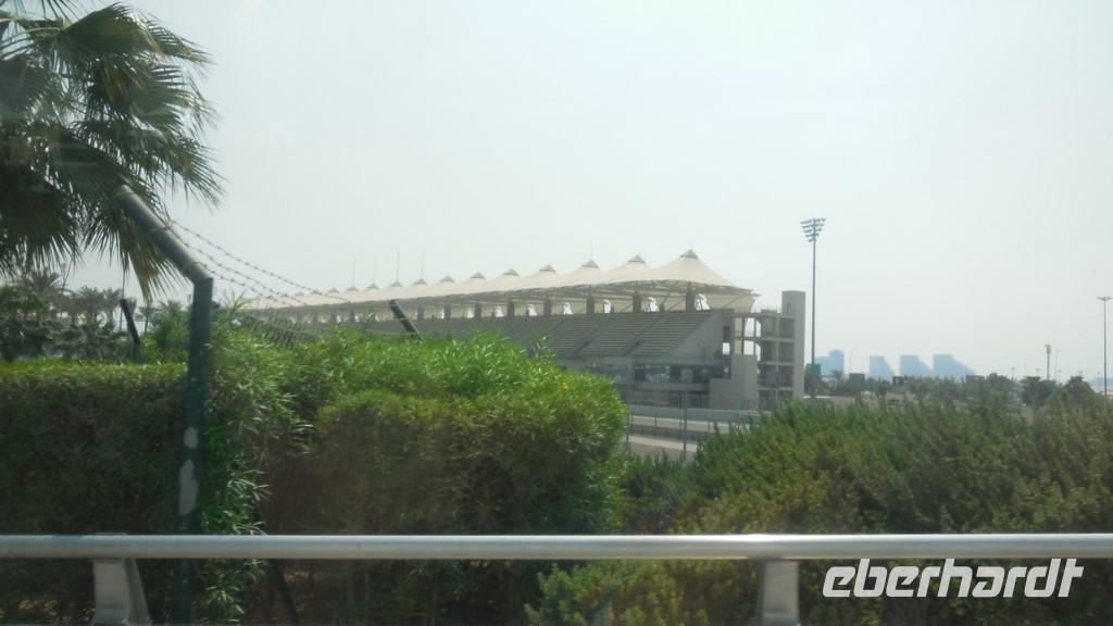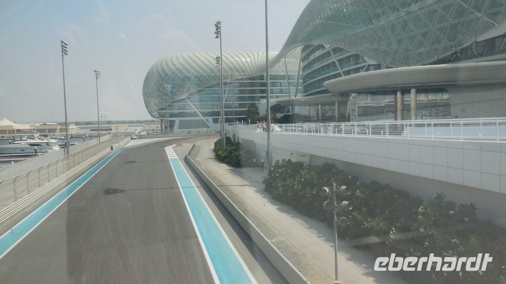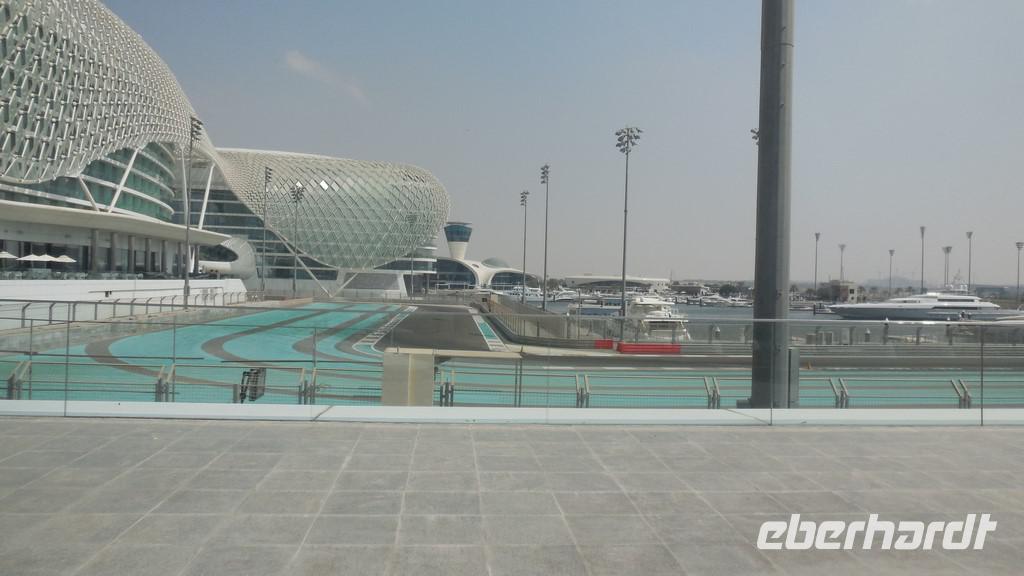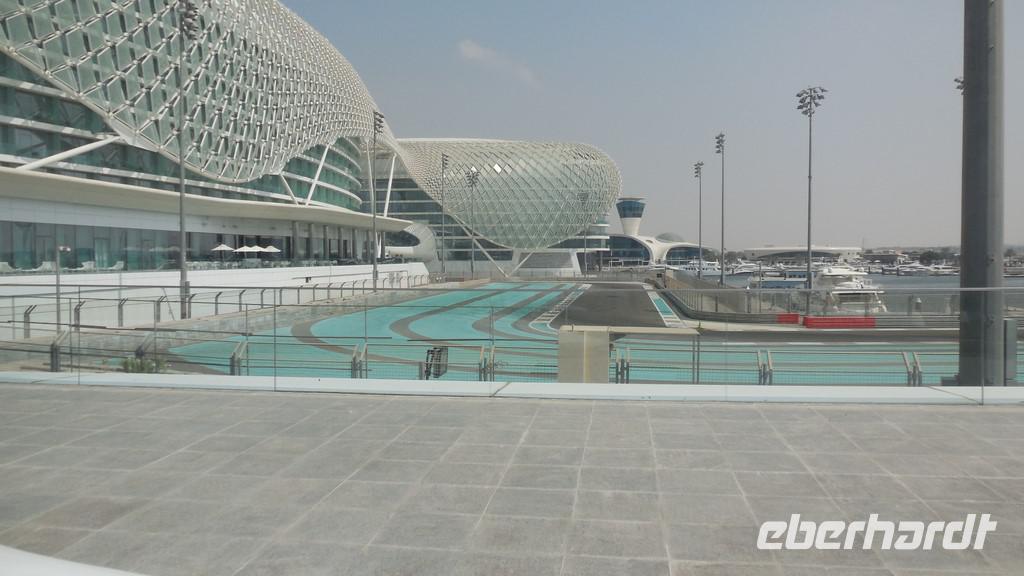 Dann geht es nach Yas. Hier ist auch die Formel 1 Strecke. Am Vinceroy-Hotel können wir kurz parken, um uns die Strecke ansehen zu können. Gleich daneben liegt ein großer Wasserpark und die Ferrari Welt. Viele Hotels und ein Yachthafen. Zum Rennen kommt man nur mit einer gültigen Eintrittskarte auf diese Insel.