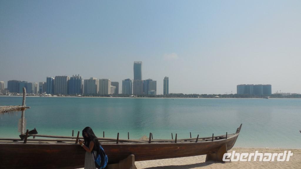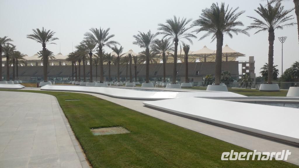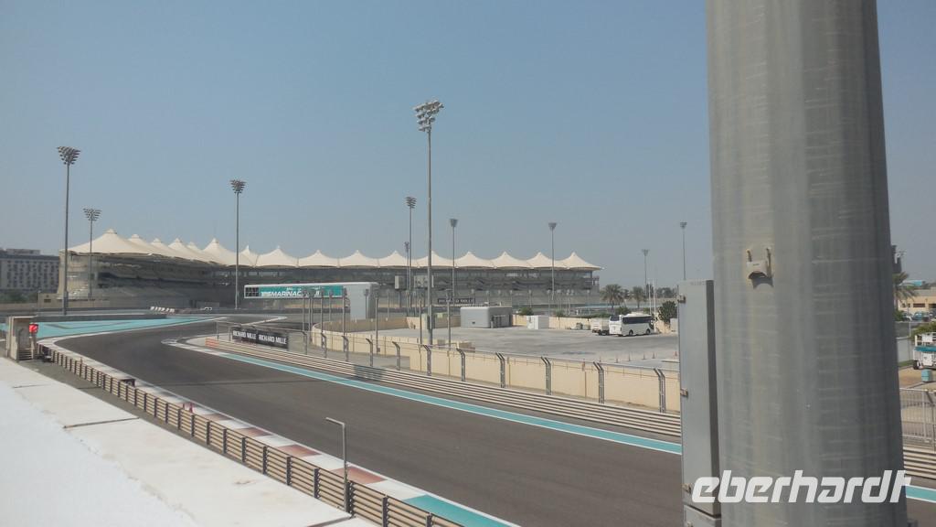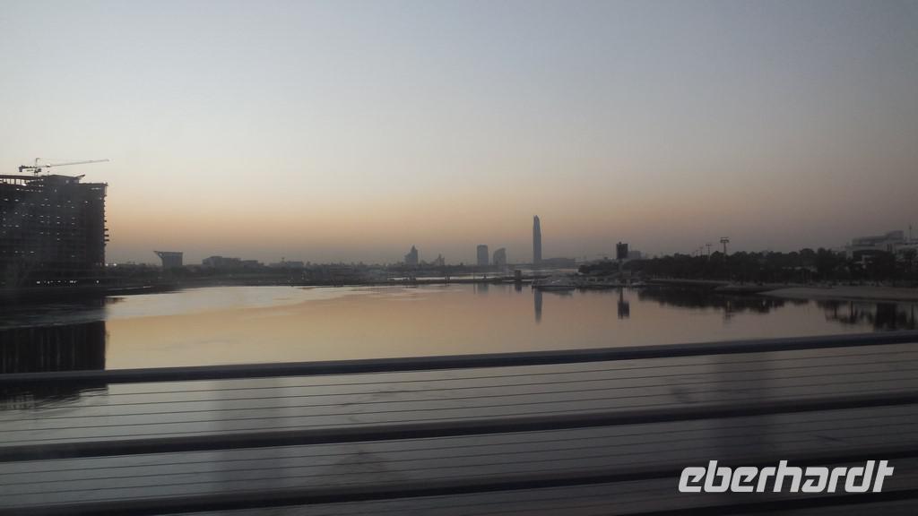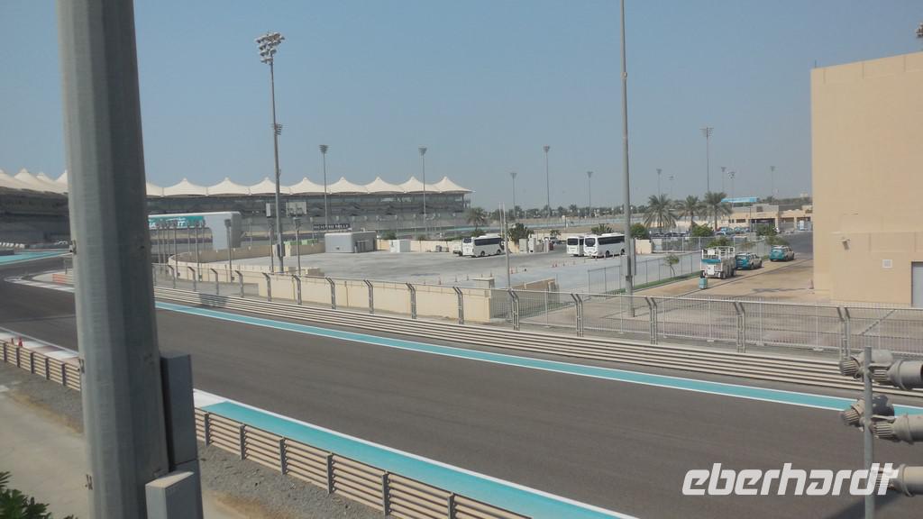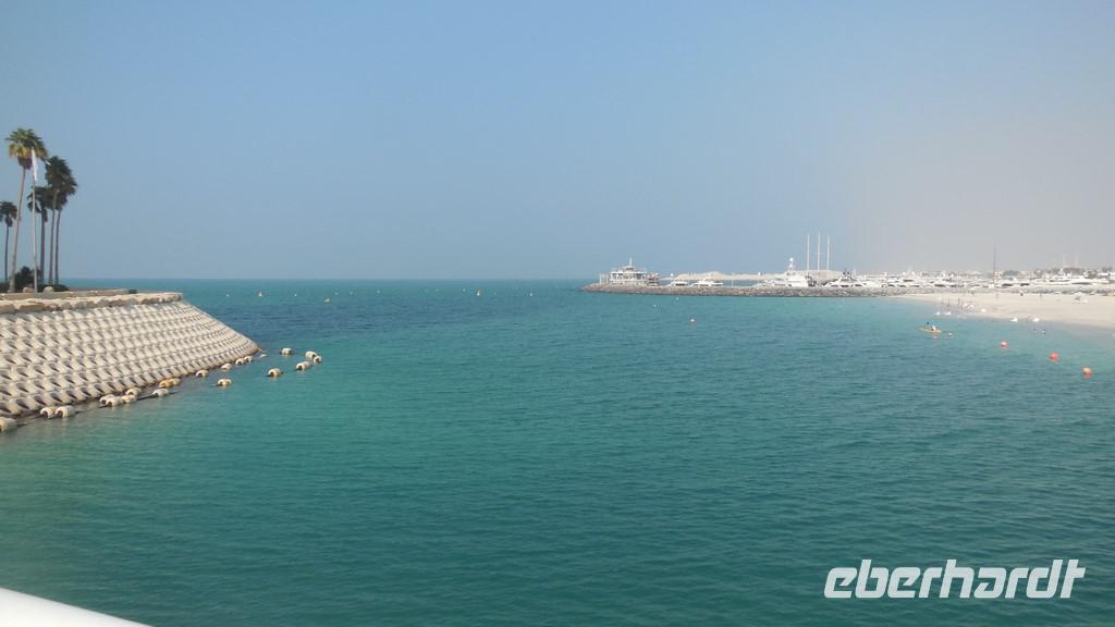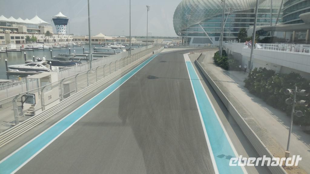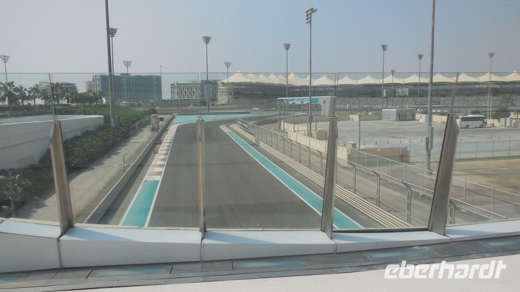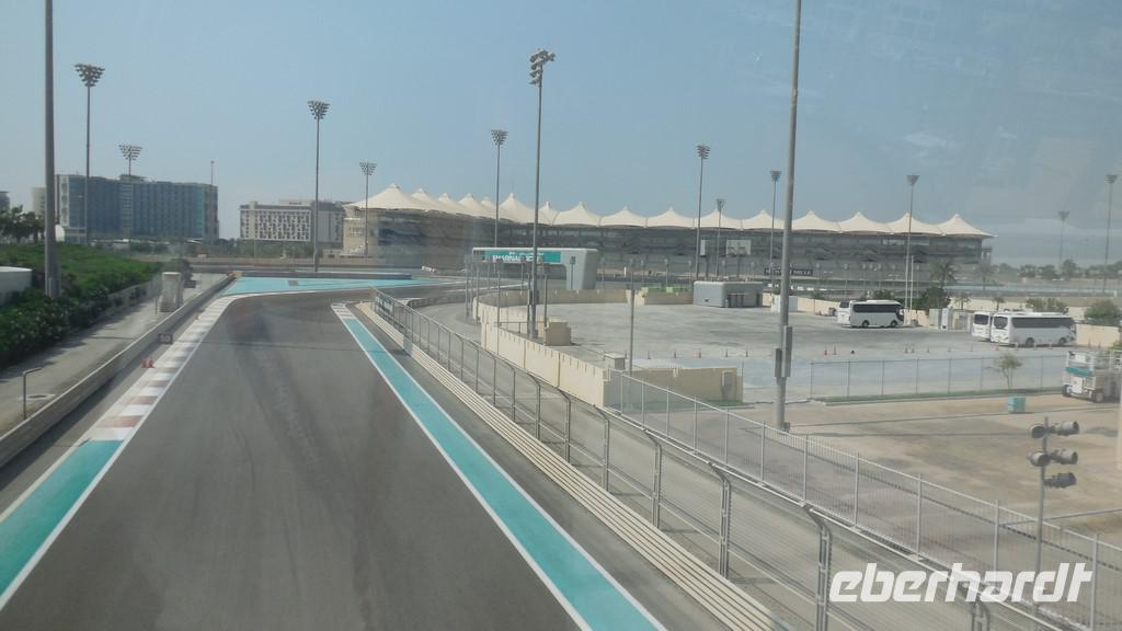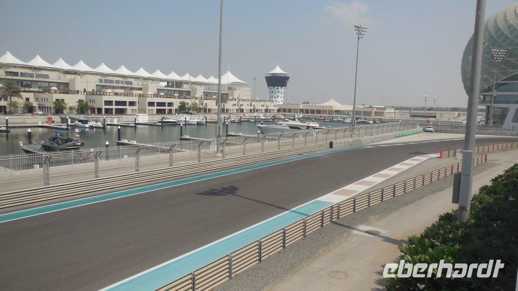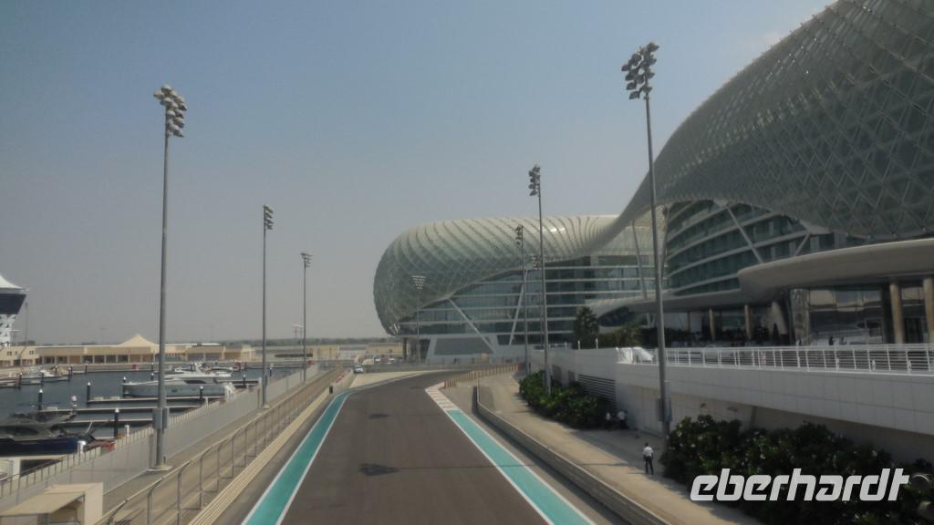 Dann geht es nach Yas. Hier ist auch die Formel 1 Strecke. Am Vinceroy-Hotel können wir kurz parken, um uns die Strecke ansehen zu können. Gleich daneben liegt ein großer Wasserpark und die Ferrari Welt. Viele Hotels und ein Yachthafen. Zum Rennen kommt man nur mit einer gültigen Eintrittskarte auf diese Insel.
