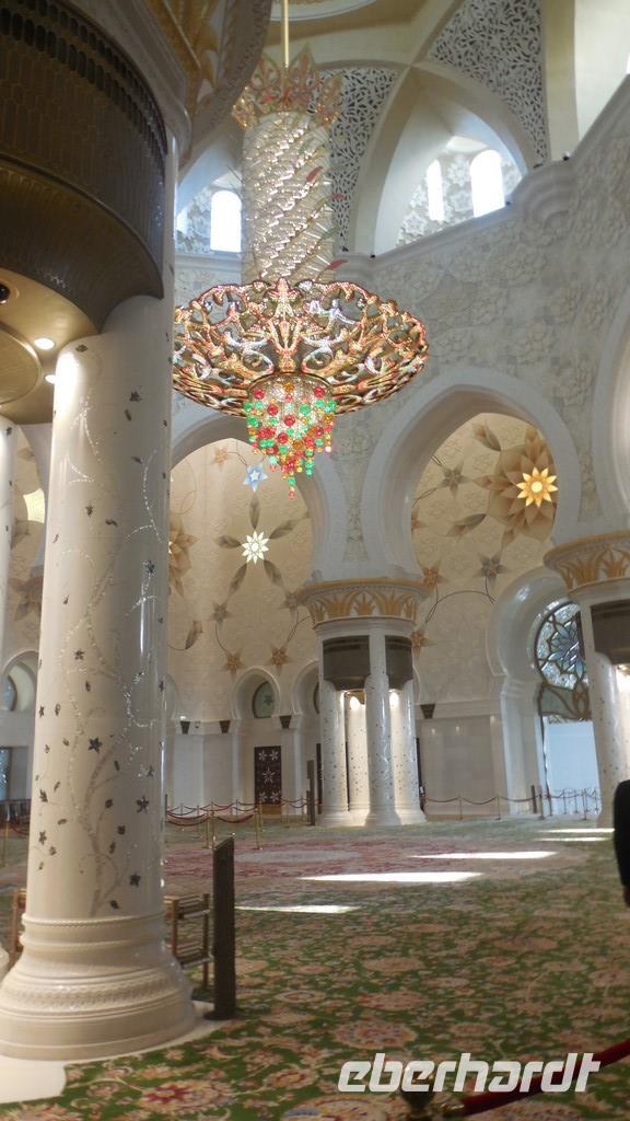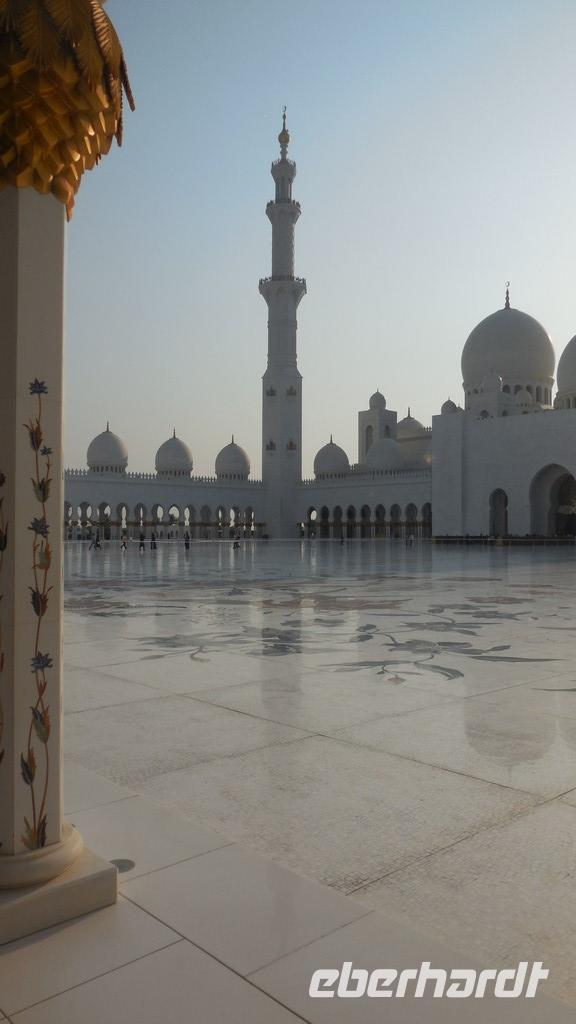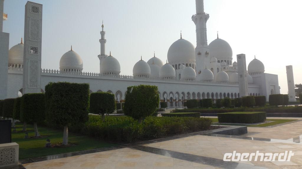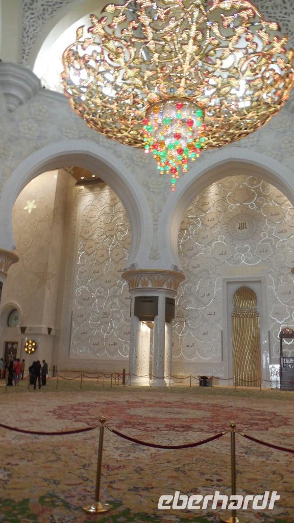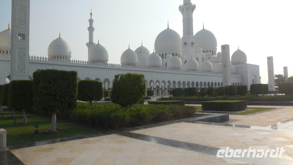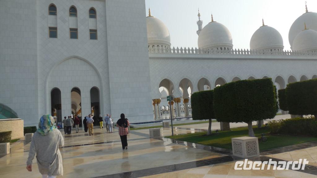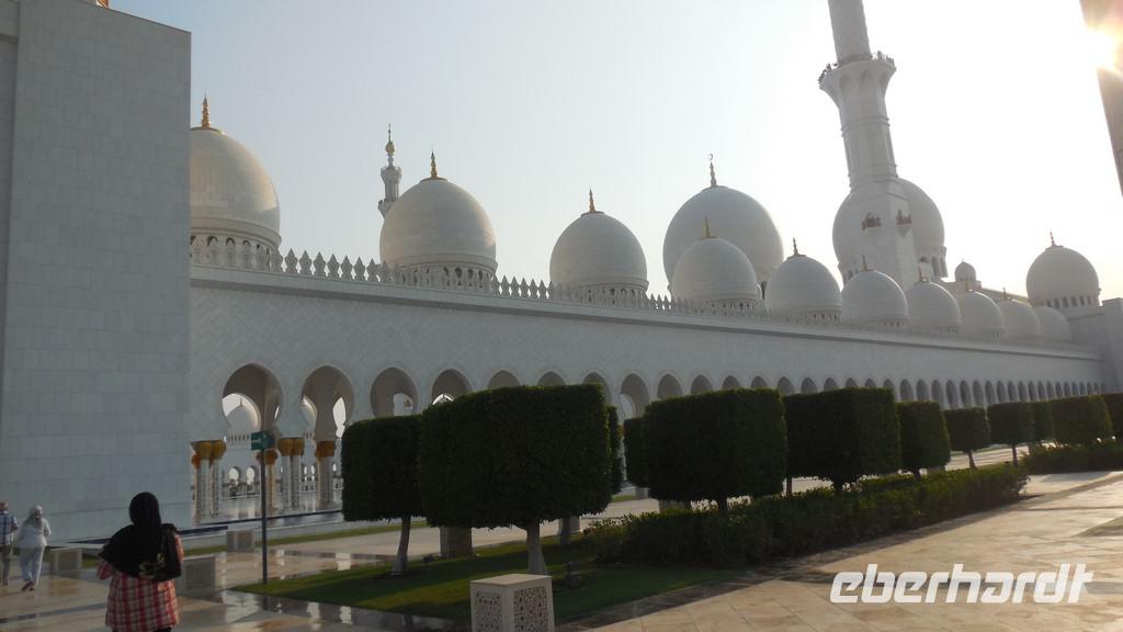 Der letzte Halt an diesem Tag ist die Sheikh-Zayed-Moschee. Sie ist die größte Moschee der Emirate und hat Platz für 1000 Gläubige. Die schneeweiße Moschee mit seinen Kuppeln und 4 Minarette ist beeindruckend. Nach 5 Sicherheitskontrollen dürfen wir die Moschee betreten. Frauen dürfen keine „Haut" zeigen und brauchen einen Schleier.