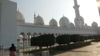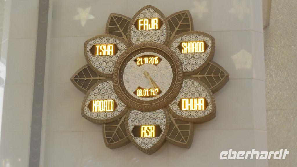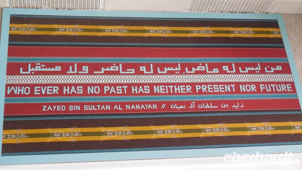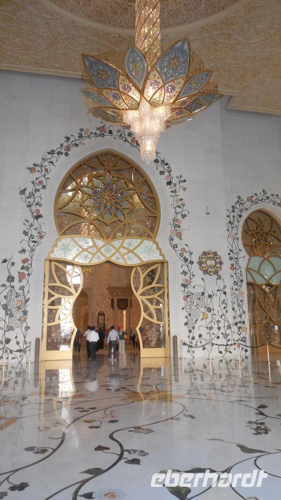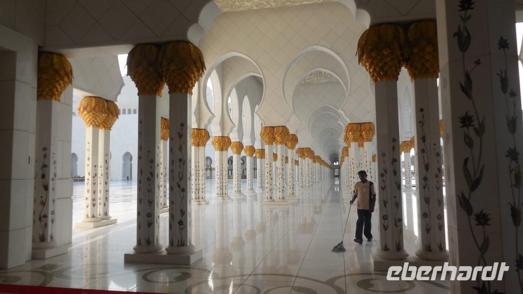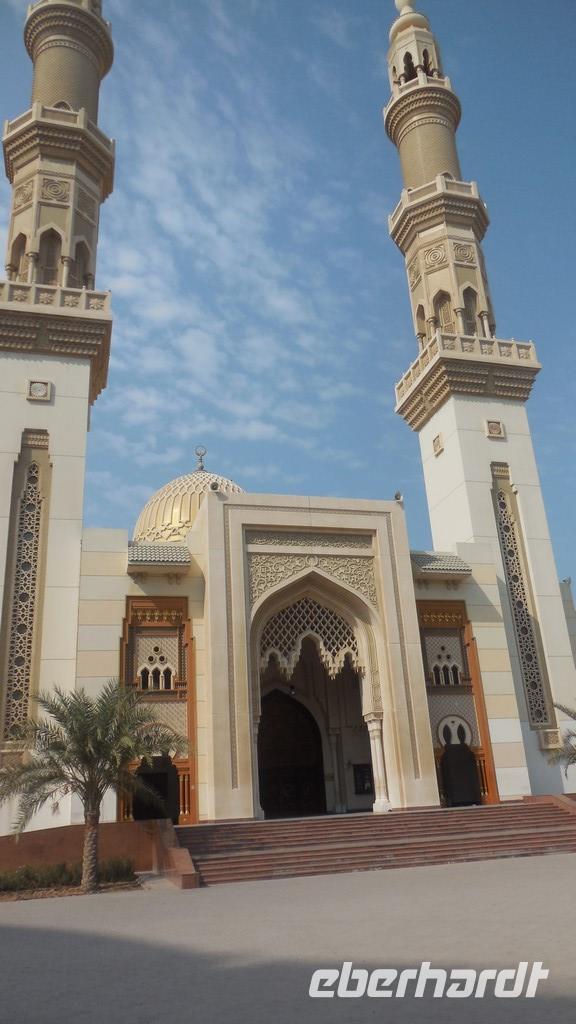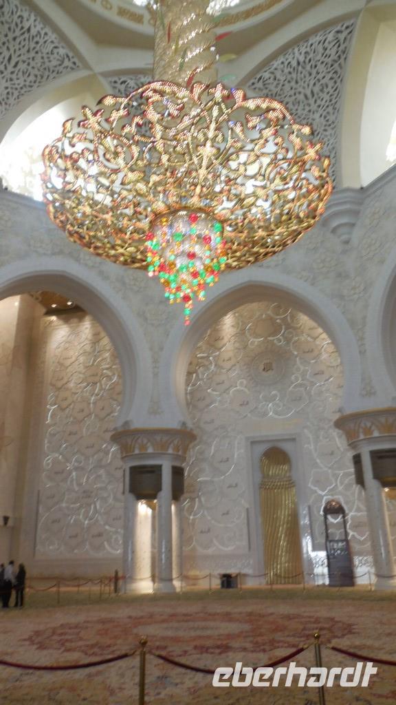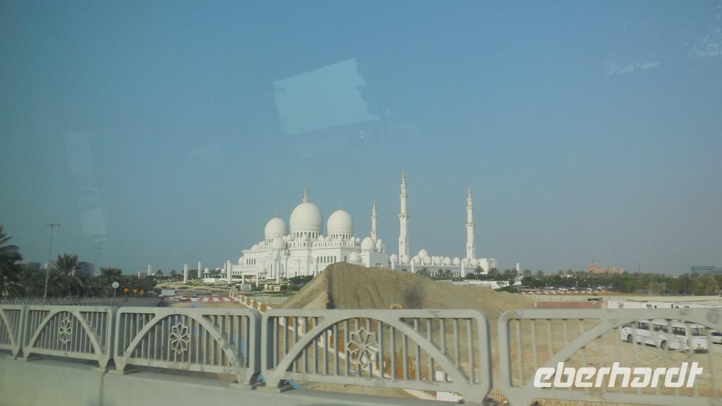 Der letzte Halt an diesem Tag ist die Sheikh-Zayed-Moschee. Sie ist die größte Moschee der Emirate und hat Platz für 1000 Gläubige. Die schneeweiße Moschee mit seinen Kuppeln und 4 Minarette ist beeindruckend. Nach 5 Sicherheitskontrollen dürfen wir die Moschee betreten. Frauen dürfen keine „Haut" zeigen und brauchen einen Schleier.