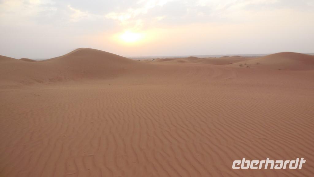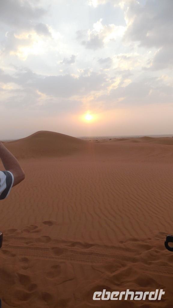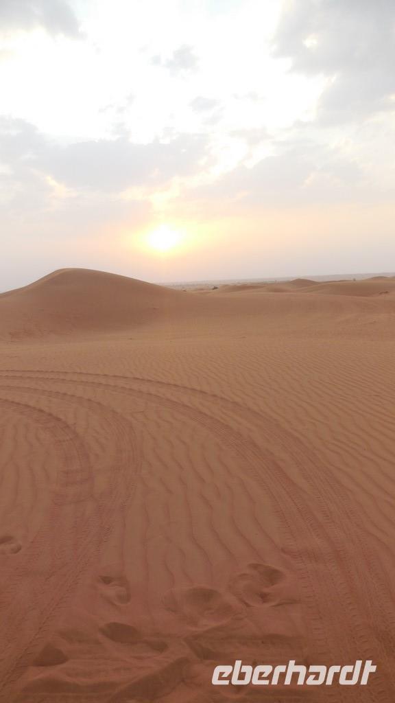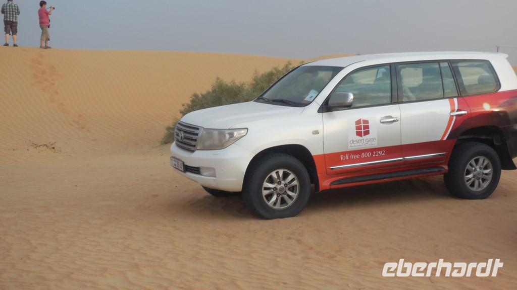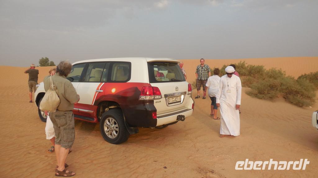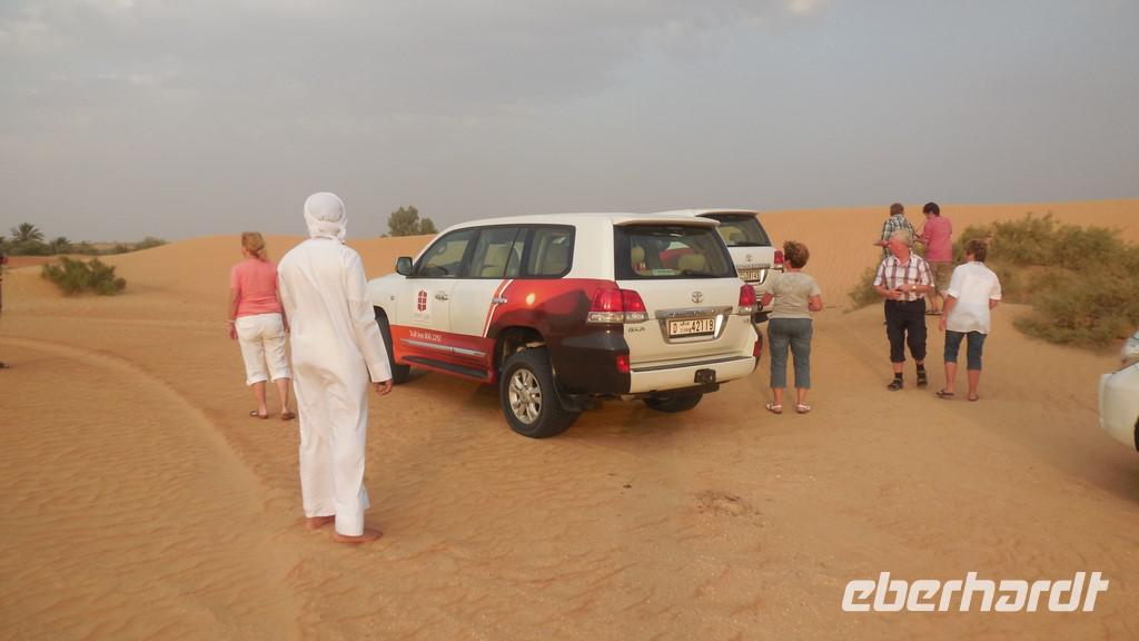 15.30 Uhr holten uns die 3 Jeeps für die Safari ab. Als erstes geht es an eine Tankstelle, wo etwas Luft aus den Reifen gelassen wird. Dann geht es weiter in die Wüste. Schnell noch ein Fotostopp. Wir laufen durch den warmen Sand. Dann startet die Wüstensafari. Schnell jagen die Jeeps durch den Sand und die vielen Dünen. Einigen wird es doch etwas „anders".