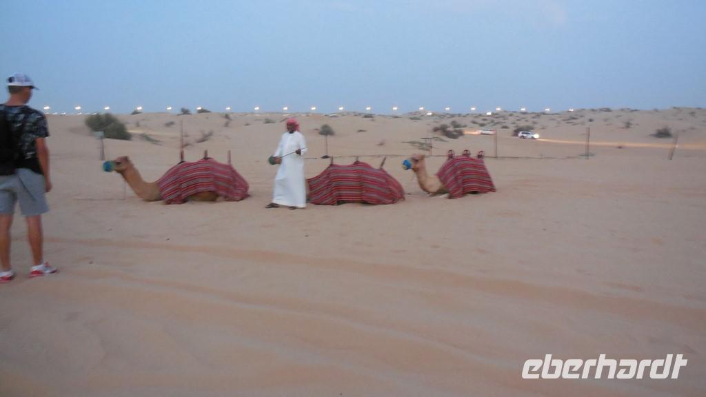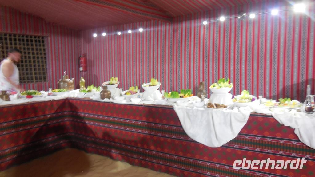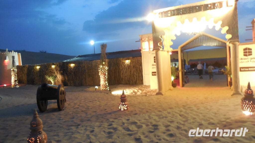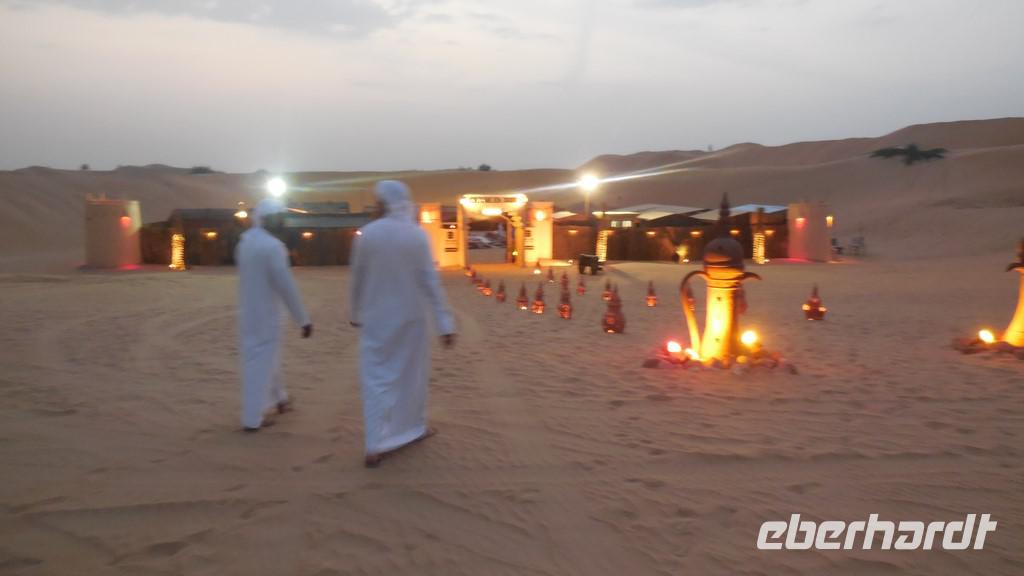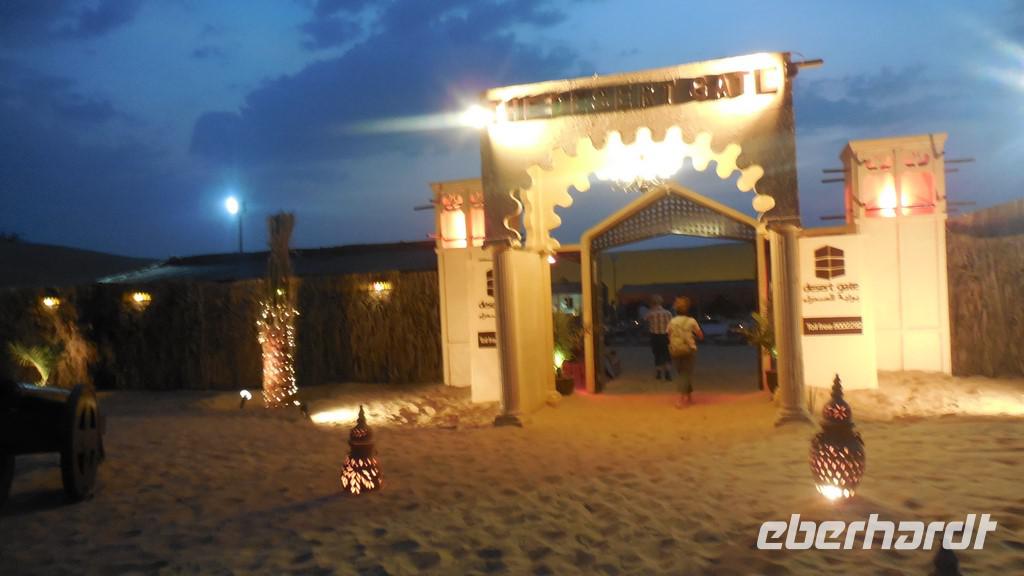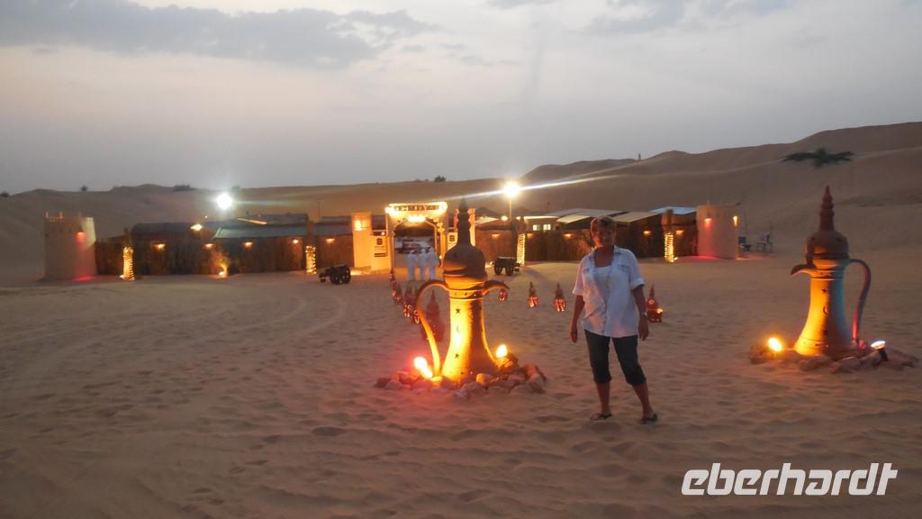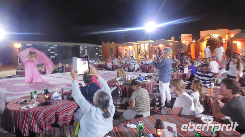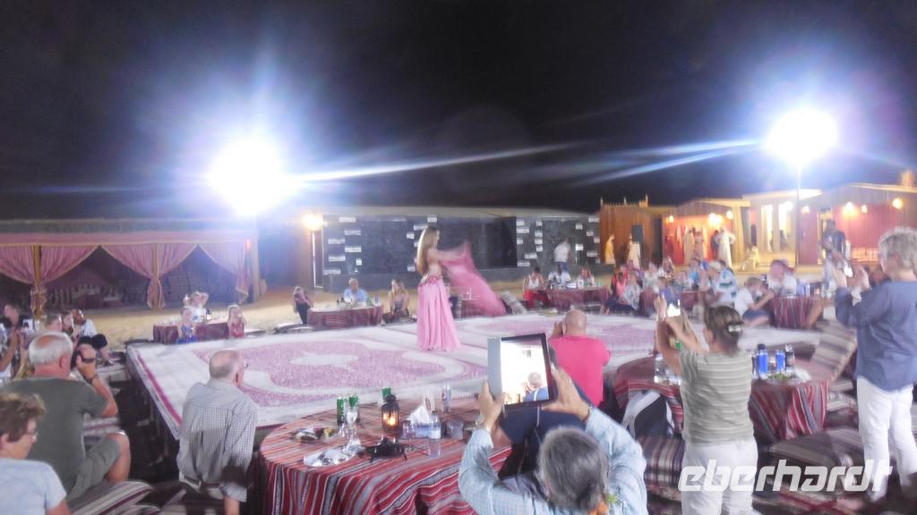 Im Wüstencamp angekommen entdeckten wir sehr viel. Der Eingang ist romantisch beleuchtet. Einige Kamele warten auf einen kleinen Ritt. Im Camp kann man sich wie ein Scheich kleiden, ein Henna malen lassen, Shisha rauchen und das Barbecue probieren. Ein Derwisch und eine Bauchtänzerin bieten ein abwechslungsreiches Programm. Unter dem Sternenhimmel ist es toll. Es ist auch noch sehr warm. Das Thermometer zeigt bei der Rückfahrt noch 31 Grad. Leider geht es diesmal über die Straße zurück. Die Jeeps bringen uns zurück zum Hotel.